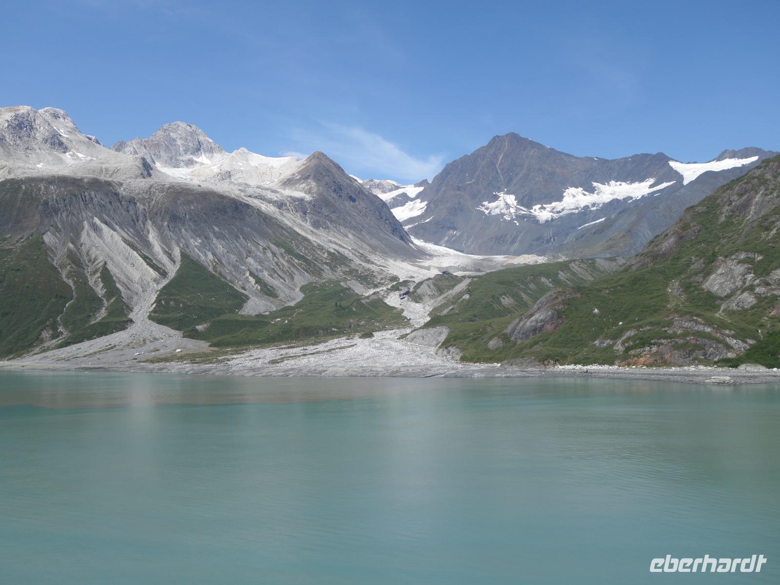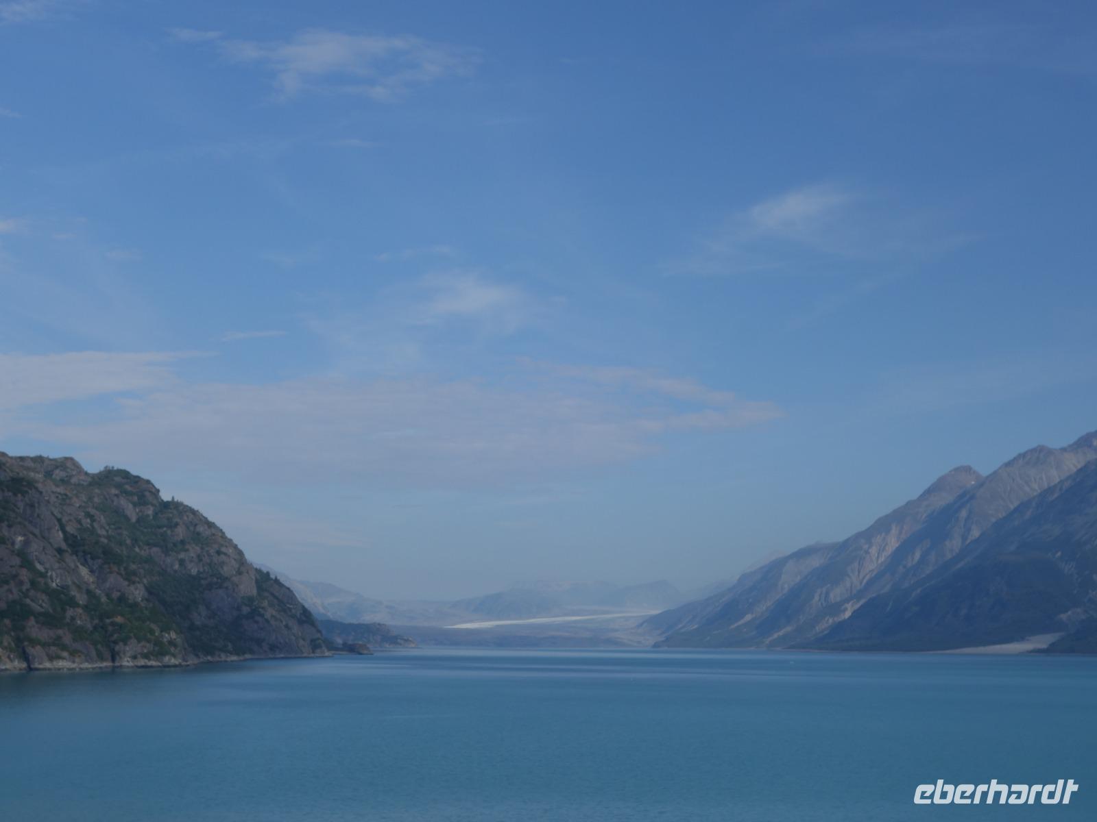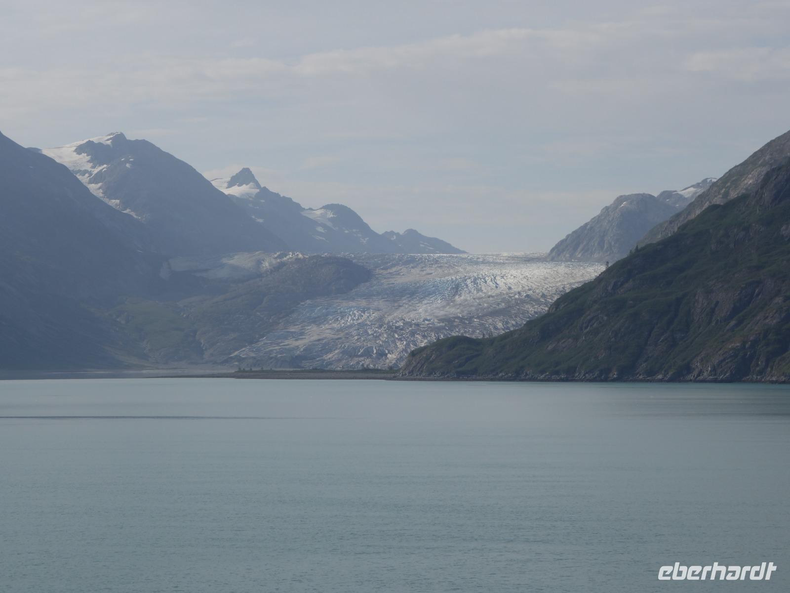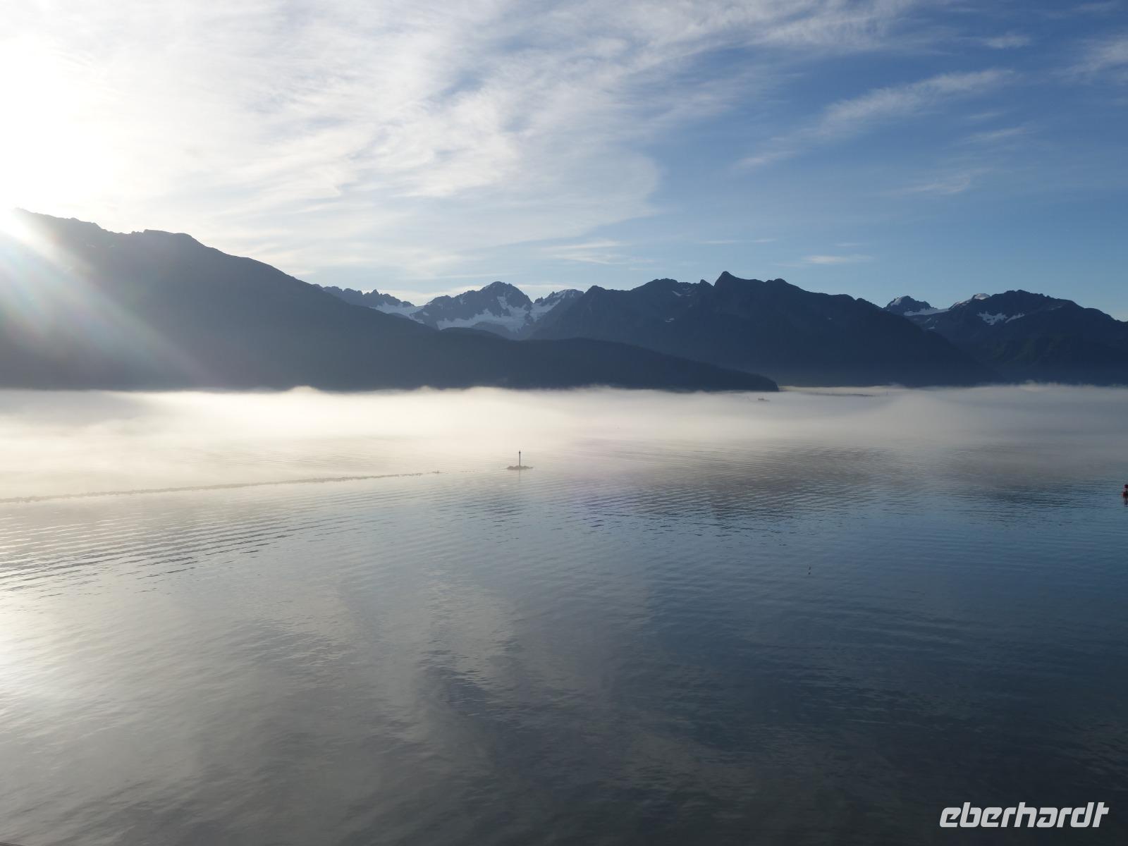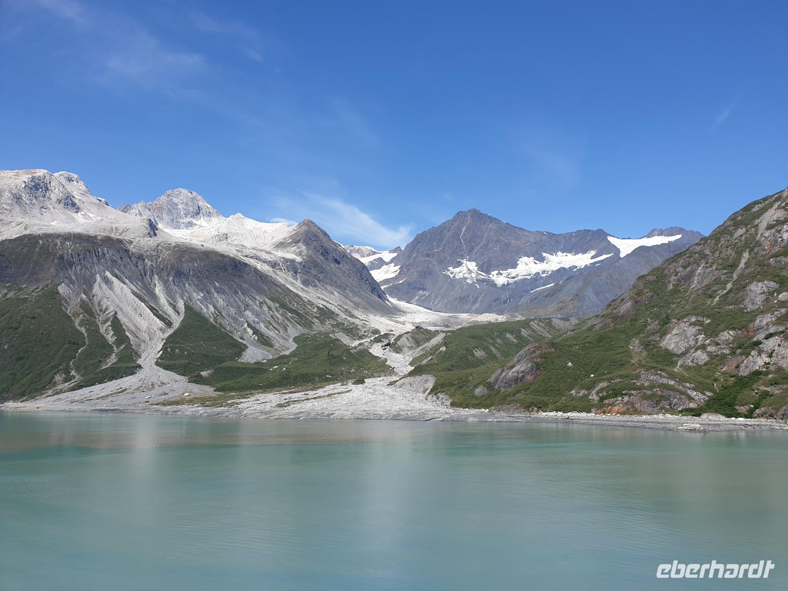Der letzte Seetag bringt uns ganz nah an den gigantischen Hubbard Gletscher, Nordamerikas größten Gezeitengletscher. Er besteht aus 3.500km² blauen Eis und ist einer der aktivsten Gletscher in Alaska. Das können wir hautnah miterleben! Es klingt wie ein Gewitter, das aufzieht, kurz bevor der Gletscher kalbt. Der Hubbard Gletscher befindet sich zu einem Teil in Ostalaska und zum anderen Teil in Yukon, Kanada. Er wurde nach Gardiner Hubbard, dem Präsidenten der Bell Telefongesellschaft benannt. Bevor der Hubbard Gletscher das Meer erreicht, verbindet er sich im Westen mit den Valerie Gletscher. Es ist ein einmaliges Erlebnis und wieder einmal haben wir den Jackpot in Sachen Wetter gezogen. Ein herrlicher Morgen, erst liegt noch der Nebel über den „Hubbi", aber schon bald verschwindet diese und gibt die Sicht auf die wunderschönen in der Sonne glitzernde schneebedeckte Gipfel. Das auf dem Wasser treibende Eis mit dem gigantischen Gletscher im Hintergrund ist definitiv ein Bild für die Ewigkeit.