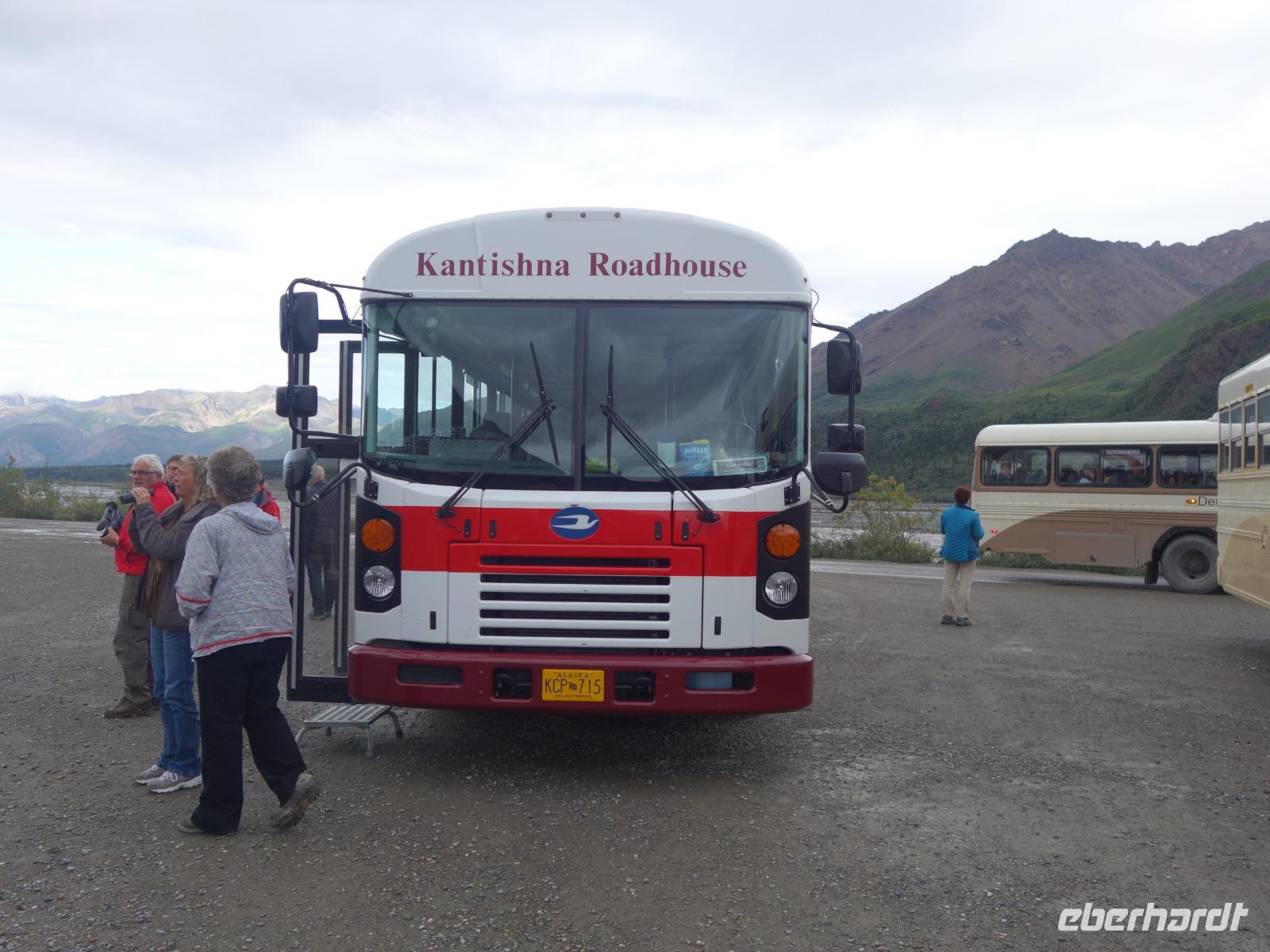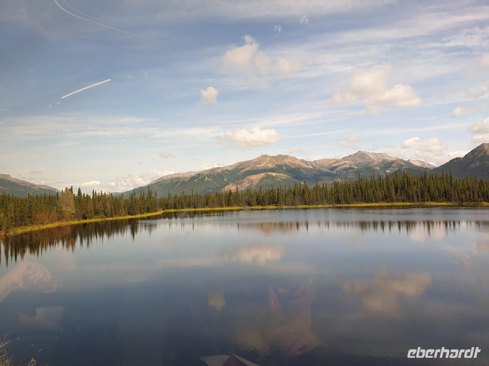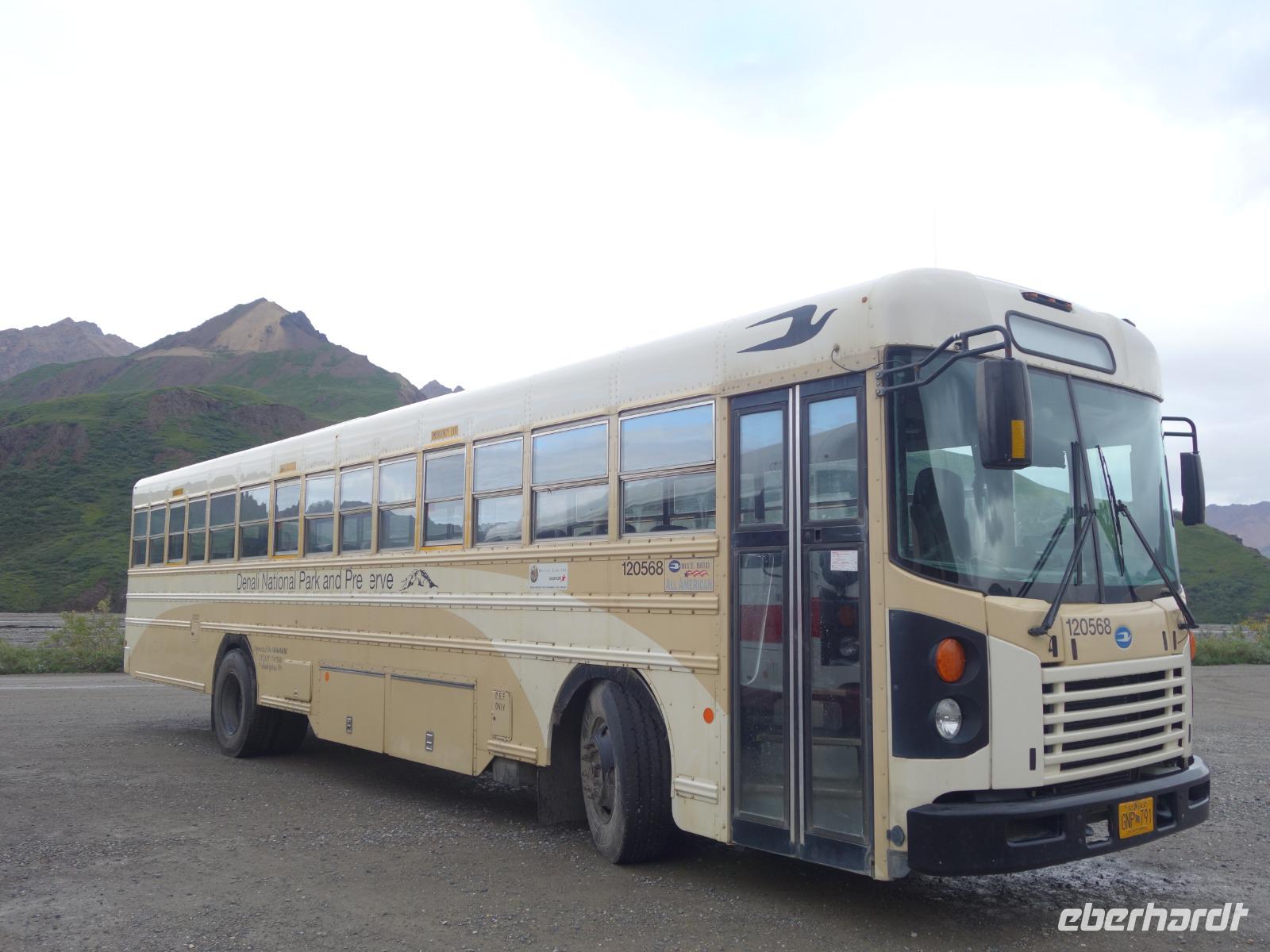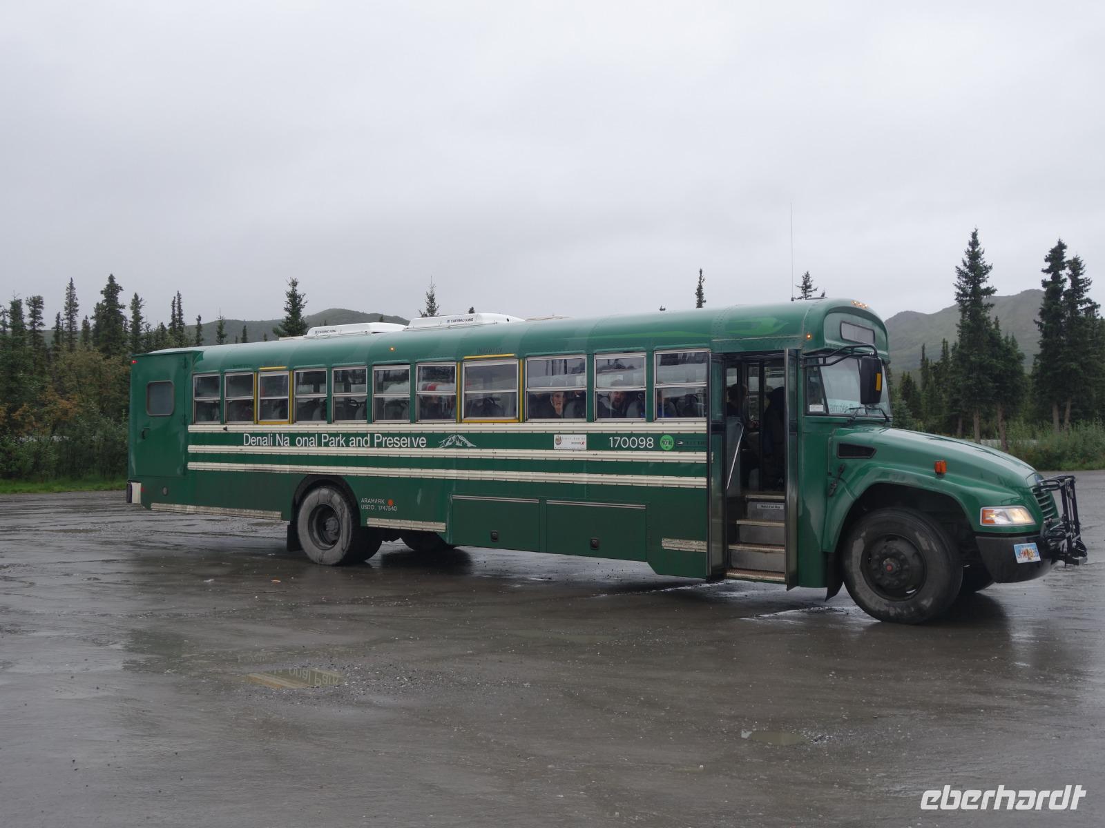 Der heutige Tag steht ganz im Zeichen des gigantischen Denali-Nationalparks. Die Wahrscheinlichkeit, dass wir heute Bären und Karibus sehen, ist hier besonders hoch. Wir starten den Tag sehr früh: um 06:30 Uhr geht unsere Tour in einem alten amerikanischen Schulbus los. Wir werden heute 150km auf Piste durch den weitläufigen Park zurücklegen - hin und zurück in 14h. Begleitet werden wir von unserer Fahrerin Franzi, die den Bus sehr sicher um die teils doch engen und steilen Kurven lenkt und Anna, die geduldig alles was Franzi neben dem Fahren erzählt in das Deutsche übersetzt. Wir fahren bis in die Parkmitte zur ehemaligen Goldgräberstadt Kantishna vorbei am kristallklaren Wonder Lake. Im Roadhouse von Kantishna erwartet uns eine kleine Stärkung und die einmalige Gelegenheit, Gold zu waschen oder mehr über die Schlittenhunde und das große Rennen zu erfahren.