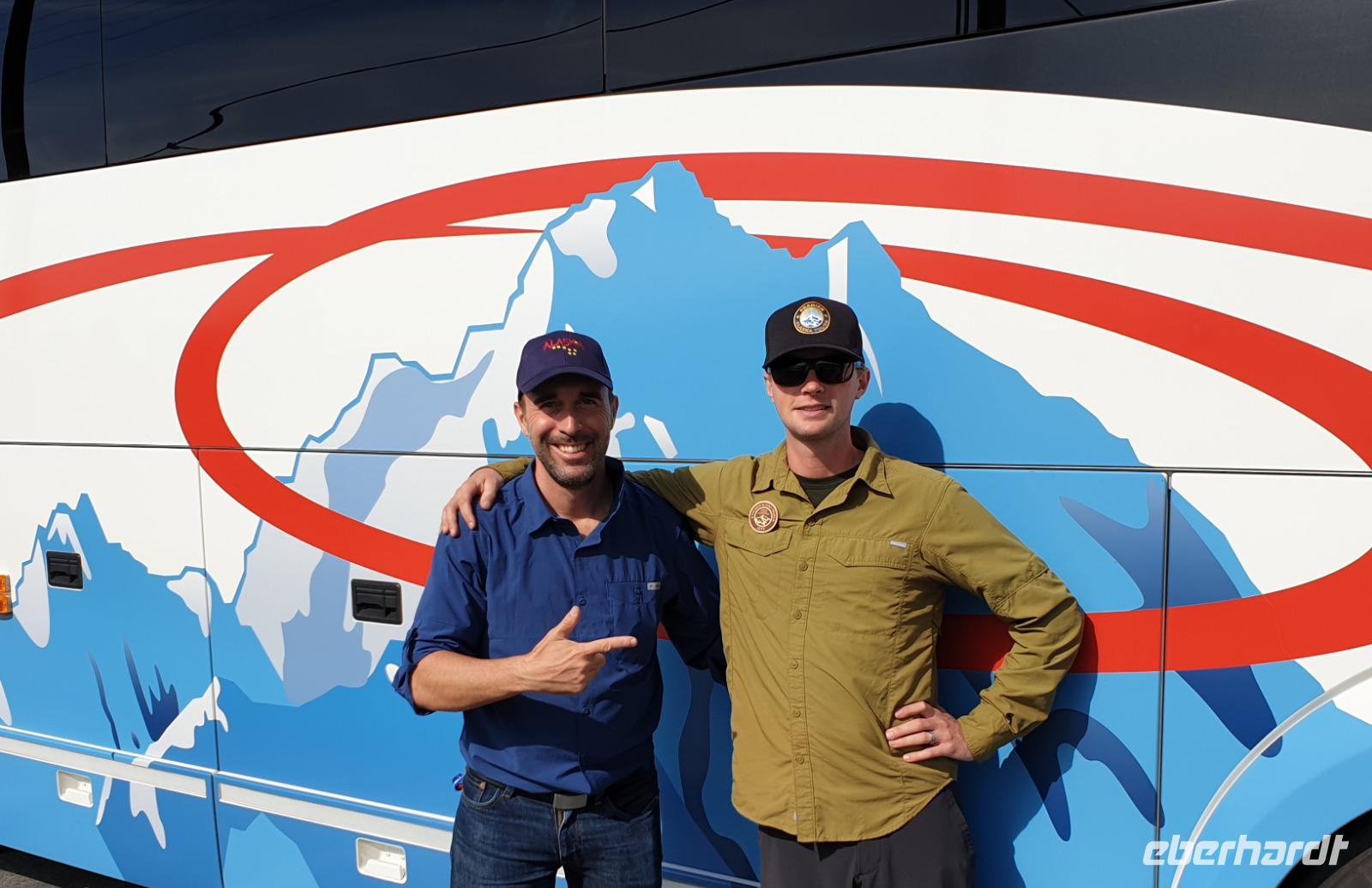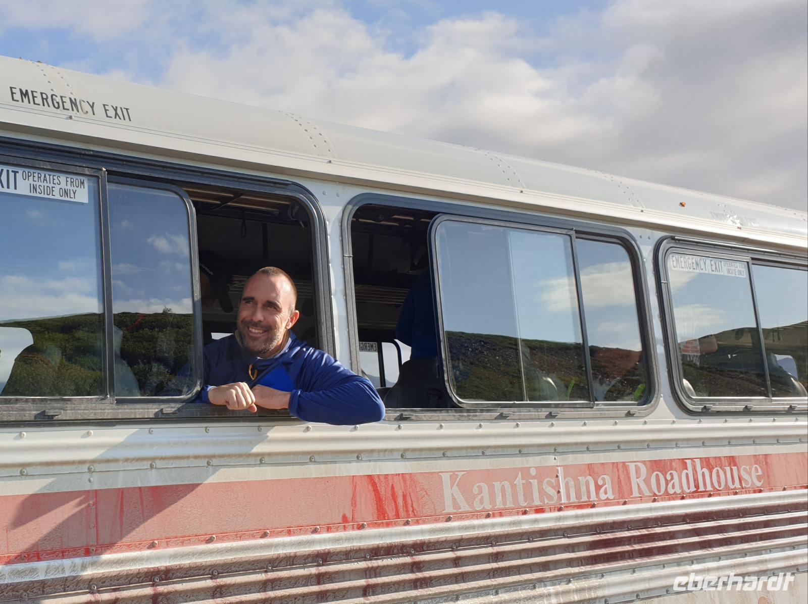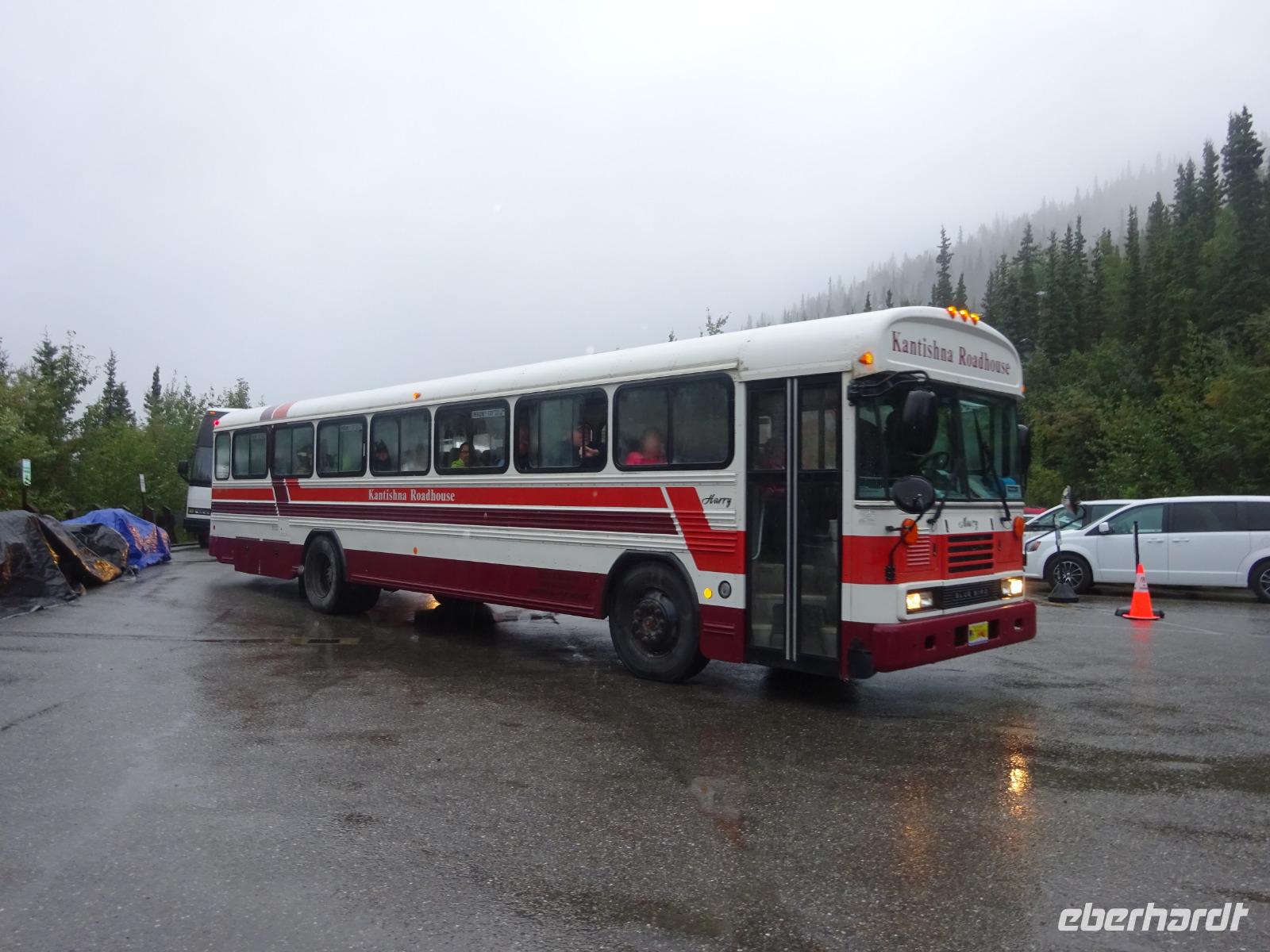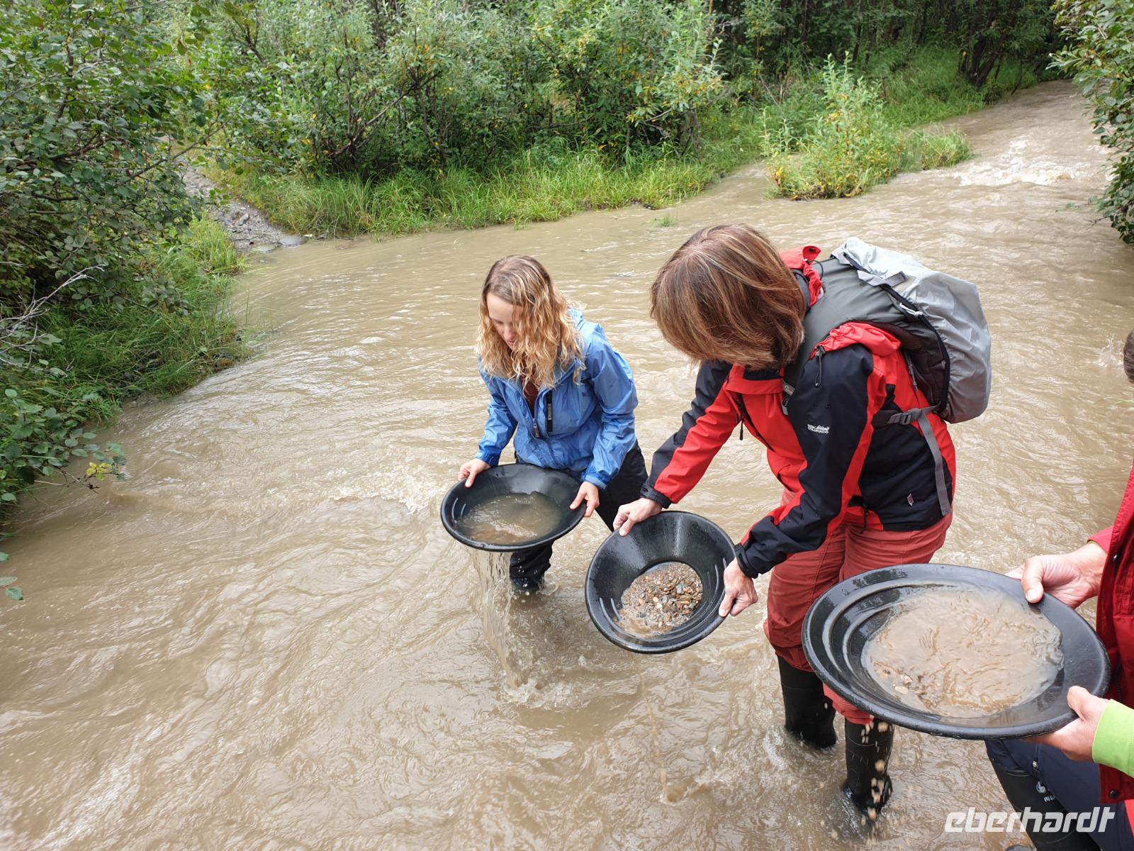 Der heutige Tag steht ganz im Zeichen des gigantischen Denali-Nationalparks. Die Wahrscheinlichkeit, dass wir heute Bären und Karibus sehen, ist hier besonders hoch. Wir starten den Tag sehr früh: um 06:30 Uhr geht unsere Tour in einem alten amerikanischen Schulbus los. Wir werden heute 150km auf Piste durch den weitläufigen Park zurücklegen - hin und zurück in 14h. Begleitet werden wir von unserer Fahrerin Franzi, die den Bus sehr sicher um die teils doch engen und steilen Kurven lenkt und Anna, die geduldig alles was Franzi neben dem Fahren erzählt in das Deutsche übersetzt. Wir fahren bis in die Parkmitte zur ehemaligen Goldgräberstadt Kantishna vorbei am kristallklaren Wonder Lake. Im Roadhouse von Kantishna erwartet uns eine kleine Stärkung und die einmalige Gelegenheit, Gold zu waschen oder mehr über die Schlittenhunde und das große Rennen zu erfahren.