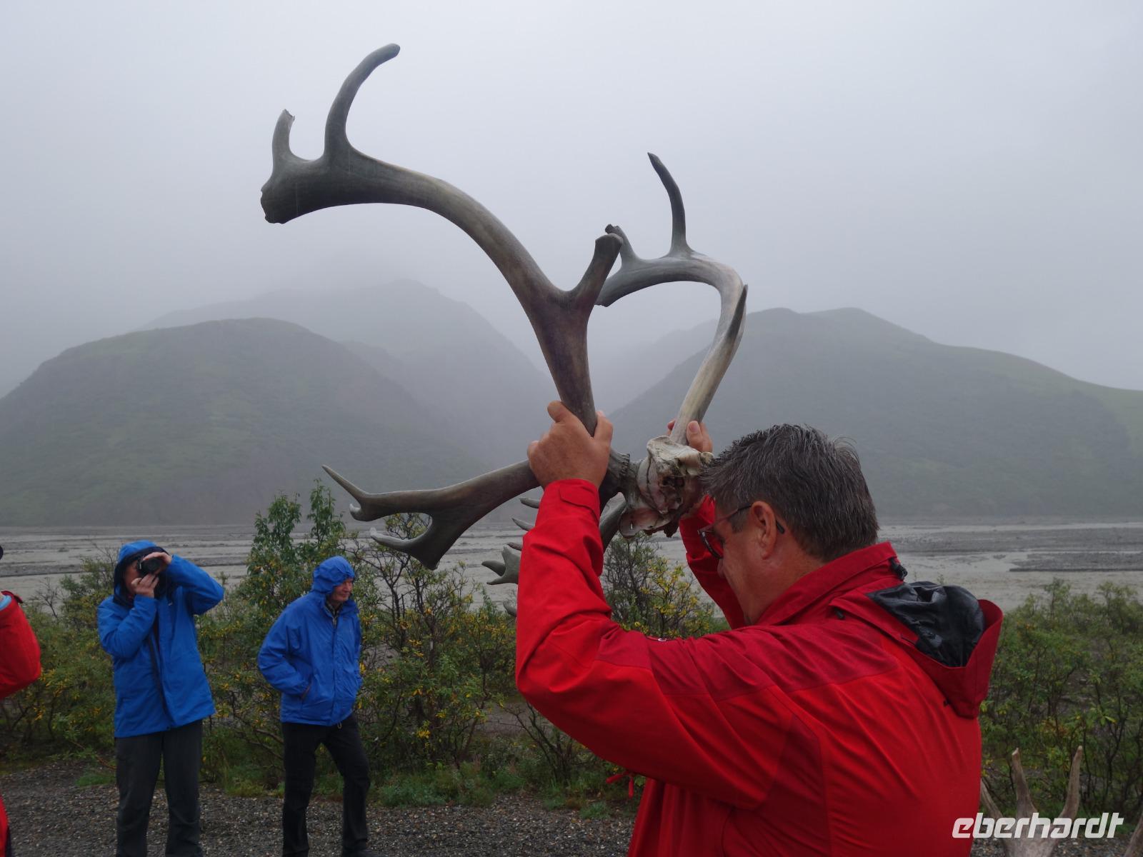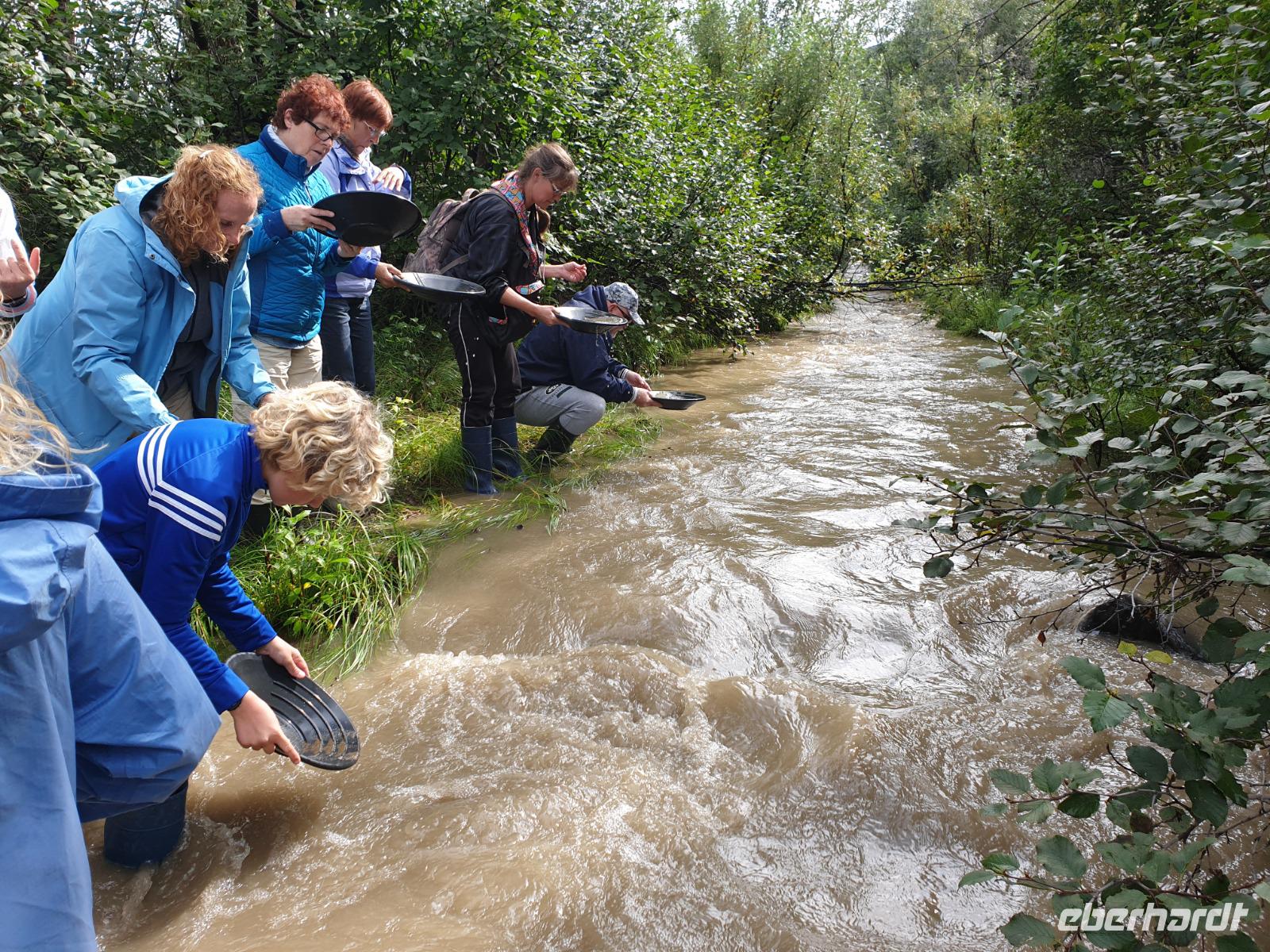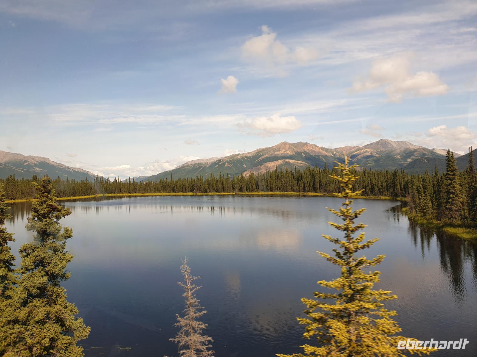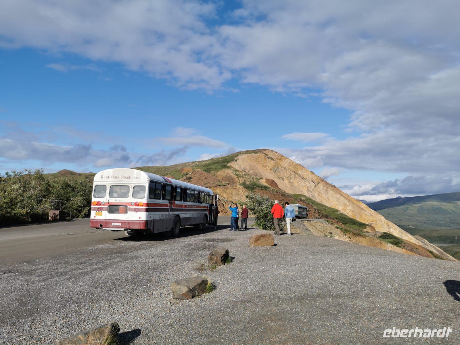 Der heutige Tag steht ganz im Zeichen des gigantischen Denali-Nationalparks. Die Wahrscheinlichkeit, dass wir heute Bären und Karibus sehen, ist hier besonders hoch. Wir starten den Tag sehr früh: um 06:30 Uhr geht unsere Tour in einem alten amerikanischen Schulbus los. Wir werden heute 150km auf Piste durch den weitläufigen Park zurücklegen - hin und zurück in 14h. Begleitet werden wir von unserer Fahrerin Franzi, die den Bus sehr sicher um die teils doch engen und steilen Kurven lenkt und Anna, die geduldig alles was Franzi neben dem Fahren erzählt in das Deutsche übersetzt. Wir fahren bis in die Parkmitte zur ehemaligen Goldgräberstadt Kantishna vorbei am kristallklaren Wonder Lake. Im Roadhouse von Kantishna erwartet uns eine kleine Stärkung und die einmalige Gelegenheit, Gold zu waschen oder mehr über die Schlittenhunde und das große Rennen zu erfahren.