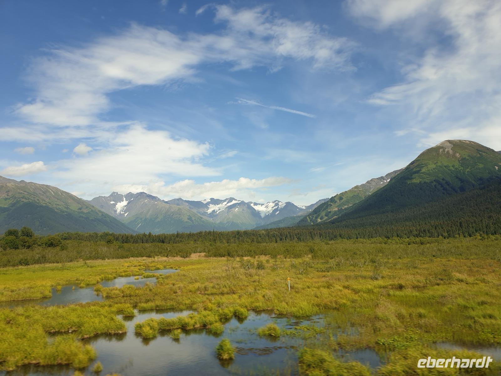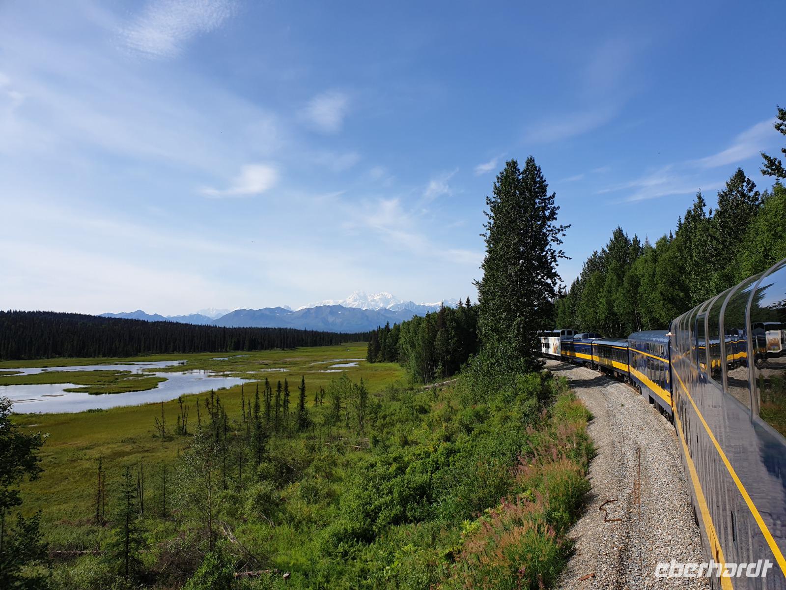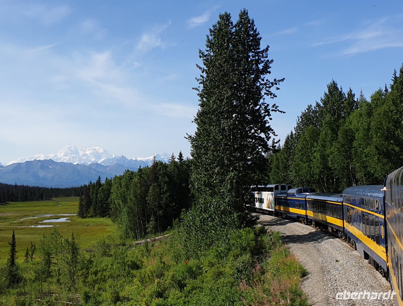Dann genießen wir eine ca. 7-stündige Zugfahrt durch eine einzigartige Landschaft! Die Fahrt mit der Alaska Railroad führt uns auf einer der schönsten Bahnstrecken Nordamerikas von Cantwell vorbei an Wasilla bis Anchorage. Heute ist bestes Zugfahrt Wetter mit blauem Himmel und einer klaren weiten Sicht. Wir erhoffen uns natürlich, einen Blick auf den Denali werfen zu können. Und wie auch - wir werden belohnt. Über eine längere Zeit können wir den höchsten Berg Nordamerikas mit seiner weißen Spitze bestaunen. Wir sehen den Denali und das gesamte Bergmassiv so klar, wie es nur selten im Jahr möglich ist. Wir haben also mal wieder absolut Glück.