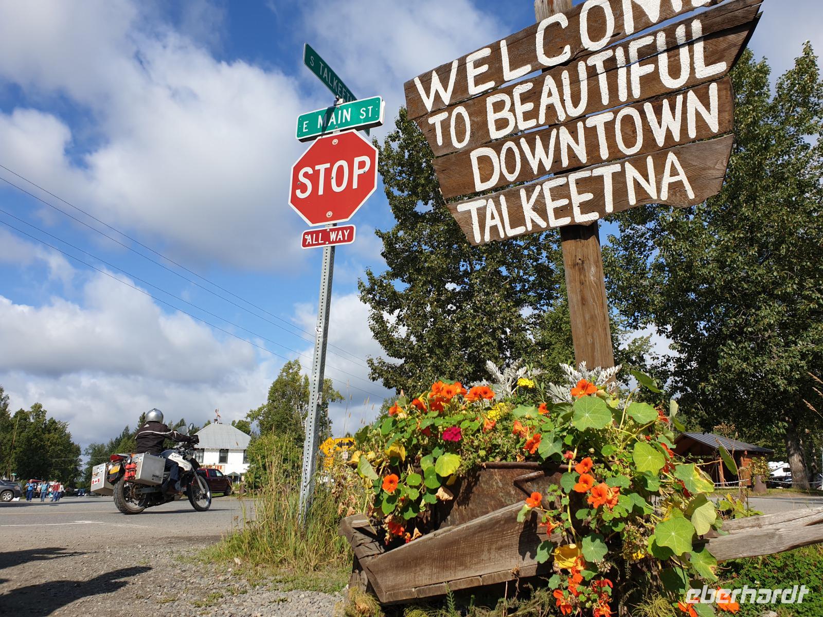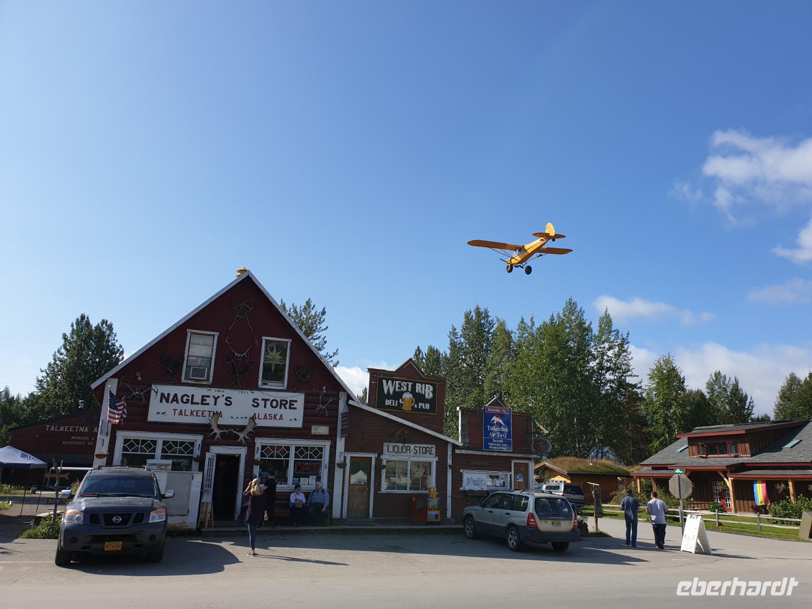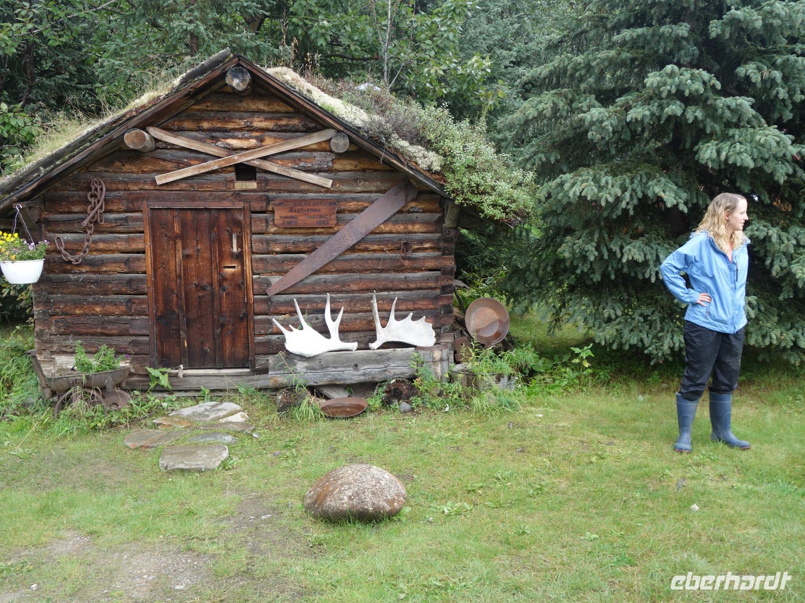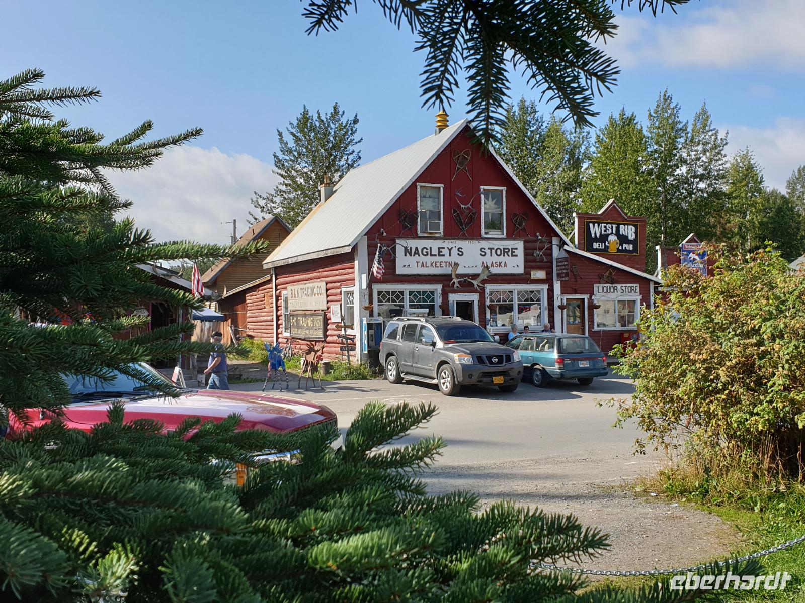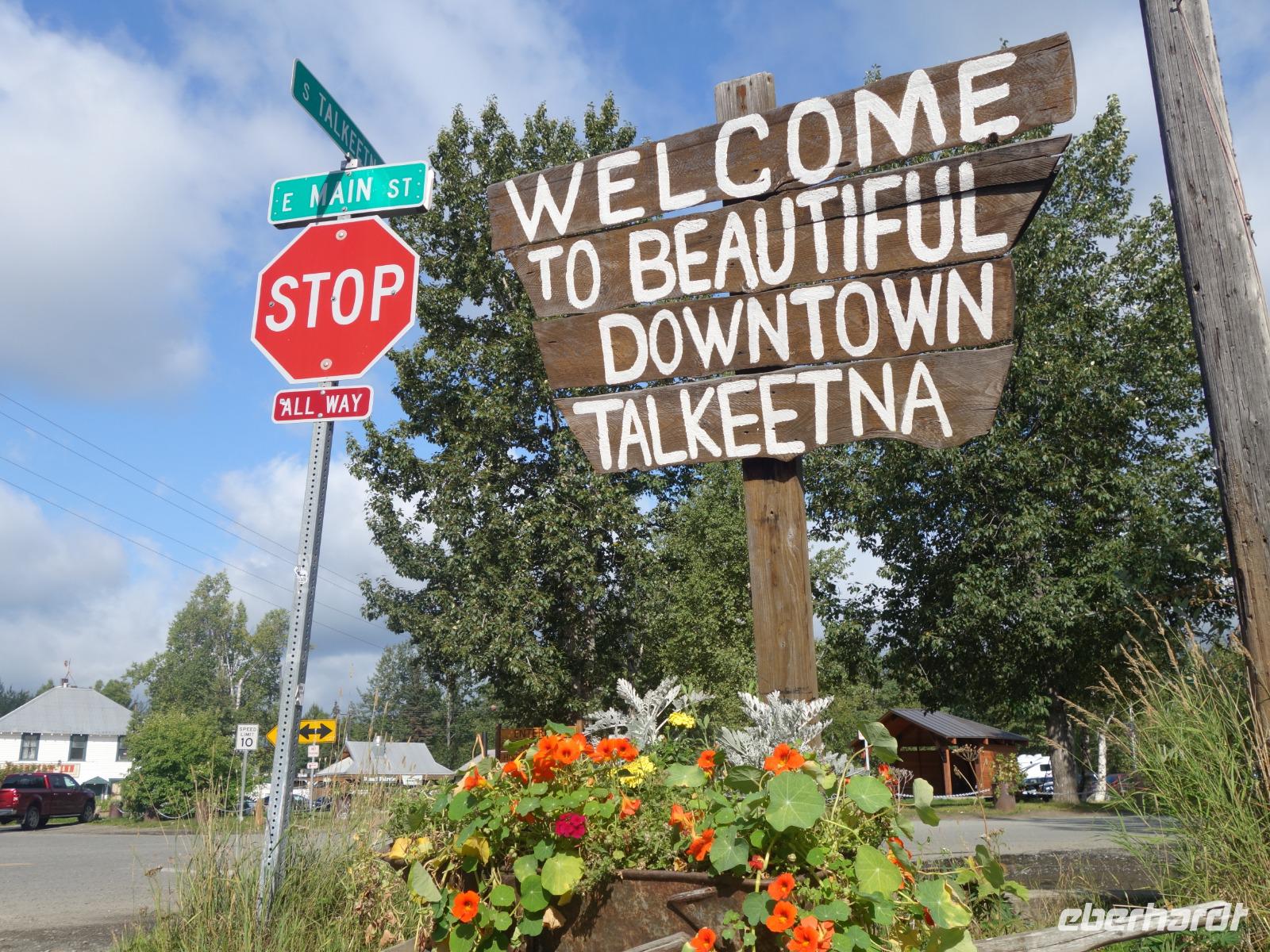 Der erste Stopp heute gilt Talkeetna - ein authentischer Ort, wie sich die meisten Leute eine Alaska-Ansiedlung vorstellen könnten. Kleinere Gebäude aus Holz und keine großen Geschäfte. Die Gemeinde liegt nördlich von Anchorage, am Flussdelta des Talkeetna und Susutna Rivers. Um die Jahrhundertwende war es ein Zentrum für Goldbergbau und auch heute noch bietet Talkeetna viel von seinem ursprünglichen Charme. Talkeetna hat sich gut auf Touristen eingestellt. Geschäfte mit allerlei Souvenirs in den Fensterläden säumen die Schotterstraße. Talkeetna ist wichtigster Ausgangspunkt für die Besteigung des Denali, den man vom Ufer aus bei guten Bedingungen sehen kann. Heute haben wir noch kein Glück, es ist sehr diesig.