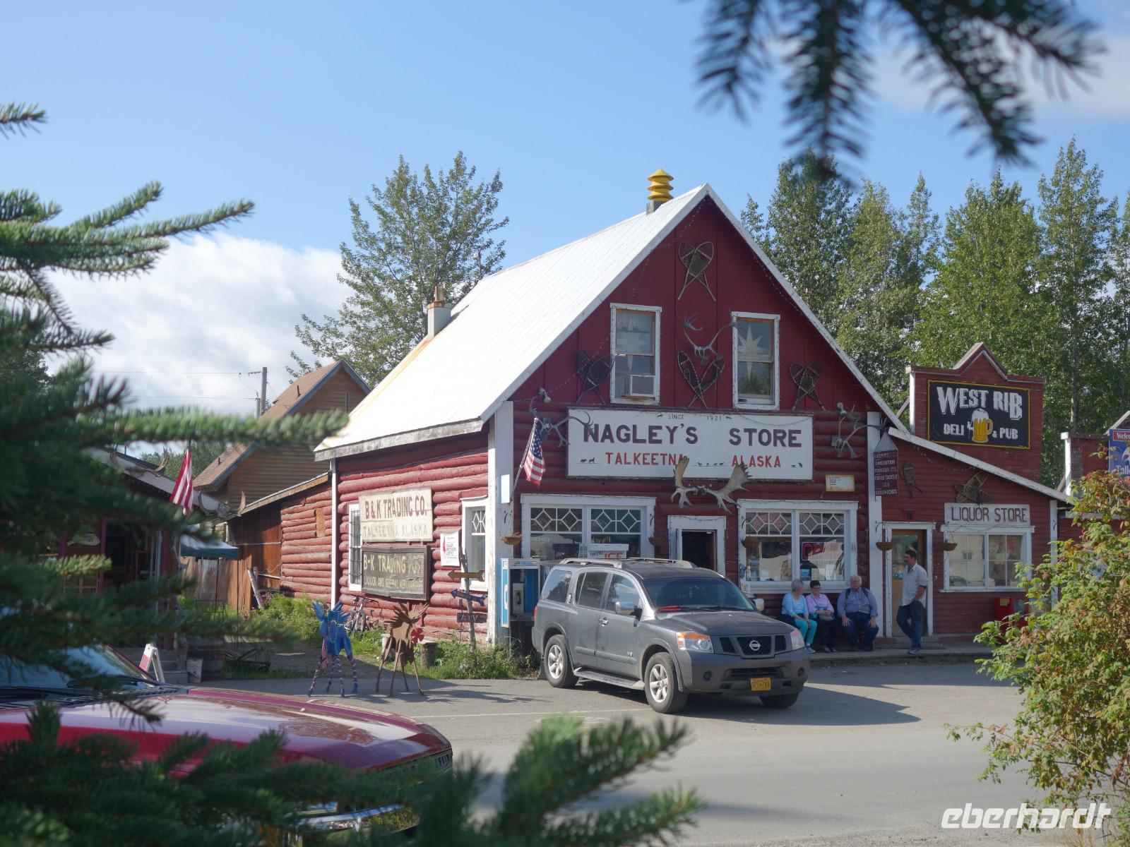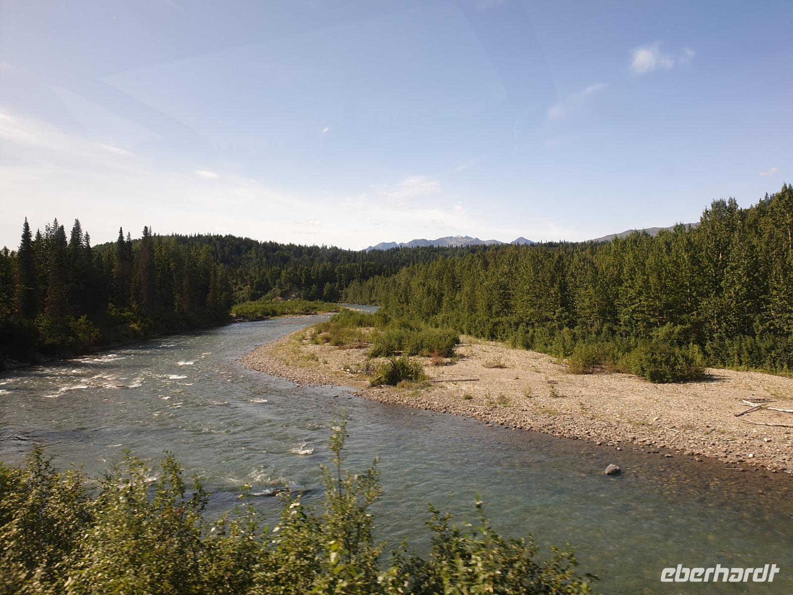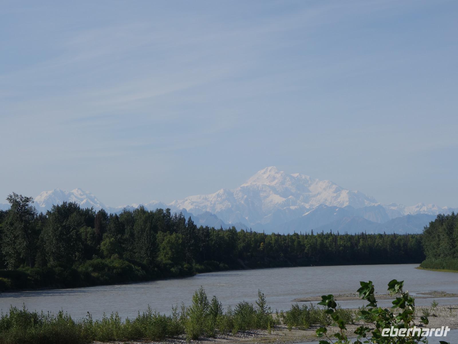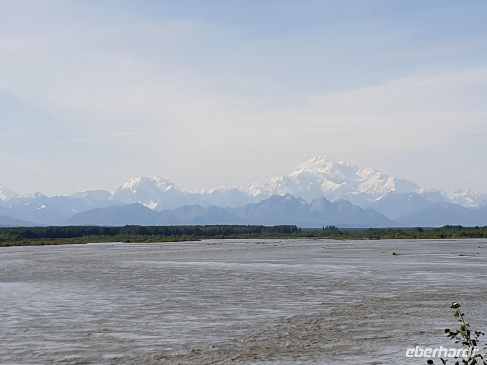 Der erste Stopp heute gilt Talkeetna - ein authentischer Ort, wie sich die meisten Leute eine Alaska-Ansiedlung vorstellen könnten. Kleinere Gebäude aus Holz und keine großen Geschäfte. Die Gemeinde liegt nördlich von Anchorage, am Flussdelta des Talkeetna und Susutna Rivers. Um die Jahrhundertwende war es ein Zentrum für Goldbergbau und auch heute noch bietet Talkeetna viel von seinem ursprünglichen Charme. Talkeetna hat sich gut auf Touristen eingestellt. Geschäfte mit allerlei Souvenirs in den Fensterläden säumen die Schotterstraße. Talkeetna ist wichtigster Ausgangspunkt für die Besteigung des Denali, den man vom Ufer aus bei guten Bedingungen sehen kann. Heute haben wir noch kein Glück, es ist sehr diesig.