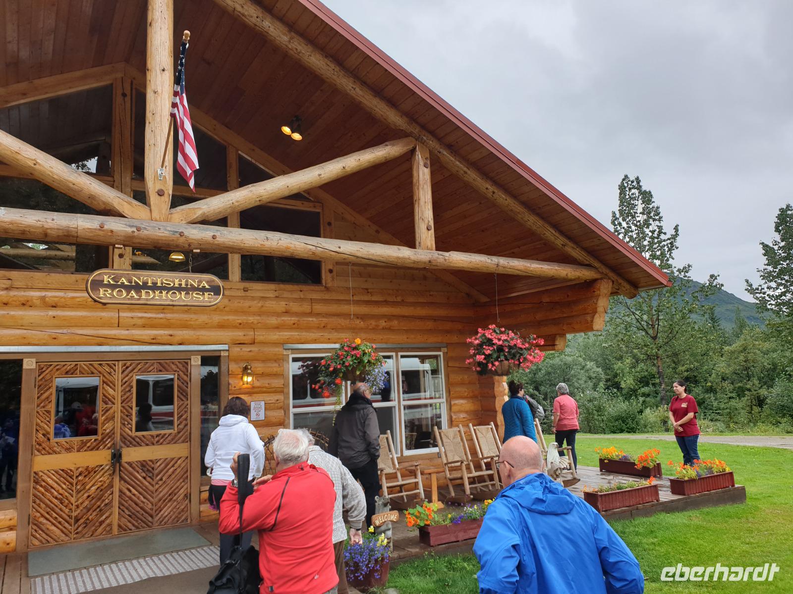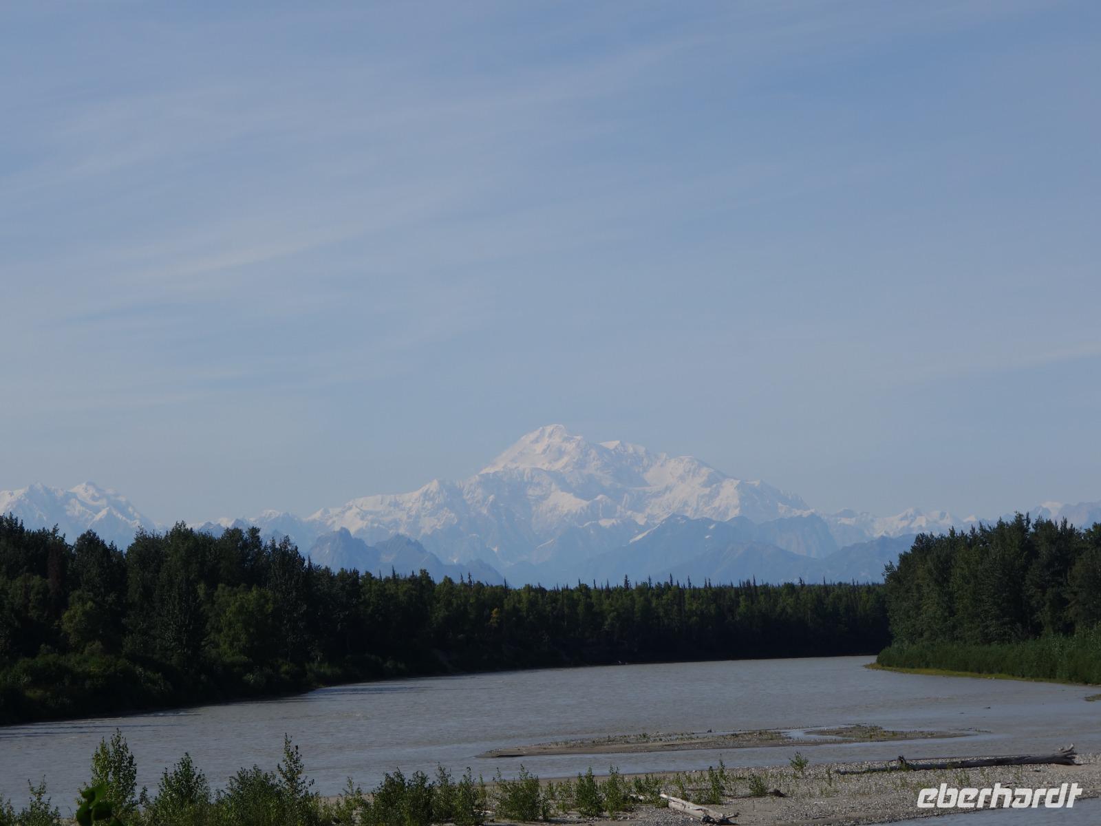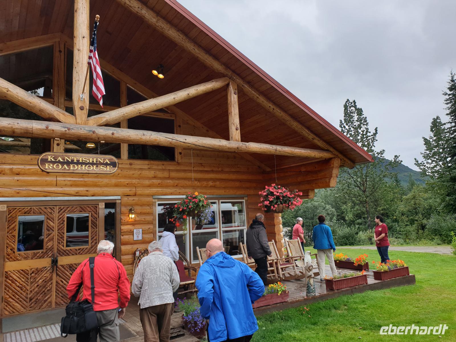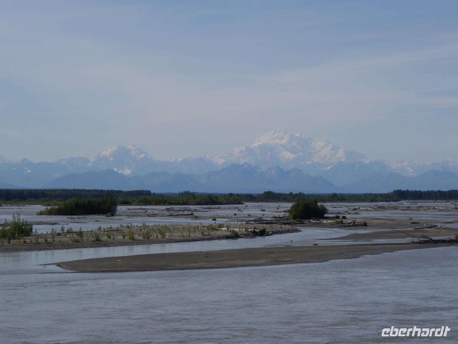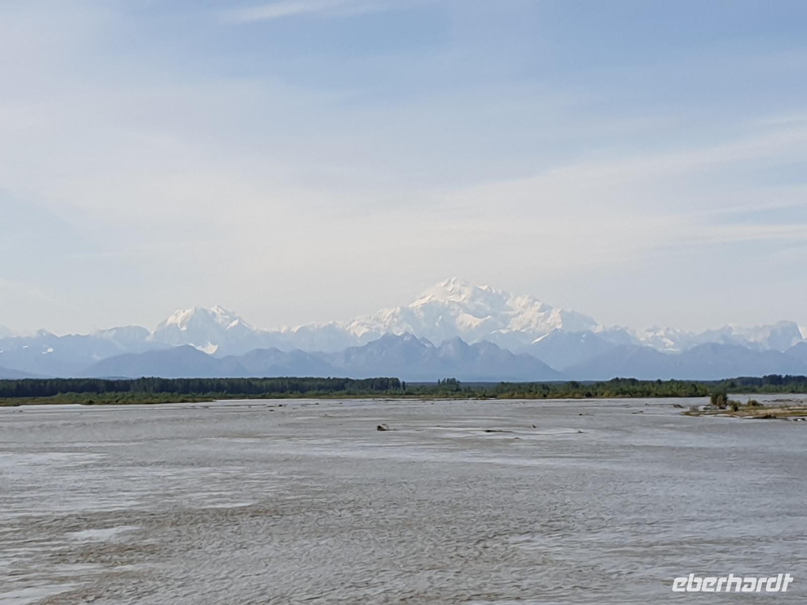Der erste Stopp heute gilt Talkeetna - ein authentischer Ort, wie sich die meisten Leute eine Alaska-Ansiedlung vorstellen könnten. Kleinere Gebäude aus Holz und keine großen Geschäfte. Die Gemeinde liegt nördlich von Anchorage, am Flussdelta des Talkeetna und Susutna Rivers. Um die Jahrhundertwende war es ein Zentrum für Goldbergbau und auch heute noch bietet Talkeetna viel von seinem ursprünglichen Charme. Talkeetna hat sich gut auf Touristen eingestellt. Geschäfte mit allerlei Souvenirs in den Fensterläden säumen die Schotterstraße. Talkeetna ist wichtigster Ausgangspunkt für die Besteigung des Denali, den man vom Ufer aus bei guten Bedingungen sehen kann. Heute haben wir noch kein Glück, es ist sehr diesig.