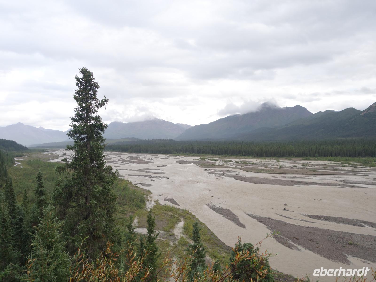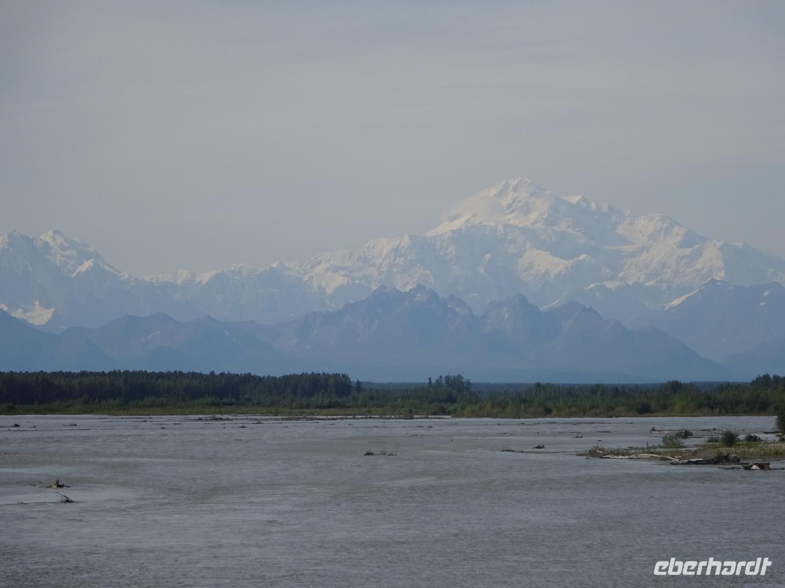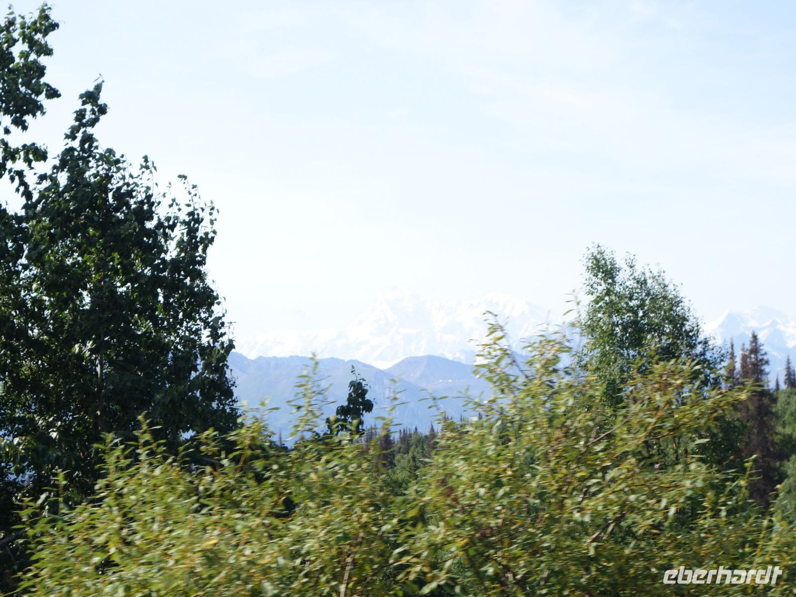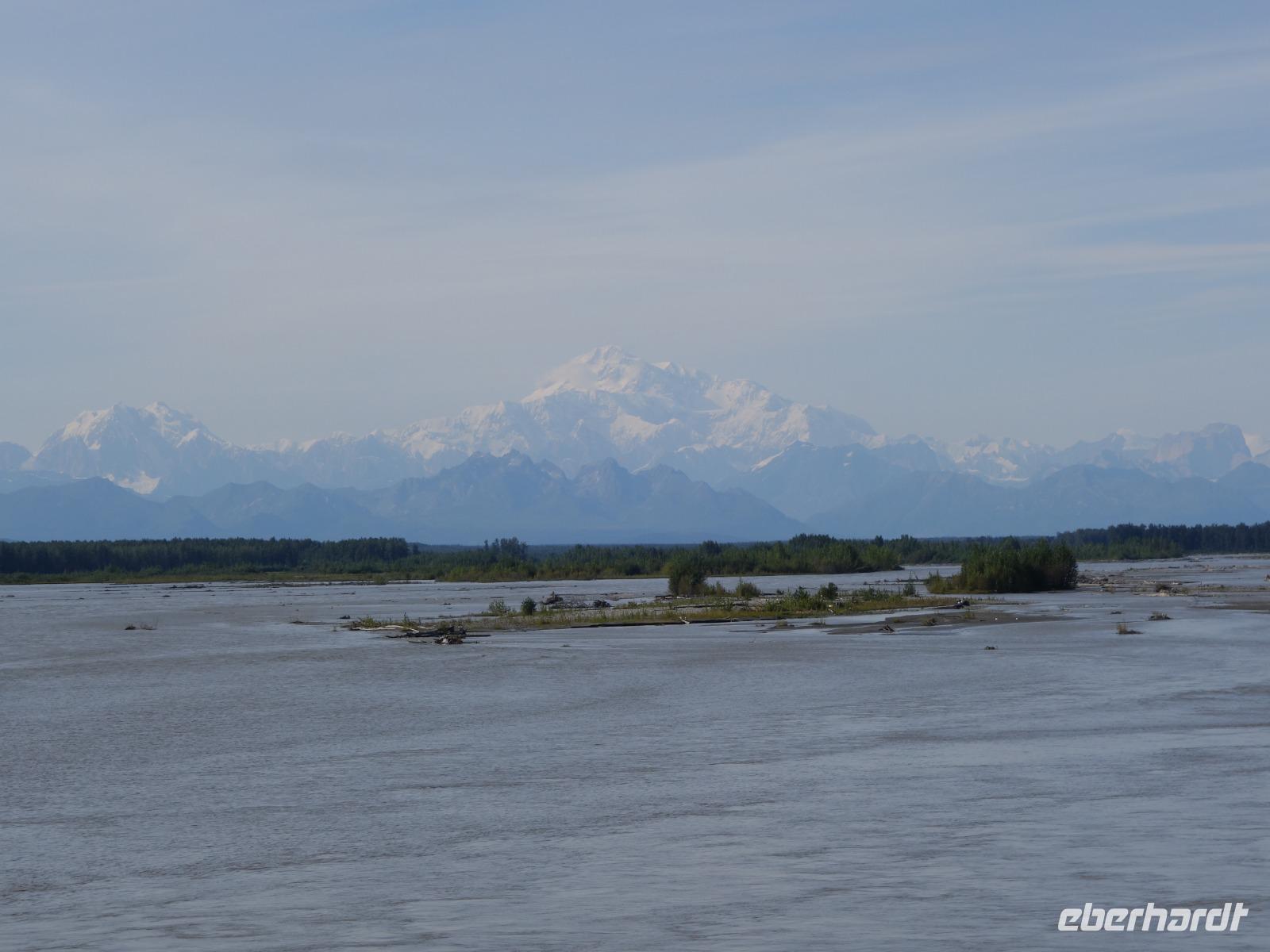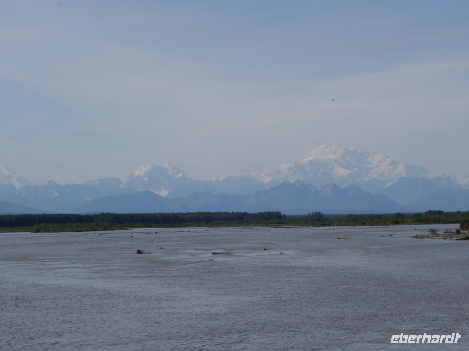 Der erste Stopp heute gilt Talkeetna - ein authentischer Ort, wie sich die meisten Leute eine Alaska-Ansiedlung vorstellen könnten. Kleinere Gebäude aus Holz und keine großen Geschäfte. Die Gemeinde liegt nördlich von Anchorage, am Flussdelta des Talkeetna und Susutna Rivers. Um die Jahrhundertwende war es ein Zentrum für Goldbergbau und auch heute noch bietet Talkeetna viel von seinem ursprünglichen Charme. Talkeetna hat sich gut auf Touristen eingestellt. Geschäfte mit allerlei Souvenirs in den Fensterläden säumen die Schotterstraße. Talkeetna ist wichtigster Ausgangspunkt für die Besteigung des Denali, den man vom Ufer aus bei guten Bedingungen sehen kann. Heute haben wir noch kein Glück, es ist sehr diesig.