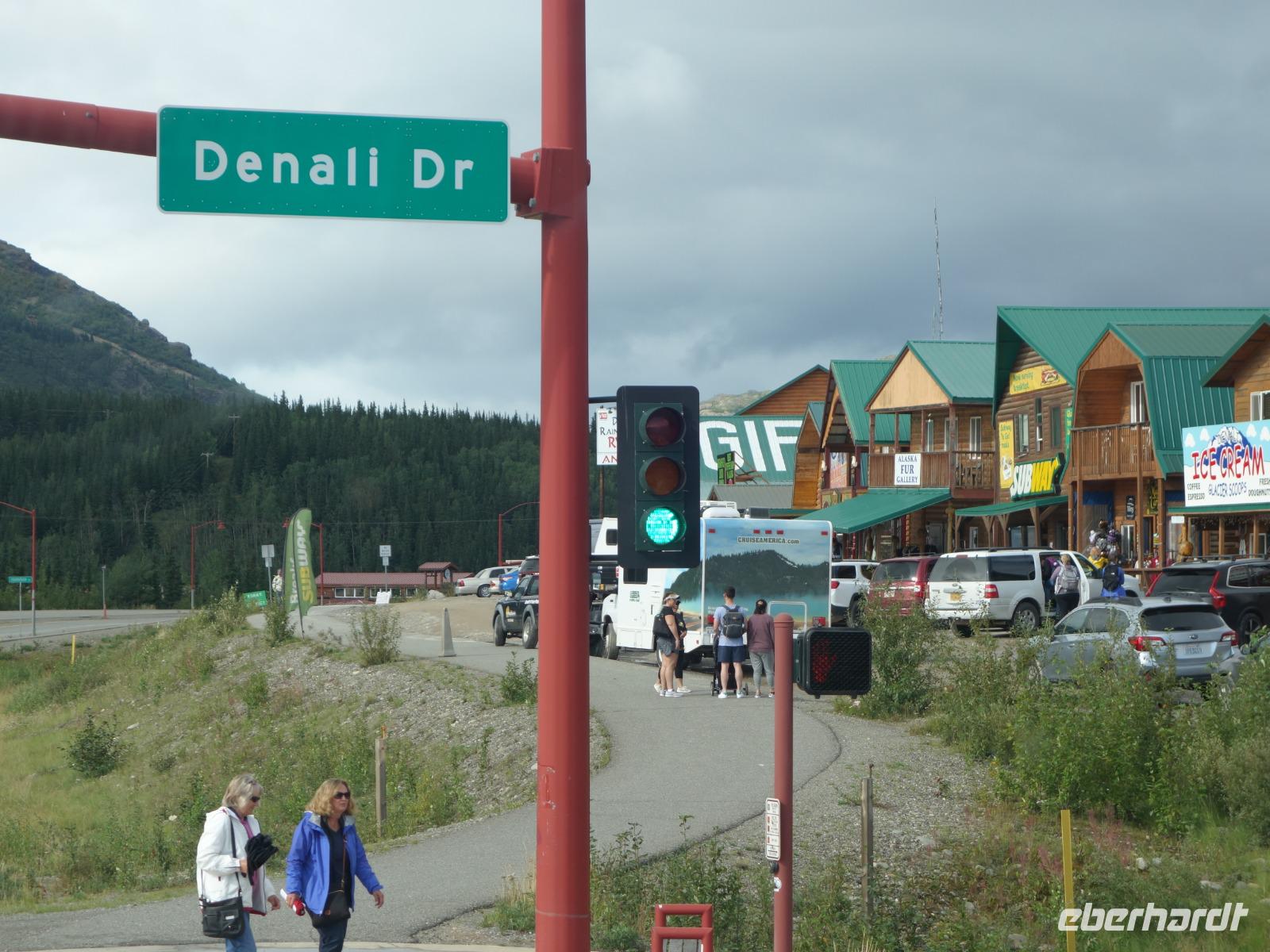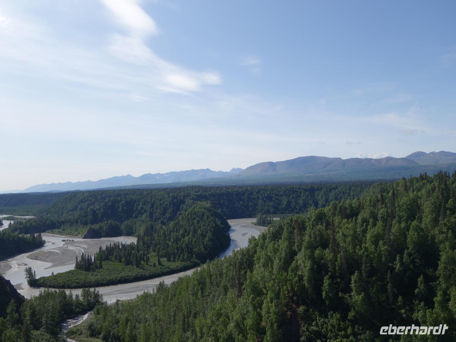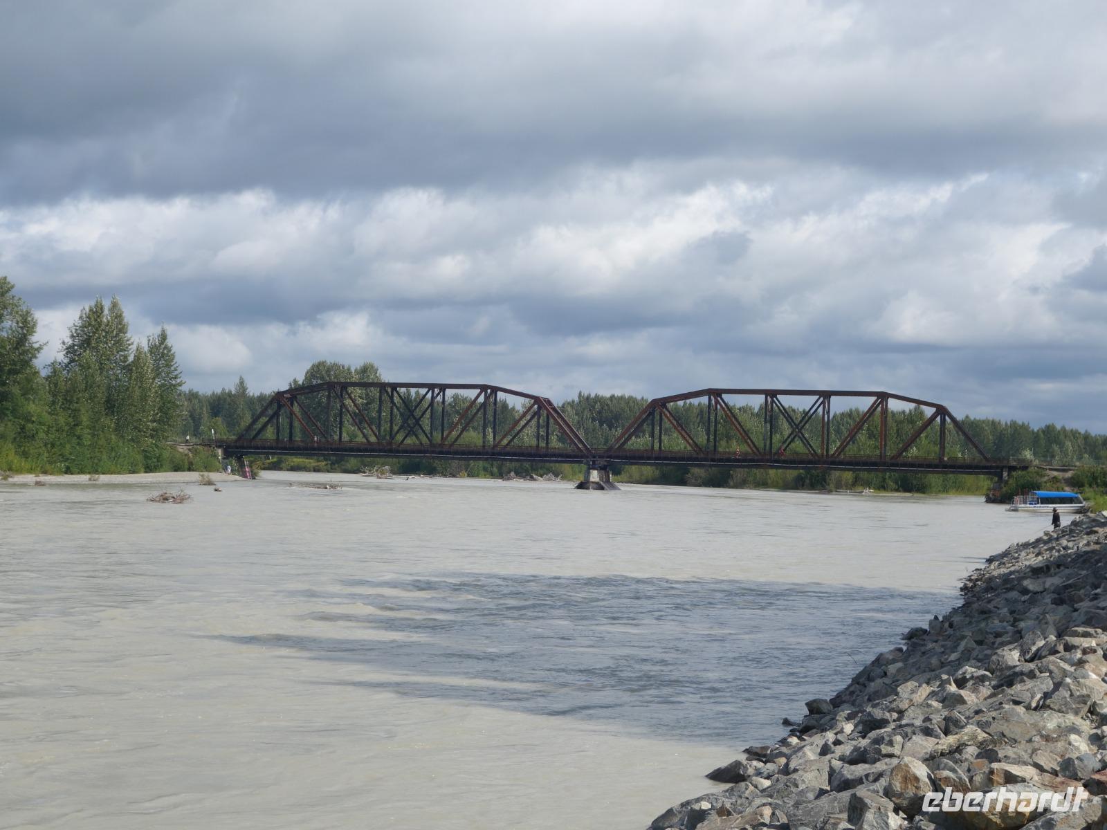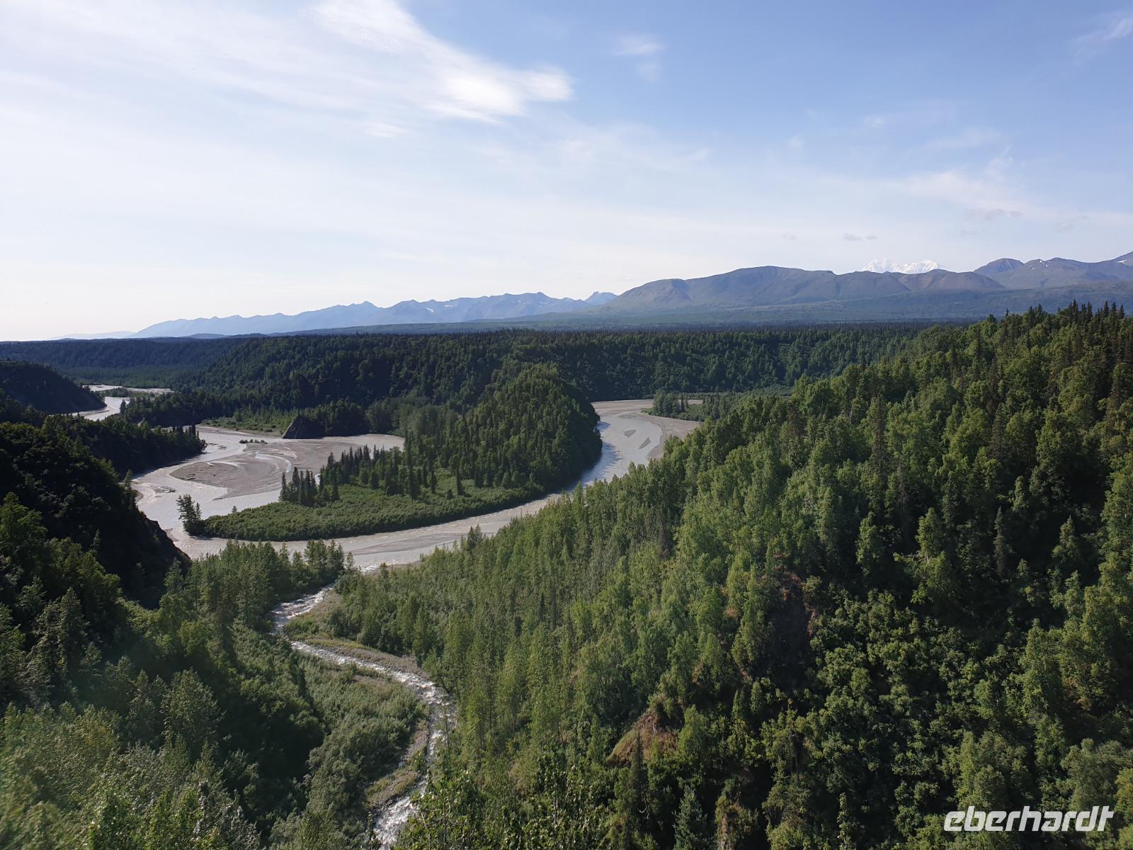 Der erste Stopp heute gilt Talkeetna - ein authentischer Ort, wie sich die meisten Leute eine Alaska-Ansiedlung vorstellen könnten. Kleinere Gebäude aus Holz und keine großen Geschäfte. Die Gemeinde liegt nördlich von Anchorage, am Flussdelta des Talkeetna und Susutna Rivers. Um die Jahrhundertwende war es ein Zentrum für Goldbergbau und auch heute noch bietet Talkeetna viel von seinem ursprünglichen Charme. Talkeetna hat sich gut auf Touristen eingestellt. Geschäfte mit allerlei Souvenirs in den Fensterläden säumen die Schotterstraße. Talkeetna ist wichtigster Ausgangspunkt für die Besteigung des Denali, den man vom Ufer aus bei guten Bedingungen sehen kann. Heute haben wir noch kein Glück, es ist sehr diesig.
