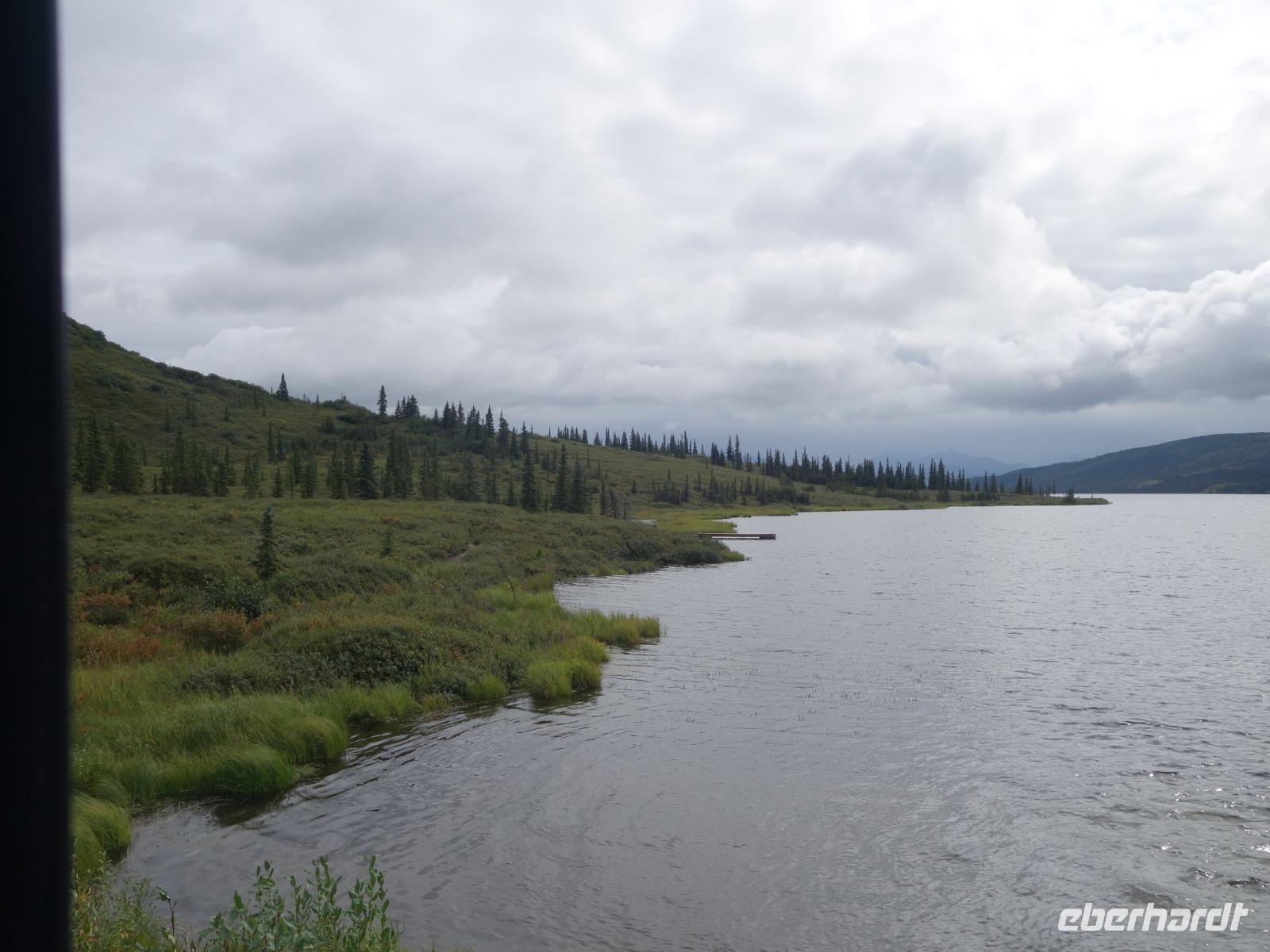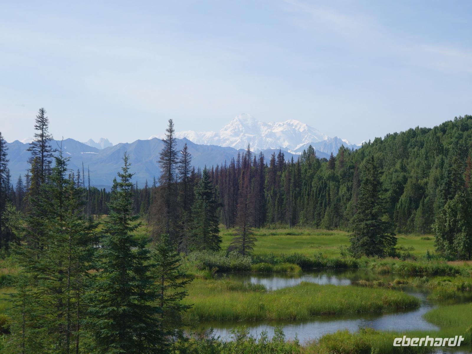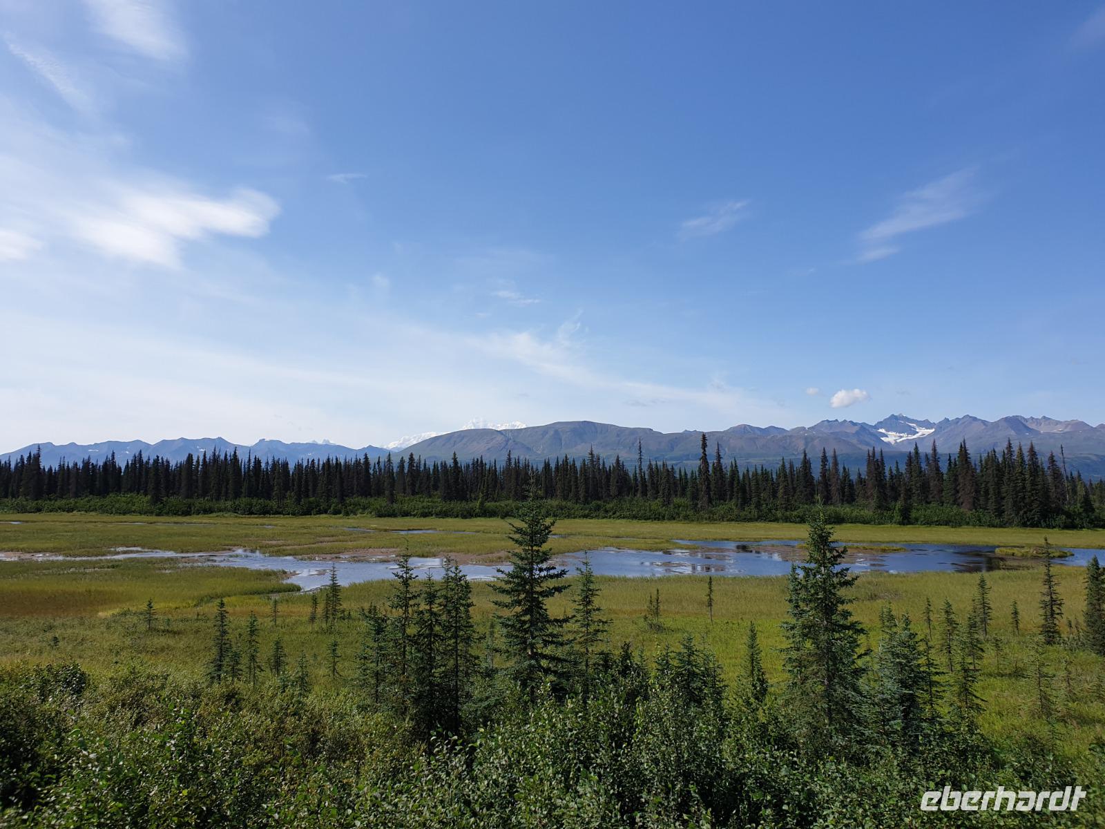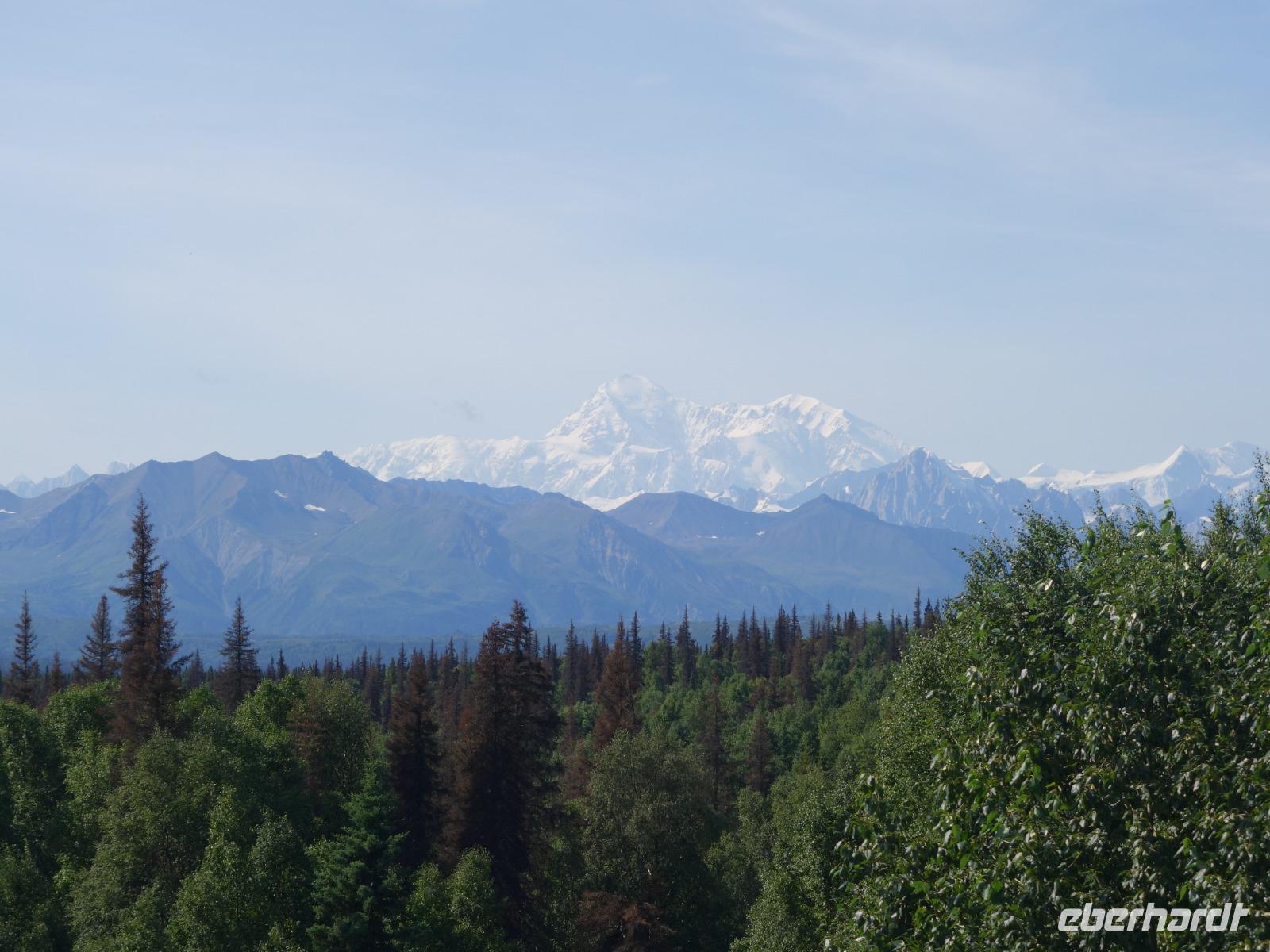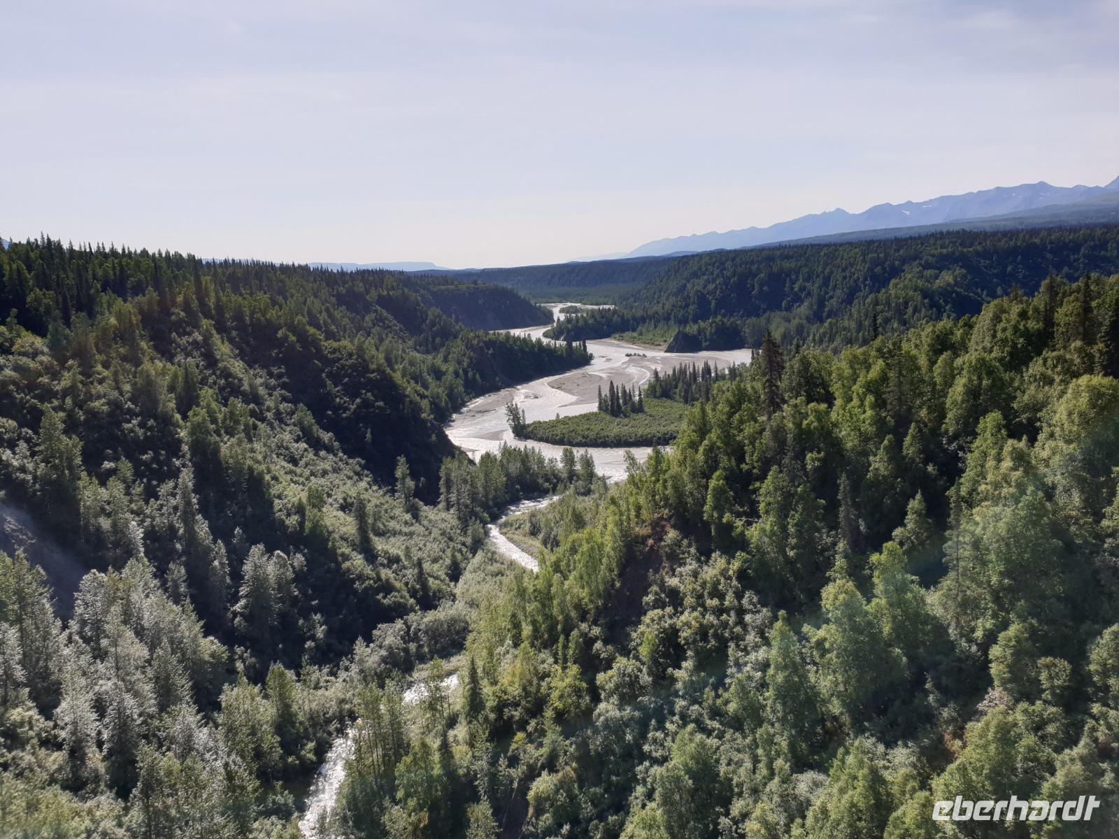 Der erste Stopp heute gilt Talkeetna - ein authentischer Ort, wie sich die meisten Leute eine Alaska-Ansiedlung vorstellen könnten. Kleinere Gebäude aus Holz und keine großen Geschäfte. Die Gemeinde liegt nördlich von Anchorage, am Flussdelta des Talkeetna und Susutna Rivers. Um die Jahrhundertwende war es ein Zentrum für Goldbergbau und auch heute noch bietet Talkeetna viel von seinem ursprünglichen Charme. Talkeetna hat sich gut auf Touristen eingestellt. Geschäfte mit allerlei Souvenirs in den Fensterläden säumen die Schotterstraße. Talkeetna ist wichtigster Ausgangspunkt für die Besteigung des Denali, den man vom Ufer aus bei guten Bedingungen sehen kann. Heute haben wir noch kein Glück, es ist sehr diesig.