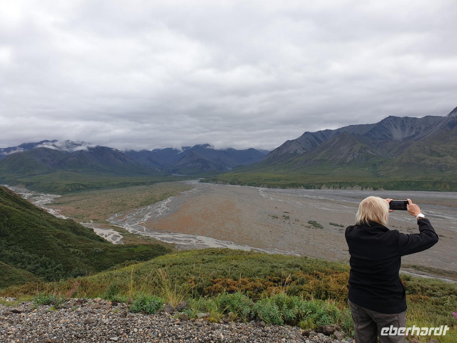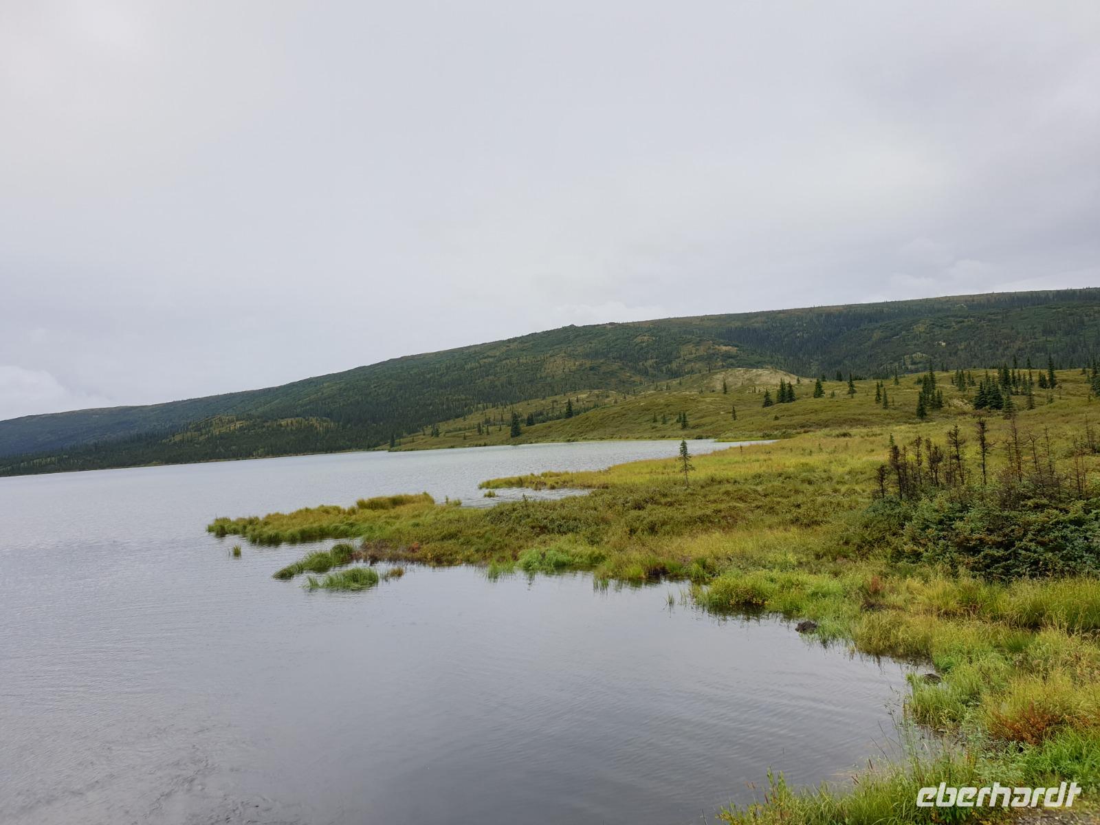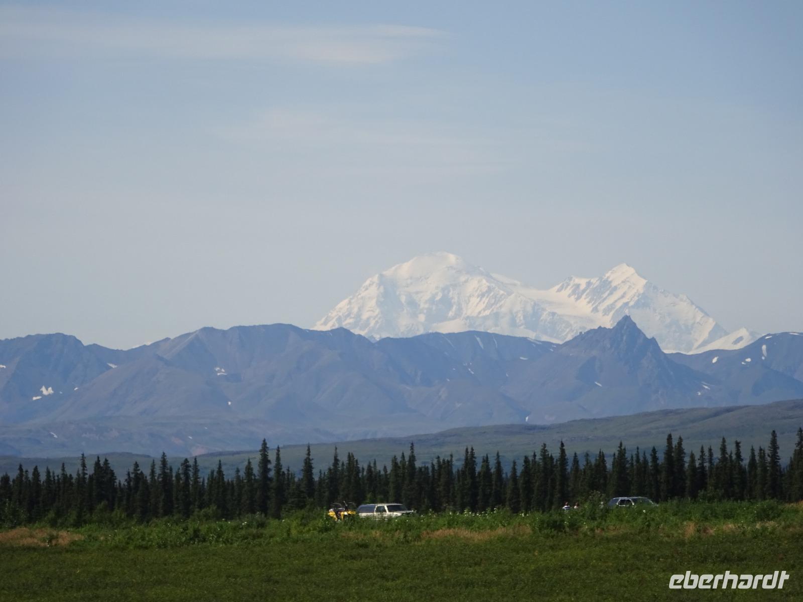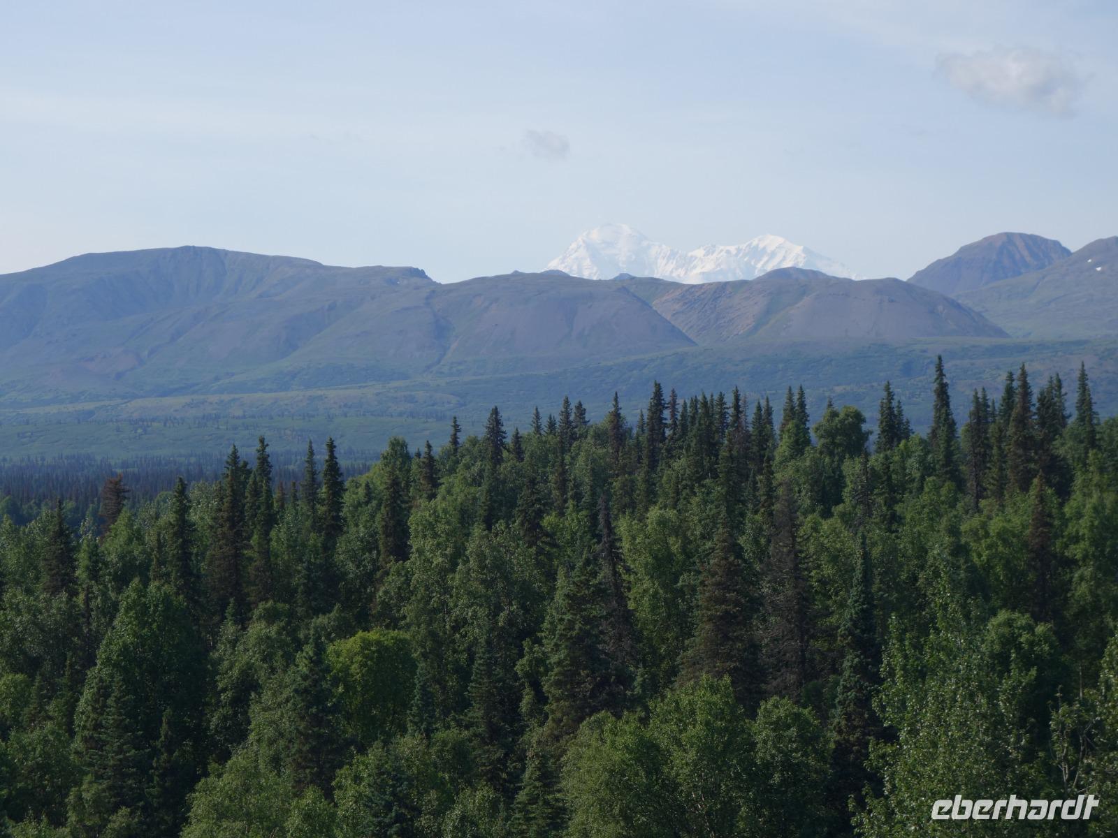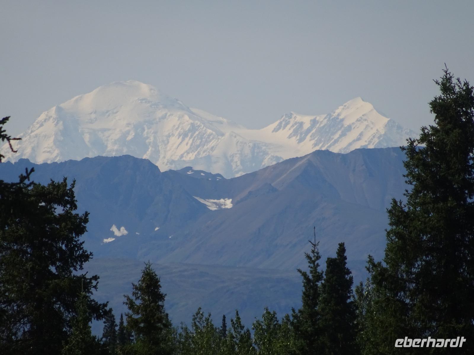 Der erste Stopp heute gilt Talkeetna - ein authentischer Ort, wie sich die meisten Leute eine Alaska-Ansiedlung vorstellen könnten. Kleinere Gebäude aus Holz und keine großen Geschäfte. Die Gemeinde liegt nördlich von Anchorage, am Flussdelta des Talkeetna und Susutna Rivers. Um die Jahrhundertwende war es ein Zentrum für Goldbergbau und auch heute noch bietet Talkeetna viel von seinem ursprünglichen Charme. Talkeetna hat sich gut auf Touristen eingestellt. Geschäfte mit allerlei Souvenirs in den Fensterläden säumen die Schotterstraße. Talkeetna ist wichtigster Ausgangspunkt für die Besteigung des Denali, den man vom Ufer aus bei guten Bedingungen sehen kann. Heute haben wir noch kein Glück, es ist sehr diesig.