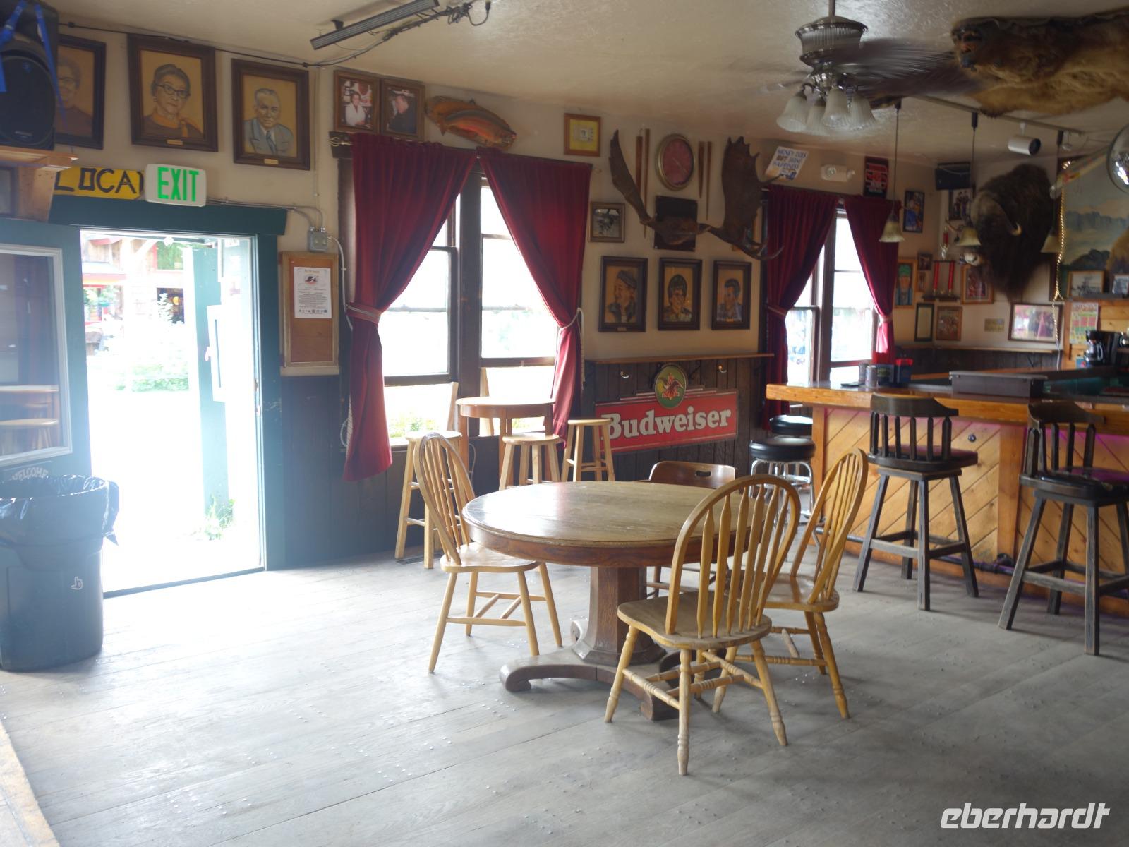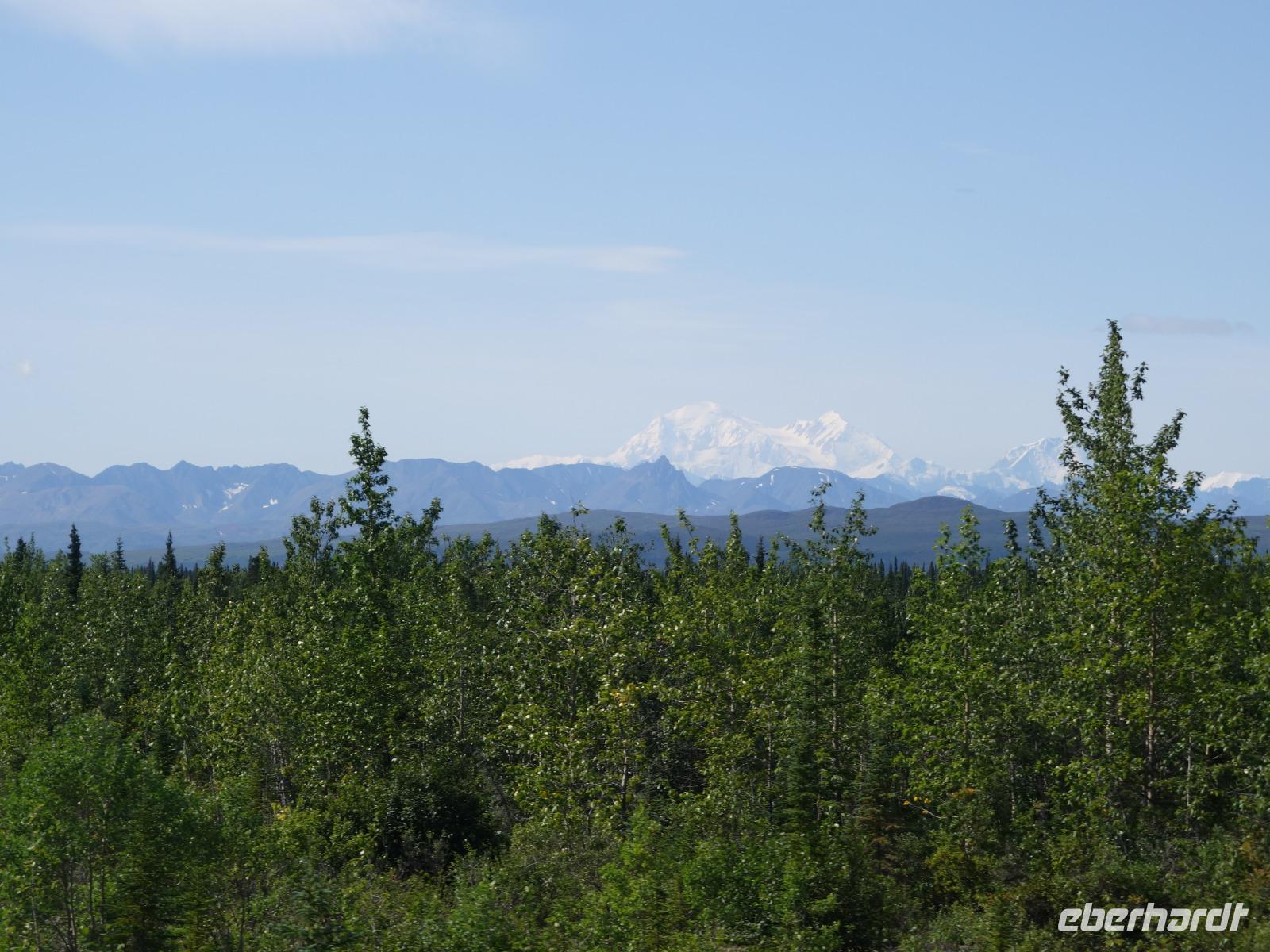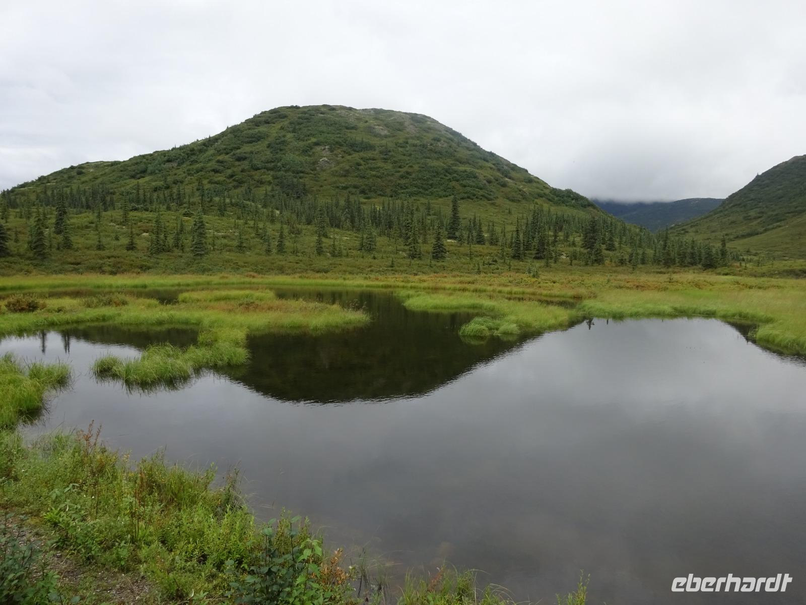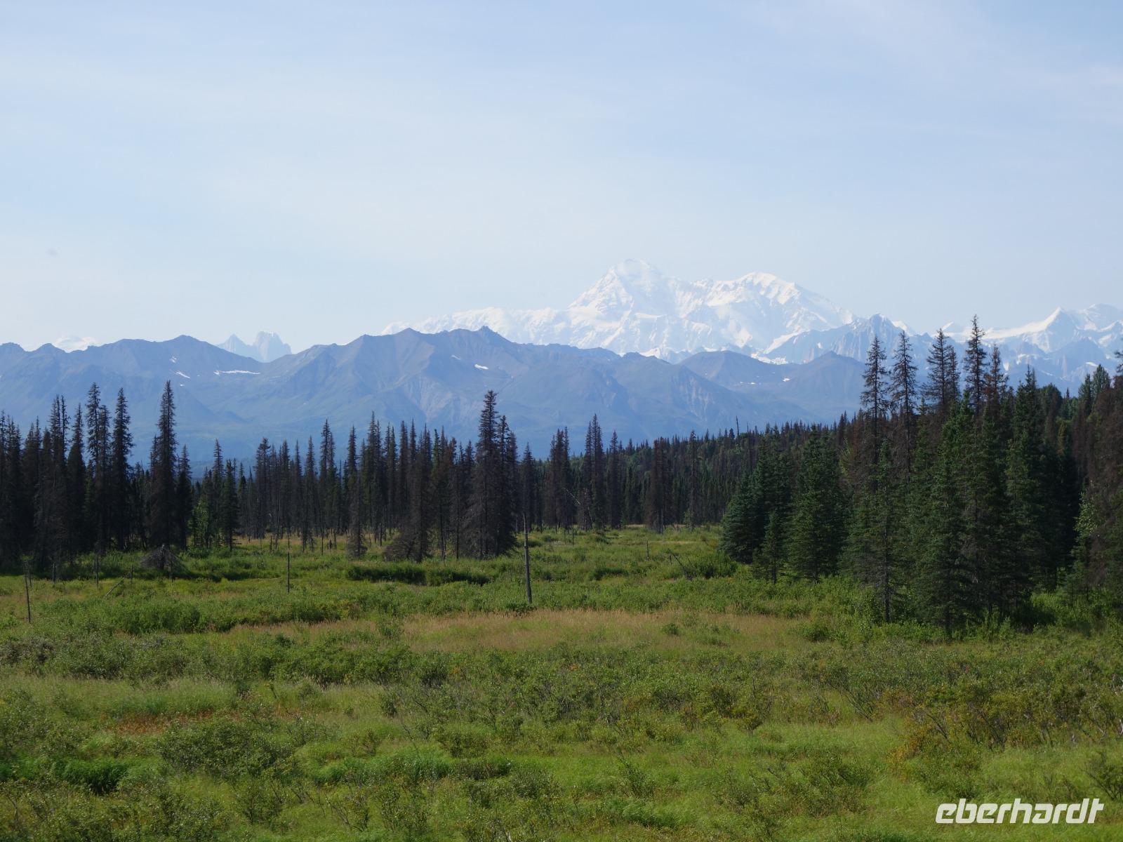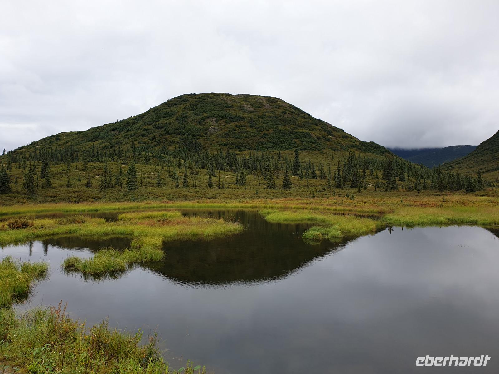 Der erste Stopp heute gilt Talkeetna - ein authentischer Ort, wie sich die meisten Leute eine Alaska-Ansiedlung vorstellen könnten. Kleinere Gebäude aus Holz und keine großen Geschäfte. Die Gemeinde liegt nördlich von Anchorage, am Flussdelta des Talkeetna und Susutna Rivers. Um die Jahrhundertwende war es ein Zentrum für Goldbergbau und auch heute noch bietet Talkeetna viel von seinem ursprünglichen Charme. Talkeetna hat sich gut auf Touristen eingestellt. Geschäfte mit allerlei Souvenirs in den Fensterläden säumen die Schotterstraße. Talkeetna ist wichtigster Ausgangspunkt für die Besteigung des Denali, den man vom Ufer aus bei guten Bedingungen sehen kann. Heute haben wir noch kein Glück, es ist sehr diesig.