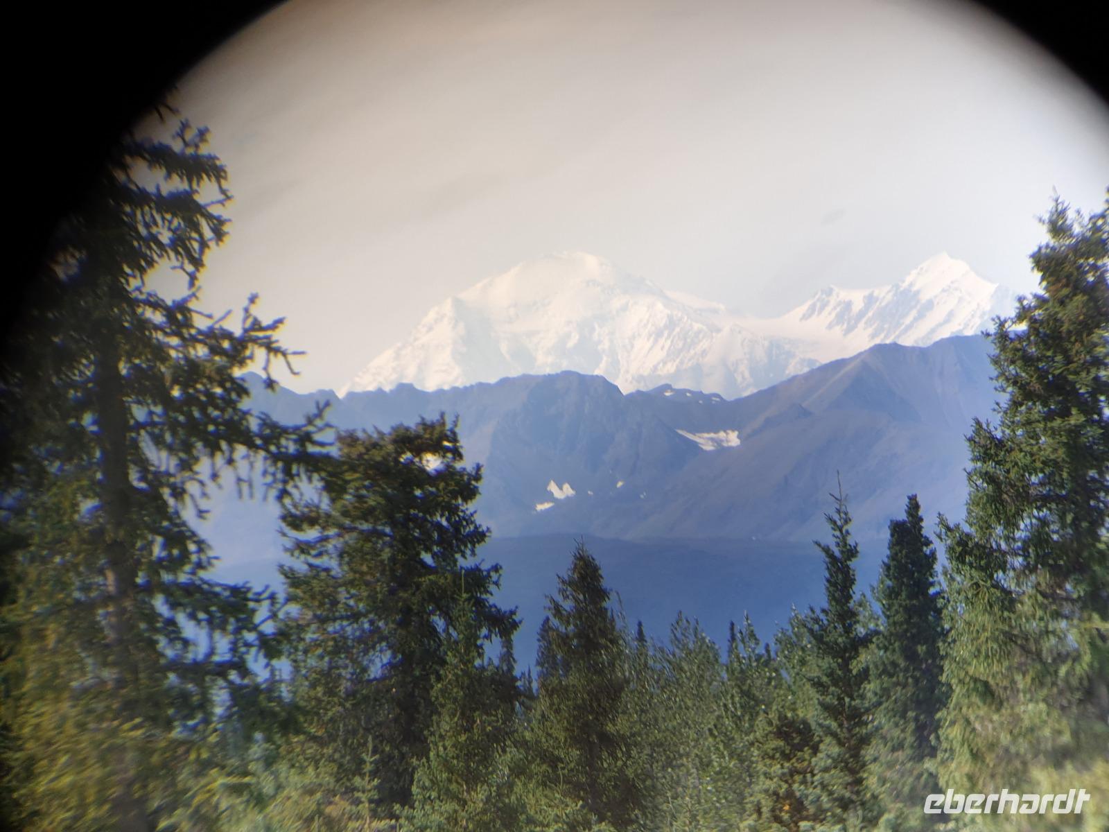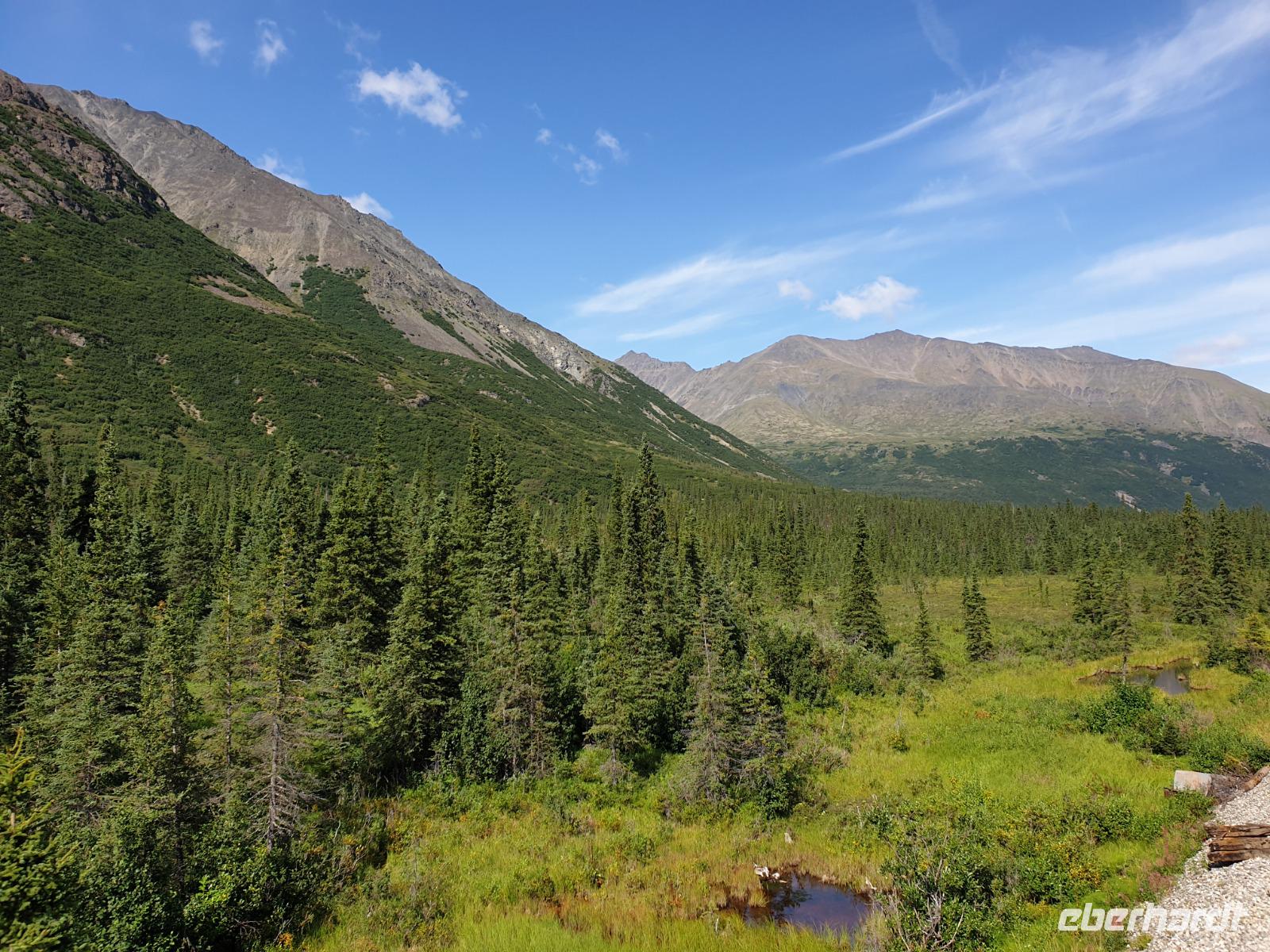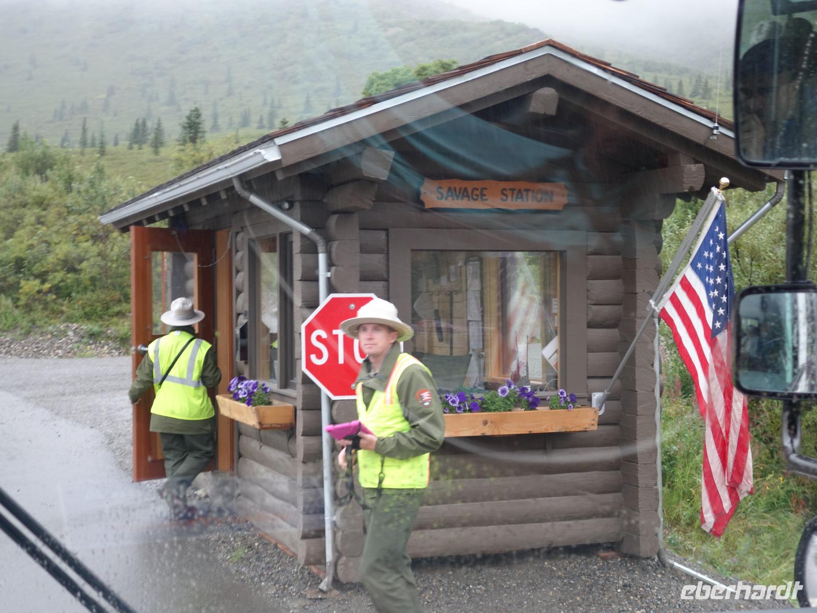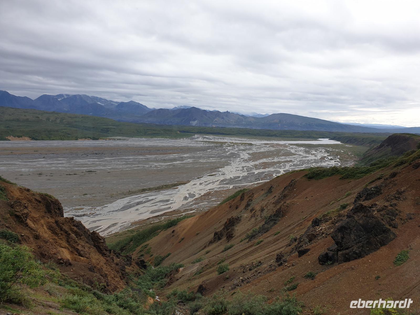 Der erste Stopp heute gilt Talkeetna - ein authentischer Ort, wie sich die meisten Leute eine Alaska-Ansiedlung vorstellen könnten. Kleinere Gebäude aus Holz und keine großen Geschäfte. Die Gemeinde liegt nördlich von Anchorage, am Flussdelta des Talkeetna und Susutna Rivers. Um die Jahrhundertwende war es ein Zentrum für Goldbergbau und auch heute noch bietet Talkeetna viel von seinem ursprünglichen Charme. Talkeetna hat sich gut auf Touristen eingestellt. Geschäfte mit allerlei Souvenirs in den Fensterläden säumen die Schotterstraße. Talkeetna ist wichtigster Ausgangspunkt für die Besteigung des Denali, den man vom Ufer aus bei guten Bedingungen sehen kann. Heute haben wir noch kein Glück, es ist sehr diesig.