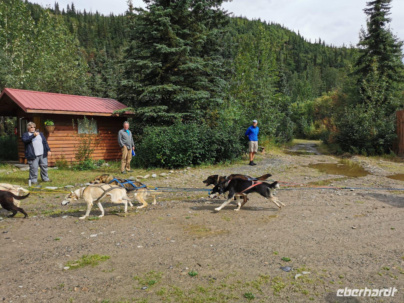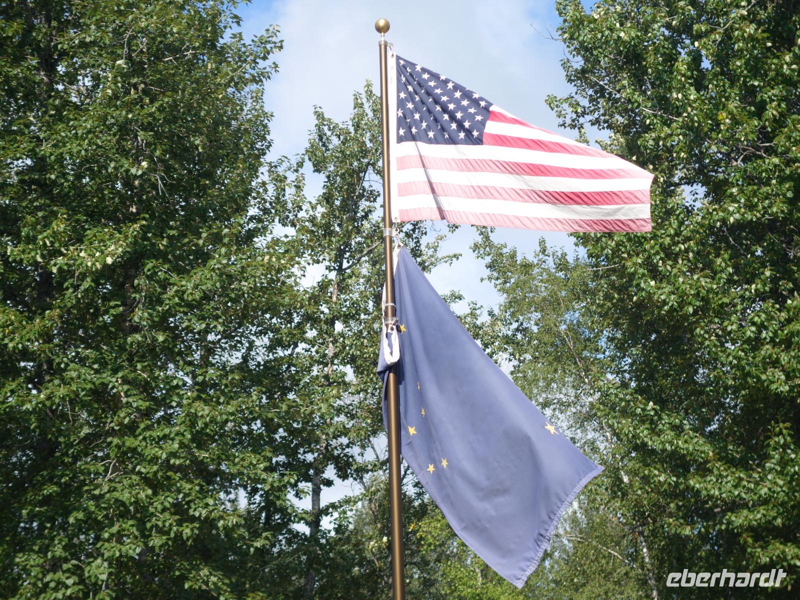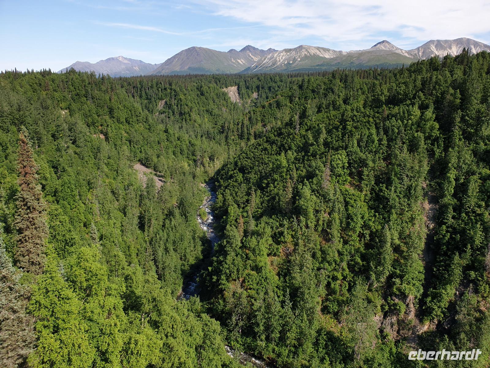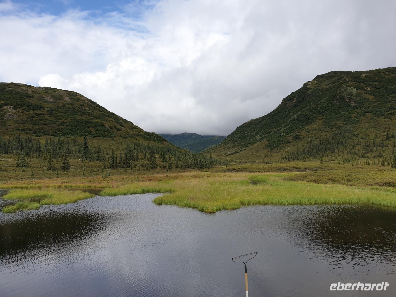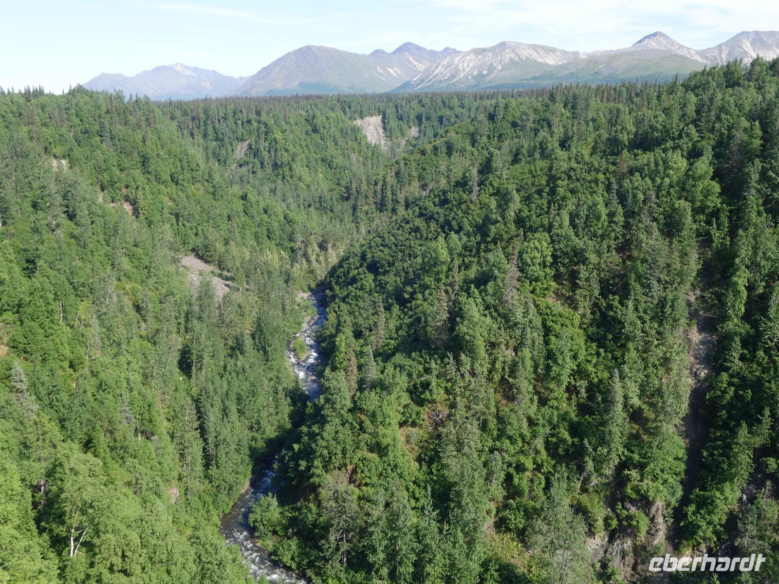 Der erste Stopp heute gilt Talkeetna - ein authentischer Ort, wie sich die meisten Leute eine Alaska-Ansiedlung vorstellen könnten. Kleinere Gebäude aus Holz und keine großen Geschäfte. Die Gemeinde liegt nördlich von Anchorage, am Flussdelta des Talkeetna und Susutna Rivers. Um die Jahrhundertwende war es ein Zentrum für Goldbergbau und auch heute noch bietet Talkeetna viel von seinem ursprünglichen Charme. Talkeetna hat sich gut auf Touristen eingestellt. Geschäfte mit allerlei Souvenirs in den Fensterläden säumen die Schotterstraße. Talkeetna ist wichtigster Ausgangspunkt für die Besteigung des Denali, den man vom Ufer aus bei guten Bedingungen sehen kann. Heute haben wir noch kein Glück, es ist sehr diesig.