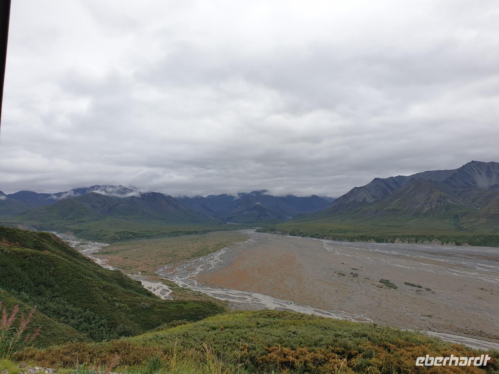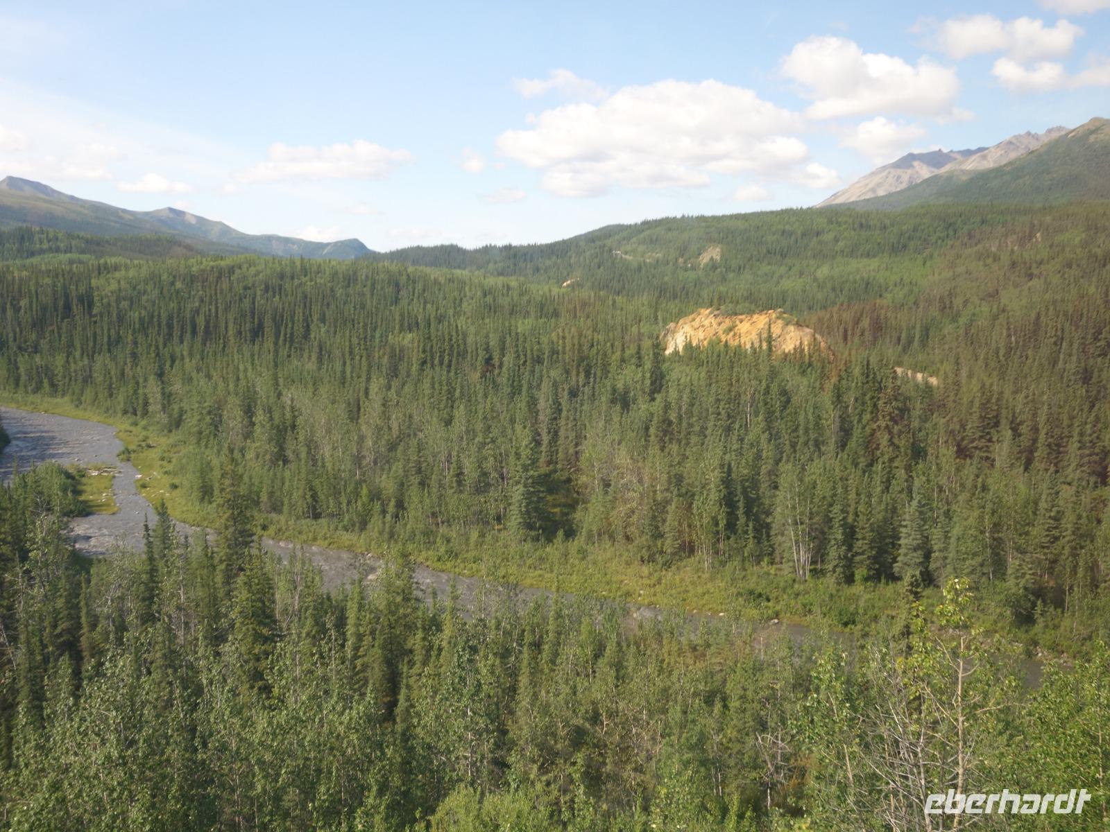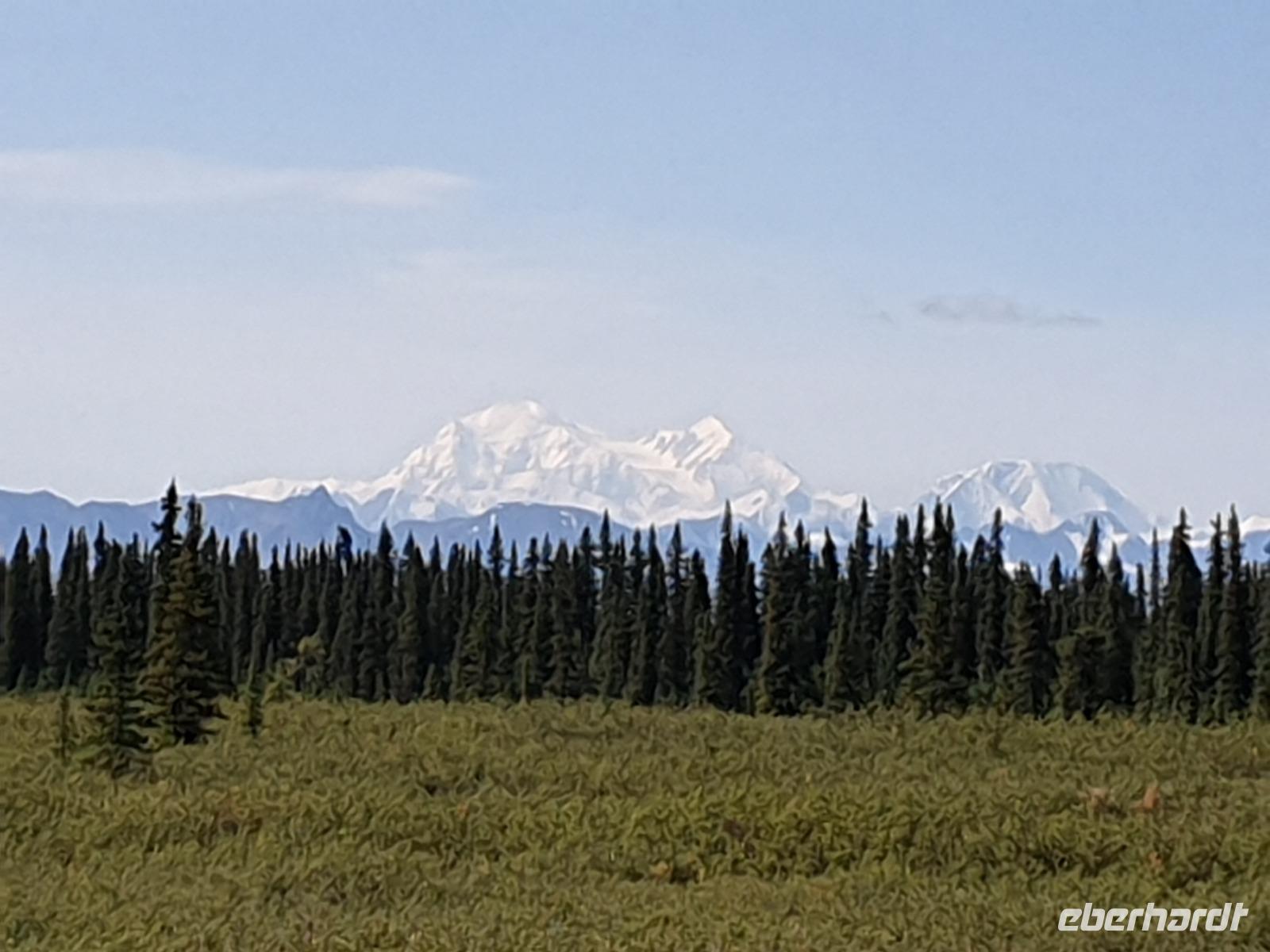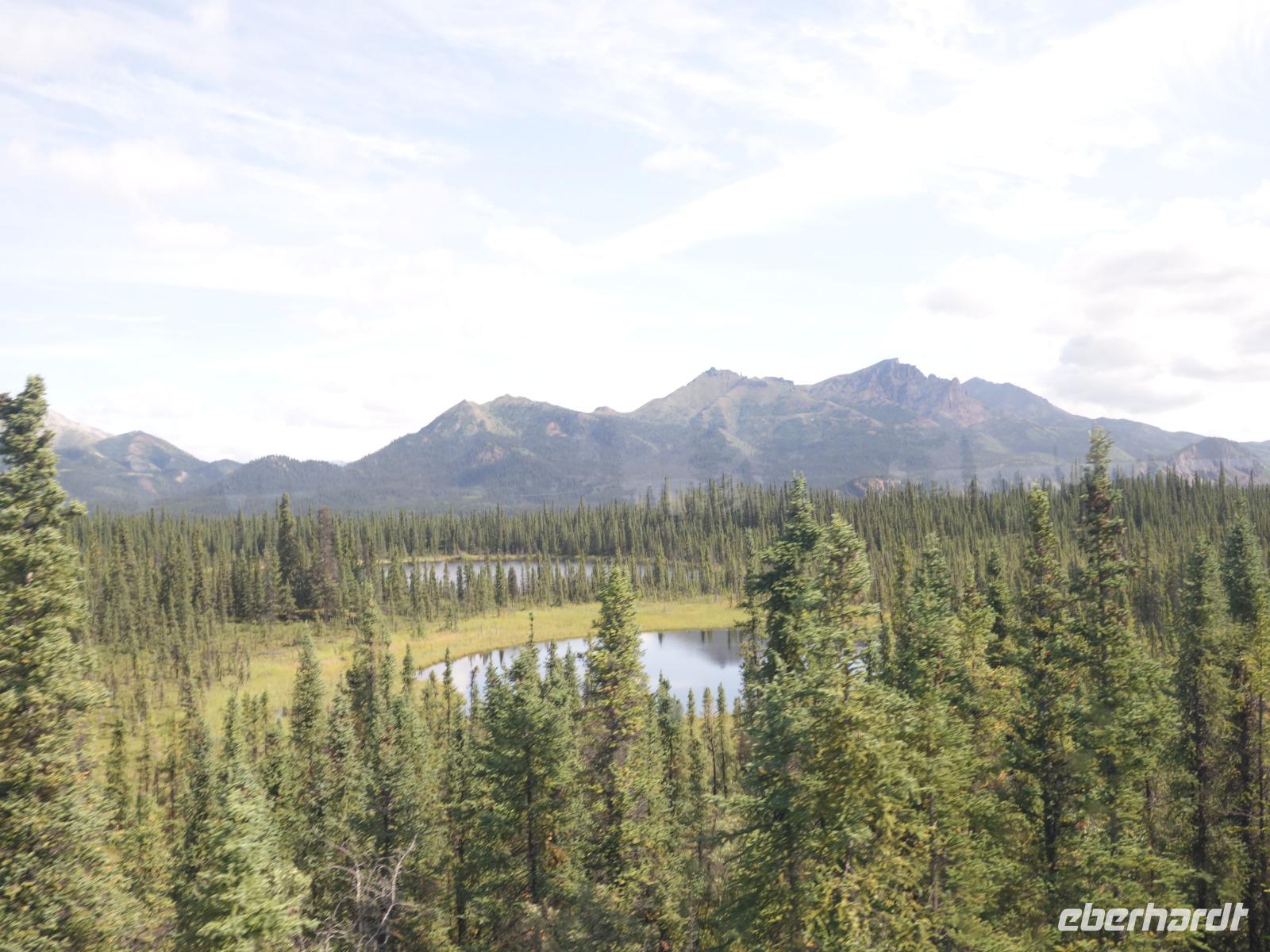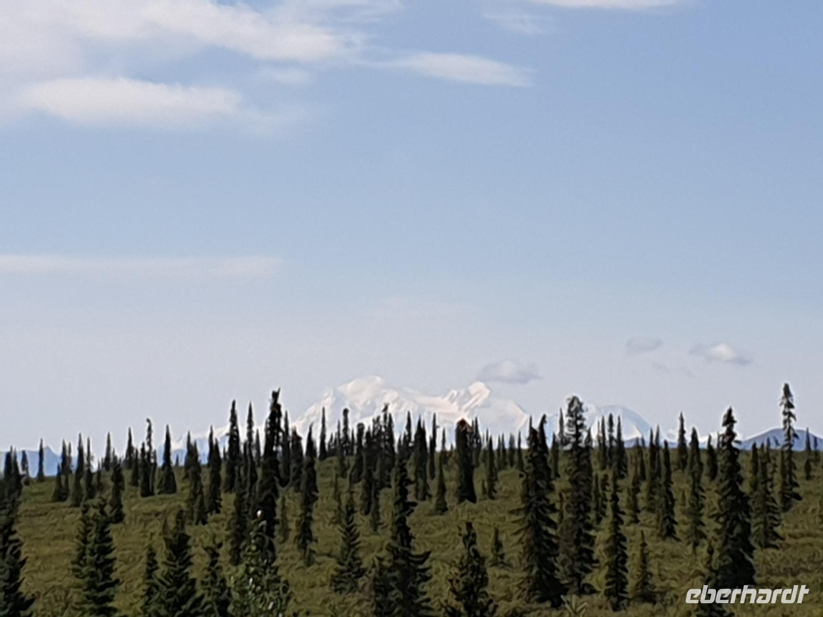 Weiter geht es Richtung Denali, wo wir morgen den Denali-Nationalpark besichtigen werden. Der eindrucksvolle Park erstreckt sich über 24.000 km² und wird dominiert vom 6.194m hohen Mount McKinley (heutig Denali), dem höchsten Berg Nordamerikas. Die Nordhälfte des Parks besteht aus herber, hügeliger Tundra, durch die in breiten Flussbetten weit verzweigte, milchweiße Gletscherströme fließen.