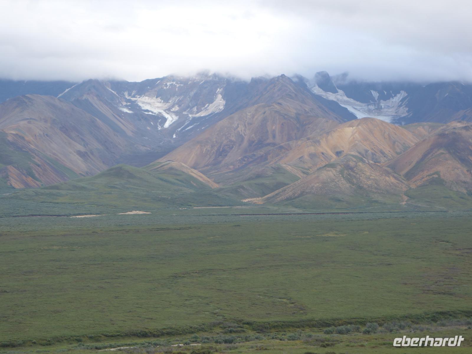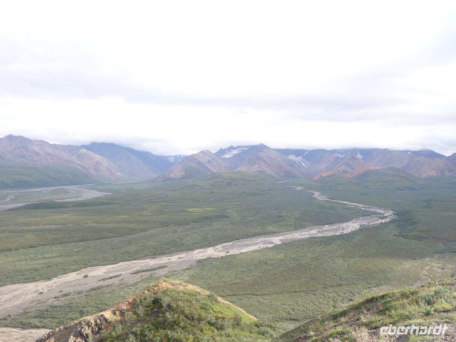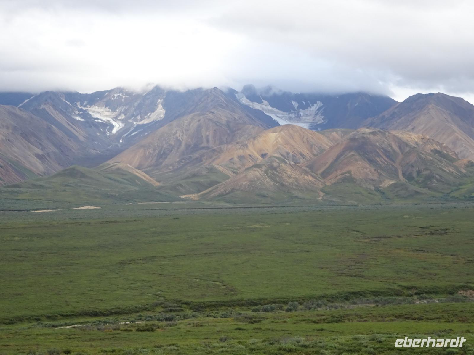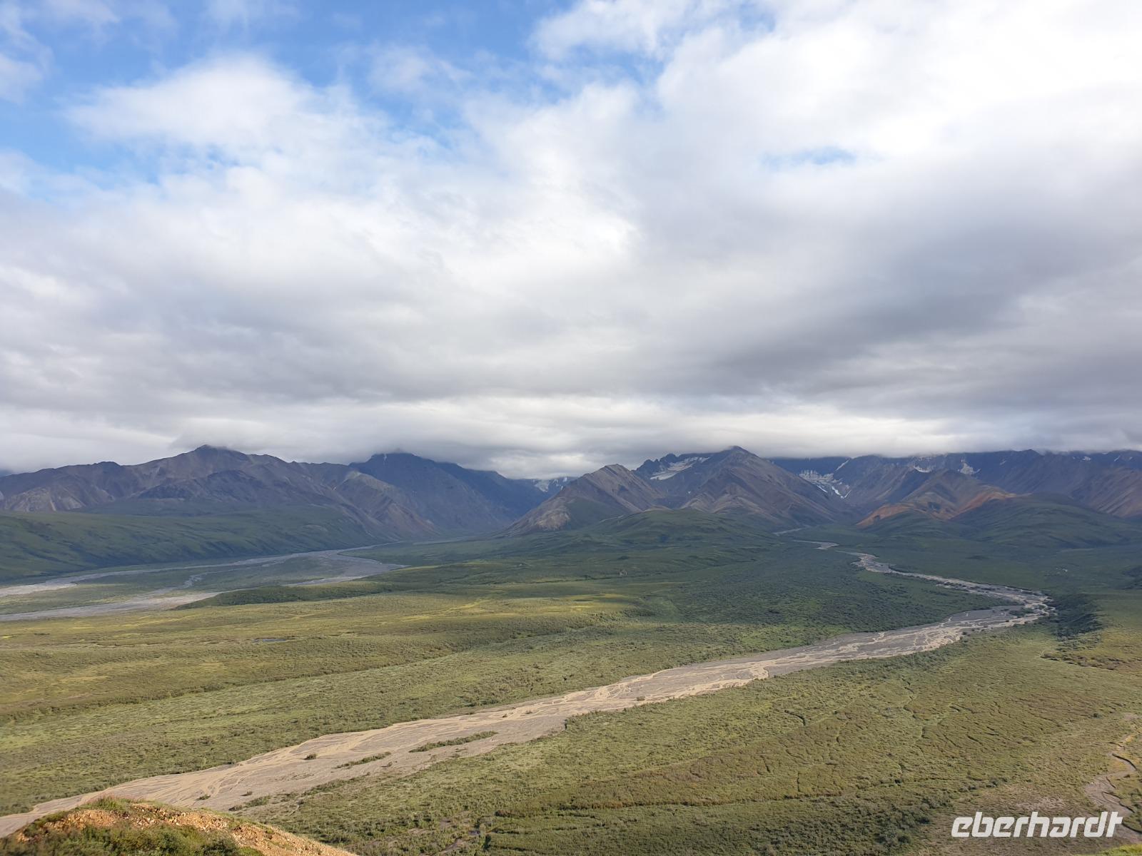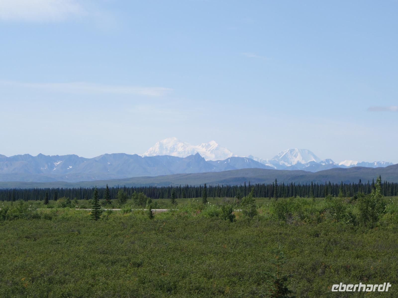 Weiter geht es Richtung Denali, wo wir morgen den Denali-Nationalpark besichtigen werden. Der eindrucksvolle Park erstreckt sich über 24.000 km² und wird dominiert vom 6.194m hohen Mount McKinley (heutig Denali), dem höchsten Berg Nordamerikas. Die Nordhälfte des Parks besteht aus herber, hügeliger Tundra, durch die in breiten Flussbetten weit verzweigte, milchweiße Gletscherströme fließen.