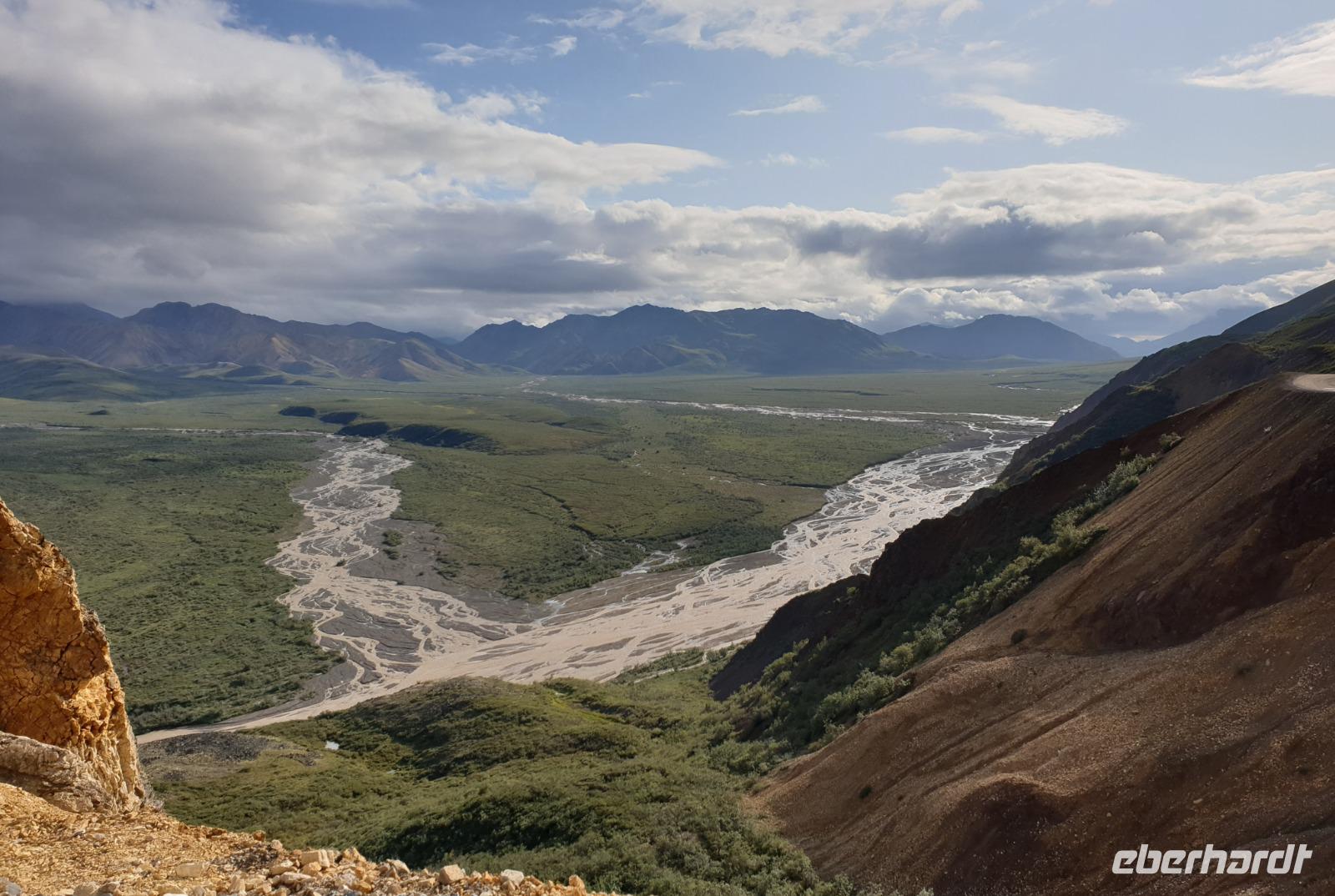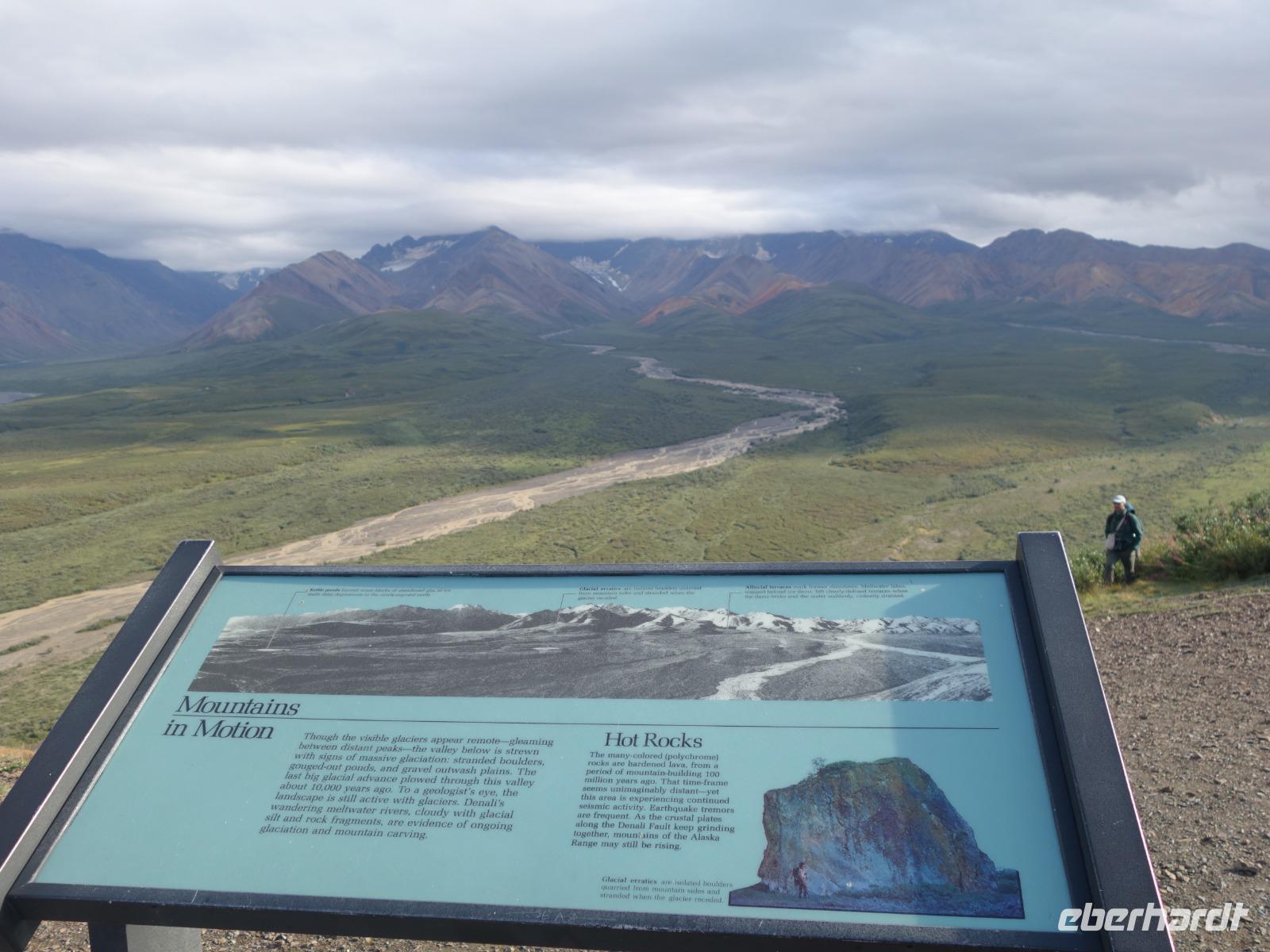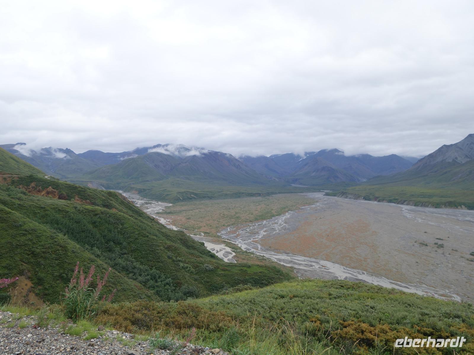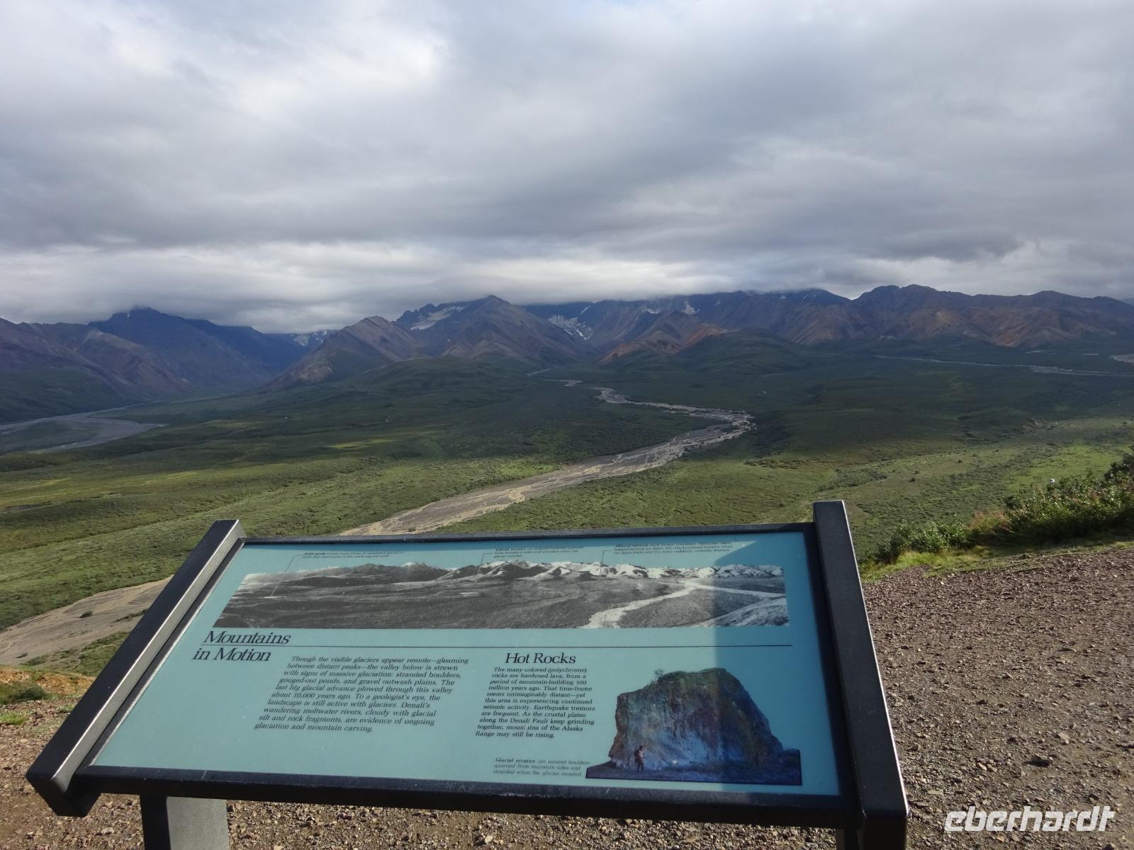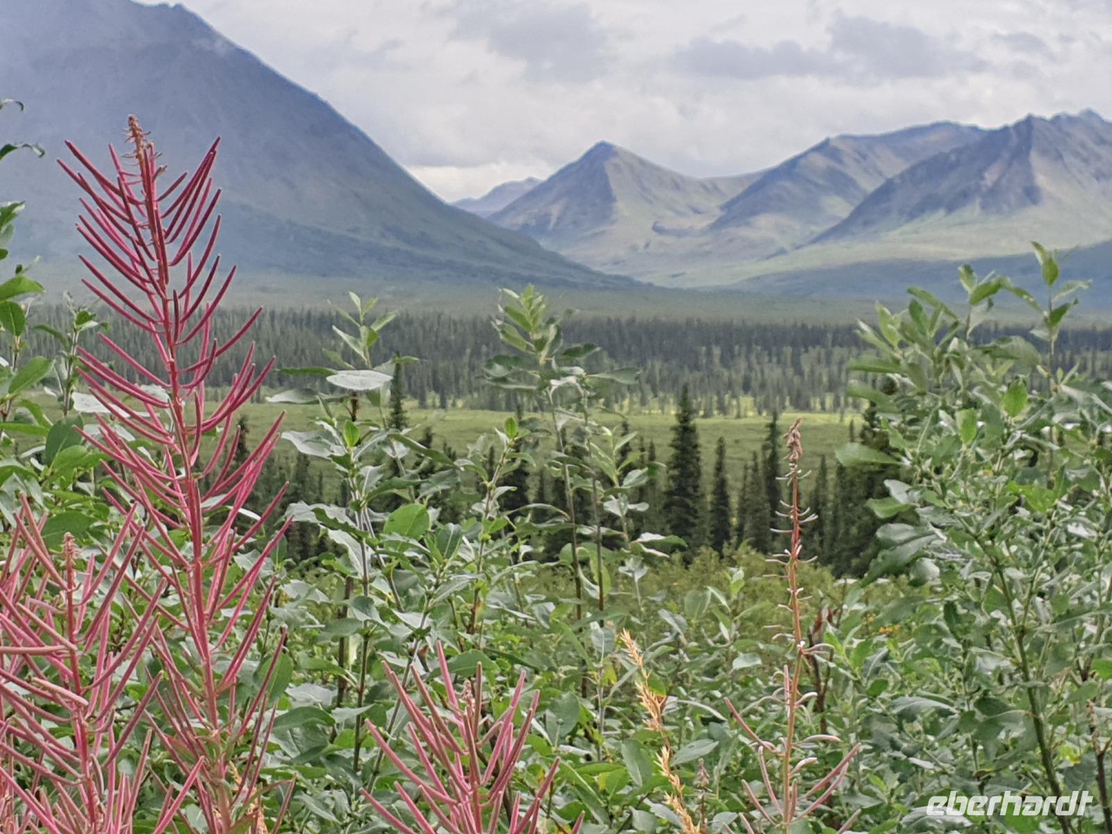 Weiter geht es Richtung Denali, wo wir morgen den Denali-Nationalpark besichtigen werden. Der eindrucksvolle Park erstreckt sich über 24.000 km² und wird dominiert vom 6.194m hohen Mount McKinley (heutig Denali), dem höchsten Berg Nordamerikas. Die Nordhälfte des Parks besteht aus herber, hügeliger Tundra, durch die in breiten Flussbetten weit verzweigte, milchweiße Gletscherströme fließen.