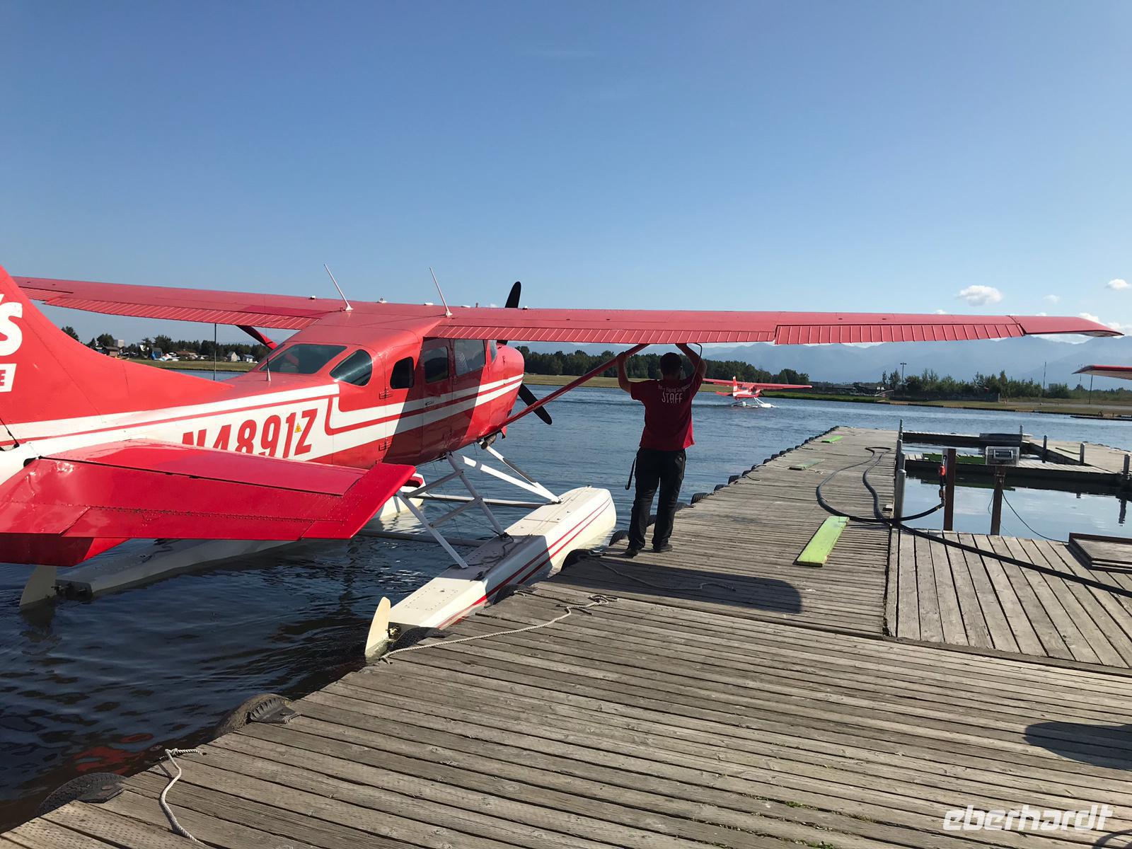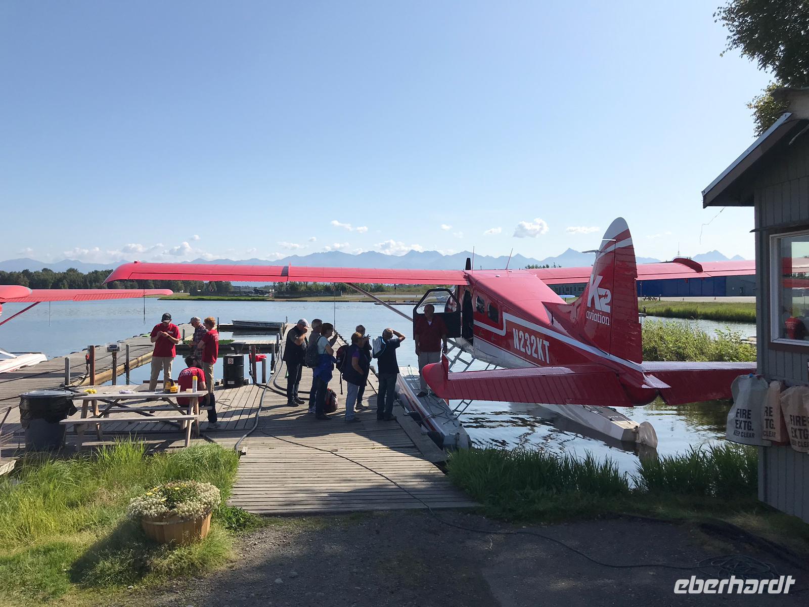 Der optionale Ausflug ist von Anchorage aus zu fliegen und die Welt Alaskas von oben zu beobachten. Ein paar Gäste von unserer Gruppe buchen den Ausflug und fliegen eine Stunde mit dem Wasserflugzeug entlang einer landschaftlich reizvollen Route über Cook Inlet zu den Ausläufern der Aleutian-Bergkette und dem See Clark Wilderness Preserve. Nach der Ankunft in der Redoubt Bay Lodge führt ein erfahrener Naturführer in die umliegende Wildnis und fährt mit den Gästen zu einer geführten Bärenbeobachtungstour mit einem Pontonboot nach Wolverine Creek Cove. Vom Wasser aus kann man die Bären Alaskas in ihrem natürlichen Lebensraum beobachten.