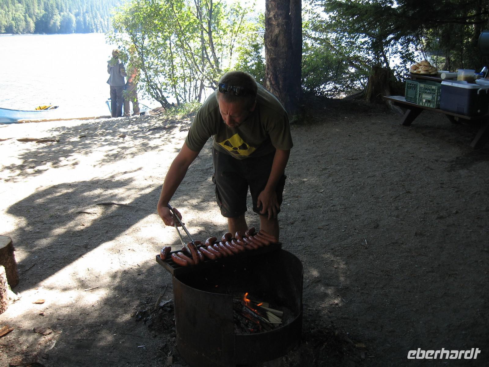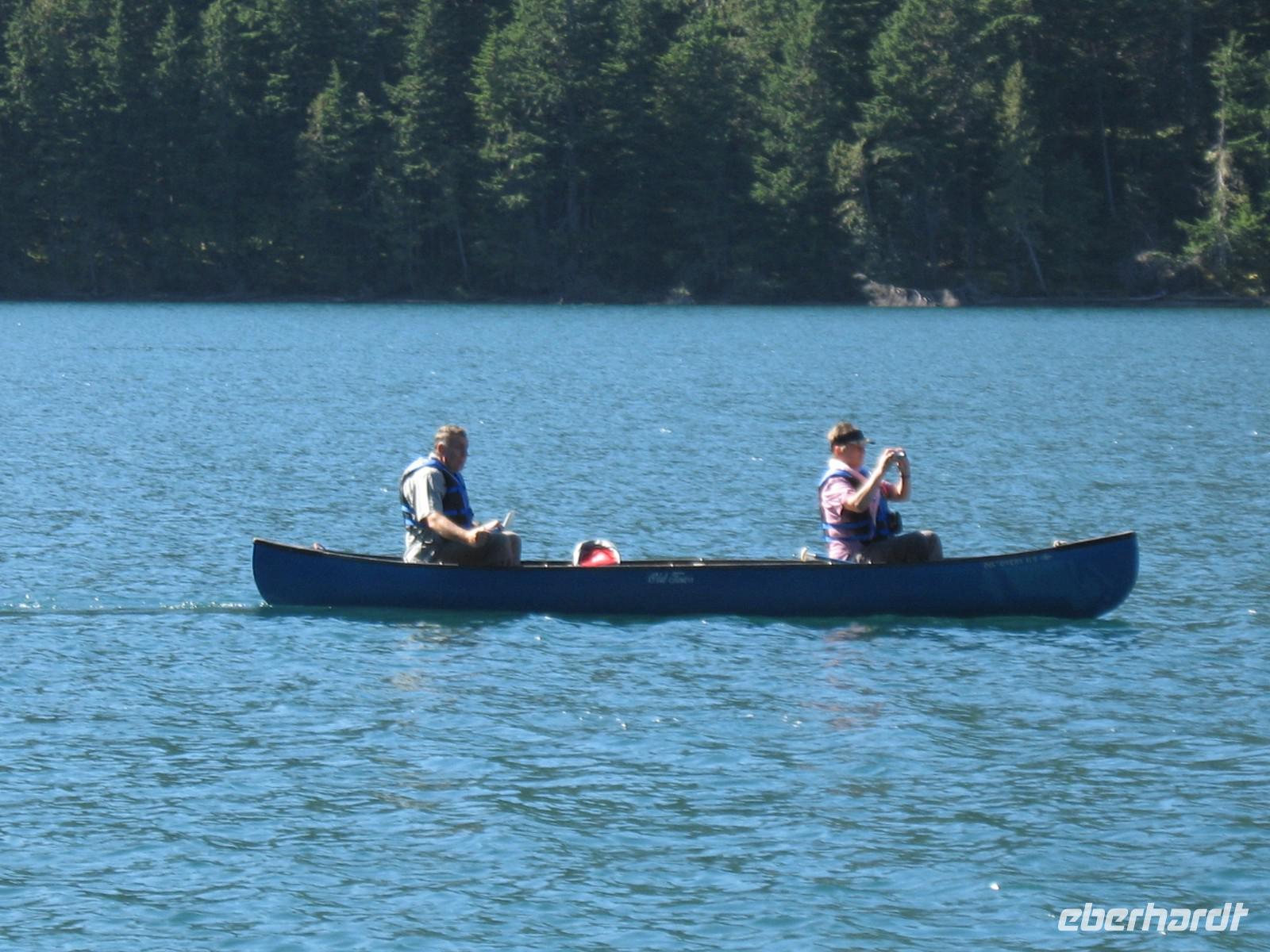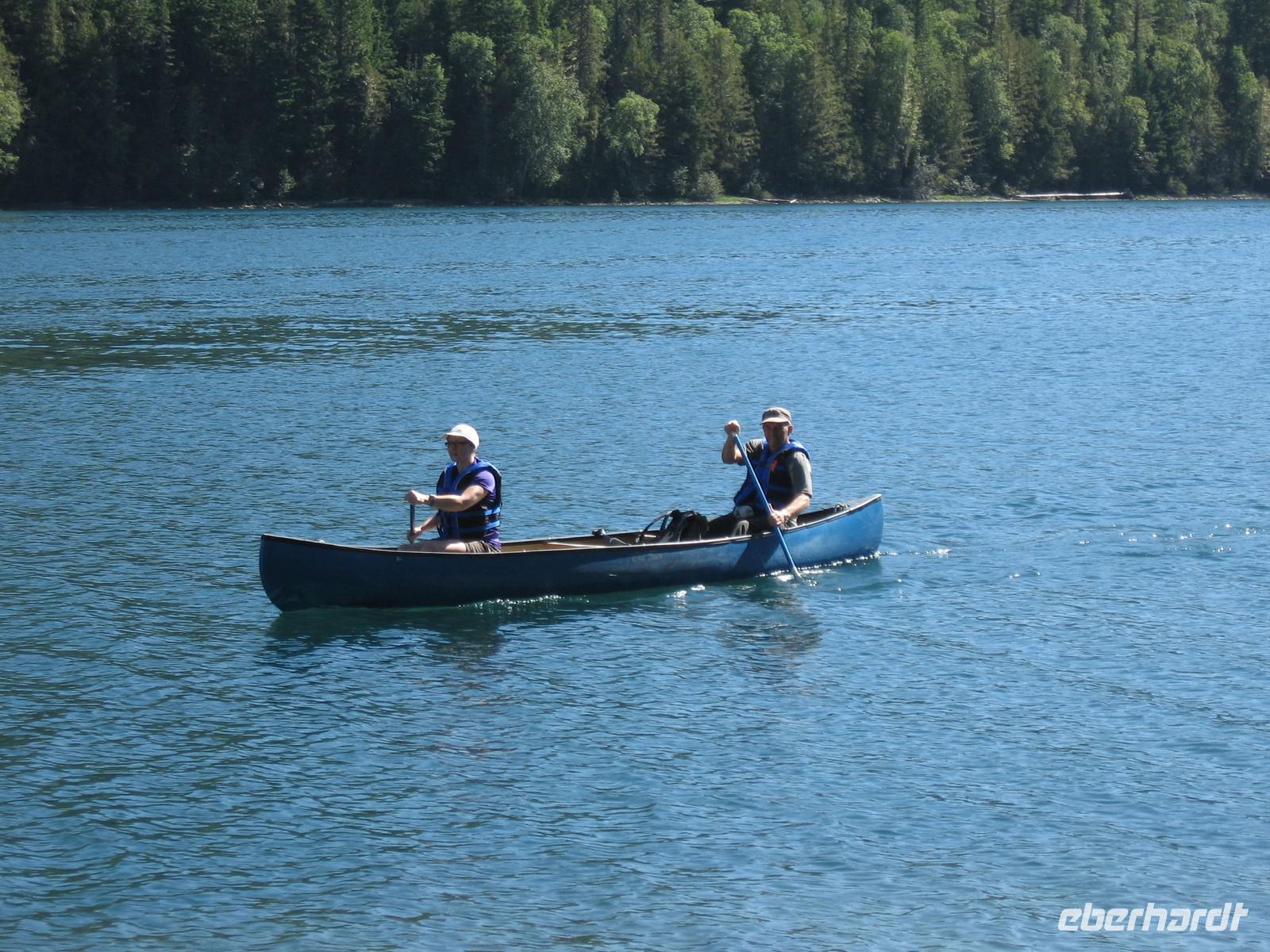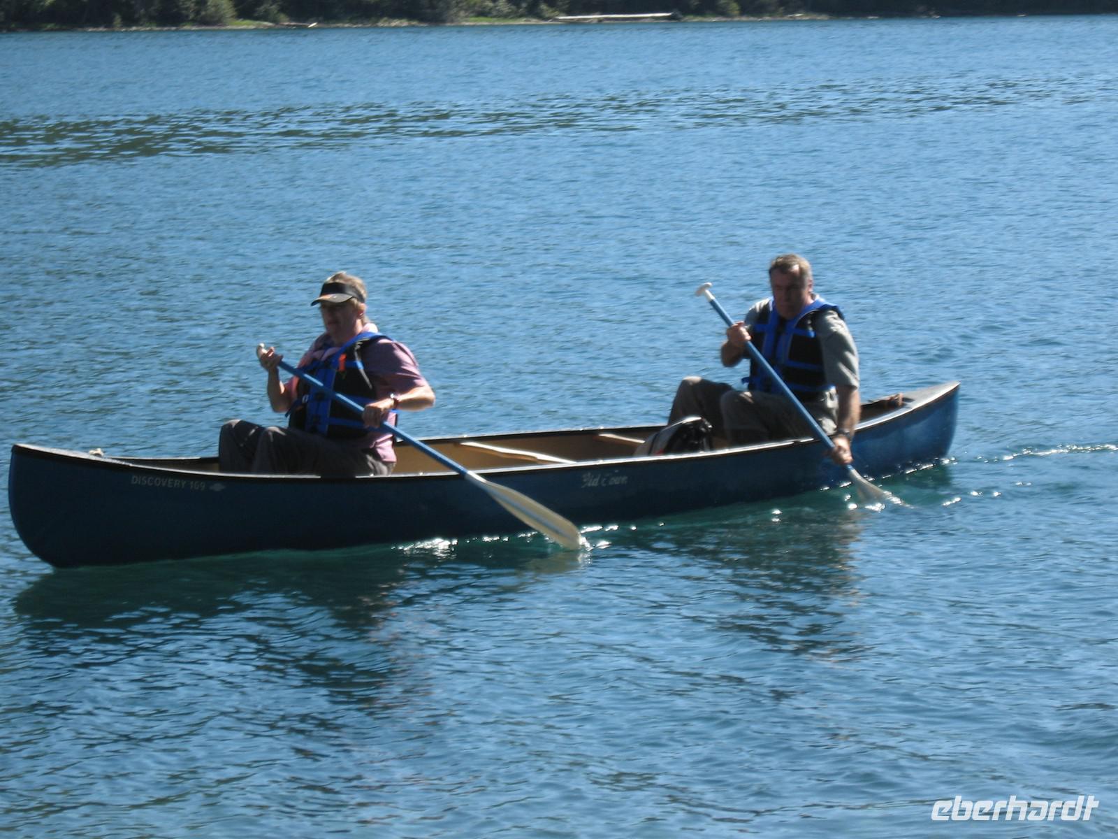 Wieder begrüßt uns die Sonne und nach einem tollen Frühstück im unserem Hotel, der Clearwater Lodge, fahren wir erstmal zur Wells Gray Guest Ranch. der Besitzer, Mike, eigentlich Österreicher, sorgt heute dafür das es uns an nichts fehlt. Auf dem Weg zum Clearwater Lake gibt es noch einen Fotostopp auf dem Green Mountain und an den Dawson Falls. Bei erreichen des See wechseln wir das Verkehrsmittel. Immer zwei Personen in einem Kanu paddeln wir über den See. Das geht besser als erwartet auch wenn manchmal die Richtung nicht ganz stimmt. Am anderen Ufer erwartet uns dann ein Picknick in Wild West Art. Auf dem Holzgrill werden Würstchen zubereitet, wer mal Holz hacken will kann das hier gut tun. Zum Schluss wird daraus eine Art Burger, ich nenne ihn mal kurzerhand „Clearwater Lake Hot Dog Burger". Wir lassen es uns so richtig gut gehen und genießen die Landschaft, die Ruhe und den Service. Leider müssen wir irgendwann wieder zurück, das paddeln fällt uns jetzt schon wesentlich leichter. Nach dem aufräumen der Boote geht es zurück Richtung Ranch. Beim Fotostopp an den Bailey's Pots können wir Lachse springen sehen. Die Fische sind auf dem Weg in ihre Laichgebiete und Barry erklärt uns den Lebenszyklus der Lachse. Der Helmcken Fall, ein weiterer Stopp, stürzt sich rund 145 m in die Tiefe, beeindruckend. Auf der Wells Gray Ranch bei Mike kann man auch einen Ausritt machen, was einige von unserer Gruppe fakultativ machen. Die nicht reitenden machen sich noch auf eine kleine Wanderung in Richtung des Mous Fall. Ein Erlebnisreicher Tag lässt uns zufrieden nach dem Abendessen in unsere Betten fallen.