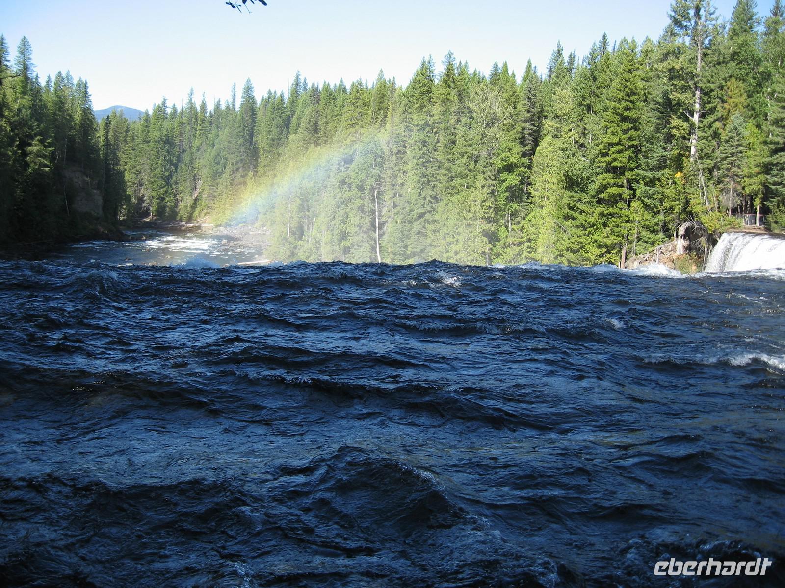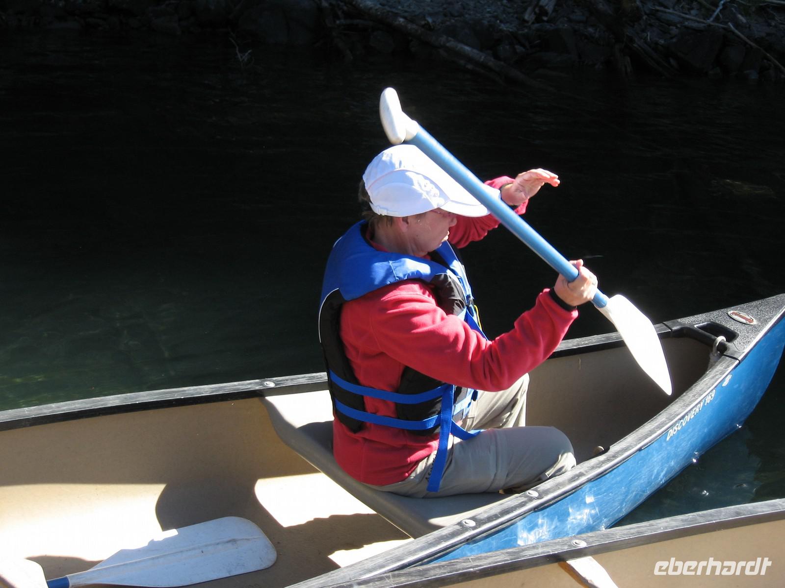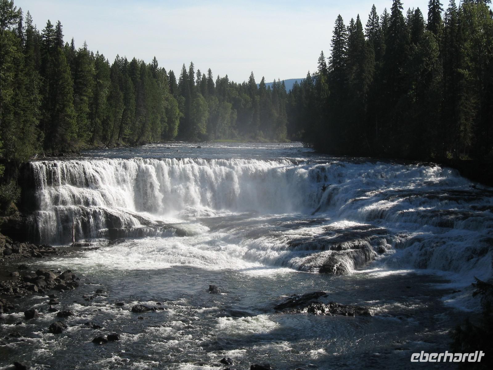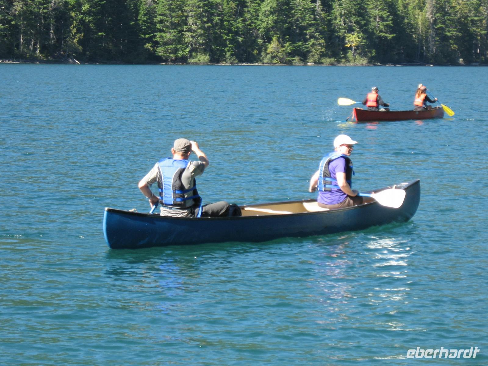 Wieder begrüßt uns die Sonne und nach einem tollen Frühstück im unserem Hotel, der Clearwater Lodge, fahren wir erstmal zur Wells Gray Guest Ranch. der Besitzer, Mike, eigentlich Österreicher, sorgt heute dafür das es uns an nichts fehlt. Auf dem Weg zum Clearwater Lake gibt es noch einen Fotostopp auf dem Green Mountain und an den Dawson Falls. Bei erreichen des See wechseln wir das Verkehrsmittel. Immer zwei Personen in einem Kanu paddeln wir über den See. Das geht besser als erwartet auch wenn manchmal die Richtung nicht ganz stimmt. Am anderen Ufer erwartet uns dann ein Picknick in Wild West Art. Auf dem Holzgrill werden Würstchen zubereitet, wer mal Holz hacken will kann das hier gut tun. Zum Schluss wird daraus eine Art Burger, ich nenne ihn mal kurzerhand „Clearwater Lake Hot Dog Burger". Wir lassen es uns so richtig gut gehen und genießen die Landschaft, die Ruhe und den Service. Leider müssen wir irgendwann wieder zurück, das paddeln fällt uns jetzt schon wesentlich leichter. Nach dem aufräumen der Boote geht es zurück Richtung Ranch. Beim Fotostopp an den Bailey's Pots können wir Lachse springen sehen. Die Fische sind auf dem Weg in ihre Laichgebiete und Barry erklärt uns den Lebenszyklus der Lachse. Der Helmcken Fall, ein weiterer Stopp, stürzt sich rund 145 m in die Tiefe, beeindruckend. Auf der Wells Gray Ranch bei Mike kann man auch einen Ausritt machen, was einige von unserer Gruppe fakultativ machen. Die nicht reitenden machen sich noch auf eine kleine Wanderung in Richtung des Mous Fall. Ein Erlebnisreicher Tag lässt uns zufrieden nach dem Abendessen in unsere Betten fallen.
