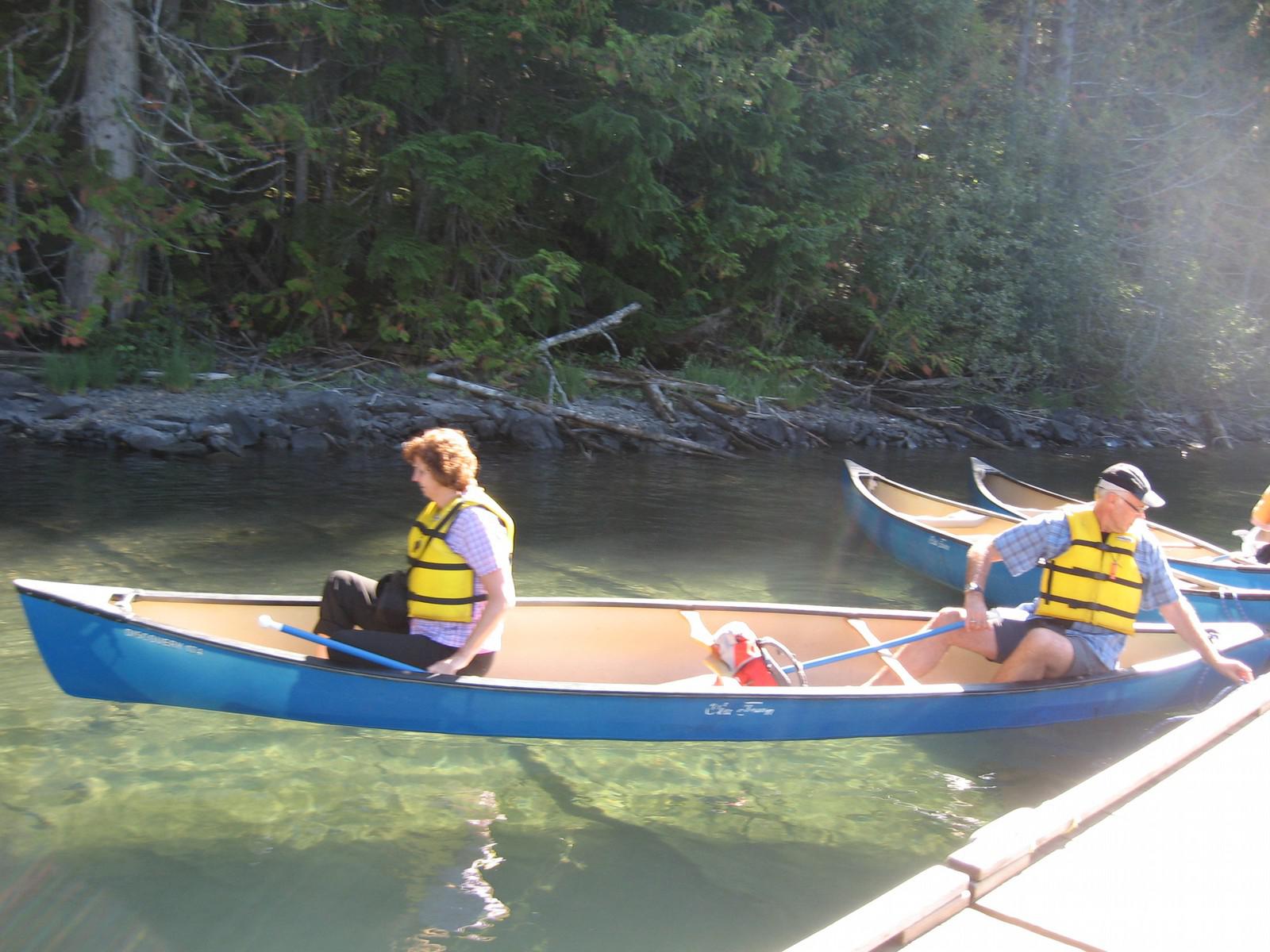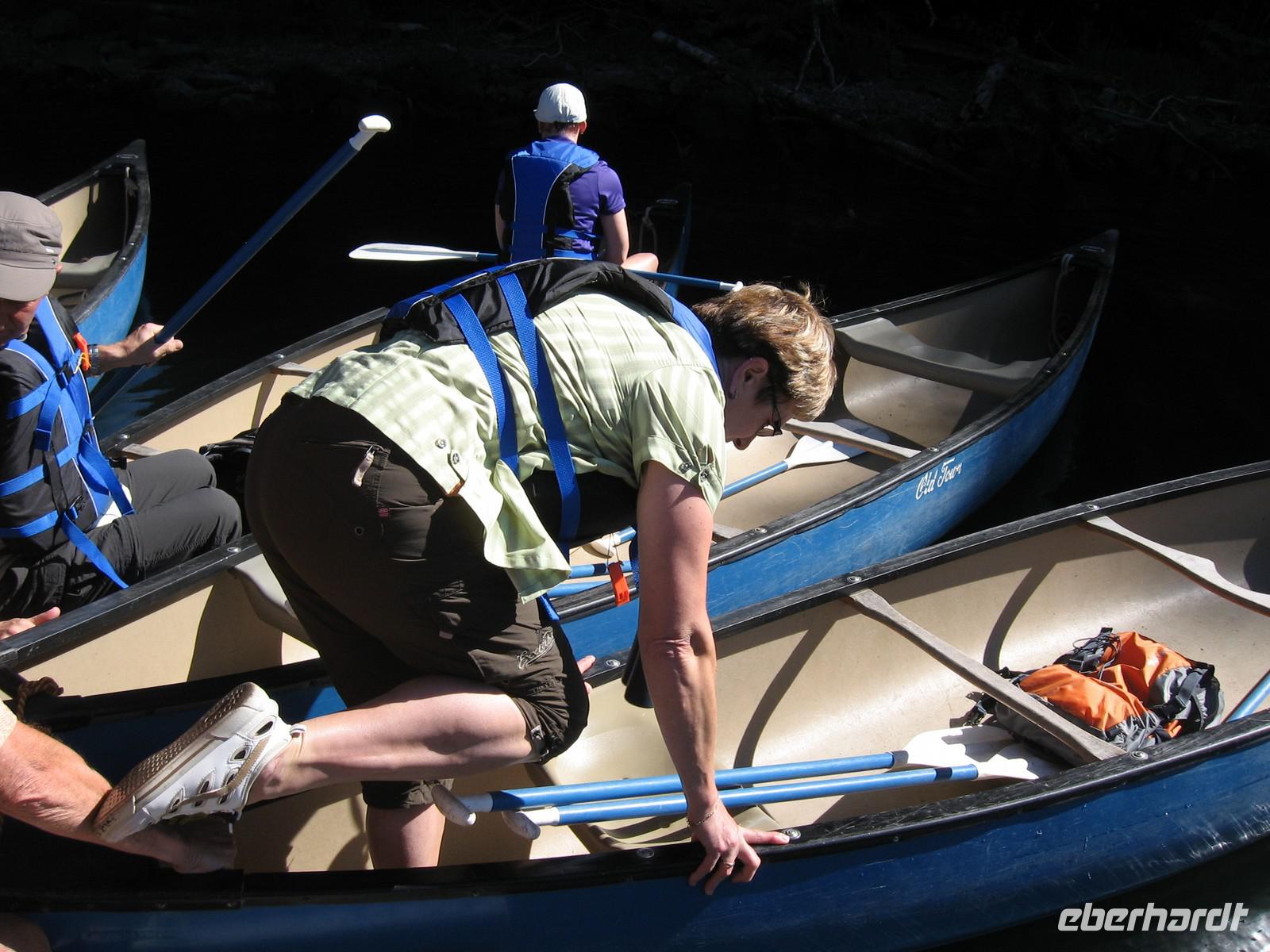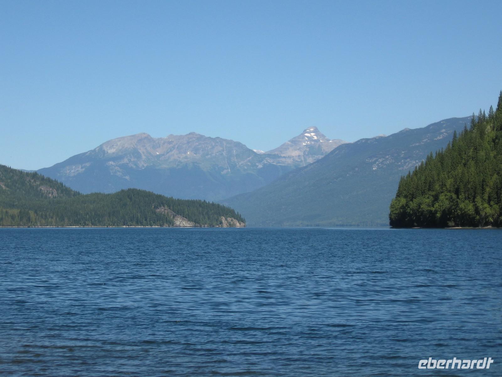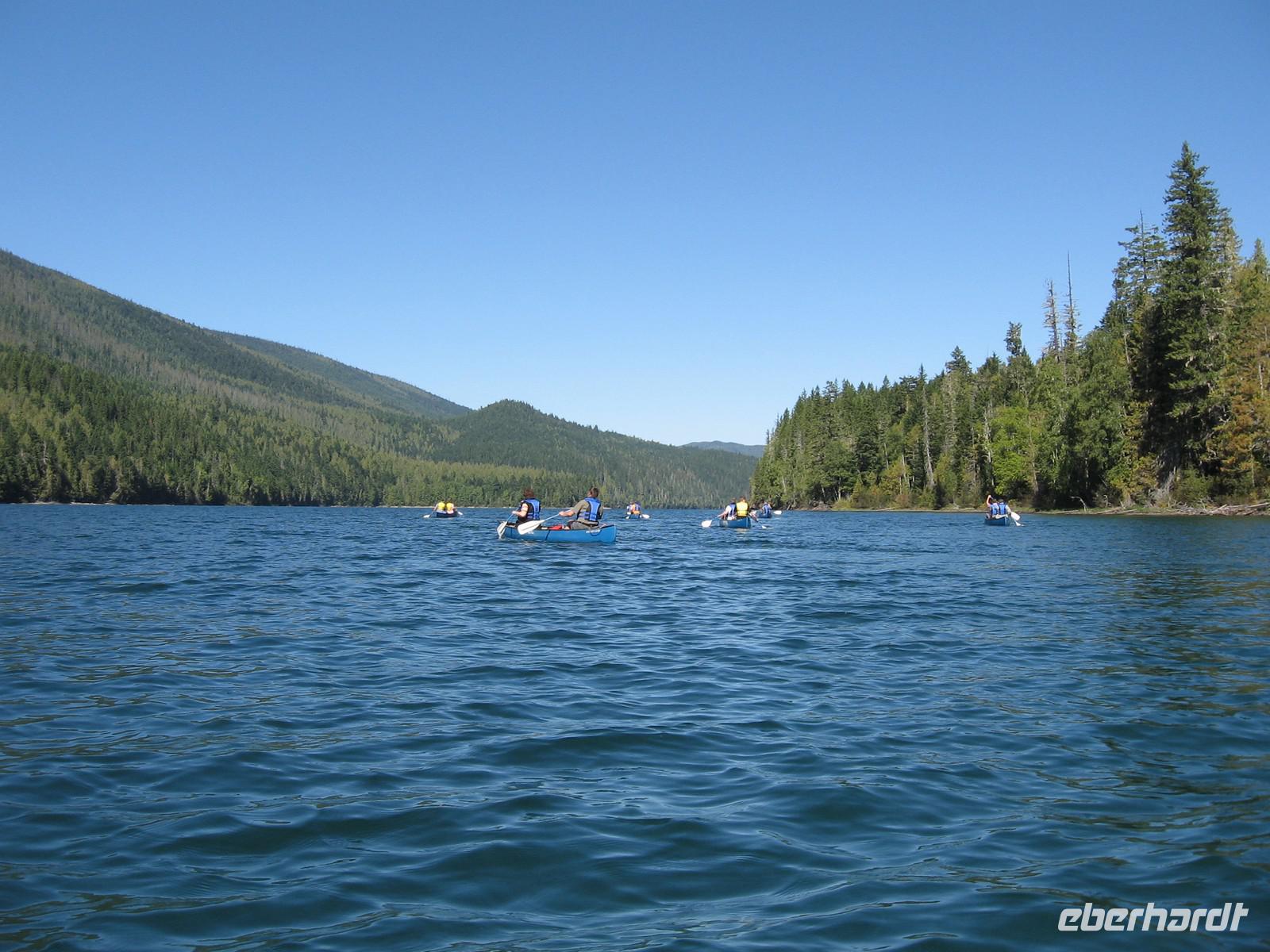 Wieder begrüßt uns die Sonne und nach einem tollen Frühstück im unserem Hotel, der Clearwater Lodge, fahren wir erstmal zur Wells Gray Guest Ranch. der Besitzer, Mike, eigentlich Österreicher, sorgt heute dafür das es uns an nichts fehlt. Auf dem Weg zum Clearwater Lake gibt es noch einen Fotostopp auf dem Green Mountain und an den Dawson Falls. Bei erreichen des See wechseln wir das Verkehrsmittel. Immer zwei Personen in einem Kanu paddeln wir über den See. Das geht besser als erwartet auch wenn manchmal die Richtung nicht ganz stimmt. Am anderen Ufer erwartet uns dann ein Picknick in Wild West Art. Auf dem Holzgrill werden Würstchen zubereitet, wer mal Holz hacken will kann das hier gut tun. Zum Schluss wird daraus eine Art Burger, ich nenne ihn mal kurzerhand „Clearwater Lake Hot Dog Burger". Wir lassen es uns so richtig gut gehen und genießen die Landschaft, die Ruhe und den Service. Leider müssen wir irgendwann wieder zurück, das paddeln fällt uns jetzt schon wesentlich leichter. Nach dem aufräumen der Boote geht es zurück Richtung Ranch. Beim Fotostopp an den Bailey's Pots können wir Lachse springen sehen. Die Fische sind auf dem Weg in ihre Laichgebiete und Barry erklärt uns den Lebenszyklus der Lachse. Der Helmcken Fall, ein weiterer Stopp, stürzt sich rund 145 m in die Tiefe, beeindruckend. Auf der Wells Gray Ranch bei Mike kann man auch einen Ausritt machen, was einige von unserer Gruppe fakultativ machen. Die nicht reitenden machen sich noch auf eine kleine Wanderung in Richtung des Mous Fall. Ein Erlebnisreicher Tag lässt uns zufrieden nach dem Abendessen in unsere Betten fallen.