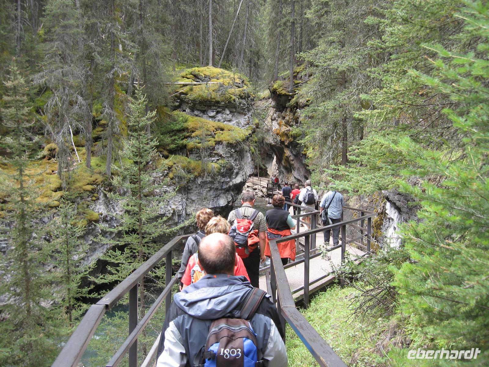 Der heutige Morgen zeigte sich nicht ganz so kühl. Nach einer kurzen Fahrt erreichen wir den Ausgangspunkt für unsere Wanderung. Wir sind nicht allein, werden aber bald feststellen, das die meisten der Besucher nur bis zum Lower Fall, dem unteren Wasserfall laufen. Der Johnston River hat hier im Tal über Millionen Jahre ganze Arbeit geleistet und sich durch das Gestein gefressen. Natürlich geht es auch heute wieder bergan, über den Lower Fall zum Upper Falll und dann weiter zu den Ink Pots. Diese kleinen Quellen heißen wegen ihrer leicht blauen Färbung so, welche durch Mineralien entsteht. An den Ink Pots machen wir unser Picknick bevor wir über den gleichen Weg wieder absteigen. Unterwegs erfreuten uns immer wieder Eichhörnchen, manchmal sogar in Fotopose. Zurück in Banff geht es heute zur Erholung in die heißen Quellen und es ist wesentlich leerer heute. Das lange Wochenende ist vorbei und die Kanadier sind auf dem Weg nach Hause. Morgen geht die Schule hier wieder los und das nach elf Wochen Ferien, natürlich nur für die Schüler. Am Nachmittag besuchen wir noch das „Buffalo Nation Museum". Es erzählt vom Leben der Ureinwohner Kanadas, wir nennen Sie ja Indianer. Hier in Kanada sagt man heute „First Nation" um die Bedeutung dieser Menschen klar zustellen. Das Museum wird von den Schwarzfußindianern geführt, diese waren hauptsächlich Nomaden. Ganz anders an der Westküste des Landes, die dortigen Indianer waren sesshaft und lebten vom Fischfang. Der Rest des Nachmittags stand allen zur freien Verfügung in Banff.