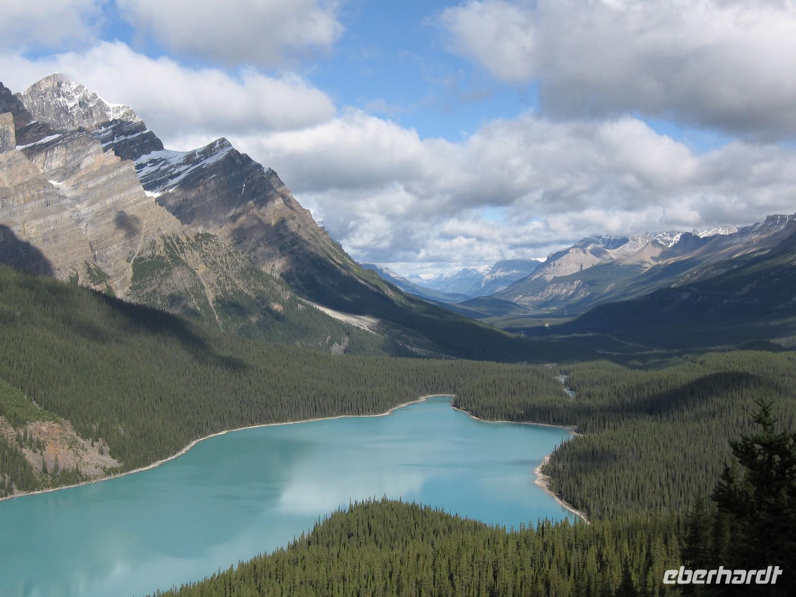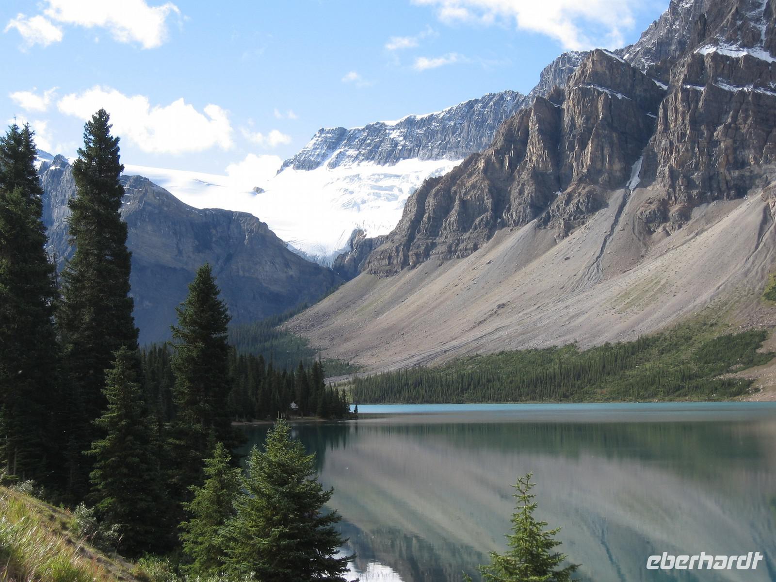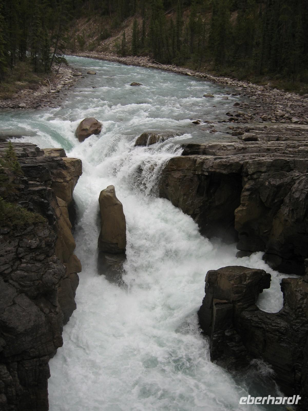 Am Morgen grüßt uns die Sonne und wird uns auch den ganzen Tag über begleiten. Heute heißt es zum ersten mal Koffer packen, wir verlassen Banff und den Banff Nationalpark. Wir fahren heute auf dem Icefield Parkway hinein in den Jasper Nationalpark. Zahlreiche Fotostopps mit traumhaften Ausblicken ziehen und in ihren Bann, so am Bow Lake, Peyto Lake und Sunwapta Pass. Unsere Mittagspause am Alexandra River verbringen wir nicht nur mit essen sondern auch mit der Beobachtung von Mountain Goats, das sind Bergziegen. Natürlich darf auch heute eine Wanderung nicht fehlen. Eine nur ganz kleine mit einem gemäßigten Aufstieg. Auf dem Parker Ride Trail geht es dann doch ganz schön nach oben und das Sandwich von eben muss auch noch mit verdaut werden. Nach rund 150 Höhenmetern werden wir dafür mit einer grandiosen Aussicht über den Saskatchewan Gletscher belohnt, welcher ein Teil des Columbia Icefield belohnt. Über diesen Link http://de.wikipedia.org/wiki/Saskatchewan-Gletscher kann man sich einen guten Überblick über den Rückgang des Eises innerhalb von 20 Jahren machen. Das Columbia Icefield ist das größte zusammenhängende Eisgebiet südlich des Polarkreisen und teilweise so dick das der Pariser Eiffelturm darin verschwinden würde. Wenig später erreichen wir den Athabasca-Gletscher. Seine gewaltige Gletscherzunge reichte vor Jahren noch bis an die Straße. Jahreszahlen entlang des Weges kennzeichnen auch hier den Rückzug. 60 % seiner Masse hat der Gletscher bereits verloren. Wir laufen bis in die Nähe der Gletscherzunge, auf dem Weg dahin kann man am Gestein auch sehr gut erkennen wie dieses vom Gletscher bearbeitet wurde. Mit diesen tollen Eindrücken fahren wir dann in unsere nächste Unterkunft, die Sunwapta Lodge. Ganz in der Nähe befinden sich auch die Sunwapta Falls. Diese indianische Wort bedeutet „Wildes Wasser" und das ist es wahrhaft.