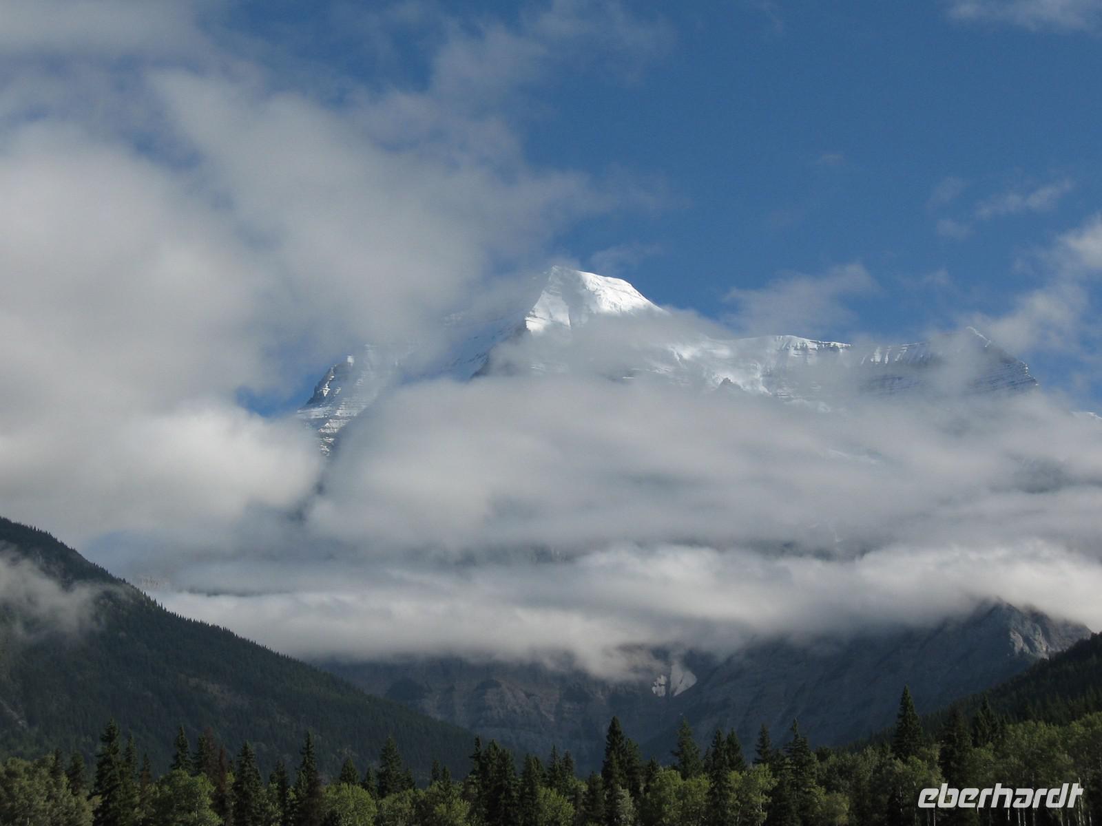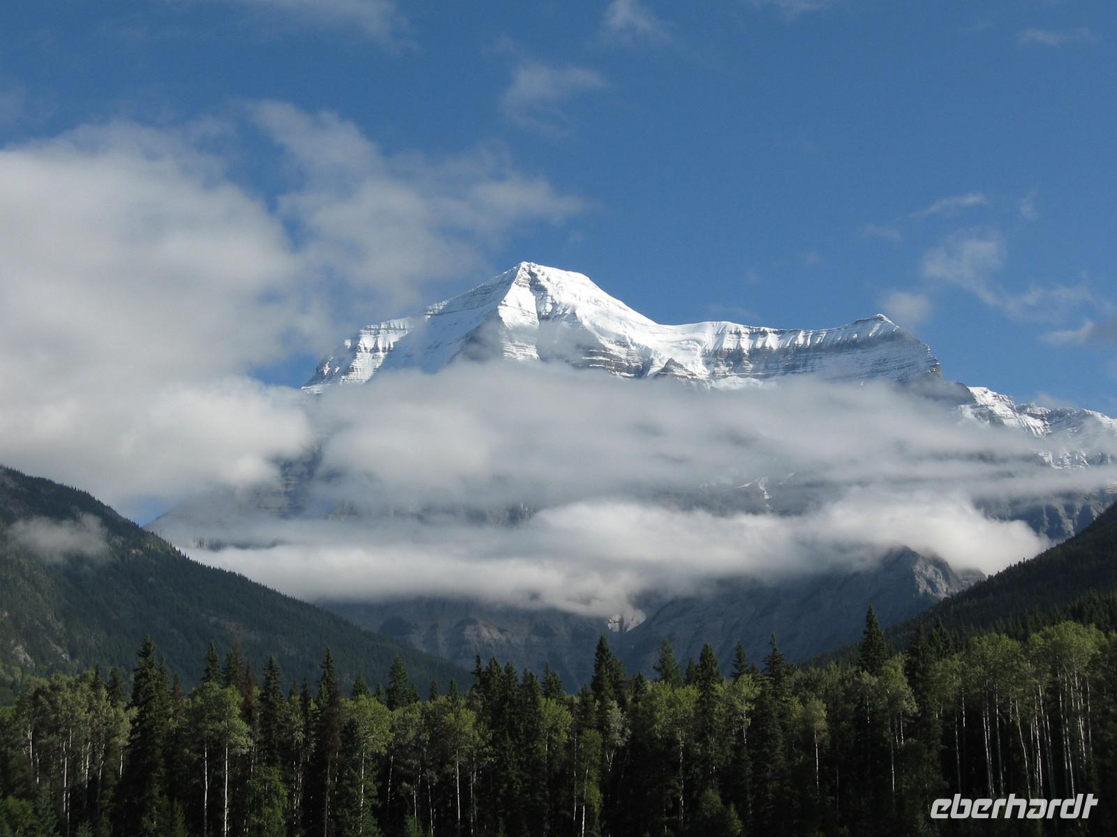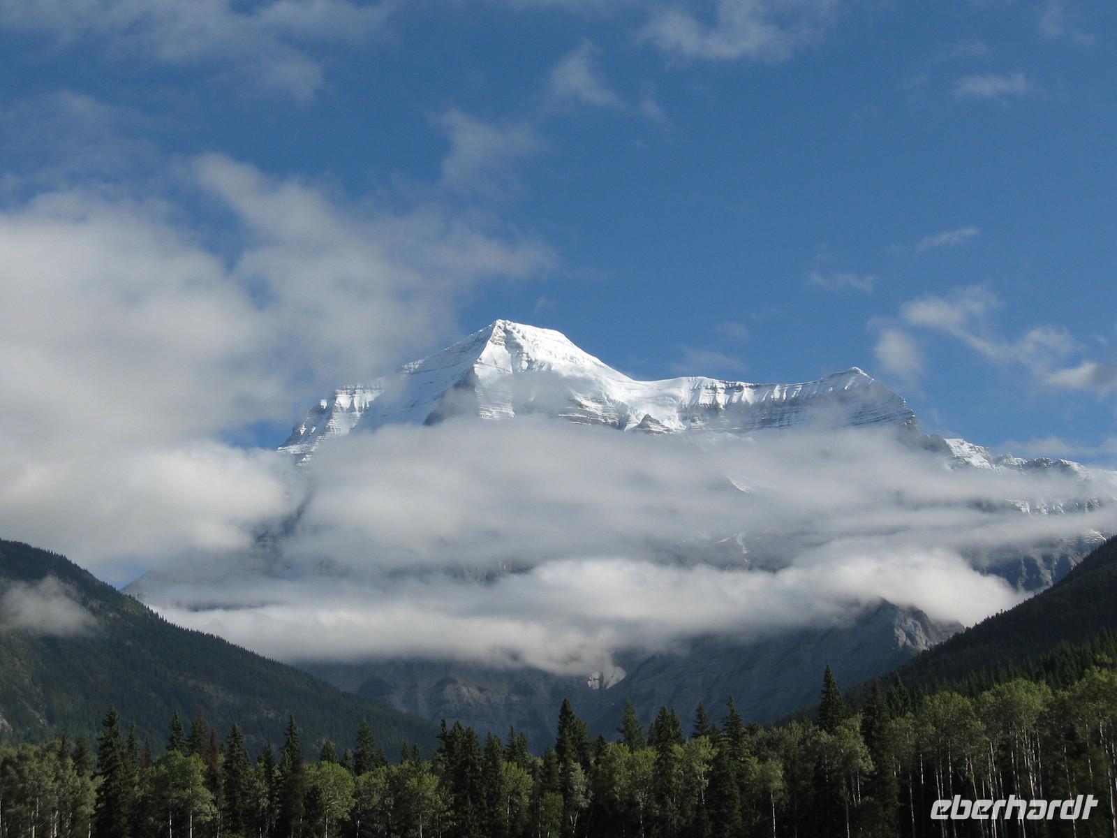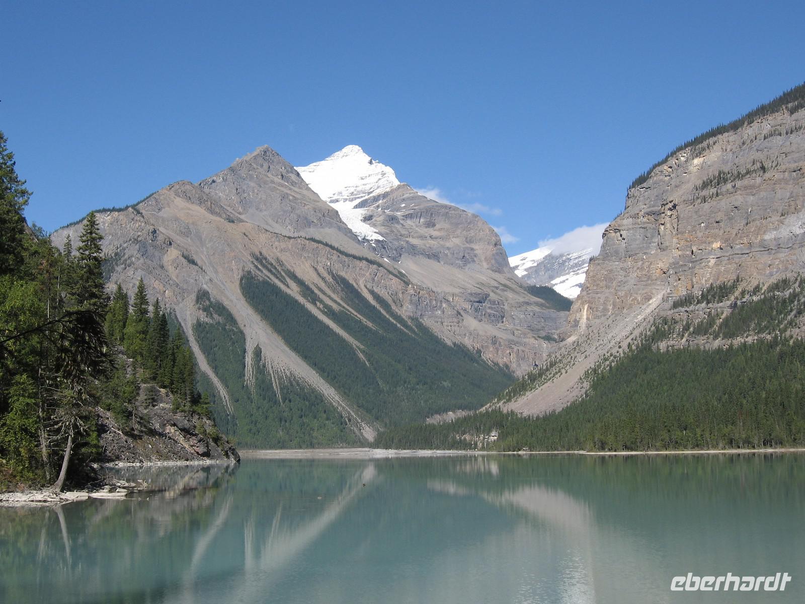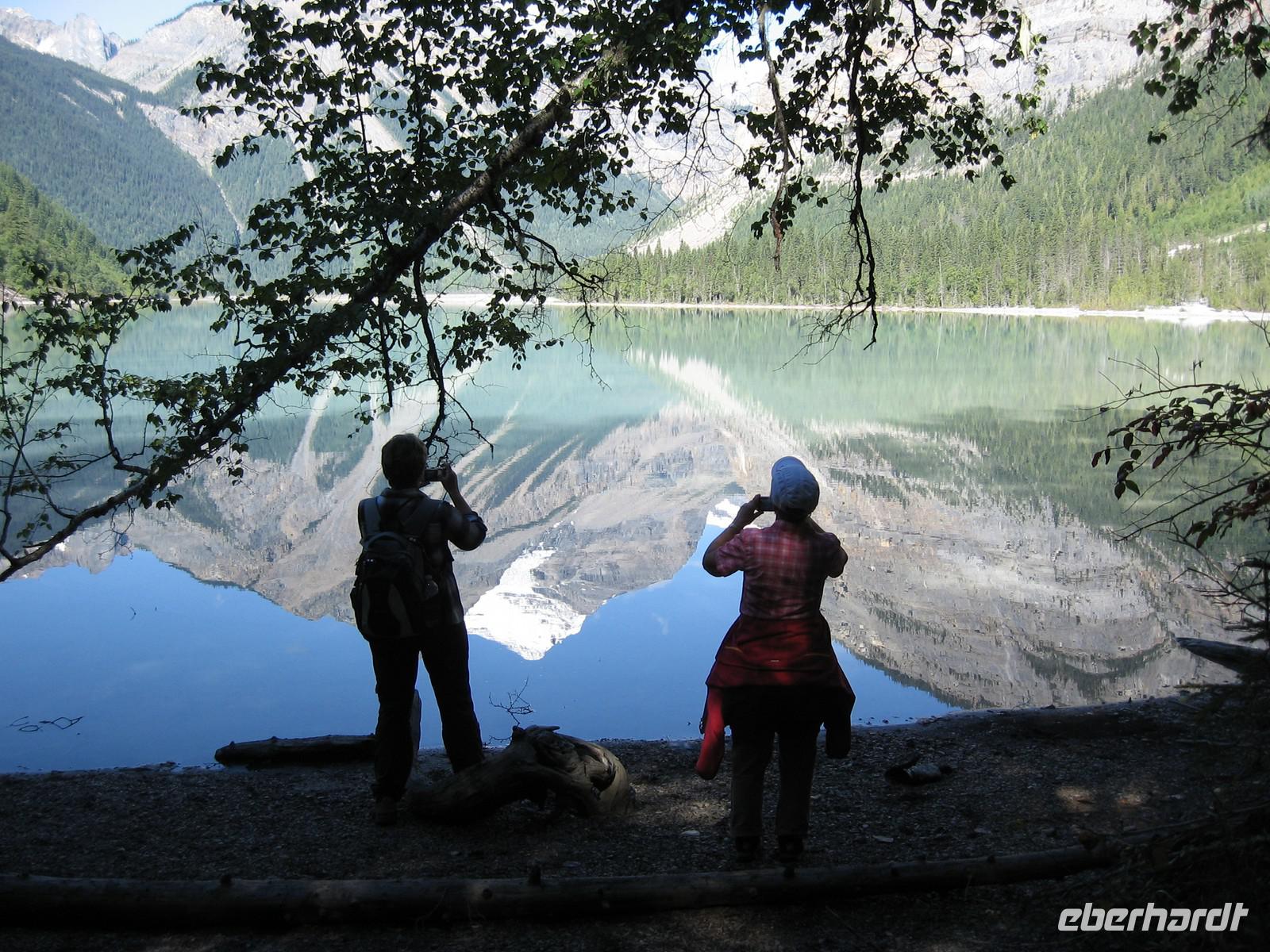 Bei strahlendem Sonnenschein verlassen wir die Sunwapta Lodge. Bei Jasper biegen wir auf den „Yellowhead Highway" ab der uns zur Grenze zwischen den Bundesstaaten Alberta und British Columbia bringt. Natürlich machen wir einen Stopp, denn es gilt die Uhren eine weitere Stunde zurück zu stellen. Kanada hat 4,5 Zeitzonen und wir bereisen zwei davon. Mohsen, unser Busfahrer, hat uns heute eine Flasche kanadischen Whisky gestiftet und den nutzen wir um gleich hier anzustoßen. Nur wenig später erreichen wir den Mount Robson Provincial Park. Der Berg zeigt sich bei Ankunft leicht in Wolken gehüllt. Nur wenige Minuten später können wir erleben wie sich die Wolken verziehen und der Mount Robson präsentiert sich uns in voller Schönheit. Unsere Wanderung zum Kinney Lake führt uns immer durch den Wald und entlang des Kinney River. Der Blick zum Mount Robson wird dabei immer wieder frei, wir haben das Gefühl direkt auf den Berg zu zuwandern. Entlang des Kinney Lake spiegeln sich die teils schneebedeckten Berge im Wasser, ein wahrhaft traumhafter Anblick.Unser Picknick nehmen wir am Ufer des Sees im schönsten Sonnenschein ein. Der Weg zurück zum Parkplatz ist der gleiche, nur mancher von uns absolviert ihn jetzt in kurzen Hosen. Unser Tagesziel heißt heute Clearwater, gute zwei Stunden vom Mount Robson entfernt. Clearwater ist eine kleine Straßensiedlung, mit Tankstelle, Hotels und Restaurants. Idealer Ausgangspunkt für unser Abenteuer am nächsten Tag.