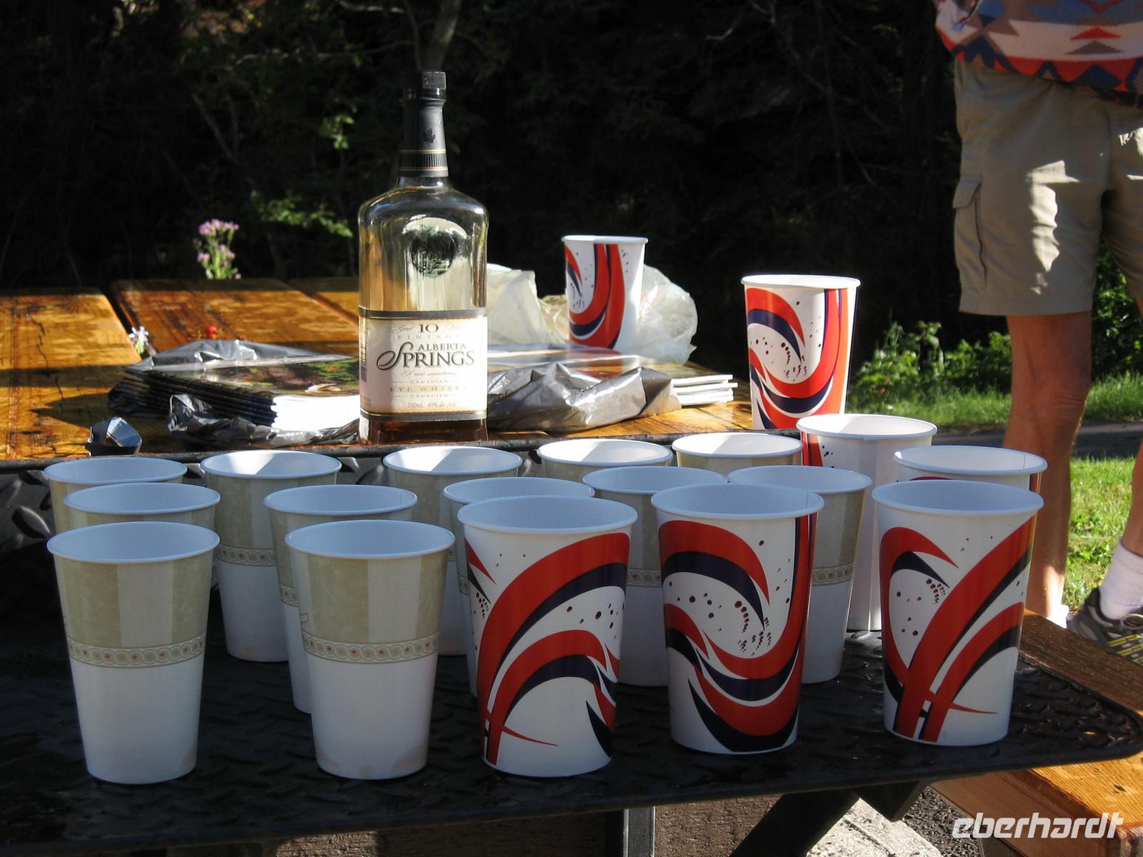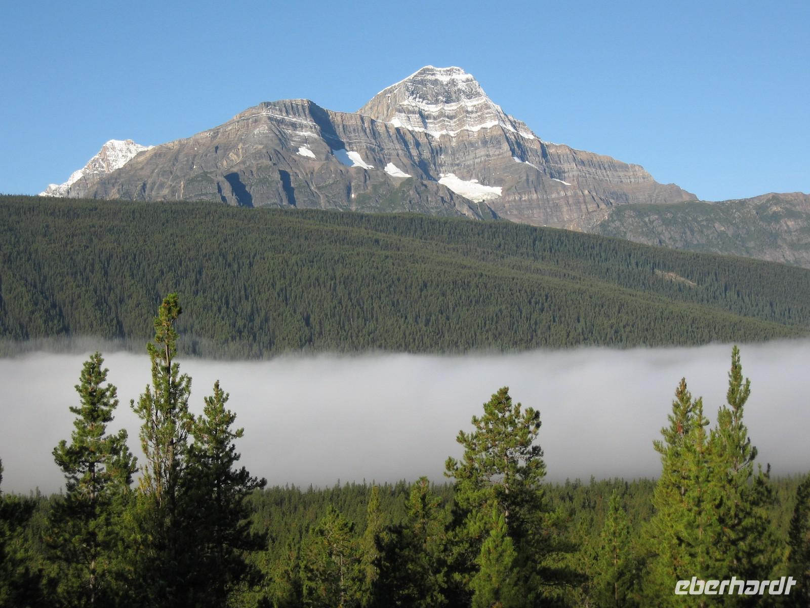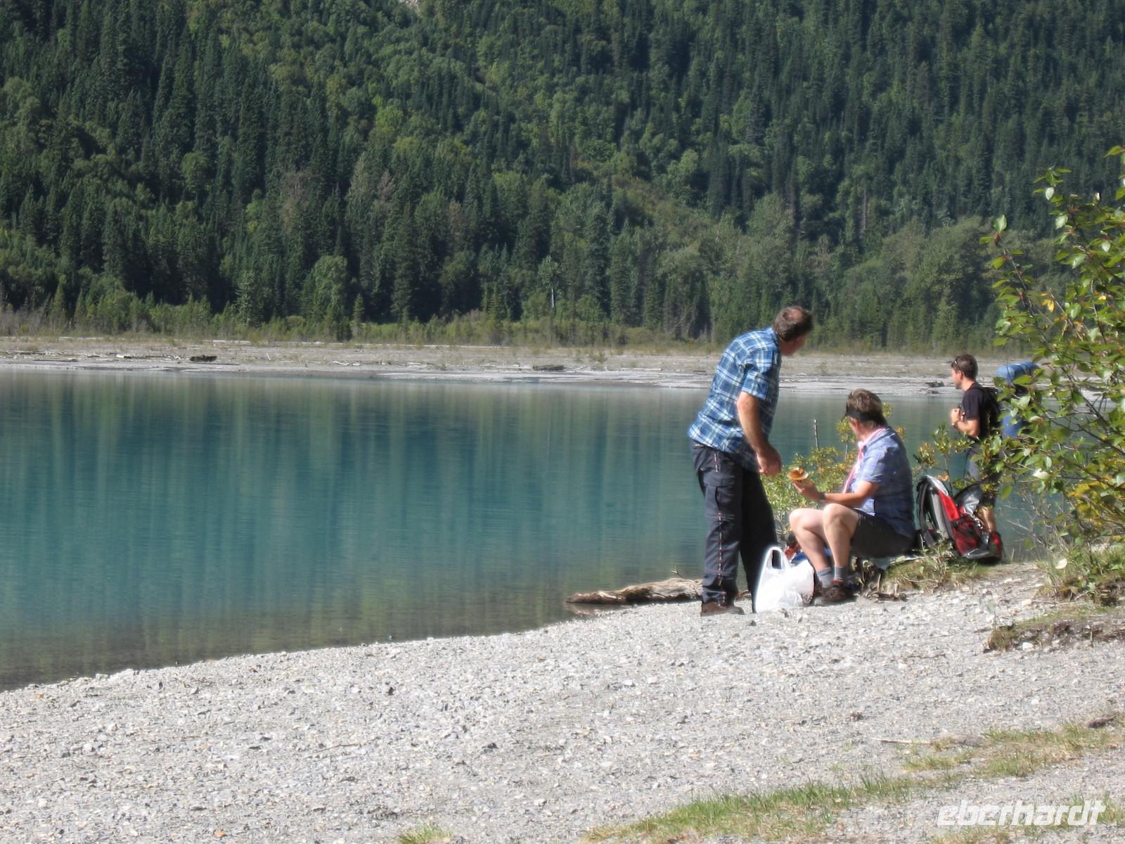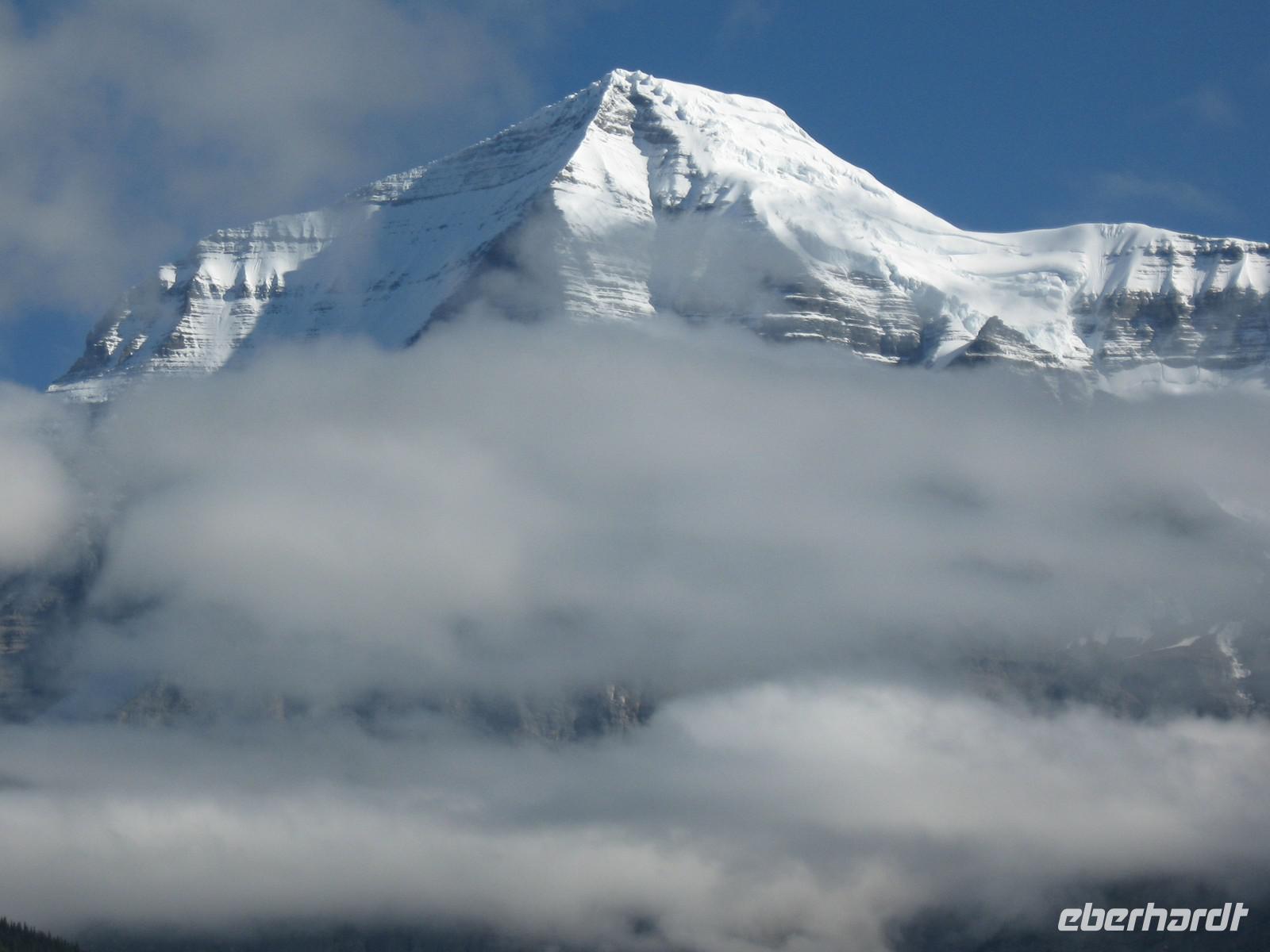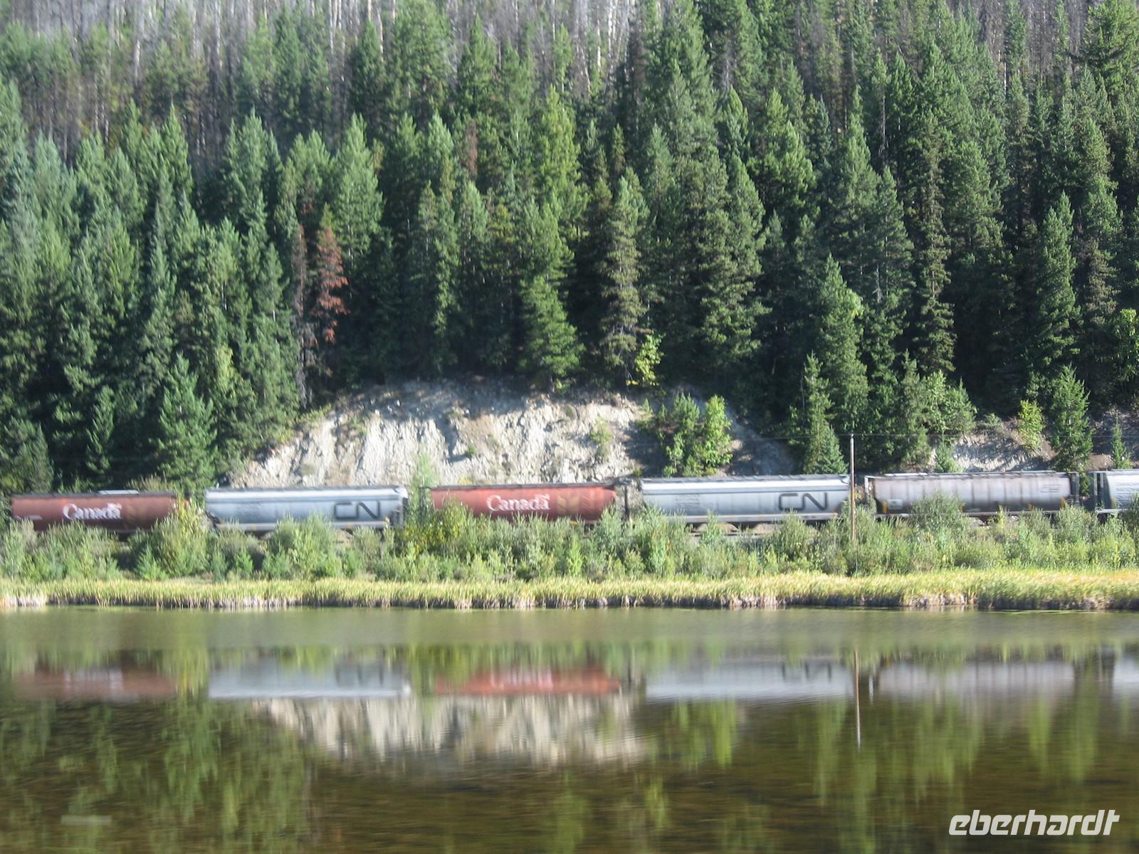 Bei strahlendem Sonnenschein verlassen wir die Sunwapta Lodge. Bei Jasper biegen wir auf den „Yellowhead Highway" ab der uns zur Grenze zwischen den Bundesstaaten Alberta und British Columbia bringt. Natürlich machen wir einen Stopp, denn es gilt die Uhren eine weitere Stunde zurück zu stellen. Kanada hat 4,5 Zeitzonen und wir bereisen zwei davon. Mohsen, unser Busfahrer, hat uns heute eine Flasche kanadischen Whisky gestiftet und den nutzen wir um gleich hier anzustoßen. Nur wenig später erreichen wir den Mount Robson Provincial Park. Der Berg zeigt sich bei Ankunft leicht in Wolken gehüllt. Nur wenige Minuten später können wir erleben wie sich die Wolken verziehen und der Mount Robson präsentiert sich uns in voller Schönheit. Unsere Wanderung zum Kinney Lake führt uns immer durch den Wald und entlang des Kinney River. Der Blick zum Mount Robson wird dabei immer wieder frei, wir haben das Gefühl direkt auf den Berg zu zuwandern. Entlang des Kinney Lake spiegeln sich die teils schneebedeckten Berge im Wasser, ein wahrhaft traumhafter Anblick.Unser Picknick nehmen wir am Ufer des Sees im schönsten Sonnenschein ein. Der Weg zurück zum Parkplatz ist der gleiche, nur mancher von uns absolviert ihn jetzt in kurzen Hosen. Unser Tagesziel heißt heute Clearwater, gute zwei Stunden vom Mount Robson entfernt. Clearwater ist eine kleine Straßensiedlung, mit Tankstelle, Hotels und Restaurants. Idealer Ausgangspunkt für unser Abenteuer am nächsten Tag.