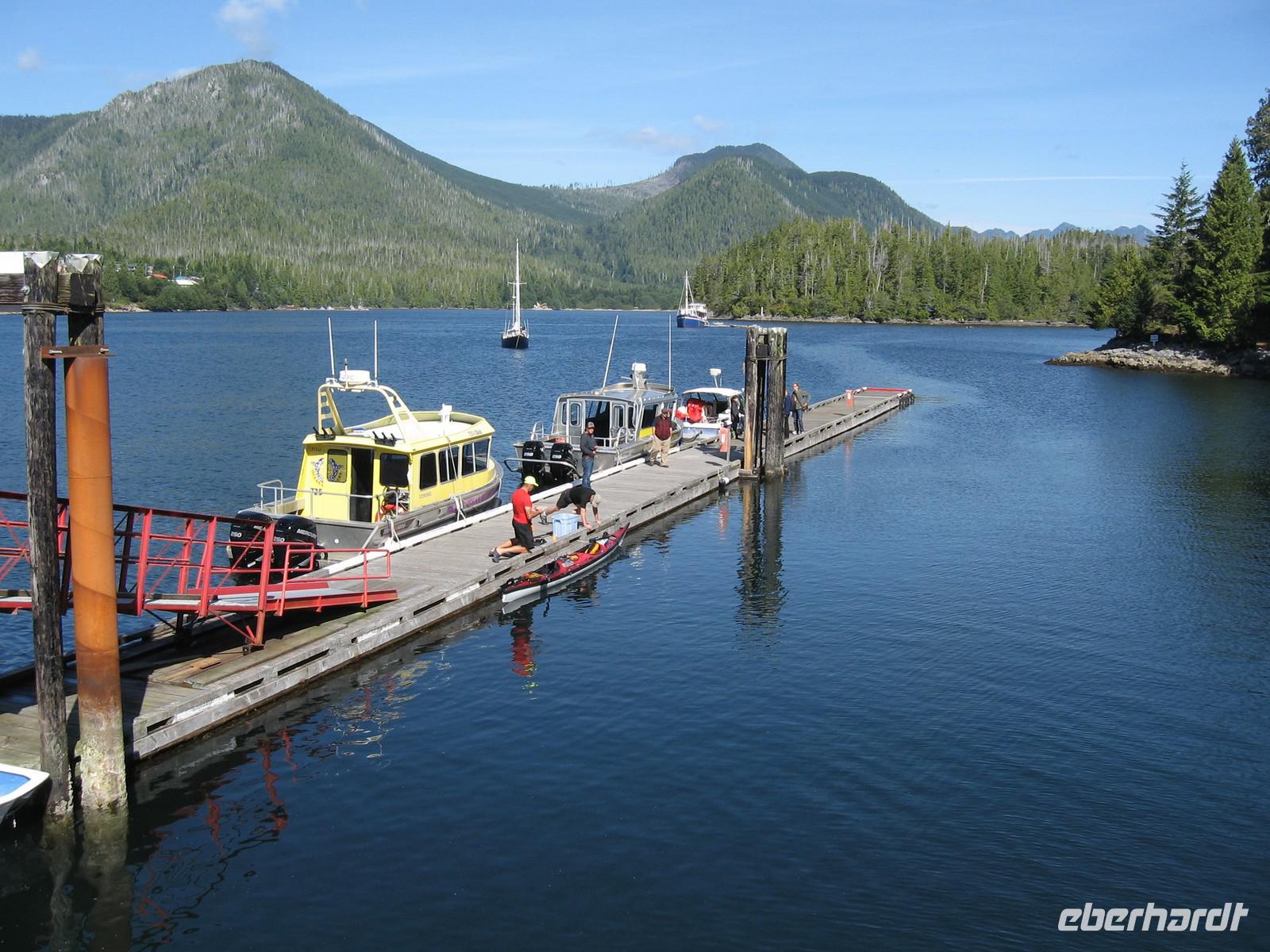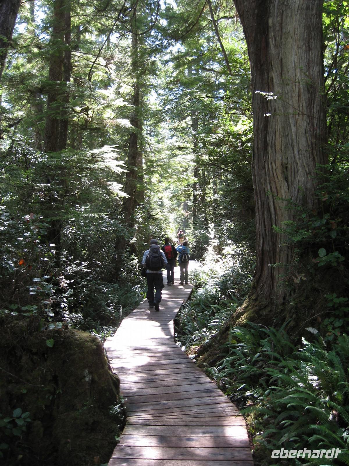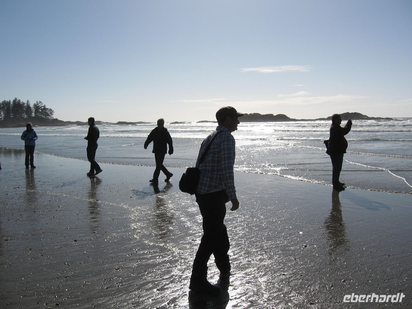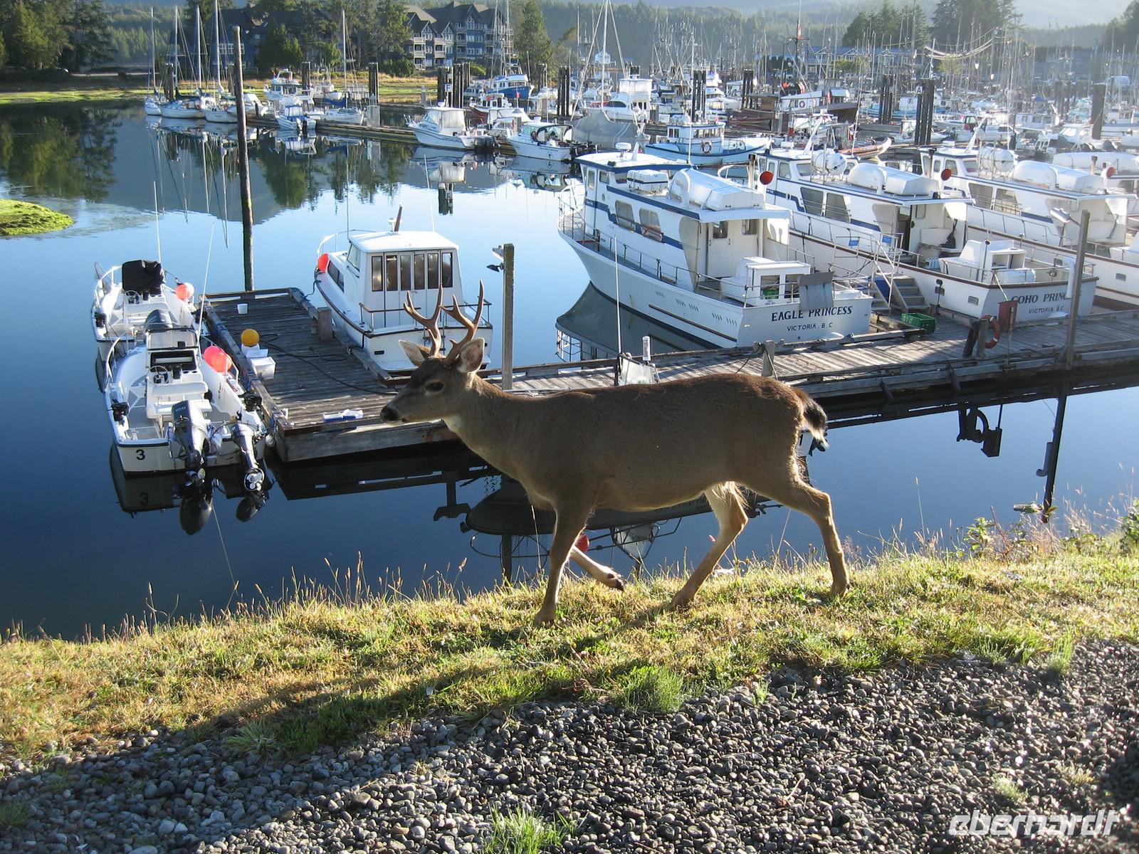 Abschied von den Bergen heißt es heute Morgen, aber wir werden sie wieder bekommen. Von Whistler geht die Fahrt an den Pacific nach Horseshoe Bay. Von hier geht die Fähre der „BC Lines" nach Vancouver Island. Diese, Vancouver vorgelagerte, Insel ist eigentlich schon ein kleines Westkanada für sich. Vom Hafen Nanaimo fahren wir nach Coombs, einem früheren Aussteiger- und Hippiedorf. Bei „Goats on the Roof", was ein Supermarkt mit Ziegen auf dem Dach ist können wir uns fürs Picknick eindecken. Über die Berge fahren wir nach Port Alberni und von dort weiter zur Pacific Küste. Bei traumhaftem Wetter machen wir einen schönen Strandspaziergang und laufen durch einen urigen Wald. Das alles ist schon ein Teil des Pacific Rim National Park. Und heute hätte es fast geklappt das wir einen Bären getroffen hätten. Er hatte seine frische Losung hinterlassen und hatte dann wohl vor unserer Übermacht das Weite gesucht. Ein letztes Stück fahren wir nach Uclulet, für zwei Nächte wird das Canadian Princess Resort unser Übernachtungsort sein. Zu Abend essen wir auf dem alten Steamer im Hafen und der Koch verwöhnt uns gar sehr. Als wir ihm den „Elchruf" als Dank überbringen schaut er doch sehr verwundert. So etwas hatte er noch nie erlebt.