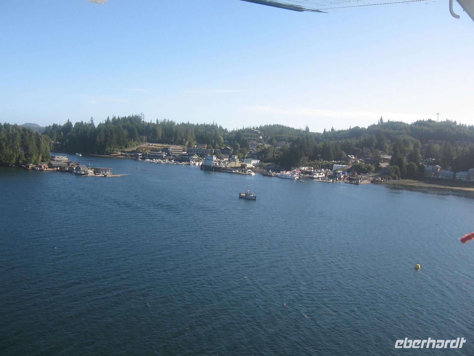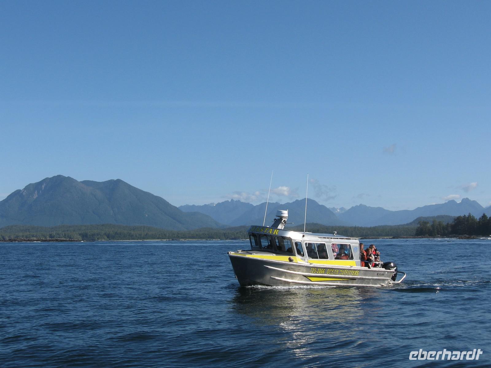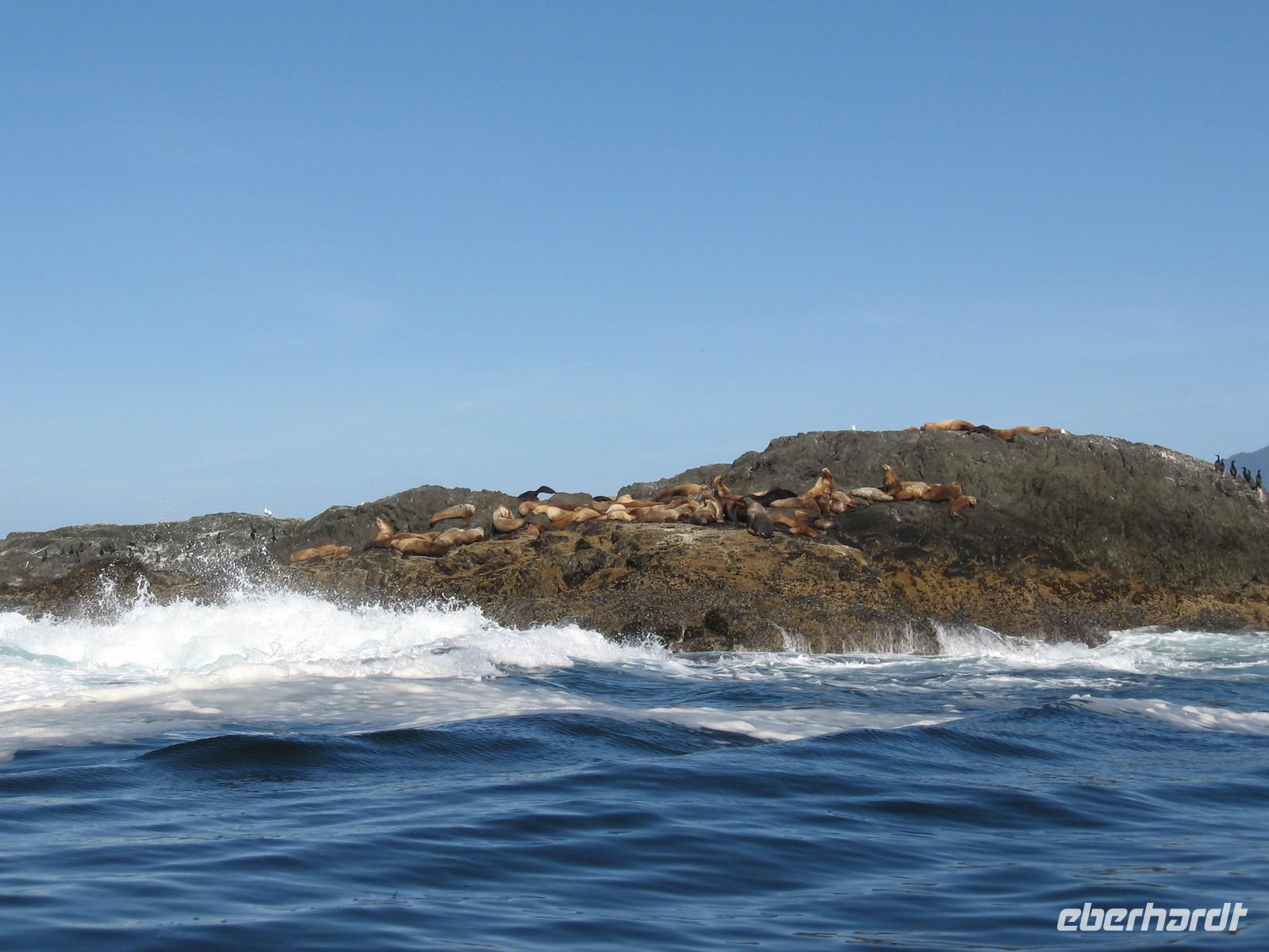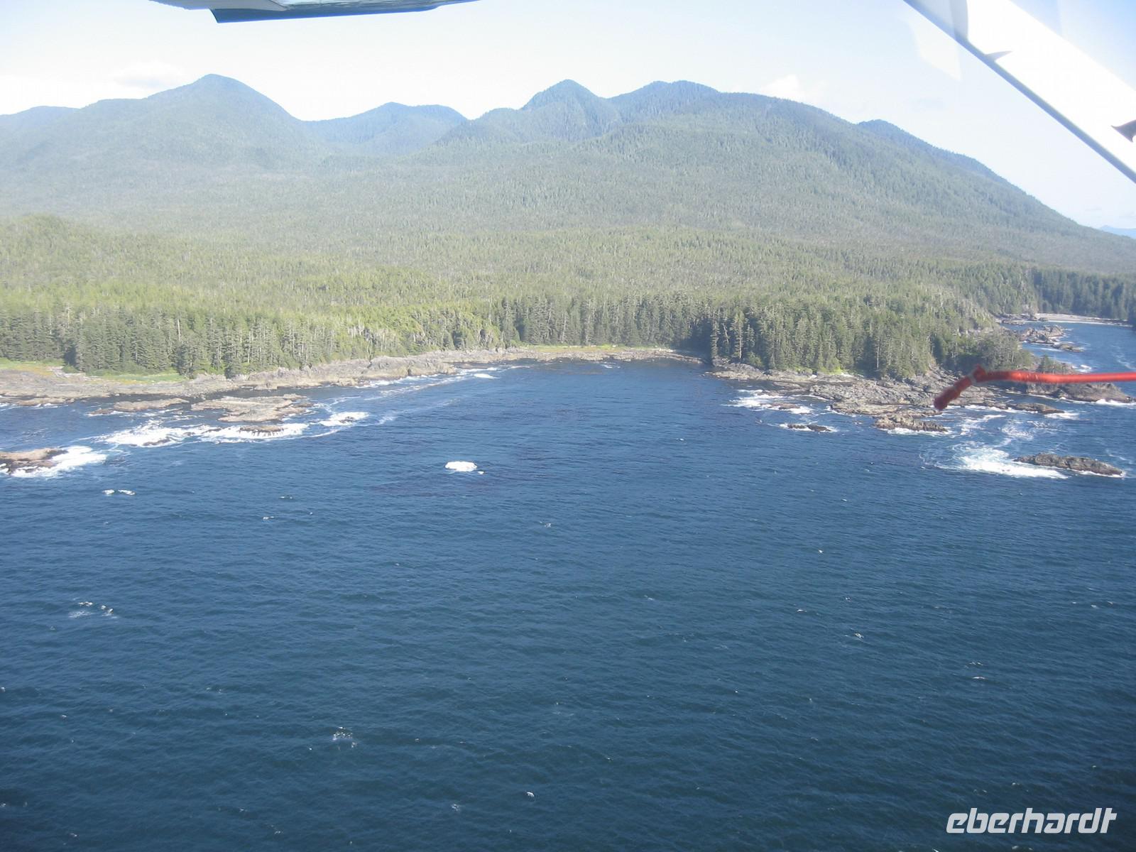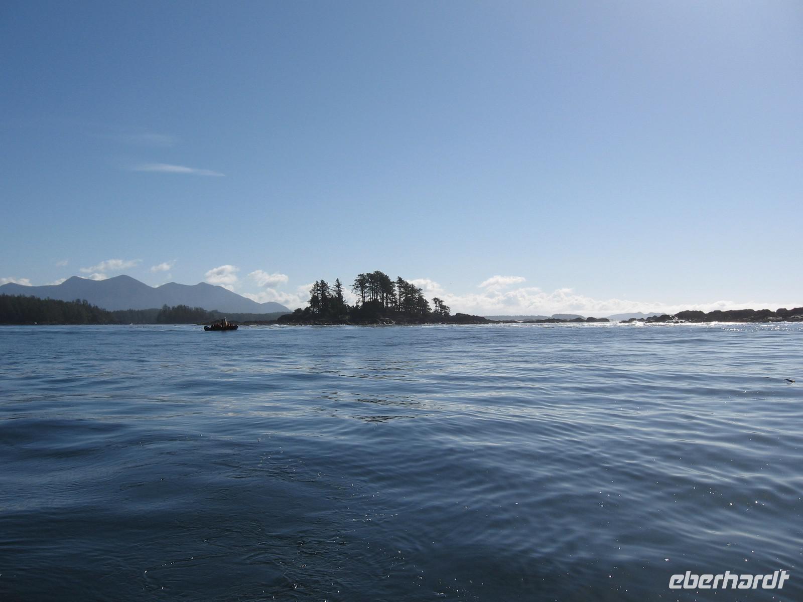 Von Uclulet fahren wir nach Tofino. Genau wie Uclulet nach dem Saisonende eher ein verschlafener Ort an der Westküste von Vancouver Island. Fakultativ steht heute Whale-Watching auf dem Programm. Nachdem alle Formalitäten erledigt sind geht es aufs Boot und hinaus aufs Meer. Die Jungs welche die Boote fahren sind nicht zimperlich und mir persönlich wird es in der Magengegend doch recht flau. Ich bin allerdings alleine mit dem Problem, alle anderen Gäste fühlen sich großartig. Einen bzw. zwei Grauwale bekommen wir unterwegs auch zu sehen, also ich sehe die Fontaine und auch mal die Schwanzflosse. Später treffen wir auf Seehunde und später Seelöwen, sehen Wasservögel und Seeotter. Ziel ist die Hot Spring Cove im Maquinna Provicial Park. Vom Bootssteg laufen wir durch gemäßigten Regenwald, wie uns Barry erklärt. Das Zusammenspiel der Bäume, Moose und Pflanzen ist fantastisch, immer wieder hat man den Eindruck wir sind in einem Märchenwald unterwegs. Mit Blick auf die Bucht nehmen wir unser Lunch und wer Lust hat kann auch in der heißen Quelle baden, ganz natürlich, einfach zwischen den Felsen. Einige aus unserer Gruppe nutzen das uns sind begeistert, andere machen noch einen Spaziergang durch den Wald. Zurück nach Tofino geht es dann mit dem Wasserflugzeug. Maximal sechs Personen können auf einmal fliegen, so dass wir gestaffelt abreisen. Es ist ein toller Eindruck, das Meer und die vielen Inseln von oben zu betrachten. Von Tofino aus fahren wir wieder nach Uclulet. Eine Wanderung wollen wir noch auf dem „Wild Ocean Trail" rund um den Leuchtturm in Uclulet machen. Wieder ein Märchenwald und immer wieder tolle Blicke aufs Meer. Nach einem wieder köstlichen Abendessen gehen wir müde und voller Erlebnisse zu Bett.