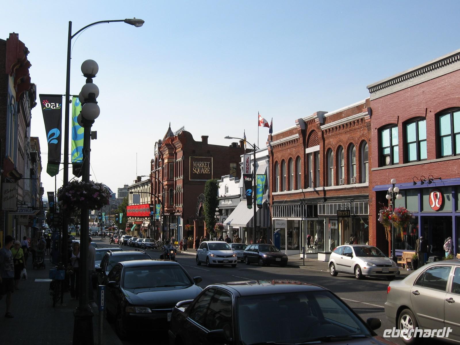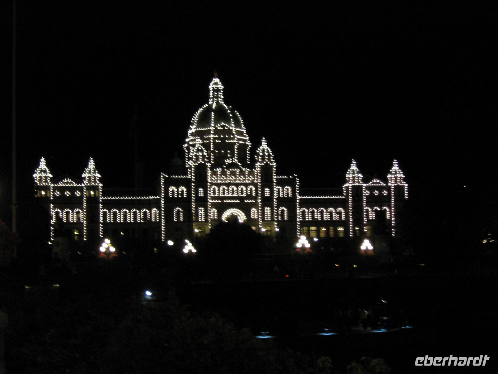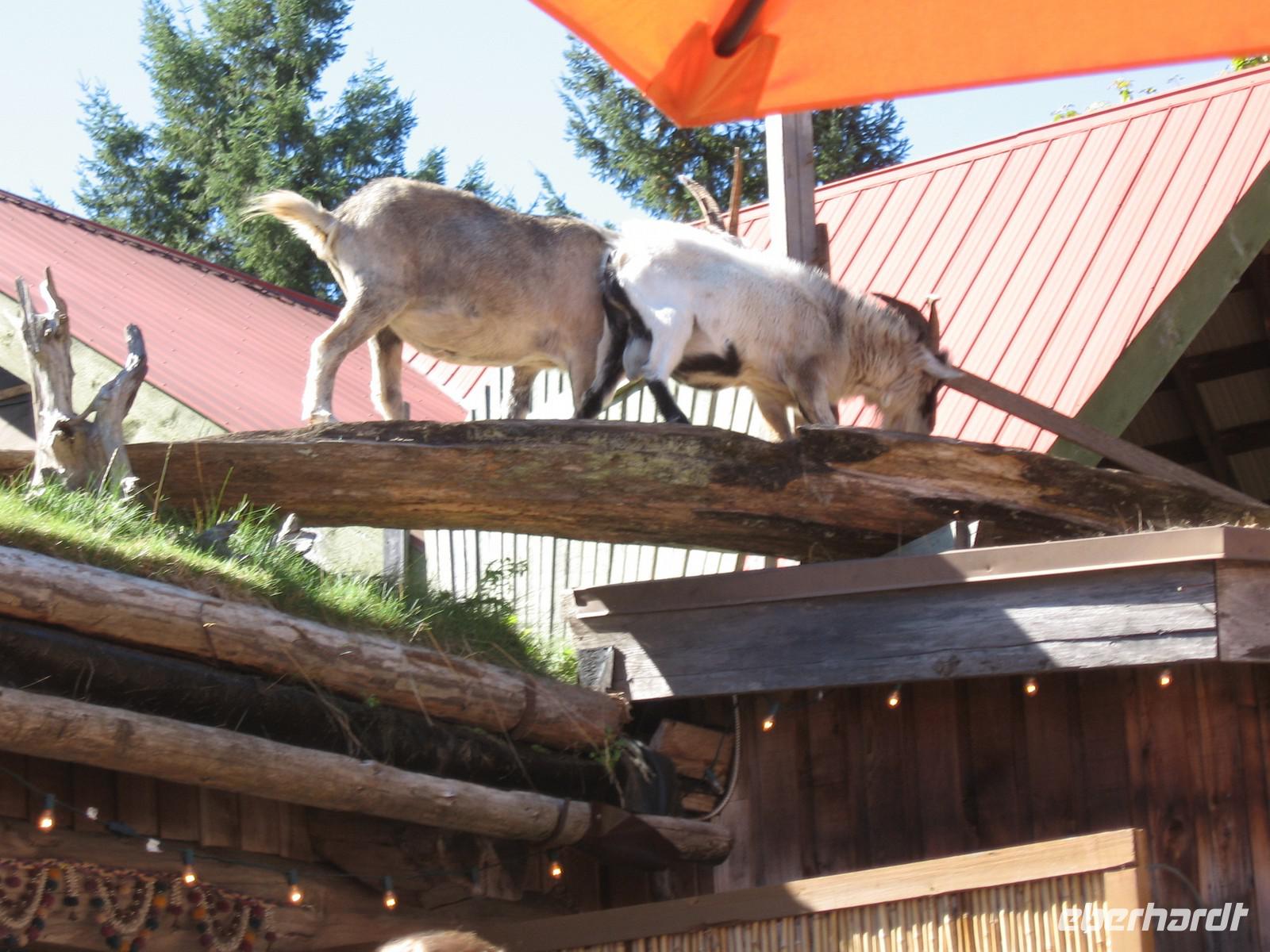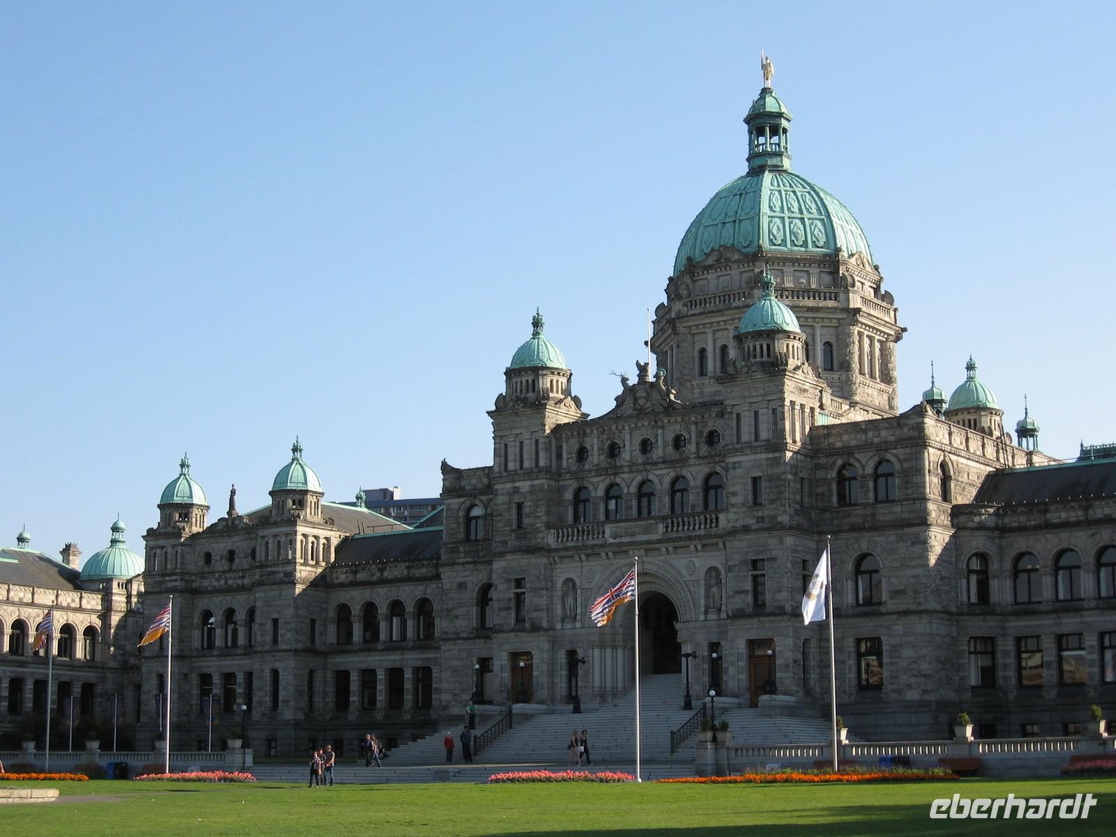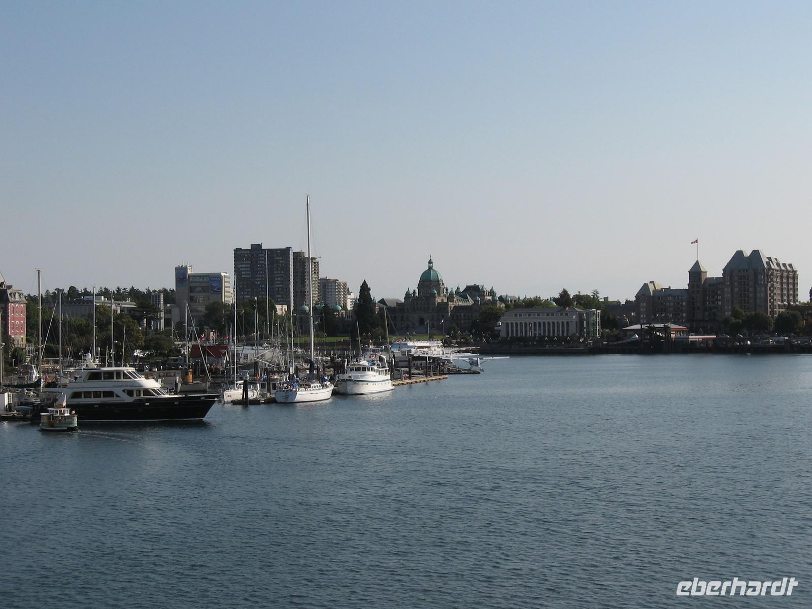 Heute verlassen wir den Pacific um am Abend wieder am Pacific zu sein. Es ist Umsetzttag, wie es Barry immer nennt. Unterwegs gibt es natürlich ein paar Stopps um die Fahrt aufzulockern. Wenn wir mal vom Halt bei Mac Donald in Port Alberni absehen, haben wir zuerst einen Spaziergang durch Kathedralenwald, „Cathedral Grove" gemacht. Auch hier kommt man sich vor wie in einem Märchenwald, bis zu 140 m hohe Douglasien sind hier anzutreffen. Cathedral Grove gehört auch zu den gemäßigten Regenwäldern wie man sie hier an der Westküste bis runter nach San Francisco findet. In Coombs am Laden mit den Ziegen auf dem Dach machen wir einen Mittagshalt. Zahlreiche Geschäfte locken in diesem ehemaligen Hippiedorf zum verweilen. Und Hippies gibt es auch noch, voller Inbrunst sang einer aus dieser Generation Lieder zur Gitarre. Weiter fahren wir nach Chemainus. Hier hat man sich vor Jahren auch etwas einfallen lassen um Touristen in den Ort zu locken. Zahlreiche Häuser sind mit Wandbildern verziert. Meist zeigen Sie Szenen aus dem Arbeitsleben der Holzfäller dieser Gegend. Bevor wir weiter fahren stoßen wir noch einmal auf die Reise an, mit einem Schluck Wein und wer möchte mit einem kanadischen Whisky. Dazu gibt es leckere Macadamia Cookies, unser aller Favorit hier in Kanada. Mohsen stiftet noch etwas gesundes, frische Marillen vom Markt. Eine gute Stunde später kommen wir in Victoria an, der Hauptstadt von British Columbia. Eine orientierende Stadtrundfahrt bringt uns die teilweise sehr britisch anmutende Stadt etwas näher. Unser Hotel liegt nahe der Waterfront. Zum Abendessen lassen wir uns später bei Shandlers Seafood verwöhnen.