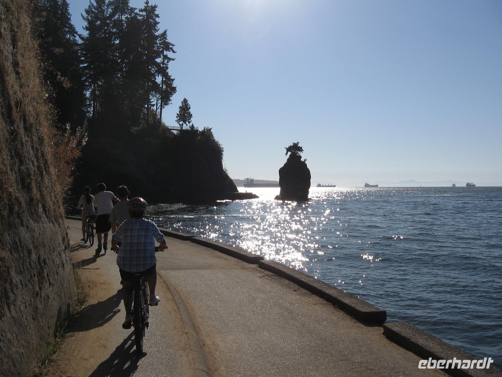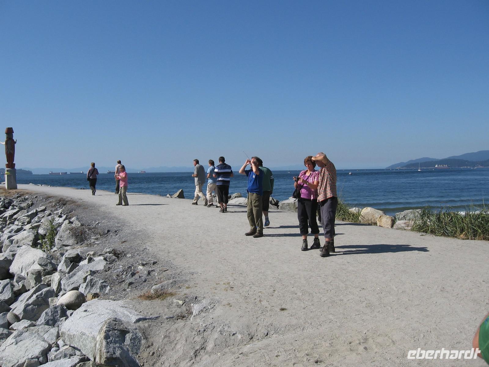 Noch einmal fahren wir zur Horseshoe Bay, denn ganz in der Nähe befindet sich der Lighthouse Park. Ein Naherholungsgebiet für die Bewohner Vancouvers. Wieder wandern wir durch Altwald, große Rotzedern säumen unseren Weg und an manchen Stellen kann man schon wieder das Gefühl von Märchenwald haben. Immer wieder gibt es Aussichtspunkte hinaus auf den Pazifischen Ozean und am Horizont ist Vancouver Island zu sehen. Heute am Samstag ist natürlich auch reichlich Bootsverkehr in der Bucht vor Vancouver. Von Bedeutung für die Schifffahrt war und ist der Leuchtturm am Point Atkinson. Der heutige Leuchtturm wurde in einem modernen architektonischen Stil im Jahre 1912 gebaut. Leuchtturmwärter gibt es natürlich heute keinen mehr, alles funktioniert ferngesteuert. Schon um die Mittagszeit sind wir heute zurück im Hotel. Das ist so gewollt, denn wir alle haben Lust die Stadt noch individuell zu erkunden. Eine Möglichkeit ist dafür das Fahrrad zu nutzen. Das werde ich tun. Es ist zwar nicht ganz billig, es macht aber total Spaß immer am Ozean entlang bis zum Stanley Park zu fahren und natürlich auch wieder zurück. Drei Stunden Vancouver live mit dem Fahrrad, das ist es! Mit zufriedenen Gesichtern treffen wir uns alle wieder zum Abendessen und jeder von uns hat etwas über seine Erlebnisse am Nachmittag zu berichten.