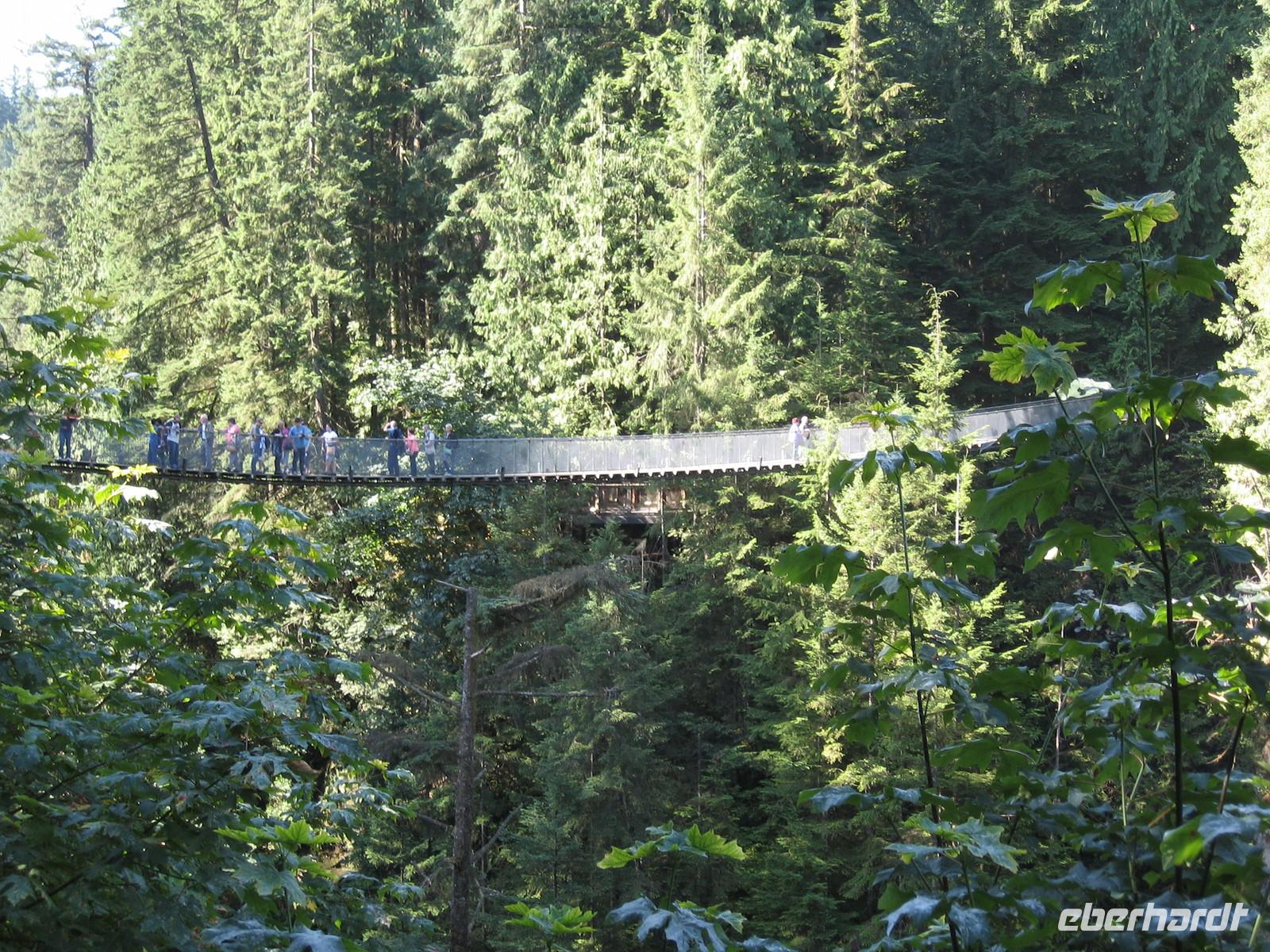 Bei strahlendem Sonnenschein standen heute die letzten Entdeckungen auf unserem Programm. Wir fahren zum Cleveland Staudamm und laufen dann wieder durch einen wunderschönen Wald zu einer Lachsaufzuchtstation. Hier werden kleine Lachse gezüchtet und aufgezogen, bis Sie groß genug sind und in den Ozean wandern können. Wir können an der Lachstreppe auch nochmal das springen der Lachse beobachten, welche wieder zu ihrem Geburtsort zurückkehren um selbst neues Leben zu stiften. Der schon von Barry erklärte Lebenskreis der Lachse erhält hier nochmal ein lebendiges Beispiel. Nur ein paar Minuten von hier entfernt wartet ein weiteres Abenteuer auf uns. Die Capilano Suspension Bridge, eine Hängebrücke welche 173 m lang ist und rund 70 m über dem Tatboden schwebt. Je nach Belegung schwankt die Brücke ganz schön, wer das vertragen kann für den ist ein Vergnügen. Danach führt uns ein Weg durch die Bäume, dabei geht es wieder über kleine Hängebrücken von Baum zu Baum. Dieser Weg nennt sich „Treetops Adventure". Mut verlangt anschließend auch der „Cliffwalk". Über Stege läuft man auf eine Aussichtsplattform welche in luftiger Höhe über dem Capilano River Canyon schwebt. Da braucht es gute Nerven. Unweit dieser Attraktionen fährt die Kabinenseilbahn auf den Grouse Mountain, den Hausberg von Vancouver. Die Stadt gilt ja als eine der lebenswertesten der Welt und da ist durchaus etwas wahres dran. Von Downtown Vancouver sind es nur 20 Minuten und man steht mitten im Wald mit rund 100 Kilometer Wanderwegen. Im Winter ist es ideal für alle die Wintersport lieben, selbst nach Whistler ist es nicht weit, ab 15. November bis in den Mai kann dort Ski gefahren werden. Auf Grouse Mountain sind allerlei Aktivitäten in Gang, zum Beispiel eine Holzfäller-Show, eine Show mit Greifvögeln und für ein gewisses Entgelt kann man auch noch Paralellparagleiten und andere tolle Sachen machen. Das wandern kommt aus meiner Sicht vielleicht etwas zu kurz, den Ausblick auf die Stadt und vor allem das tolle Wetter laden zum genießen ein. Nachdem wir uns im Hotel noch einmal „umgeschlagen" haben treffen wir uns zum Abendessen. Abschiedsabendessen im Restaurant „Boathouse". Nach dem Spaziergang am Ufer entlang erwartet uns nicht nur ein tolles Dinner sondern auch absolut toller Sonnenuntergang. Der glühende Feuerball versinkt hinter Vancouver Island im Meer - trotz der tollen Farben am Himmel zieht etwas Wehmut auf, der Abschied von Kanada ist nur noch eine Nacht entfernt.
