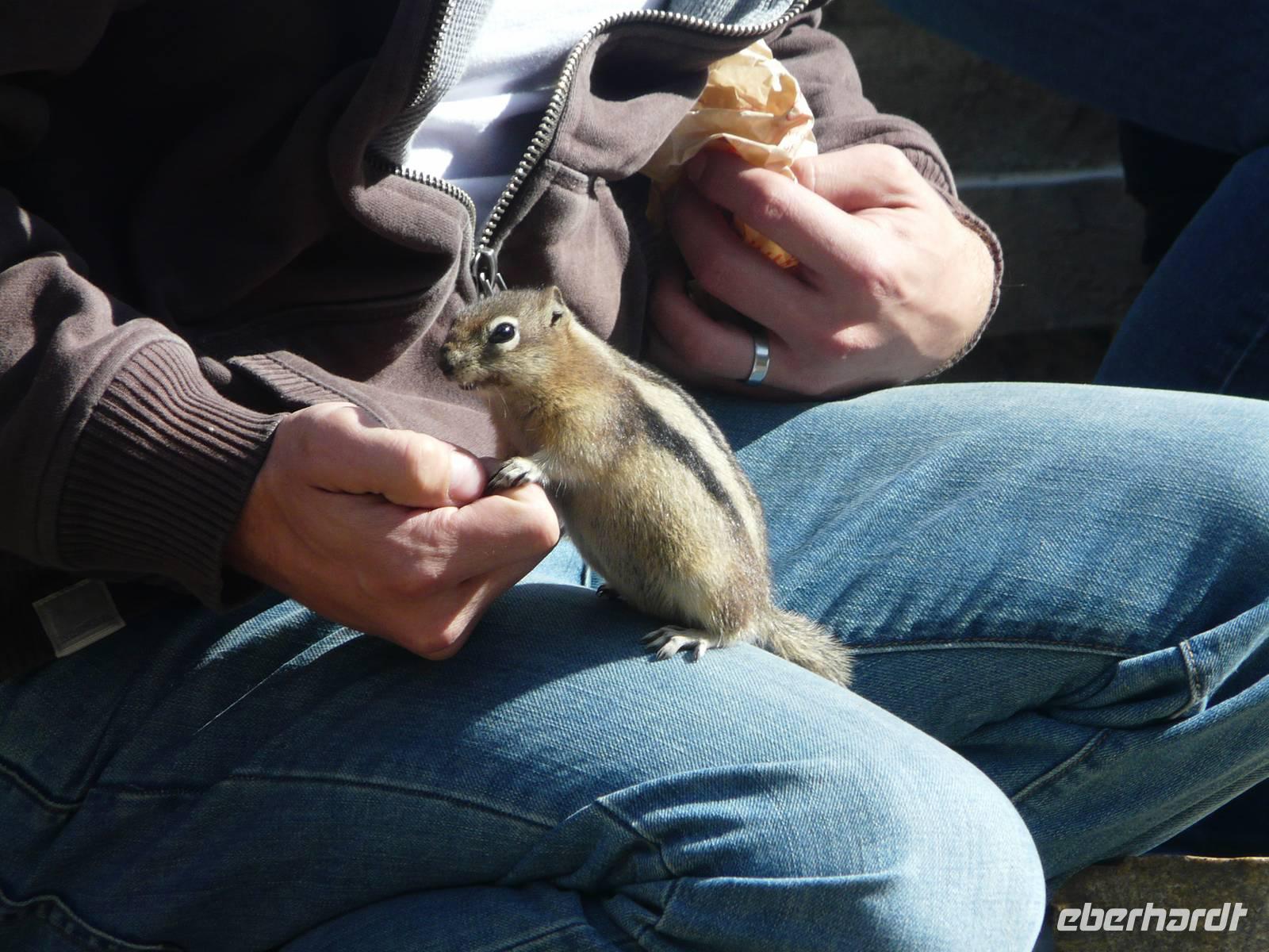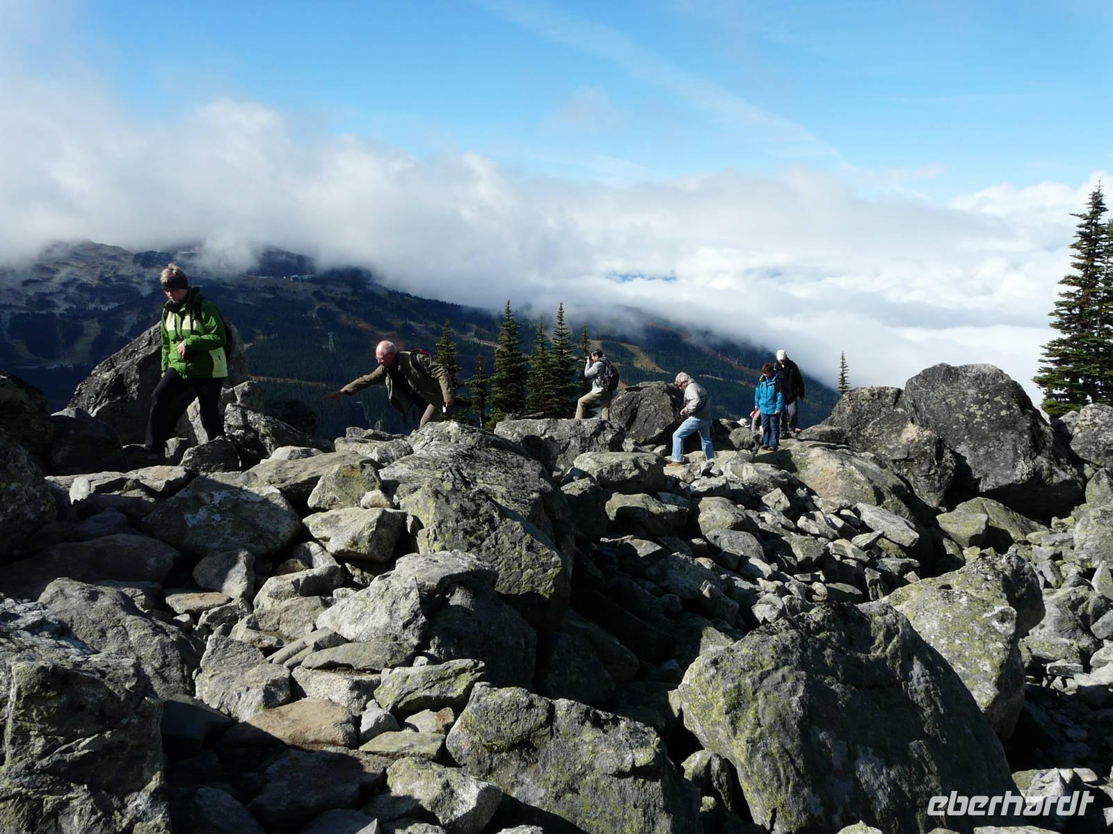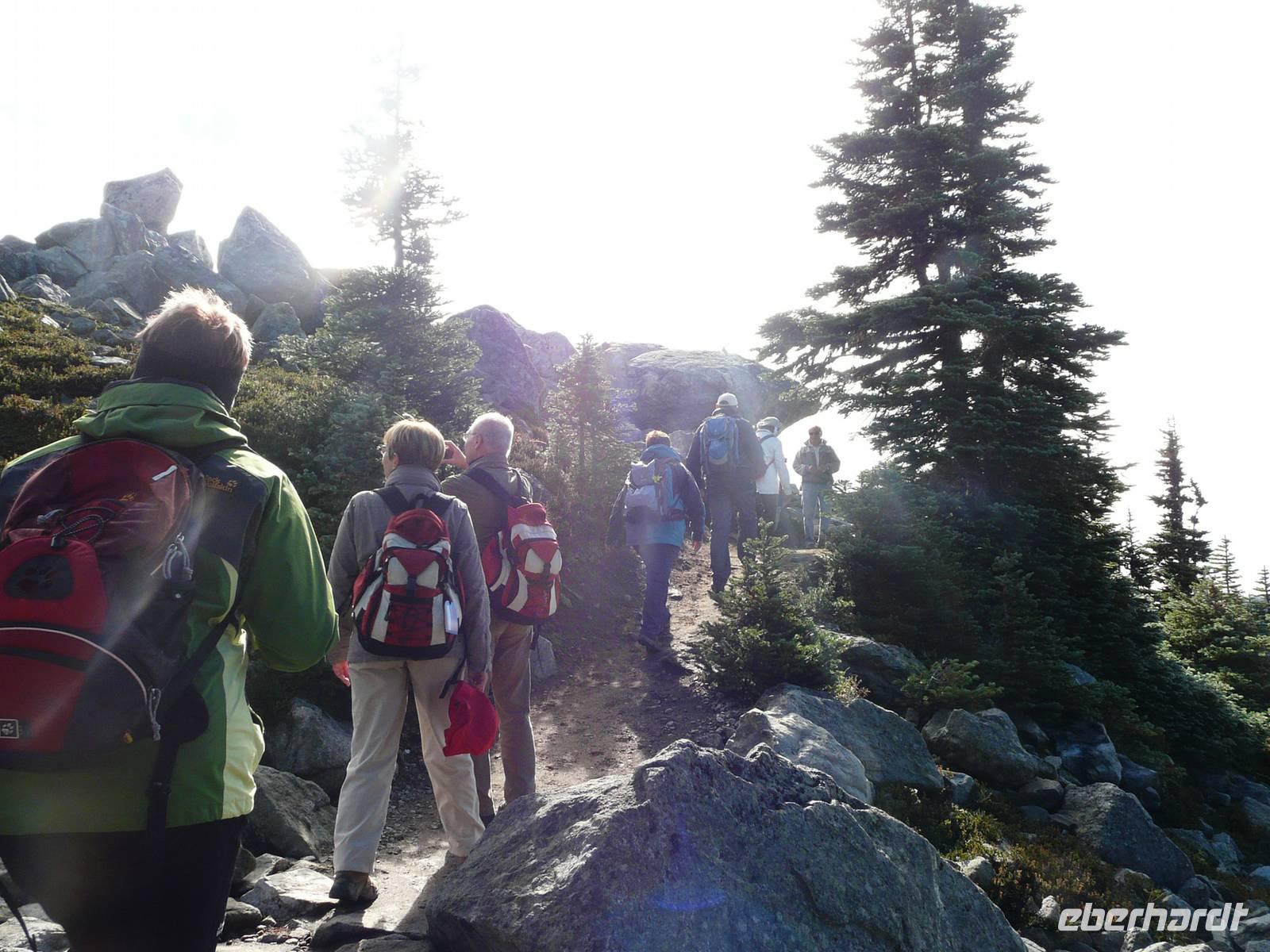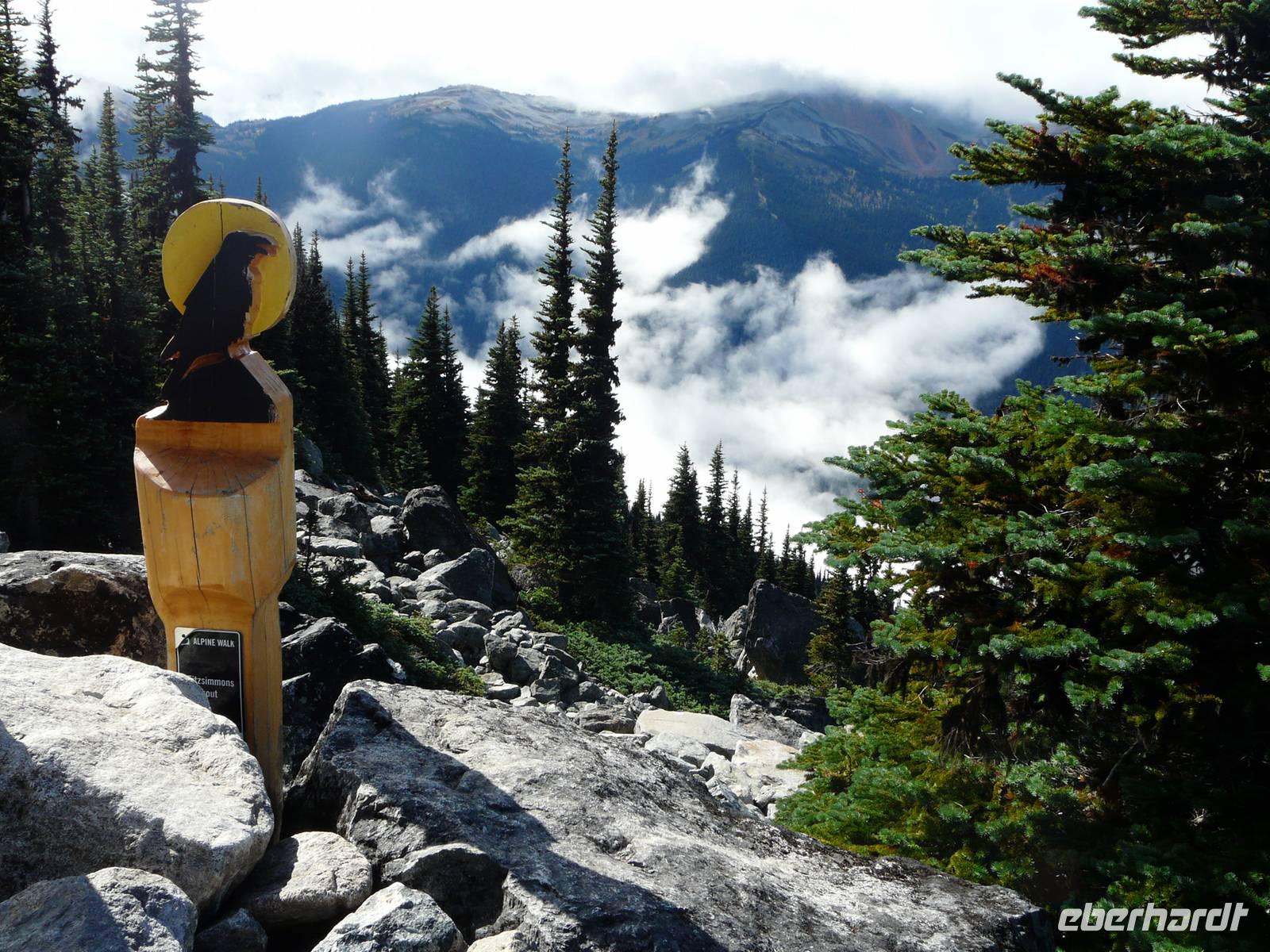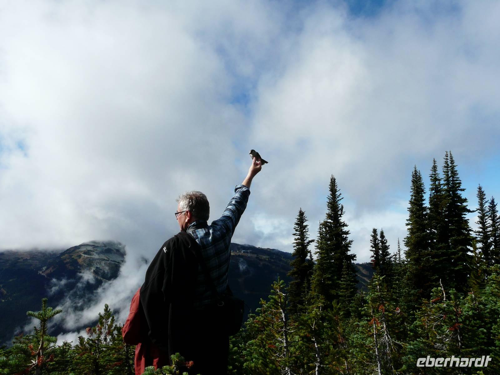 Das Frühstück verläuft heute etwas schleppen, auch der Tag begrüßt uns nicht mit dem besten Wetter. So bummeln wir am Morgen gemeinsam mit Peter etwas länger durch das Städtchen ehe wir mit der Seilbahn auf den Whistler Mountain hinauf fahren. Oben angekommen fotografieren wir uns erstmal auf den olympischen Siegertreppchen, ehe wir einen kleinen Spaziergang machen. Das Highlight folgt danach - wir fahren mit der längsten frei schwebenden Gondelbahn von Gipfel zu Gipfel, Peak-2-Peak. Mittlerweile wird das Wetter auch besser und so machen wir auf dem gegenüberliegenden Blackcomb eine tolle Wanderung, die so einige Überraschungen für uns bereit hält. Über einen schmalen Weg folgen wir Peter immer am Hang entlang, ein hölzerner Adler scheint uns den Weg zu weisen. Über große Steine und etwas Geröll steigen wir etwas auf und gehen einen schmalen Weg weiter, links und rechts wachsen flache Sträucher und Gräser. Wir sehen Murmeltiere und erleben, wie zutraulich Vögel doch sein können. Peter nimmt etwas Keks, hält seinen Arm in die Höhe und auf einmal kommen Vögel geflogen und fressen ihm aus der Hand - Whiskey Jacks. Wir machen es Peter nach und mittlerweile scheint es nicht nur ein Whiskey Jack gemerkt zu haben, dass es hier etwas zu knabbern gibt. Im wieder fliegen sie kurz auf unsere Hände, picken Keks, Cracker oder Müsliriegel um kurz darauf wieder zu verschwinden - ein einzigartiges Naturerlebnis, welches wahrscheinlich für viele von uns einmalig ist. Irgendwann machen wir uns auf den Rückweg, fahren wieder mit der Rekordseilbahn von Gipfel zu Gipfel, diesmal sogar mit Glasboden in der Gondel. Nach einem kurzen Mittagssnack an der Bergstation geht es noch kurz mit einer kleineren Seilbahn zum Gipfel des Whistler Mountain. Leider haben wir hier etwas Pech und sehen nichts als Nebel. Glücklicherweise steht uns ein riesiger Inukshuk als tolles Fotomotiv zur Verfügung, eine typisch indianische, aus Stein gemachte Figur. Wieder an der Bergstation angekommen, können wir noch etwas beobachten, wofür Whistler mittlerweile auch berühmt ist - junge Männer und Frauen, die mit Mountainbikes den Berg hinunter rasen, einfach spektakulär. Der restliche Nachmittag steht uns dann zur freien Verfügung. Glücklicherweise ist im Tal bestes Wetter und so können wir Eis essen und entspannt durch die vielen kleinen Geschäfte und Souvenirshops bummeln. Den Abend lassen wir dann in der Old Spaghetti Factory ausklingen.