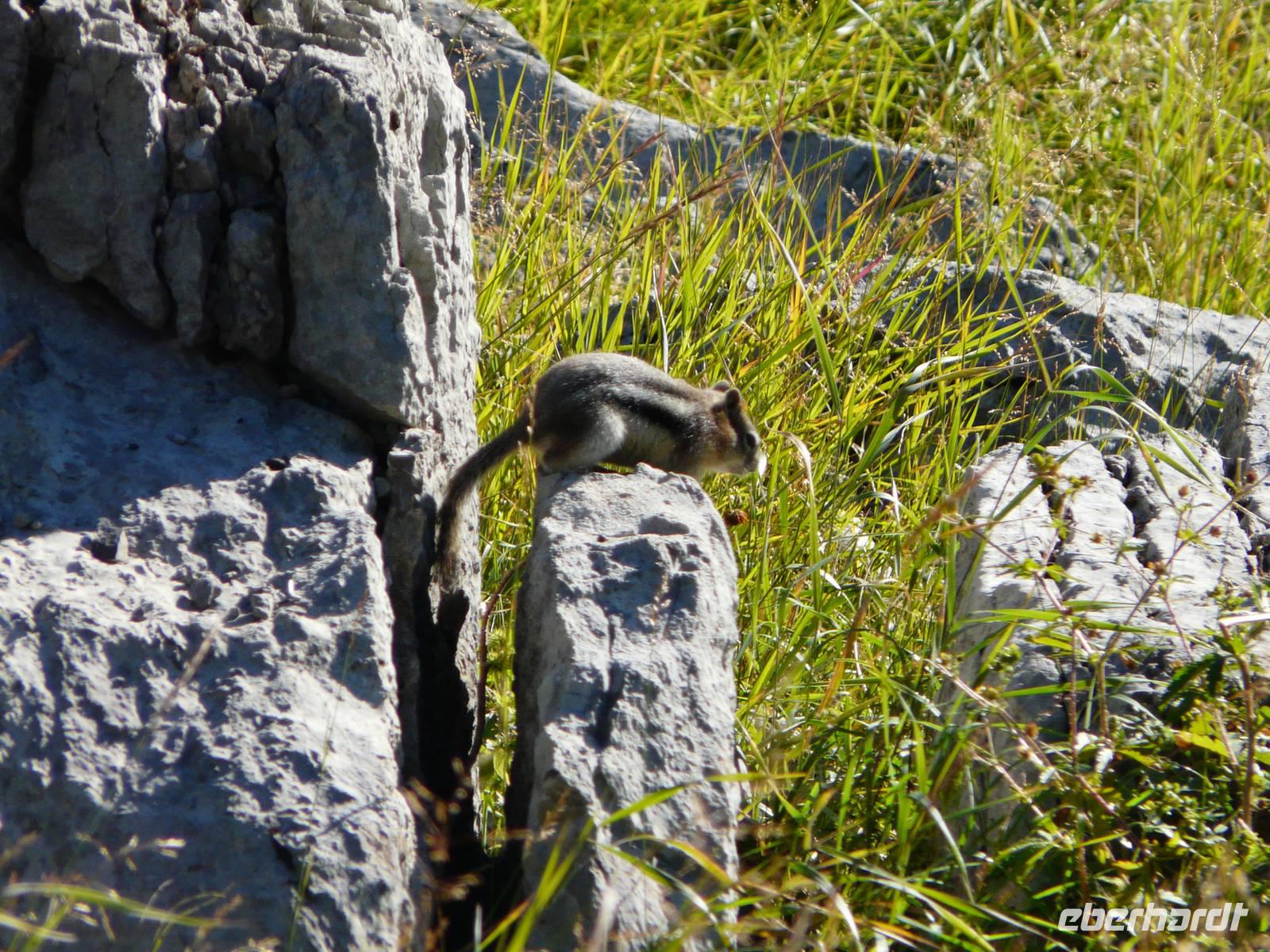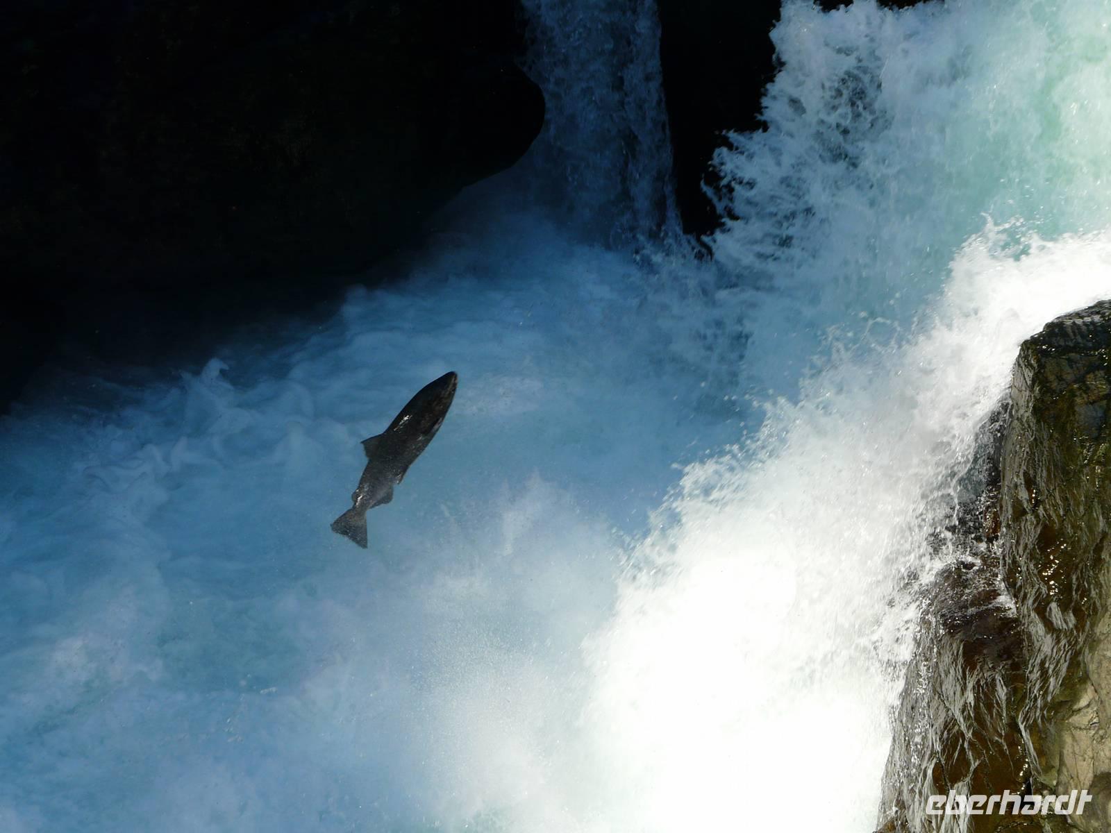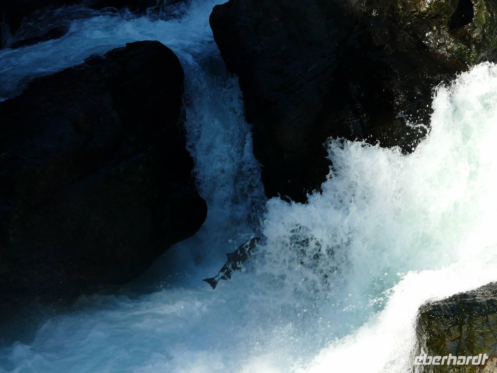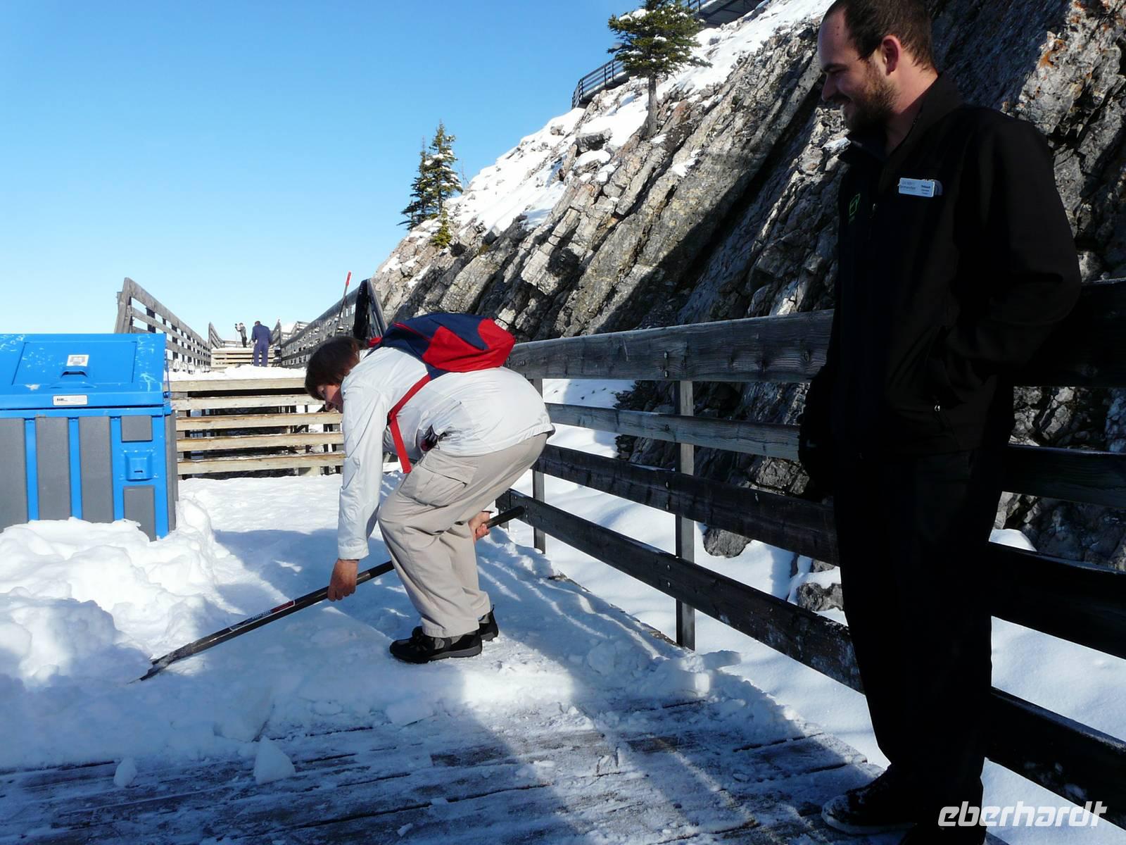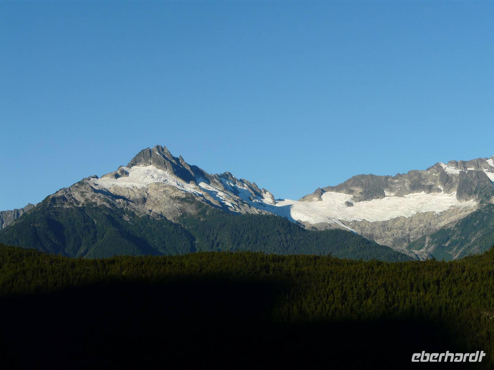 Das Frühstück verläuft heute etwas schleppen, auch der Tag begrüßt uns nicht mit dem besten Wetter. So bummeln wir am Morgen gemeinsam mit Peter etwas länger durch das Städtchen ehe wir mit der Seilbahn auf den Whistler Mountain hinauf fahren. Oben angekommen fotografieren wir uns erstmal auf den olympischen Siegertreppchen, ehe wir einen kleinen Spaziergang machen. Das Highlight folgt danach - wir fahren mit der längsten frei schwebenden Gondelbahn von Gipfel zu Gipfel, Peak-2-Peak. Mittlerweile wird das Wetter auch besser und so machen wir auf dem gegenüberliegenden Blackcomb eine tolle Wanderung, die so einige Überraschungen für uns bereit hält. Über einen schmalen Weg folgen wir Peter immer am Hang entlang, ein hölzerner Adler scheint uns den Weg zu weisen. Über große Steine und etwas Geröll steigen wir etwas auf und gehen einen schmalen Weg weiter, links und rechts wachsen flache Sträucher und Gräser. Wir sehen Murmeltiere und erleben, wie zutraulich Vögel doch sein können. Peter nimmt etwas Keks, hält seinen Arm in die Höhe und auf einmal kommen Vögel geflogen und fressen ihm aus der Hand - Whiskey Jacks. Wir machen es Peter nach und mittlerweile scheint es nicht nur ein Whiskey Jack gemerkt zu haben, dass es hier etwas zu knabbern gibt. Im wieder fliegen sie kurz auf unsere Hände, picken Keks, Cracker oder Müsliriegel um kurz darauf wieder zu verschwinden - ein einzigartiges Naturerlebnis, welches wahrscheinlich für viele von uns einmalig ist. Irgendwann machen wir uns auf den Rückweg, fahren wieder mit der Rekordseilbahn von Gipfel zu Gipfel, diesmal sogar mit Glasboden in der Gondel. Nach einem kurzen Mittagssnack an der Bergstation geht es noch kurz mit einer kleineren Seilbahn zum Gipfel des Whistler Mountain. Leider haben wir hier etwas Pech und sehen nichts als Nebel. Glücklicherweise steht uns ein riesiger Inukshuk als tolles Fotomotiv zur Verfügung, eine typisch indianische, aus Stein gemachte Figur. Wieder an der Bergstation angekommen, können wir noch etwas beobachten, wofür Whistler mittlerweile auch berühmt ist - junge Männer und Frauen, die mit Mountainbikes den Berg hinunter rasen, einfach spektakulär. Der restliche Nachmittag steht uns dann zur freien Verfügung. Glücklicherweise ist im Tal bestes Wetter und so können wir Eis essen und entspannt durch die vielen kleinen Geschäfte und Souvenirshops bummeln. Den Abend lassen wir dann in der Old Spaghetti Factory ausklingen.