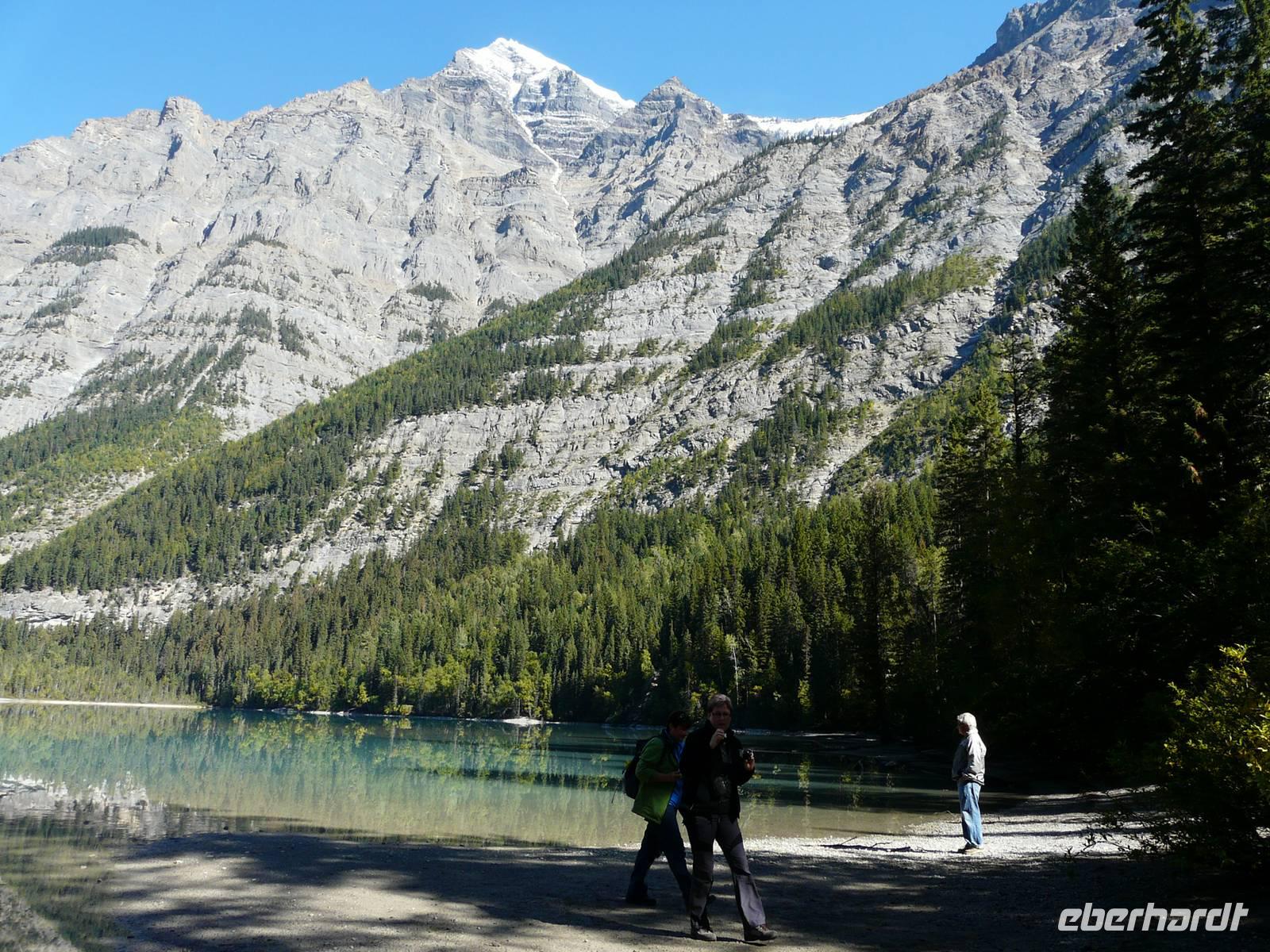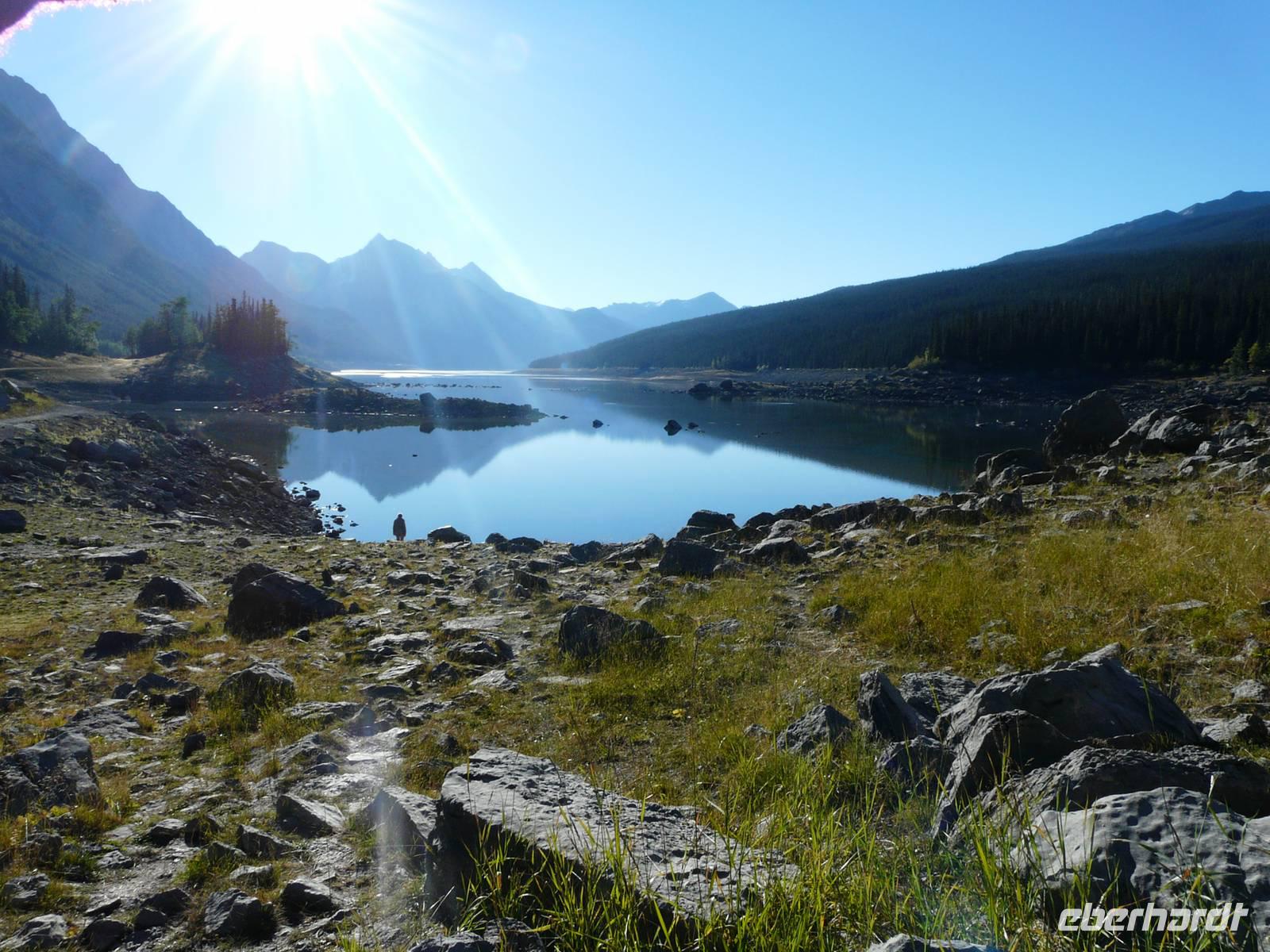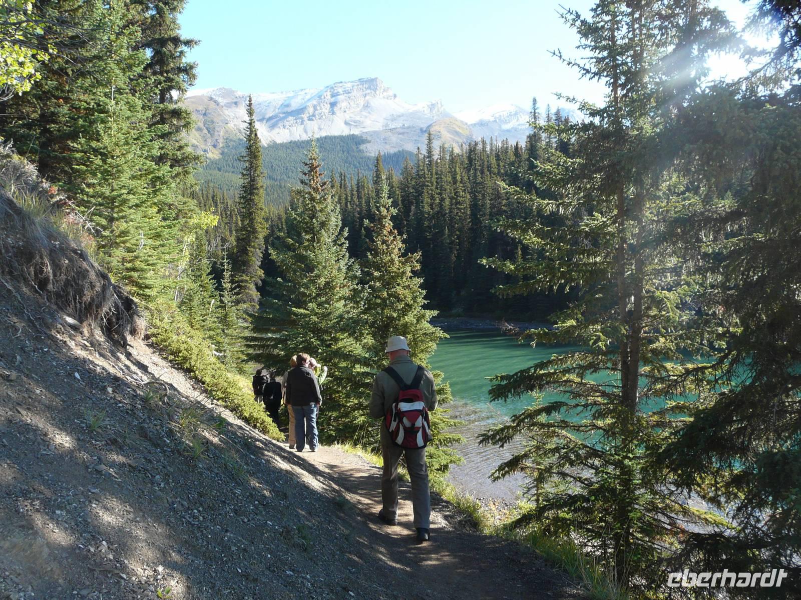 Wir haben uns heute viel vorgenommen und machen viele Programmpunkte anders als geplant. Der erste Weg des Tages führt uns erneut über den Icefield Parkway, weiter hinein in den Jasper National Park. Wir durchqueren die gleichnamige Stadt, biegen vom Highway ab und machen bei erneut schönstem Wetter den ersten Fotostopp am ..... Lake, einem See im Nationalpark, der langsam austrocknen wird und dessen Wasserstand jetzt schon bedrohlich niedrig wirkt. Weiter geht es zum Maligne Lake, wo wir unsere erste Wanderung des Tages entlang des Mary Schaffer Loops starten. Da wir auch heute wieder mit bestem Wetter gesegnet sind, können wir viele tolle Ausblicke über den See hin zu den Rockies genießen. Der Weg führt anfangs immer entlang des Ufers, ehe die Strecke dreht und wir durch den dichten Wald zurück zum Besucherzentrum gelangen. Weiter geht es zum gleichnamigen Canyon. Hier geht es quasi von Brücke zu Brücke. Den gewaltigen Canyon überspannen 6 Brücken, jede von Ihnen bietet fantastische Fotomotive. Der Nachteil - bis zu Brücke 6 geht es stetig bergab, was bedeutet, dass wir später auch alles wieder hoch gehen dürfen. Für uns als geübte Wanderer jedoch kein Problem! Und bei dieser Kulisse lässt es sich natürlich mehr als einfach laufen. Nach einem kurzen Zwischenstopp in Jasper hat Peter für uns augenzwinkernd noch einen Höhenpunkt in der Hinterhand, den er uns natürlich unbedingt zeigen muss! Wir fahren eine schmale Straße hinter Jasper hinauf, werden ordentlich im Bus durchgeschüttelt und halten schließlich bei Pyramid Island, einer kleinen Insel, die hauptsächlich von Einheimischen besucht wird und uns ein wunderschönes Panorama bietet. Jetzt wissen wir auch, woher Paramount Pictures sein Logo hat!