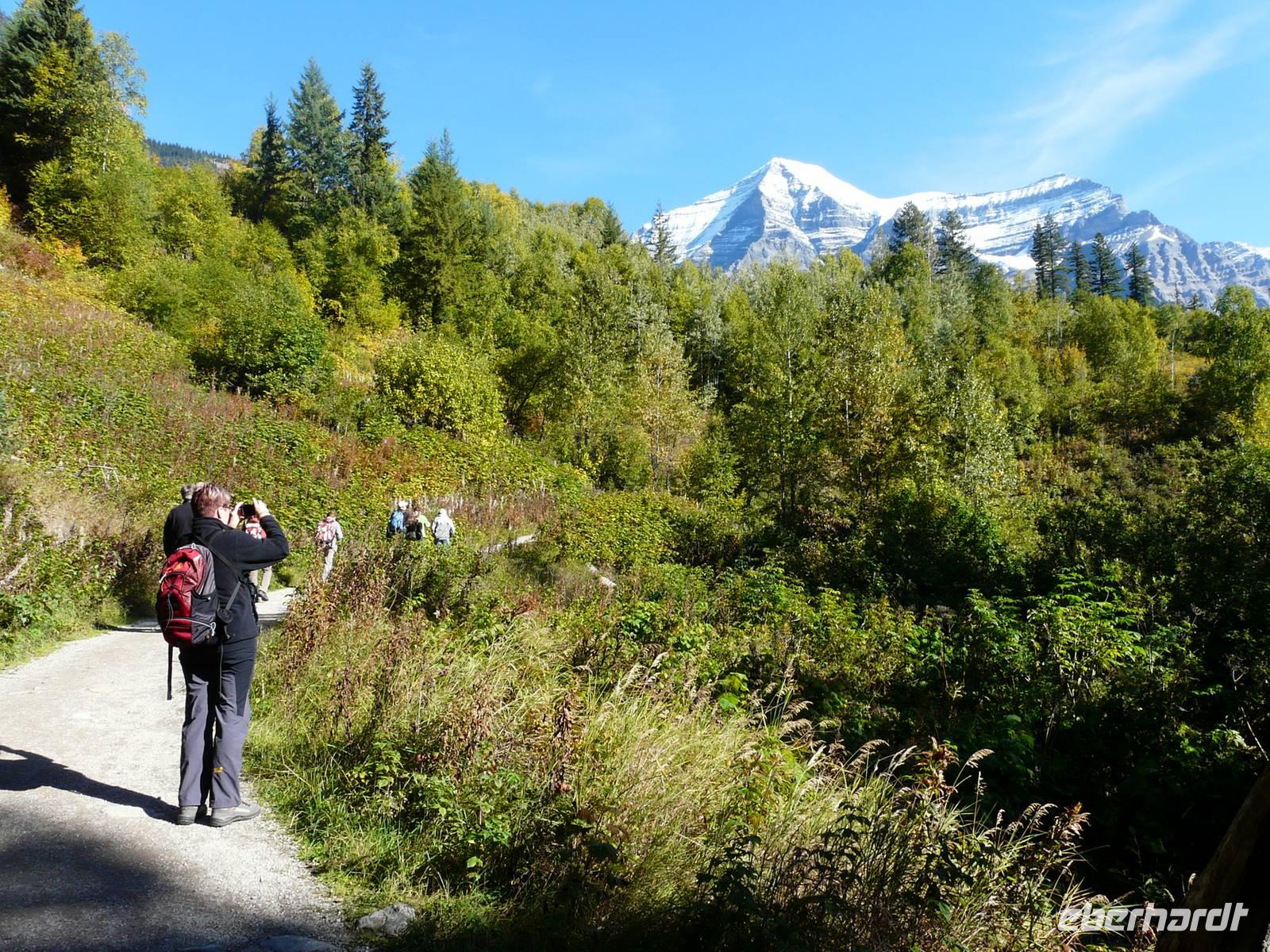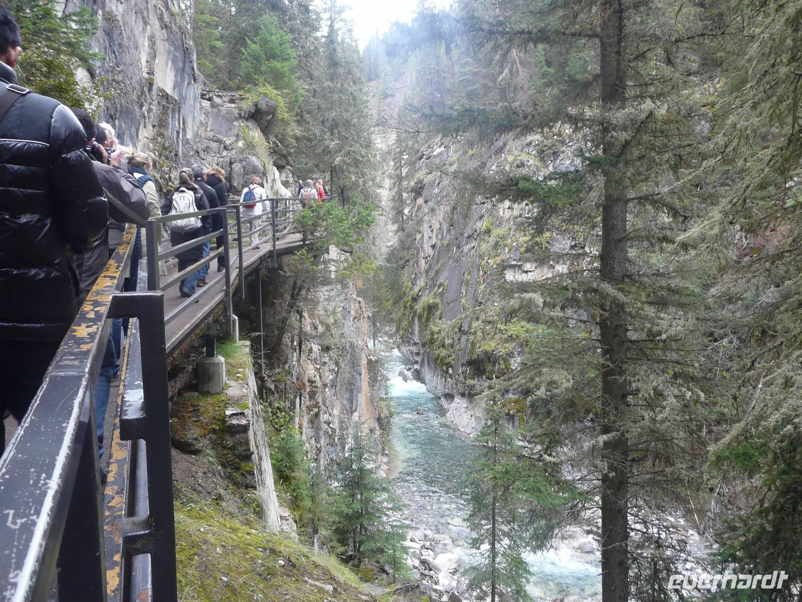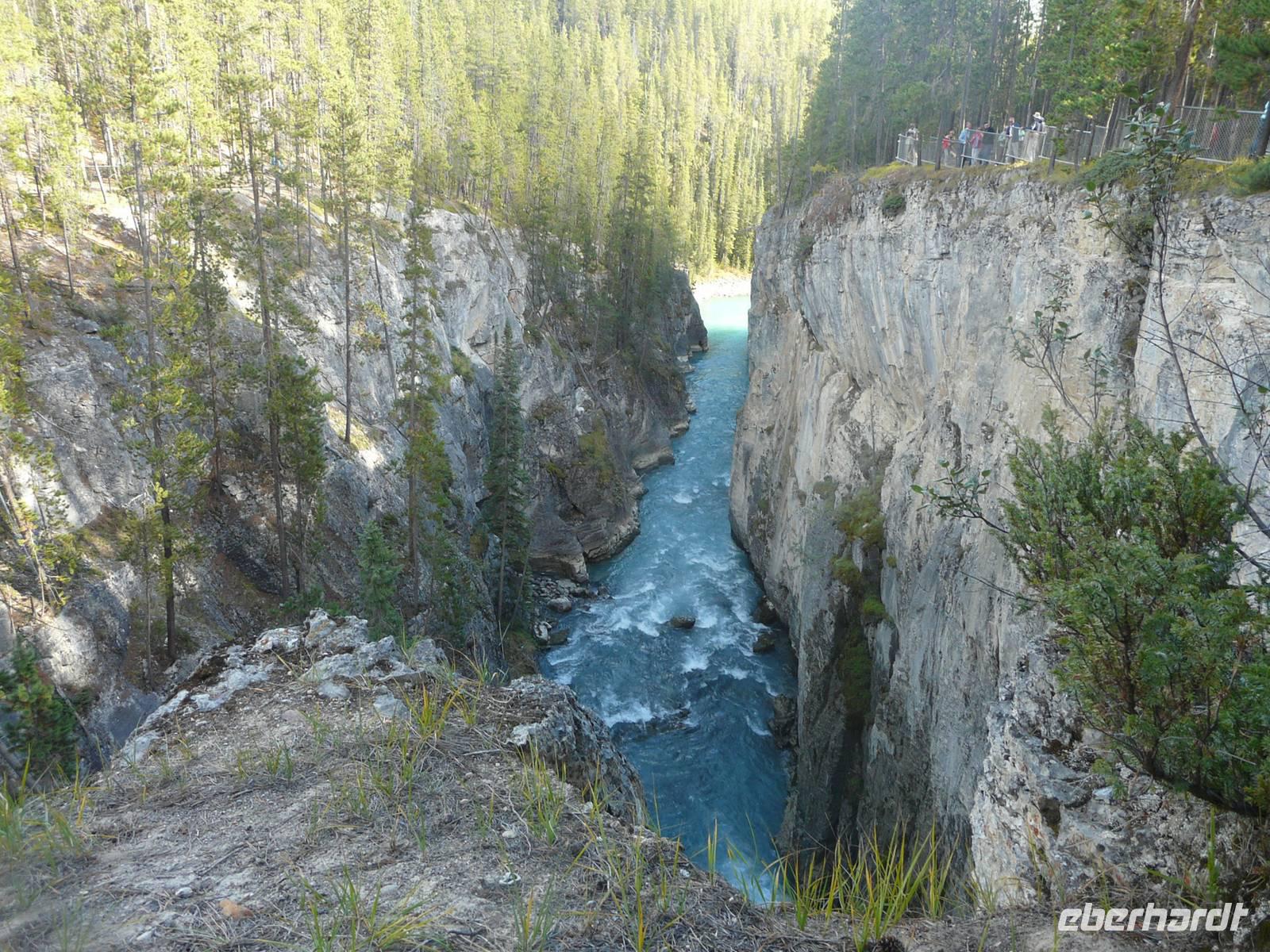Wir haben uns heute viel vorgenommen und machen viele Programmpunkte anders als geplant. Der erste Weg des Tages führt uns erneut über den Icefield Parkway, weiter hinein in den Jasper National Park. Wir durchqueren die gleichnamige Stadt, biegen vom Highway ab und machen bei erneut schönstem Wetter den ersten Fotostopp am ..... Lake, einem See im Nationalpark, der langsam austrocknen wird und dessen Wasserstand jetzt schon bedrohlich niedrig wirkt. Weiter geht es zum Maligne Lake, wo wir unsere erste Wanderung des Tages entlang des Mary Schaffer Loops starten. Da wir auch heute wieder mit bestem Wetter gesegnet sind, können wir viele tolle Ausblicke über den See hin zu den Rockies genießen. Der Weg führt anfangs immer entlang des Ufers, ehe die Strecke dreht und wir durch den dichten Wald zurück zum Besucherzentrum gelangen. Weiter geht es zum gleichnamigen Canyon. Hier geht es quasi von Brücke zu Brücke. Den gewaltigen Canyon überspannen 6 Brücken, jede von Ihnen bietet fantastische Fotomotive. Der Nachteil - bis zu Brücke 6 geht es stetig bergab, was bedeutet, dass wir später auch alles wieder hoch gehen dürfen. Für uns als geübte Wanderer jedoch kein Problem! Und bei dieser Kulisse lässt es sich natürlich mehr als einfach laufen. Nach einem kurzen Zwischenstopp in Jasper hat Peter für uns augenzwinkernd noch einen Höhenpunkt in der Hinterhand, den er uns natürlich unbedingt zeigen muss! Wir fahren eine schmale Straße hinter Jasper hinauf, werden ordentlich im Bus durchgeschüttelt und halten schließlich bei Pyramid Island, einer kleinen Insel, die hauptsächlich von Einheimischen besucht wird und uns ein wunderschönes Panorama bietet. Jetzt wissen wir auch, woher Paramount Pictures sein Logo hat!