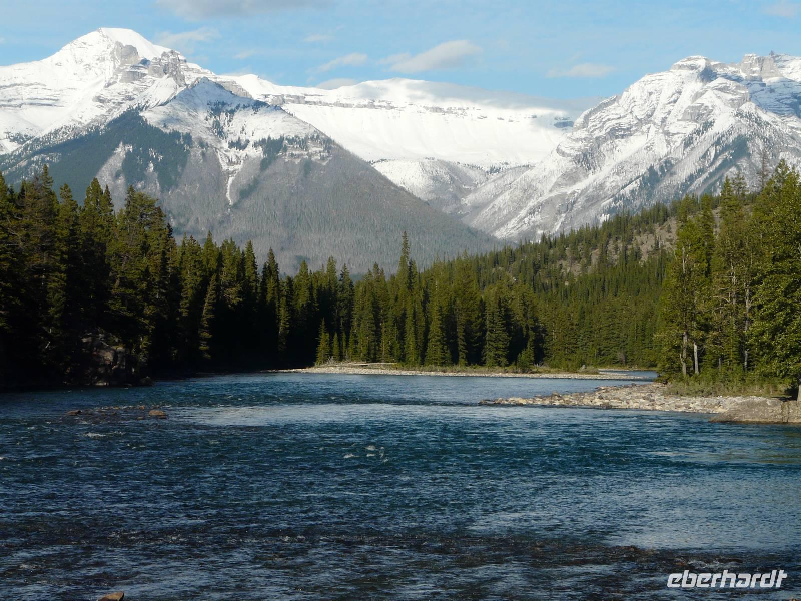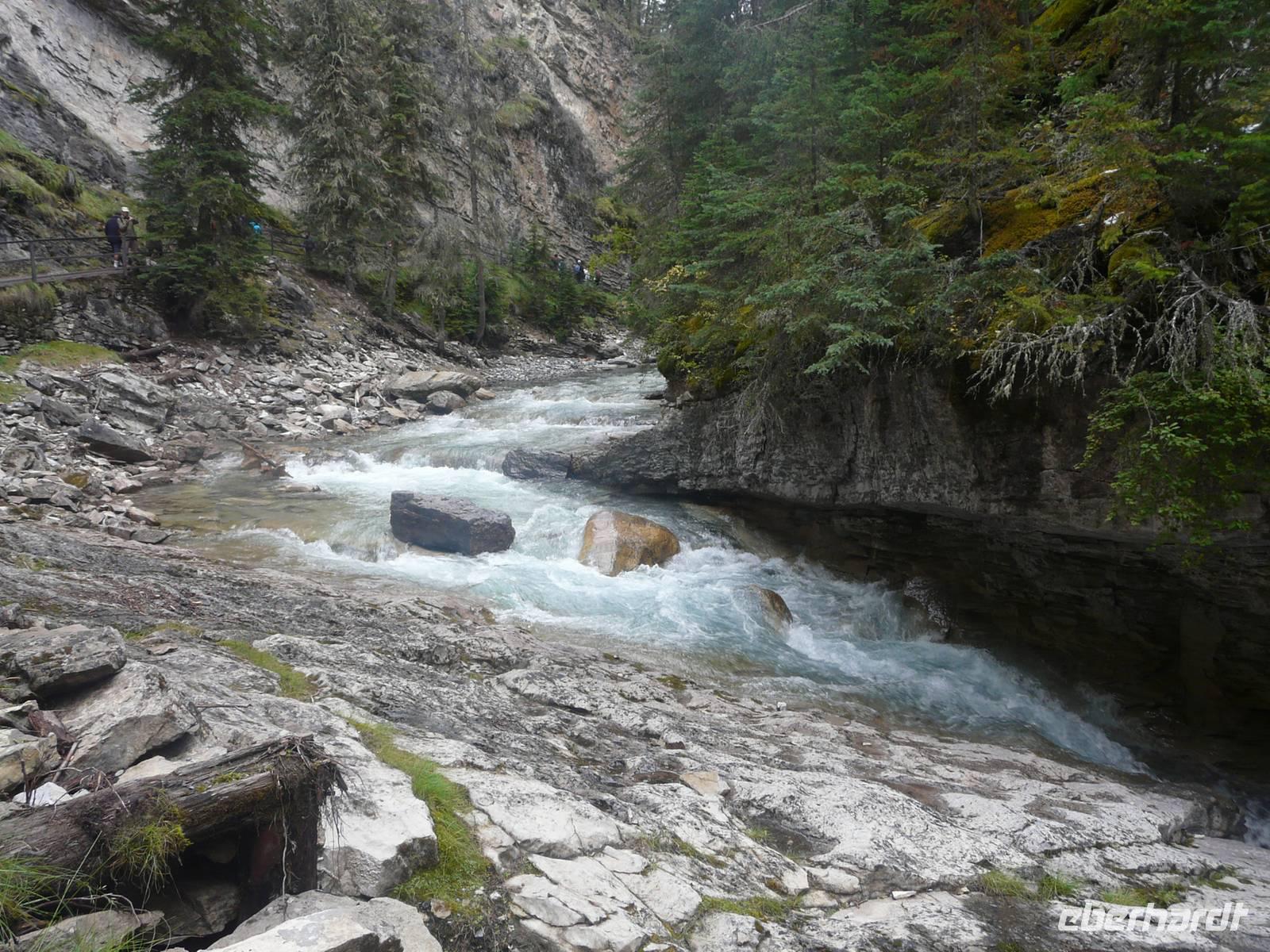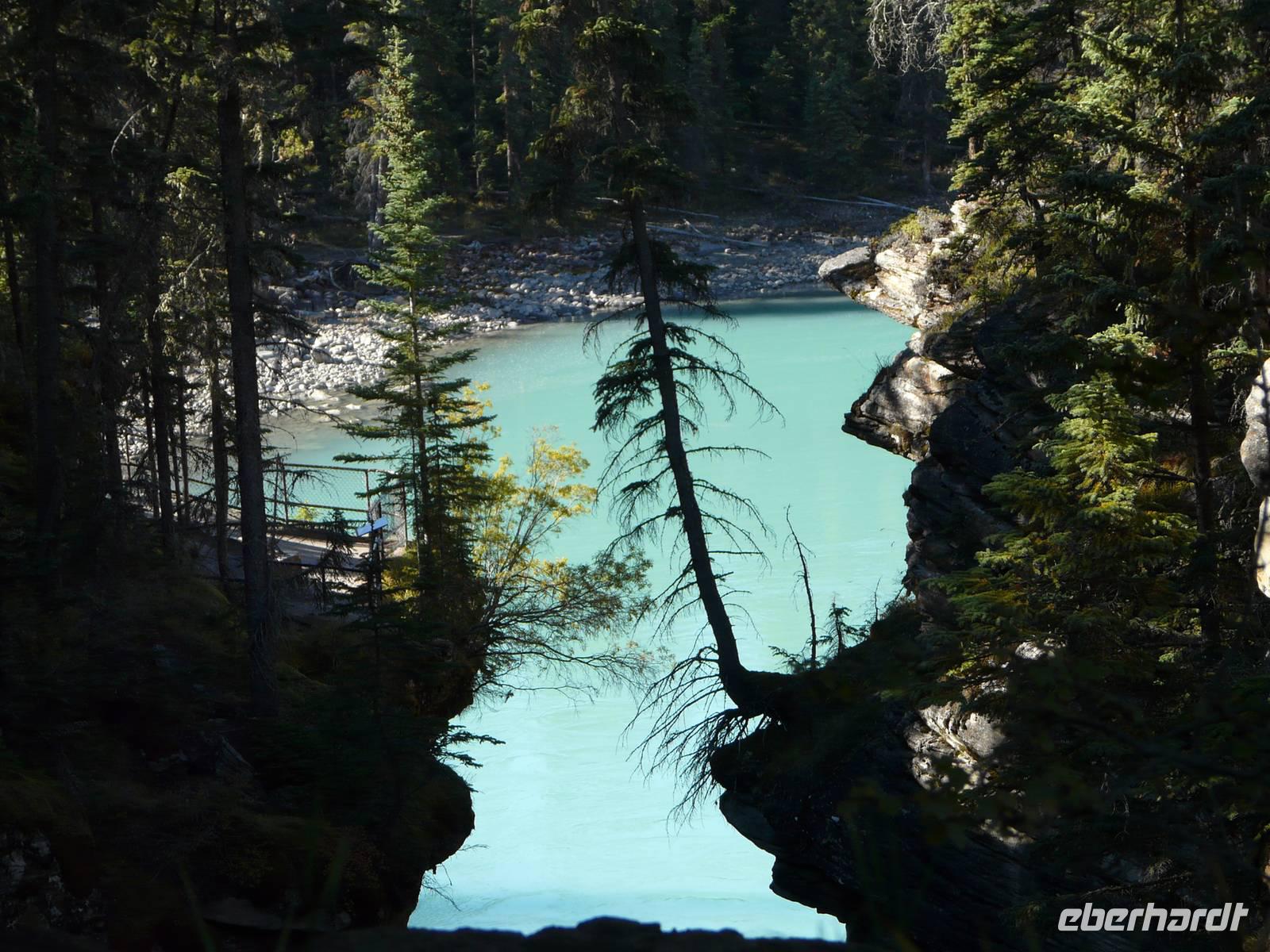 Zum Abschluss des Tages fehlen natürlich noch die Athabasca Falls. Wir fahren also langsam zurück zum Sunwapta Falls Resort und biegen nur einige Kilometer vorher rechts ab. Natürlich sind auch hier eine ganze Menge Touristen und so führt uns Peter zuerst einmal an einen ganz ruhigen Punkt, von dem aus man wunderbar alle Ecken der Falls ablaufen und fotografieren kann. Hier hat der Athabasca River noch eine ganze Menge mehr Kraft und rauscht über das ausgewaschene Flussbett in die Tiefe, ehe er als ruhiger, türkis schimmernder Fluss weiter fließt. Angekommen in der Lodge genießen wir später das Abendessen, ehe sich jeder in seinen wohlverdienten Schlaf verabschiedet.