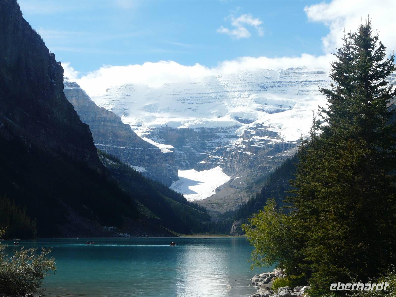 Von Clearwater aus starten wir heute zu einem Ganztagsausflug in den Wells Grey Provincial Park. Obwohl sich Clearwater direkt am Eingang zu diesem Park befindet, haben wir bis zu unserem ersten Halt doch noch ein ganzes Stück zu fahren. Nach einer abenteuerlichen Auffahrt über einen etwas besseren Waldweg halten wir an einem großen und hochgebauten Baumhaus, von wo aus wir einen tollen Rundblick über den Park haben. Nach diesem „Kodak-Moment" geht es wieder ein kurzes Stück zurück. An der Wells Grey Farm machen wir einen schnellen Stopp und sammeln den wichtigsten Mann des Tages ein. Mario, auch ein ausgewanderter Österreicher, ist heute der Mann, der uns mit den Kanus über das Wasser führen wird. Schnell packen wir auch noch für jeden eine Schwimmweste ein, ehe wir tief in den Provincial Park hineinfahren. Nach einer erneut etwas längeren Fahrt, inklusive einem Fotostopp am wunderschönen Shadow River, erreichen wir den Clearwater Lake und somit auch unsere Kanus. Mario weist uns alle ordentlich ein, jedes Kanu wird mit 2 Personen besetzt und ehe wir uns versehen, treiben wir schon alles auf dem Wasser. Aber wir haben es alle relativ schnell heraus, wie das nun funktioniert mit dem Paddeln und dem Lenken. Also haben wir genug Zeit, um die traumhafte Kulisse zu genießen, während wir ruhig über den See gleiten. Nach einer Weile legen wir an einem kleinen Sandstrand an, schließlich hat Mario noch ein Picknick für uns vorbereitet. Unsere Anlegestelle hält eine kleine Feuerstelle bereit und so können wir Bratwürste an Stöcken grillen und süße Maiskolben mit Butter genießen. Zum Glück müssen wir nach dem vielen Essen alles wieder zurück paddeln, sonst wären wir wohl alle wenig später geplatzt. Nachdem wir die Kanus alle wieder auf dem Trockenen verladen haben, geht es zurück zur Ranch, wo wir noch viel Zeit, um uns umzuschauen, ehe es erneut ein hervorragendes Barbecue in Western-Ambiente gibt. Erst am späten Abend bringt Mohsen uns wieder sicher ins Hotel nach Clearwater zurück.