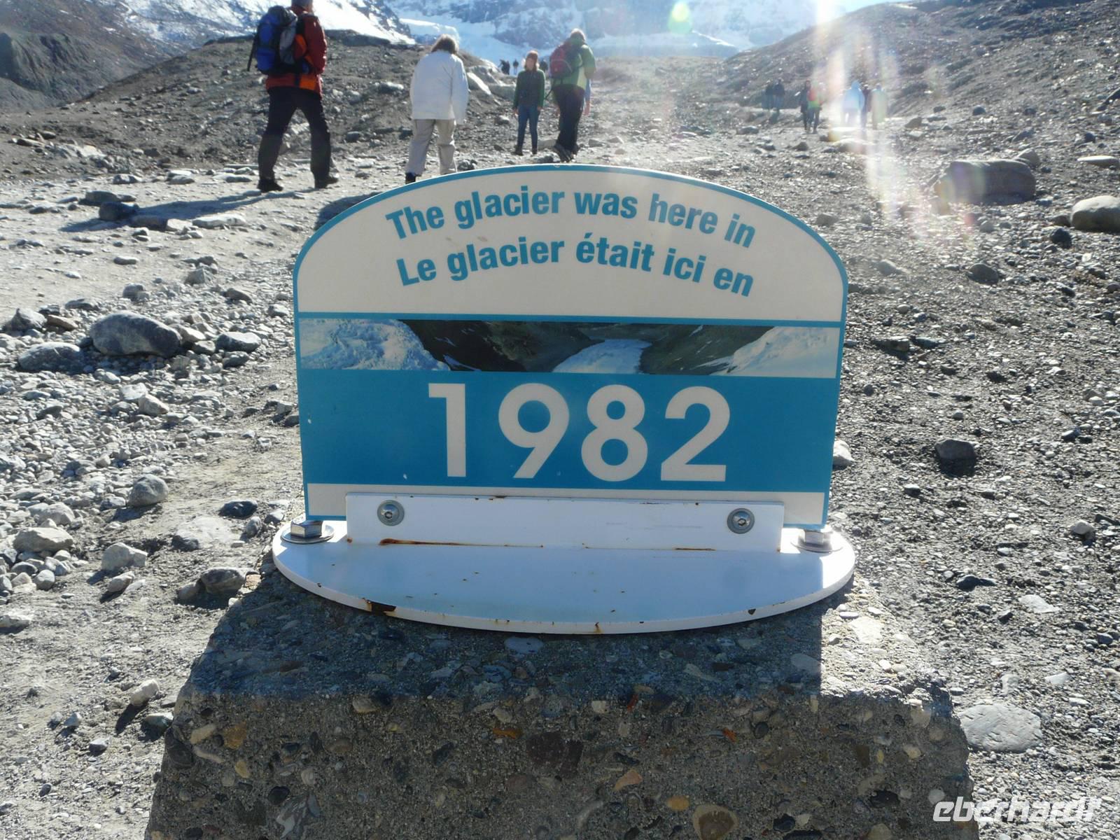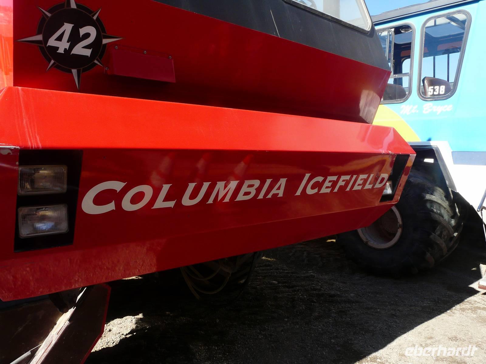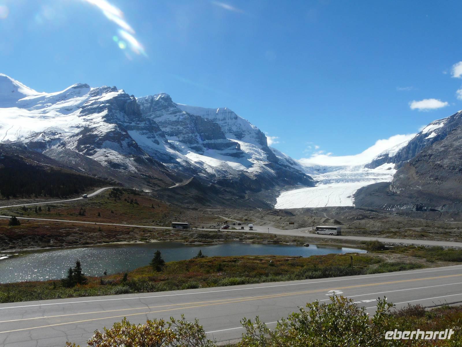 Heute verlassen wir die Gegend um Banff und den gleichnamigen Nationalpark und fahren Richtung Jasper National Park. Wir haben eine lange Tour entlang des Icefield Parkway vor uns, doch ruhig im Bus sitzen bleiben heißt das für uns nicht. Peter und Mohsen möchten uns so viel wie möglich von ihrer Heimat zeigen und so stehen heute so einige Fotostopps auf dem Programm. Erster Halt ist der Bow Lake mit dem dahinterliegenden Gletscher. Beeindruckend, wie sich die Bergwelt im Wasser des Sees spiegelt. Auch der Peyto Lake ist ein einziges Farbspiel und jede Minute des Fotostopps wert. Nach einer Pause mit viel Eiscreme und Popcorn steuern wir dann unser Tagesziel an - den Athabasca-Gletscher. Die ganze Gruppe entscheidet sich, den fakultativen Ausflug mit dem Bus und dann Unimog bis hin zur Gletscherkante zu machen. Also besorgt Peter fix die Karten und wir müssen auch gar nicht lange warten, ehe wir in den Bus steigen können. Nach ca. 10 Minuten wechseln wir dann das Fahrzeug und steigen in die riesigen Unimogs, welche uns über steile An- und Abstiege bis hin zur Kante des Athabasca-Gletschers bringt. Oben ist es dann doch etwas enttäuschend - Touristen ohne Ende. Wir nutzen die angegebenen 20 Minuten und machen ein paar Fotos. Letztendlich kommt der schönere Teil aber erst, als wir wieder unten sind. Wir wechseln kurz die Straßenseite und beginnen dann „unsere" Entdeckung des Gletschers. Wir laufen zu Fuß einen kleinen Pfad unterhalb der Gletscherkante entlang. Hier stehen überall kleine Schautafeln und auch Peter erklärt noch einige interessante Sachen zur Entstehungsgeschichte. Wir bauen noch ein paar steinerne Wegweiser, ehe wir so langsam zurück zum Bus laufen und unseren Weg entlang des Icefield Parkway fortsetzen.