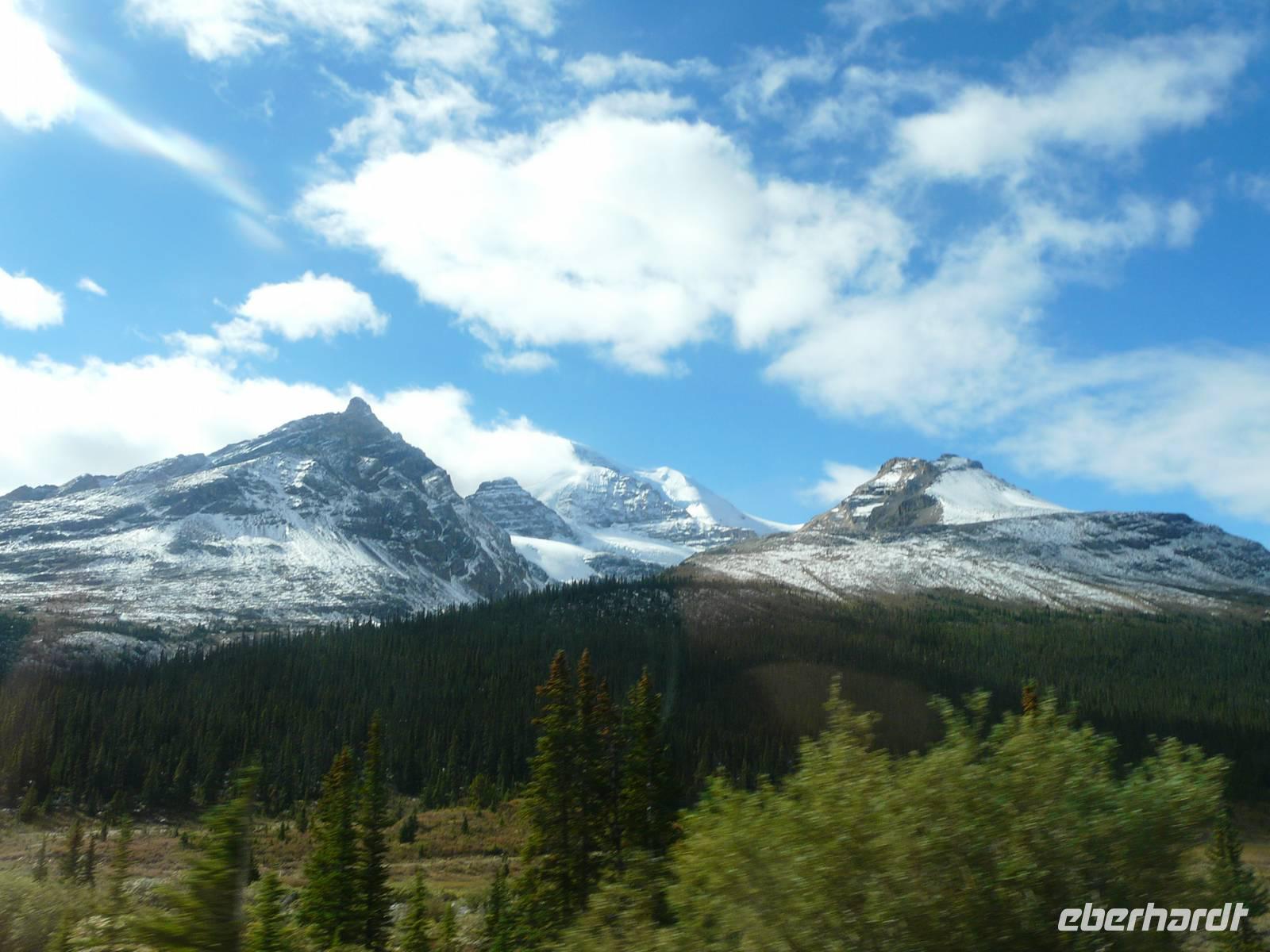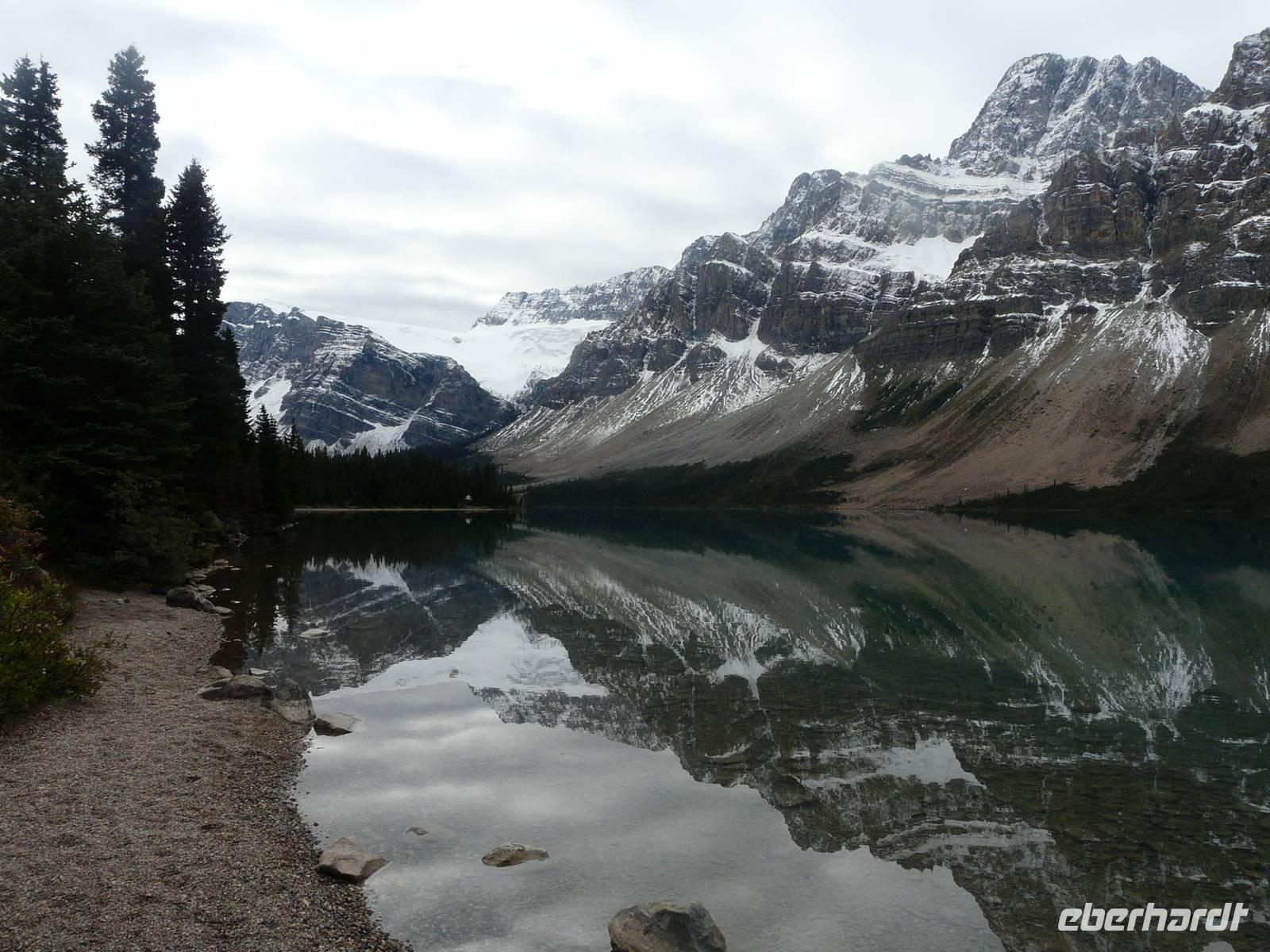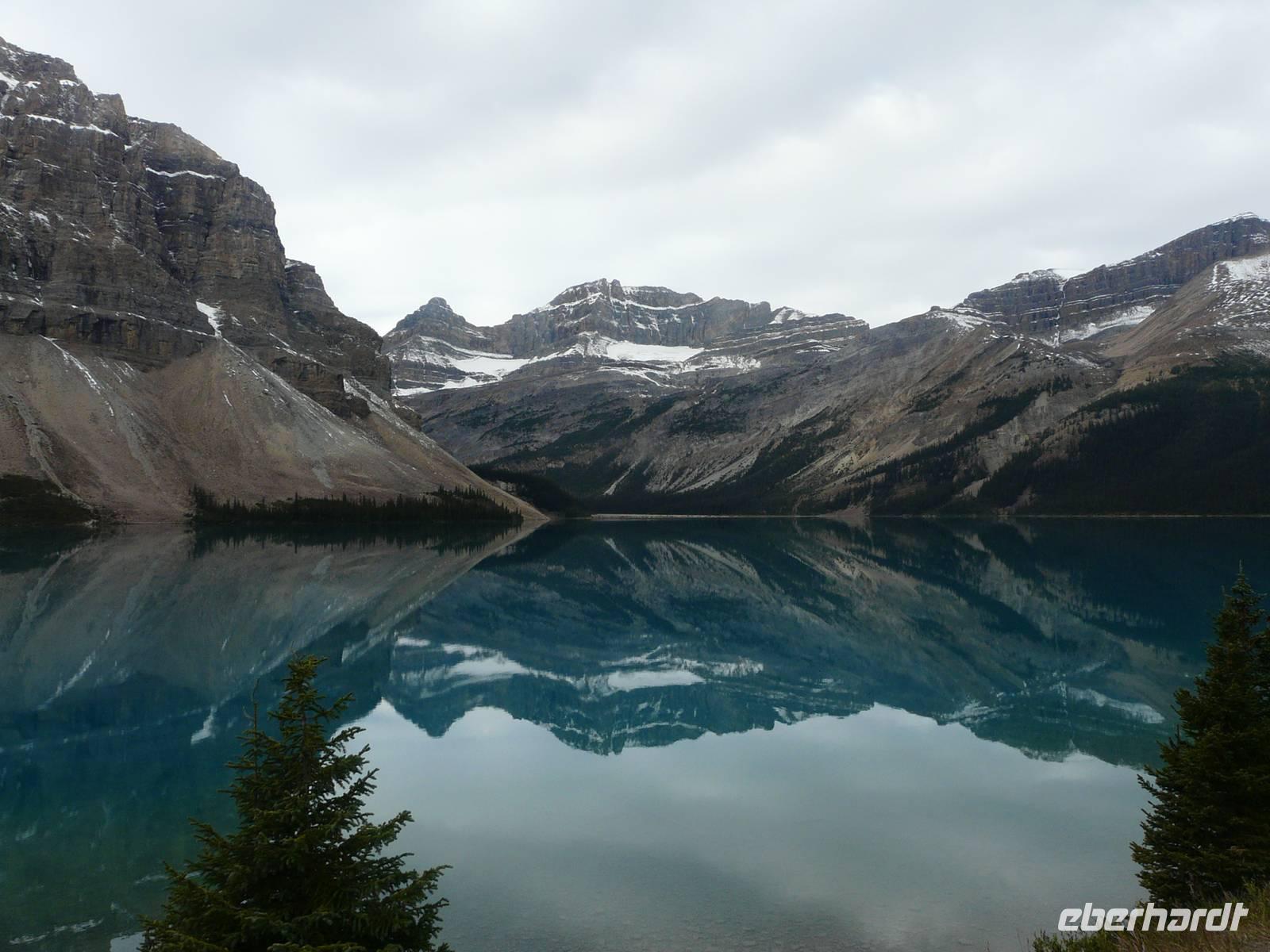 Heute verlassen wir die Gegend um Banff und den gleichnamigen Nationalpark und fahren Richtung Jasper National Park. Wir haben eine lange Tour entlang des Icefield Parkway vor uns, doch ruhig im Bus sitzen bleiben heißt das für uns nicht. Peter und Mohsen möchten uns so viel wie möglich von ihrer Heimat zeigen und so stehen heute so einige Fotostopps auf dem Programm. Erster Halt ist der Bow Lake mit dem dahinterliegenden Gletscher. Beeindruckend, wie sich die Bergwelt im Wasser des Sees spiegelt. Auch der Peyto Lake ist ein einziges Farbspiel und jede Minute des Fotostopps wert. Nach einer Pause mit viel Eiscreme und Popcorn steuern wir dann unser Tagesziel an - den Athabasca-Gletscher. Die ganze Gruppe entscheidet sich, den fakultativen Ausflug mit dem Bus und dann Unimog bis hin zur Gletscherkante zu machen. Also besorgt Peter fix die Karten und wir müssen auch gar nicht lange warten, ehe wir in den Bus steigen können. Nach ca. 10 Minuten wechseln wir dann das Fahrzeug und steigen in die riesigen Unimogs, welche uns über steile An- und Abstiege bis hin zur Kante des Athabasca-Gletschers bringt. Oben ist es dann doch etwas enttäuschend - Touristen ohne Ende. Wir nutzen die angegebenen 20 Minuten und machen ein paar Fotos. Letztendlich kommt der schönere Teil aber erst, als wir wieder unten sind. Wir wechseln kurz die Straßenseite und beginnen dann „unsere" Entdeckung des Gletschers. Wir laufen zu Fuß einen kleinen Pfad unterhalb der Gletscherkante entlang. Hier stehen überall kleine Schautafeln und auch Peter erklärt noch einige interessante Sachen zur Entstehungsgeschichte. Wir bauen noch ein paar steinerne Wegweiser, ehe wir so langsam zurück zum Bus laufen und unseren Weg entlang des Icefield Parkway fortsetzen.