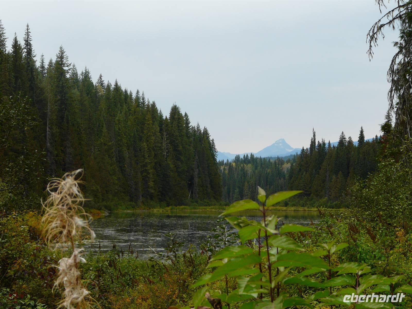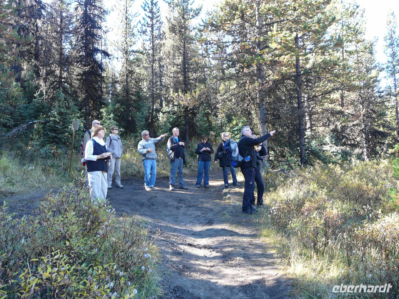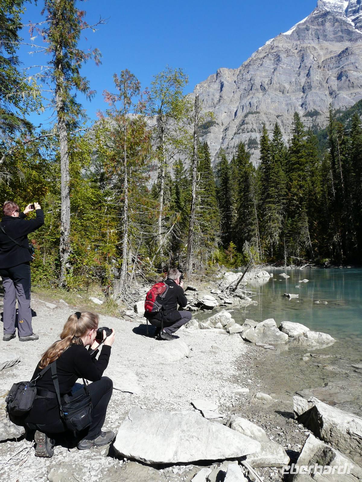 Es ist kaum zu glauben, aber auch heute scheinen wir mit traumhaftem Wetter gesegnet zu sein. Mit gepackten Koffern starten wir heute wieder zeitig, schließlich liegt ein langer Weg vor uns. Wir verlassen Alberta und fahren erstmals in die Provinz British Columbia. Am Übergang, welcher auch gleichzeitig der Eintritt in den Mount Robson National Park ist, haben wir einen „Kodak-Moment" (wie Peter Fotostopps zu bezeichnen pflegt). Der einsam gelegene See am Übergang bietet uns aber auch wieder ein traumhaftes Motiv. Die Bergwelt spiegelt sich einzigartig in dem ruhig liegenden See - wunderschön! Weiter geht es dann bis zum Besucherzentrum des Nationalparks. Nach einem kurzen Stopp bringen uns Mohsen und Peter an den Anfang des Berg Lake Trail, unserem heutigen Wanderweg, der bis zum Kinney Lake und sogar noch weiter führt. Wir starten und laufen anfangs immer parallel zum Robson River, welcher uns tosend entgegenkommt. Der Waldweg ist immer noch feucht und weist auf die letzten kalten und nassen Tage der Region hin. Überall am Wegesrand sehen wir Pilze und Flechten, auch Zedern haben hier einen guten Standort. Der Trail führt größtenteils bergan und wir scheinen fast allein zu sein. Nur ab und an kommen uns Wanderer, die wahrscheinlich am See übernachtet haben, entgegen. Wir nutzen den Sonnenschein immer wieder für tolle Motive mit dem Robson River als Hauptdarsteller, das Schimmern ist einfach zu schön. Doch das Beste kommt noch. Angekommen am Kinney Lake bietet sich uns ein atemberaubendes Panorama. Das komplette Bergmassiv rund um den Mount Robson spiegelt sich im See. Ganz sauber kann man einzelne Konturen und auch die schneebedeckten Gipfel der Berge erkennen! Traumhaft schön und eigentlich kaum in Worte zu fassen. Wir verweilen lange, genießen den Ausblick und testen mit unseren Händen die eiskalte Wassertemperatur - zum Baden hatte anscheinend niemand Lust ;-) ?! So langsam machen wir uns aber dann doch auf den Rückweg, schließlich wartet noch die lange Fahrt nach Clearwater auf uns. Nachdem wir in Valemont vergeblich nach den ersten Lachsen Ausschau gehalten haben, wartet nun unerwartet die kanadische Bürokratie und Willkür auf uns. Bei einer allgemeinen Verkehrskontrolle werden wir herausgewunken. Die Officer checken den Bus mehrmals bis auf's kleinste Detail - so lange es der Sicherheit dient, ist dies natürlich völlig in Ordnung. Als wir dann aber wegen eines Blinkers, der zu schwach blinkt zurück fahren müssen und die nächste Werkstatt aufsuchen müssen, ist dann nicht mehr in Ordnung. Auch Mohsen ist merklich not amused. So verlieren insgesamt 1,5 Stunden. Zurück aus der Werkstatt also erneut vorbei an der Kontrolle, die uns diesmal eher desinteressiert durchwinkt. Dass dieses ganze Hin und Her dann doch von Vorteil war, kann zu diesem Moment niemand ahnen. Denn 10 Minuten später sichten wir ihn - den ersten echten Bären unserer Reise! Vom Bus aus versucht nun jeder die besten Fotos zu schießen oder genießt einfach nur den Anblick des jungen Schwarzbären. Dass wir schon so zeitig unseren Bären sehen, hätte wohl gerade heute niemand gedacht!