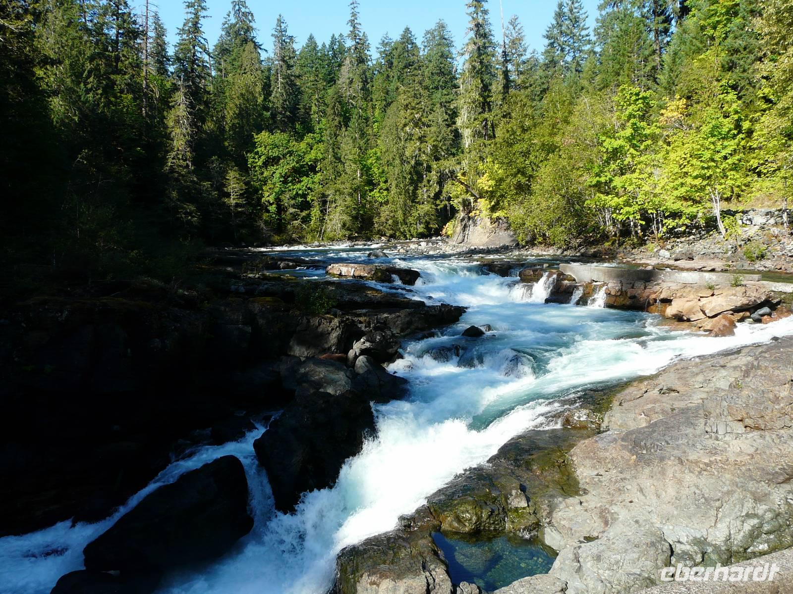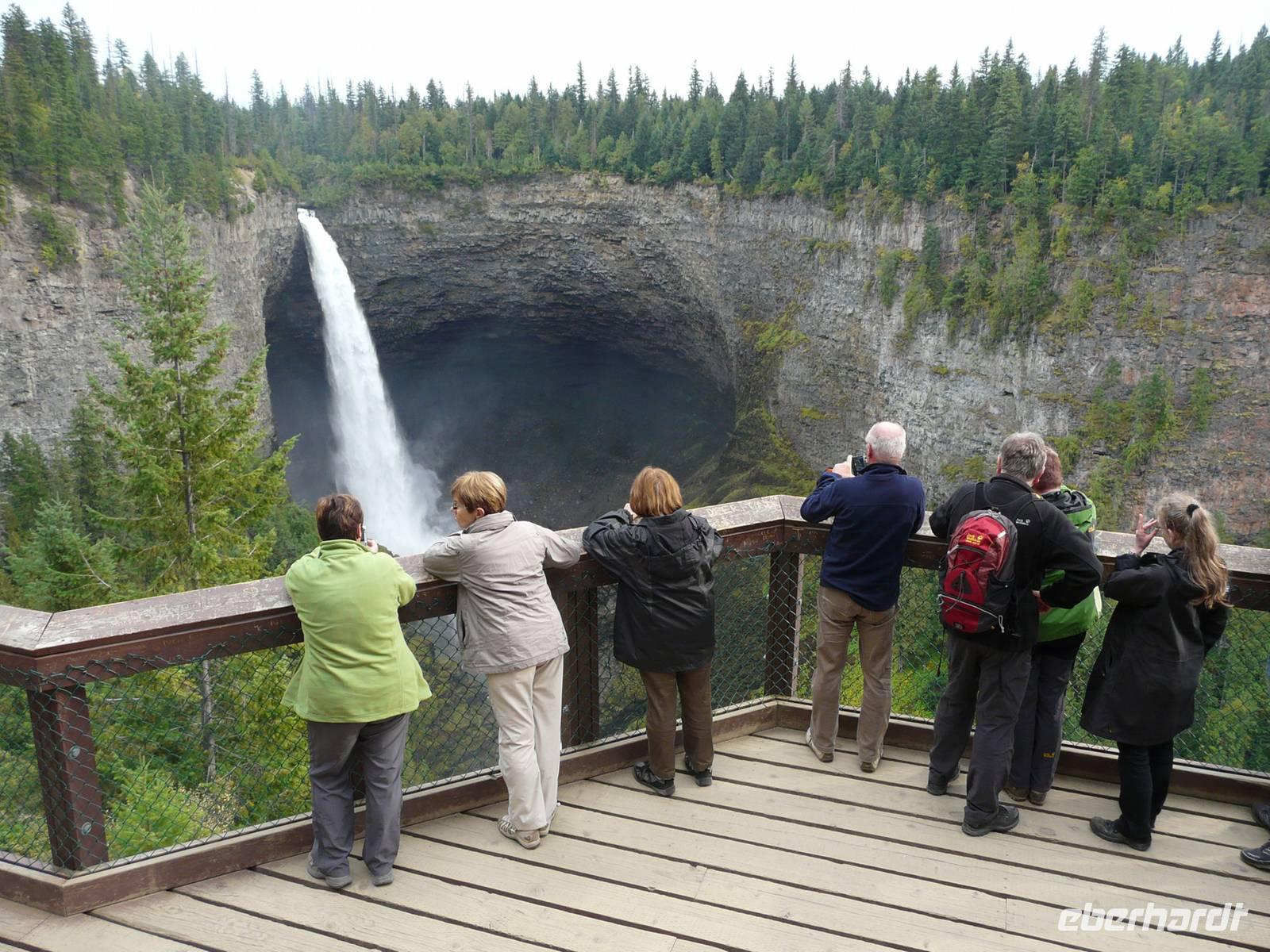 Heute liegt eine lange Fahrt vor uns. Der Weg bis zur Olympiastadt Whistler ist über 400 Kilometer lang und so richten wir uns auf einen ruhigen Tag ein. Über die Duffy Lake Road fahren wir viele Kilometer, machen unseren ersten Halt in Kamloops und wenig später einen Fotostopp am Golden River. Unterwegs sehen wir mehrmals kilometerlange (!) Züge, welche die Rockies und die Westküste jeweils versorgen und vor allem Holz zum Weitertransport an die Küste bringen. Wir durchqueren Indianerland und hinter Cache Creek wartet dann auch unser heutiges Tageshighlight. Die Hat Creek Ranch wurde früher oft von Handelsreisenden auf Pferd und Kutsche angefahren, vieles hier ist noch im Originalzustand. Und so beginnen wir unsere Besichtigung auch nicht zu Fuß sondern in einer alten Kutsche, gezogen von zwei Pferden. Der erste Halt ist die alte Herberge mit Saloon, urig eingerichteten Zimmern und Tapete, die von den Wänden abblättert. Ein Herr mit Brille und Melone auf dem Kopf führt uns durch das Holzgebäude. Wenig später fahren wir weiter mit der Kutsche, diesmal, um uns die Lebensweise der Indianer besser anzusehen. Raven, eine junge Indianerin, erklärt uns die Bauweise alter Indianerunterkünfte, wie sie Tiere gefangen, Feuer und Essen gemacht haben. Sogar eine indianische Sauna können wir bestaunen. Nach einem kurzen Besuch beim Schmied, wo der ein oder andere von uns noch einen Glücksnagel ergattert, laufen wir zurück ins Haupthaus, wo ein ausgiebiges Mittagessen auf uns wartet. Auf unseren weiteren Fahrt nach Whistler machen wir hier und da noch einen Fotostopp und Peter erzählt uns schon viel über die Stadt und ihre Geschichte, schließlich arbeitet er hier im Winter als Skilehrer und betrachtet den Wintersportort quasi als sein zweites Zuhause. Wir durchqueren Pemberton und erreichen zum späten Nachmittag die Olympiastadt. Später bummeln wir noch etwas durch die Fußgängerzone, fotografieren die olympischen Ringe und gehen zum Abendessen ins kanadische Brauhaus - das Grizzly-Bier gehört zu den besten Bieren, die wir während der Reise trinken werden!