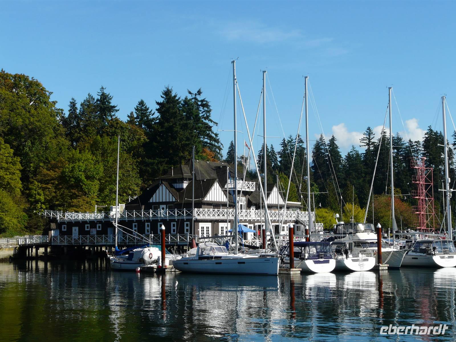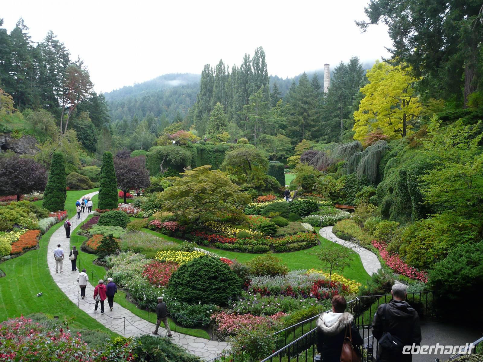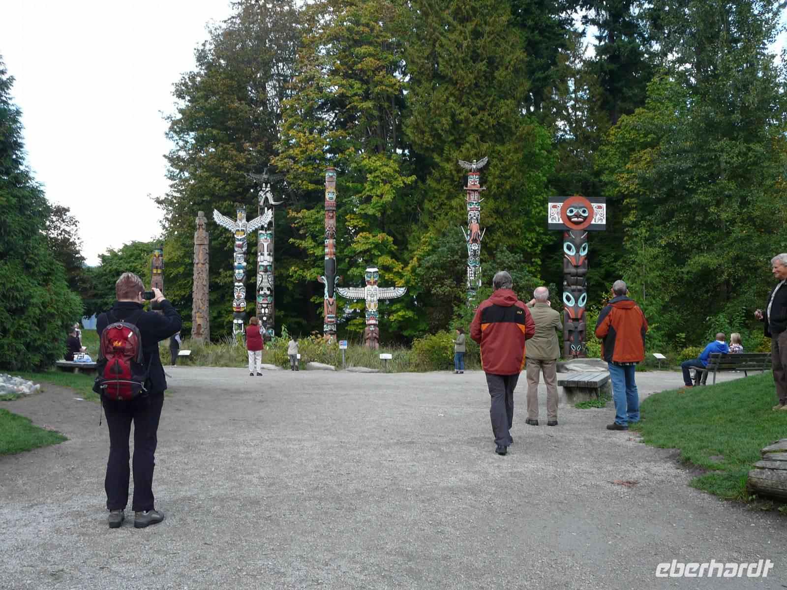 Wir verlassen Victoria, aber noch nicht Vancouver Island. Bevor die Fähre auf das Festland nehmen, machen wir noch einen Ausflug nach Butchart Gardens. Diese kleine Oase im englischen Gartenstil wurde von einer reichen Dame in einem alten Kalksteinbruch angelegt und zeigt uns eine Blumenpracht sondergleichen. Wir laufen durch die riesige Anlage, in der es nahezu alle erdenklichen Blumenarten in reicher Farbenpracht zu geben scheint. Wir sehen erneut die mächtigen Sequoja-Riesenbäume, durchqueren einen Rosengarten mit unendlich vielen Arten und finden uns wenig später in einem japanischen Garten wieder. Eher ungünstig erscheint es dann aber leider, dass hier auch noch Mittagessen für uns geplant ist. Zu zeitig und eher im Cafeteria-Stil essen wir im Blue Poppy Restaurant und hätten die Zeit doch viel lieber für weitere Erkundungen im Garten gehabt. Doch wir müssen unsere Fähre gen Vancouver erreichen und so lässt die Zeitplanung am Morgen keine Verzögerung zu. So sehen wir uns wenig später erneut im Bus sitzen und fahren nach Swartz Bay, von wo aus die Fähre nach Vancouver geht. Wer hier dem schlechten Wetter trotzt und während der Überfahrt auf dem Oberdeck ist, sieht nun sogar noch mal Wale!!! Tsawwassan, die indianische Hafenstadt vor Vancouver erstrahlt dann in schönstem Sonnenschein und wir scheinen endlich die Schlechtwettertage überwunden zu haben. Der Weg hinein nach Vancouver dauert dann trotzdem noch über eine Stunde, gerade am Verkehr merken wir nun, dass wir in der Metropole angekommen sind. Der erste Halt ist in Granville, dem Alternativ- und Künstlerviertel der Stadt. Am Hafen gelegen wurden hier aus alten Fabriken Ateliers, Cafés und eine bunte Markthalle gemacht. Die Stadtrundfahrt führt uns weiter nach Chinatown, bevor wir in Gastown aussteigen und weiter zu Fuß auf Erkundungstour begeben. Pünktlich um fünf Uhr stehen wir dann auch an der alten Dampfuhr, die dann ordentlich lospfeift. Vorbei am Olympic Plaza genießen wir die Meeresluft, beobachten wie Wasserflugzeuge starten und landen und blicken hinüber nach Grouse Mountain, unserem morgigen Tagesziel. Mit dem Bus fahren wir weiter zum Stanley Park, einer kleinen Halbinsel, von welcher wir einen traumhaften Blick auf Vancouver Downtown haben. Hier sehen wir nun auch eine Vielzahl indianischer Totempfähle, die uns Peter als alternative für Duncan versprochen hatte. Und er hatte recht. Diese hier sind wunderschön, farbenfroh und sehr gut erhalten. Nachdem wir auch hier noch etwas verweilen, geht es langsam zu unserem zentral gelegenen Hotel, von wo aus wir später nur einen kurzen Weg zum Abendessen haben.