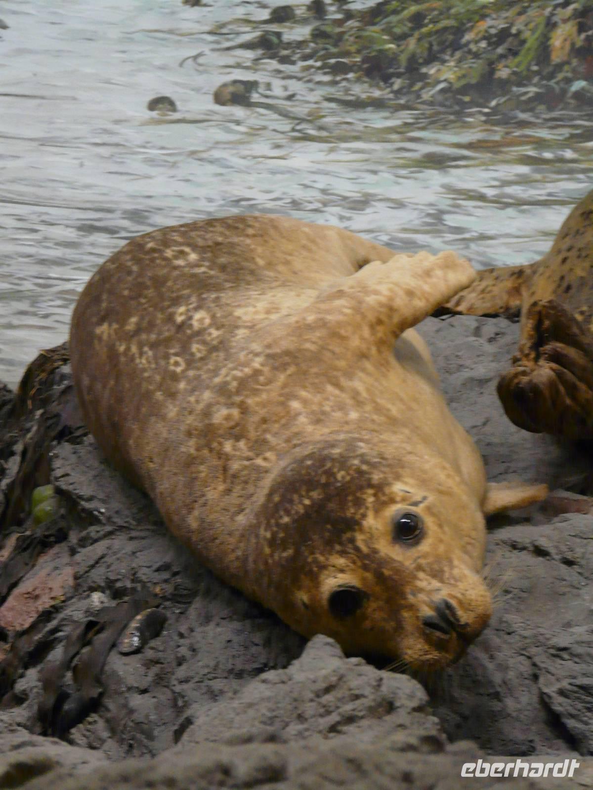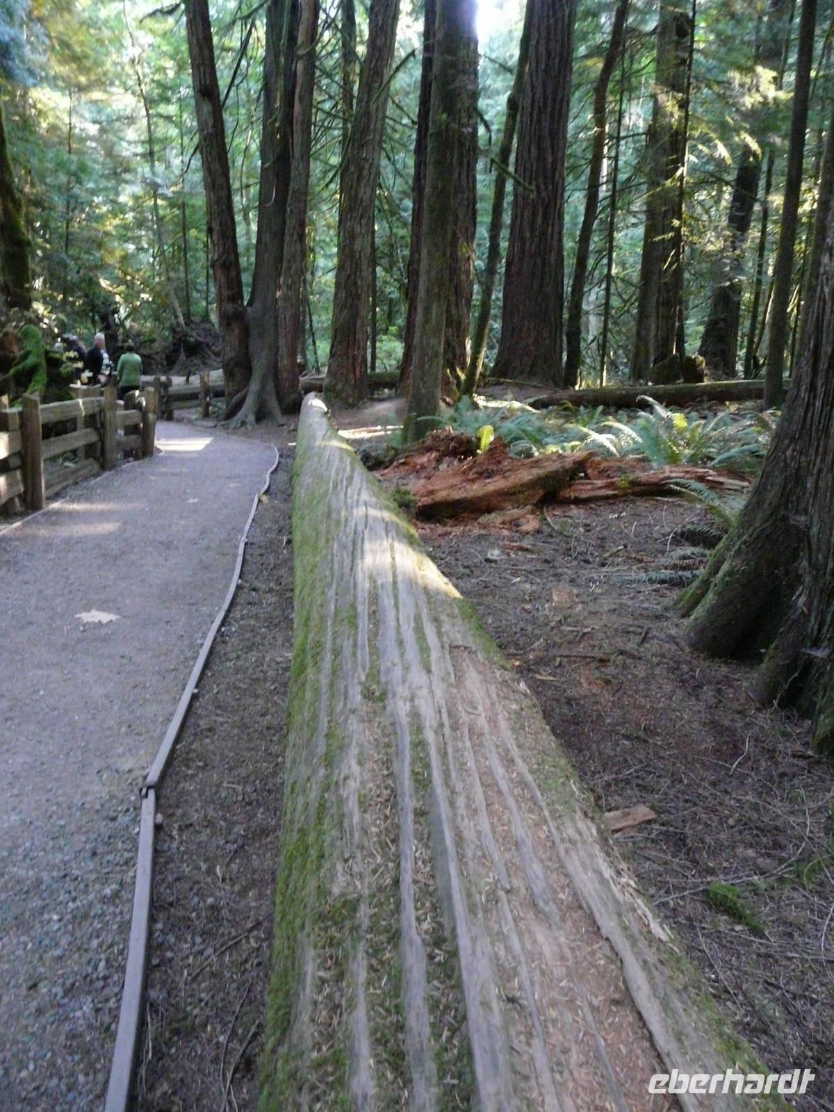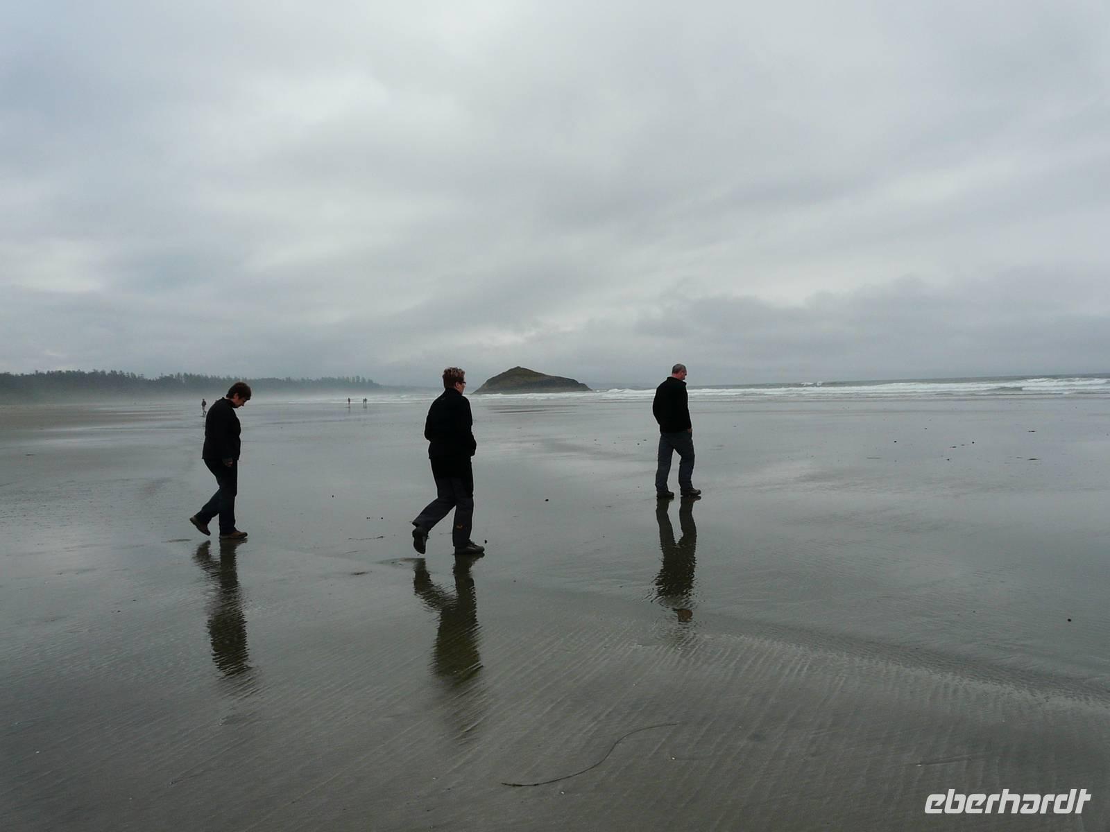 Der heutige Tag steht ganz im Zeichen von Vancouver Island, schließlich liegt unser Tagesziel auf dem westlichen Ende der Insel, in Tofino. Doch unser erster Halt wird das Beste am ganzen Tag sein. Nach zirka einer Stunde Fahrt halten wir im Pacific Rim Nationalpark, genauer gesagt bei den riesigen Bäumen in Cathedral Grove. In der Kühle des Morgens schimmern die Sonnenstrahlen nur ab und zu durch das hohe und dichte Blattwerk dieser jahrhunderte alten Sequoja-Trees. Wir genießen alle die Ruhe und den Weg vorbei an Bäumen, deren Stämme so breit wie die Herren aus unserer Gruppe hoch sind (ausgenommen Peter ;-) ). Hätten wir nicht noch einen so langen Weg vor uns, wären wir sicher gern alle noch länger an diesem wunderschönen Ort geblieben. Doch auf unserem Programm steht Tofino und so steigen wir wieder in den Bus und durchqueren die Insel einmal von West nach Ost. Angekommen in dem kleinen Fischerdörfchen sind wir dann doch etwas enttäuscht, schließlich gibt es hier außer Surfer-Läden, einen Supermarkt und einem verschlafenen Hafen nicht wirklich etwas zu sehen. Schade um die lange Anfahrtszeit. Auf dem Rückweg machen wir einen kurzen Stopp am Wikkaninnish Besucherzentrum, doch der Nebel verwährt uns den Blick über den Regenwald. Wir bessern unsere Laune mit kanadischem Whiskey auf (versetzt mit Ahornsirup - sehr lecker!). Unser nächster Halt führt uns direkt an die Küste des Pazifiks. Long Beach macht seinem Namen alle Ehre, vor uns erstreckt sich ein schier endloser Strand, welcher trotz des schlechten Wetters von einigen Surfern aber nur wenigen Spaziergängern bevölkert wird. Wir laufen gemütlich dem Wasser entgegen, aufgrund der vorherrschenden Ebbe auch wieder ein kleiner Weg und so kann uns Peter auch kleine und größere Lebewesen des Meeres zeigen, die aufgrund der Ebbe im Sand gestrandet sind. Das Wetter wird nicht besser, es ist diesig und ungemütlich, der Wind lässt die gefühlte Temperaturen sinken und so fahren wir schon bald wieder zurück ins Hotel nach Parksville, wo schon das Abendbrot auf uns wartet.