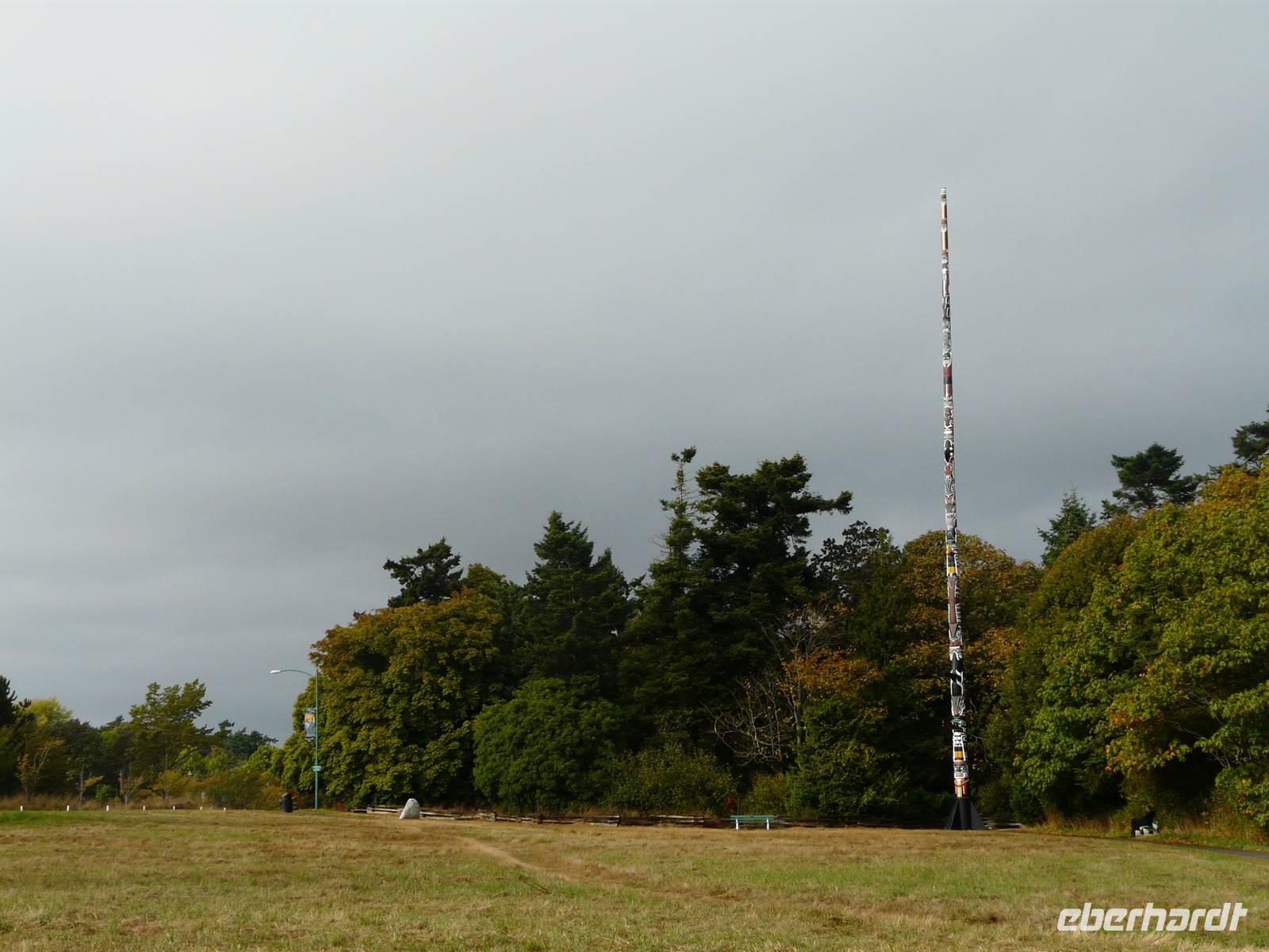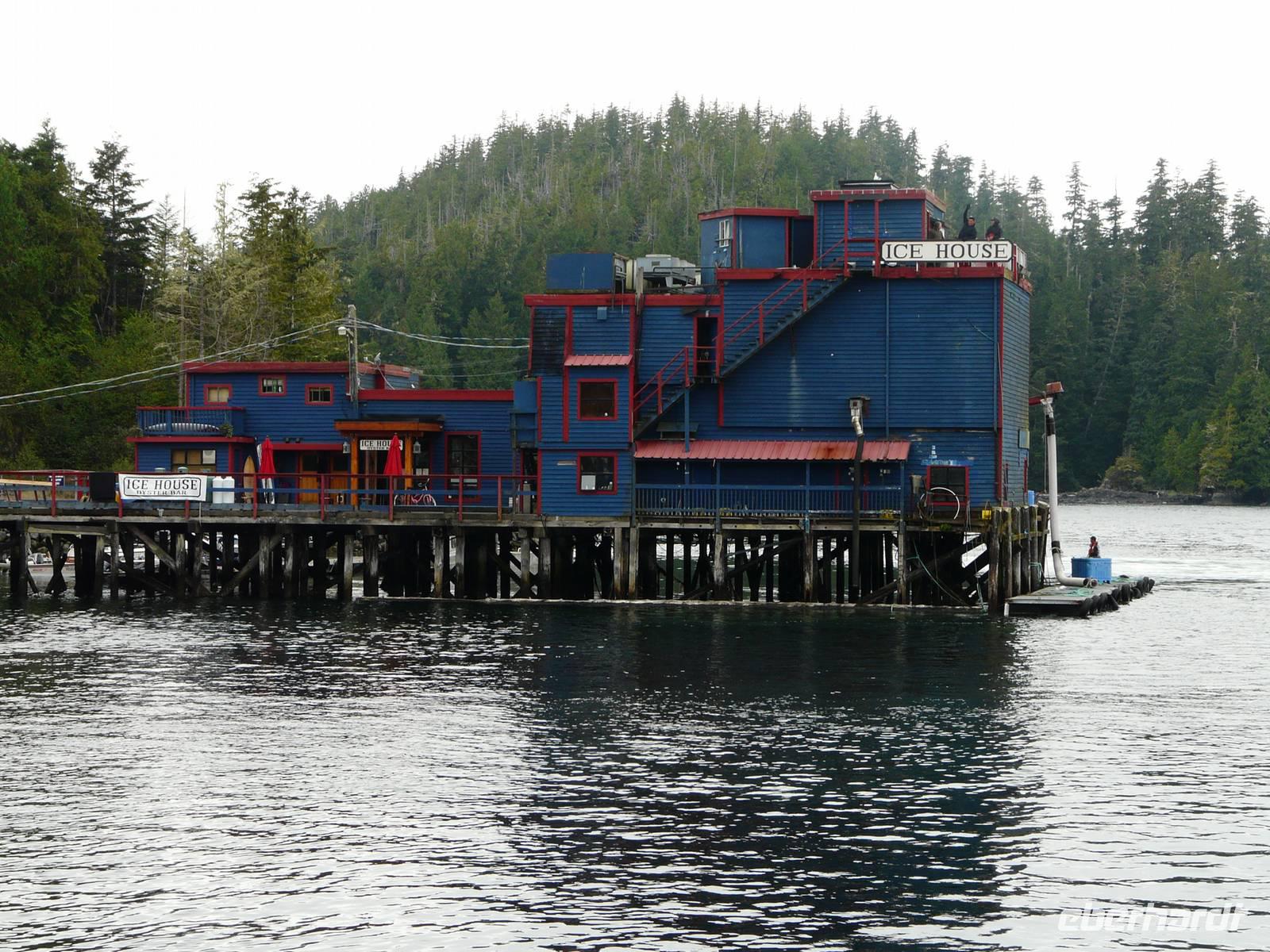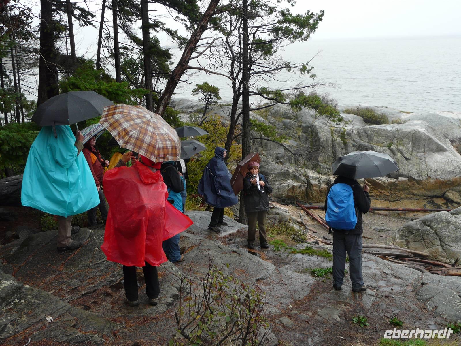 Entgegen unserer Hoffnungen scheint uns der kanadische Wettergott heute auch nicht hold zu sein. Wir erreichen Campbell River bei Nieselregen, welcher immer stärker wird, als wir entlang des Hafens spazieren. Kurz entschlossen besorgt Peter für uns alle Regencapes und so laufen wir kurze Zeit später im Einheits-Cellophan-Look durch das kleine Städtchen. Am späten Vormittag setzen wir dann mit einer kleinen Fähre hinüber nach Quadra Island, was nicht länger als 20 Minuten dauert. Die kleine Insel ist dünn besiedelt und so sehen wir auf dem Weg zu unserer Lodge eigentlich nur Wald und Bäume. Da das Wetter nun etwas aufgeklart hat, entscheiden wir uns kurz nach dem Check In direkt die Insel zu erkunden. Der Weg führt uns entlang der steinigen Küste, vorbei an einem kleinen Leuchtturm bis nach Quathiaski Cove. Eigentlich ein verschlafenes Indianerdorf, doch gibt es hier ein unscheinbares Museum, welches uns die Geschichte der kanadischen Ureinwohner näher bringt. Auf dem Rückweg erwischt uns dann doch der Regen und so kommen wir alle ziemlich durchnässt im Hotel an. Unser Abenteuertrieb ist erstmal außer Gefecht gesetzt und so bevorzugen wir es, den Nachmittag im Hotel zu verbringen, anstatt nochmals auf die andere Seite der kleinen Insel zu fahren. Doch die Lodge ist wunderschön eingerichtet, viel erzählt hier in Bildern und Bauweise von der Kultur und Geschichte der Indianer. Und so wird es heute ein entspannter und gemütlicher Abend bei indianischem Ambiente.