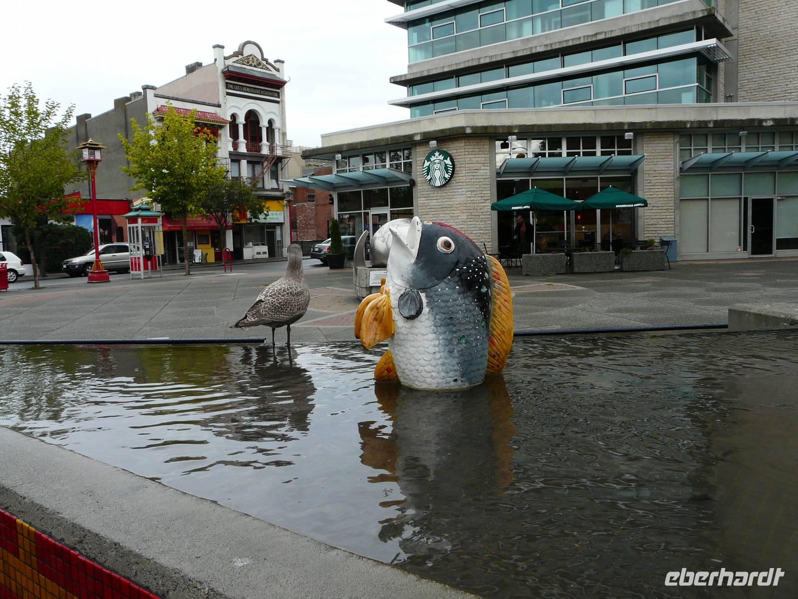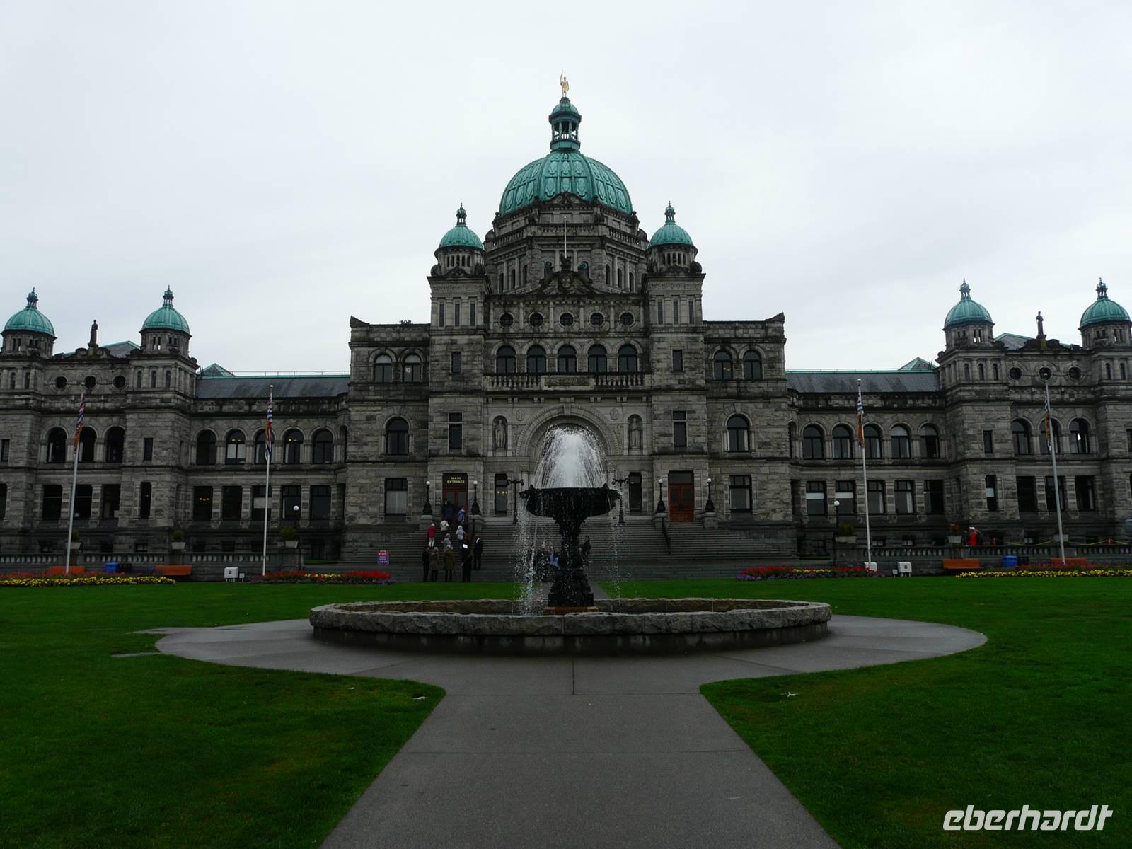 Nach dem kurzen Ausflug auf Quadra Island geht es heute wieder zurück auf die große Nachbarinsel. Wir nutzen den Morgen noch mal kurz um nach Heriot im Süden zu fahren, ehe wir erneut die kleine Fähre hinüber nach Campbell River nehmen. Der heutige Tag ist wieder grau in grau, erst als wir in Chemainus halten, kommt etwas Farbe ins Spiel. Das kleine Städtchen, welches früher vor allem von der Holzindustrie lebte, ist mittlerweile bekannt für seine vielen Wandzeichnungen in der ganzen Stadt. Diesmal gut ausgerüstet mit Regenschirmen und -capes folgen wir Peter und den gelben Fußspuren auf dem Asphalt, welche uns von Wandbild zu Wandbild führen. Dargestellt sind auf kreative Weise die Geschichte der Stadt, Gründungsväter, Pocahontas und vieles mehr. Eine witzige Idee, um Gäste in die kleine Siedlung zu locken. Leider scheint uns der Regengott förmlich zu verfolgen und so machen wir uns bald weiter auf den Weg in die Hauptstadt von British Columbia. Angekommen in Victoria ist der Himmel zwar noch immer grau, dafür bleibt es aber trocken und so können wir die Stadt zuerst mit dem Bus und dann zu Fuß in Ruhe erkunden. Das erste Ziel ist Chinatown, einer der ältesten Stadtteile der kleinen Metropole. Die „Mile Zero", der Beginn von Kanadas längstem Highway Nr. 1, welcher das Land einmal komplett von West nach Ost durchquert, ist unser nächster Fotostopp. Danach geht es einmal quer durch die Wohngebiete der Stadt, wo sich viele alte, aber einzigartige und schön gepflegte Häuser im englischen Stil befinden. Nachdem Mohsen uns dann am Hotel abgesetzt hat, machen wir uns noch mal zu Fuß auf den Weg, besichtigen noch eine Kirche und schlendern hinunter zum Hafen, wo sich auch das Parlamentsgebäude befindet. Über die belebte Einkaufsstraße Government Street geht es dann langsam zurück zum Hotel. Zum Abendessen machen wir uns erneut auf dem Weg Richtung Hafen und können bei einem fantastischen Blick auf Hafen und das beleuchtete Parlament Steak und Fisch genießen.