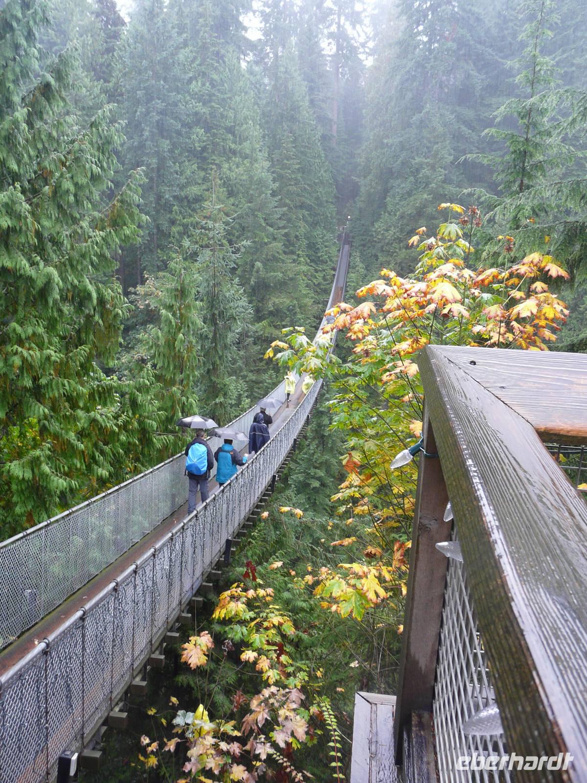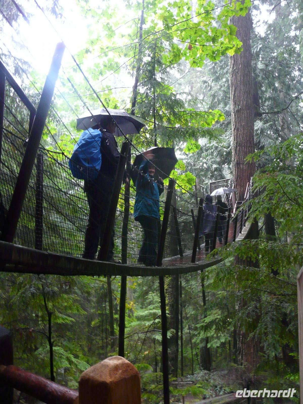 Obwohl wir von unserem Restaurant im 42. Stock des Hotels einen traumhaften Blick haben sollten, sind wir zum Frühstück etwas ernüchtert - es regnet erneut und die Stadt zeigt sich grau in grau. Wir machen uns trotzdem auf den Weg und fahren über die Lion's Gate Bridge in den Norden der Stadt. Unterhalb des Grouse Mountain machen wir nochmals eine Wanderung durch dichten Wald, welche uns immer wieder an den Rand des Pazifiks bringt. Doch der Regen wird immer stärker und so flüchten wir dann doch wieder in den Bus. Die Lachsstation, welche wir kurz darauf besuchen, ist glücklicherweise fast komplett überdacht, sodass wir uns in Ruhe und vor allem trocken die Aufzuchtstation ansehen können. Der Höhepunkt des Tages folgt dann eher unerwartet. Die Capilano Suspension Bridge ist nicht einfach nur eine Hängebrücke, sondern eher ein großer Abenteuerspielplatz. Wir überqueren die riesige Brücke und finden uns wenig später in den Baumgipfeln des Waldes wieder - über Leitern und Hängebrücken spazieren wir hoch über den Boden und lassen und dabei selbst durch die Regen nicht den Spaß verderben. Auf der anderen Seite des Canyons laufen wir dann nahezu entlang des Abgrunds - einfach fantastisch. Trotz des tollen Erlebnisses sind wir dann aber doch ziemlich durchgeweicht und so entscheiden wir, nicht die zweite Wanderung zu machen, sondern nochmals zurück zum Hotel zu fahren, schließlich wollten wir das Abendessen gern in trockenen Schuhen zu uns nehmen. Nach dem kurzen Zwischenstopp geht es erneut hinüber zum Grouse Mountain. Da wir etwas Zeit haben, bleiben wir noch etwas im Bus und sitzen in gemütlicher Runde bei einem weiteren Glas Whiskey (die Vorräte mussten ja alle werden!) zusammen. Mohsen nutzt die Gelegenheit und übergibt jedem von uns ein kleines Geschenk - eine tolle und sehr herzliche Geste. Aber natürlich müssen wir noch etwas in den Regen und so geht es zuerst mit der Gondel hinauf auf den Berg, wo wir noch einen kleinen Rundgang machen. Aber selbst die Grizzlies scheinen vor dem Wetter ins Trockene geflüchtet zu sein. Und so gehen wir uns Restaurant der Bergstation und genießen unser letztes gemeinsames Abendessen, leider ohne den erhofften Panoramablick hinüber nach Vancouver. Doch dies holen wir noch nach! Als wir im Hotel ankommen, zeigt sich so langsam der Sternenhimmel und so fahren wir nochmals in den 42. Stock unseres Hotels und genießen bei Cocktails und Whiskeys nun aber wirklich einen spektakulären Ausblick über die Metropole.