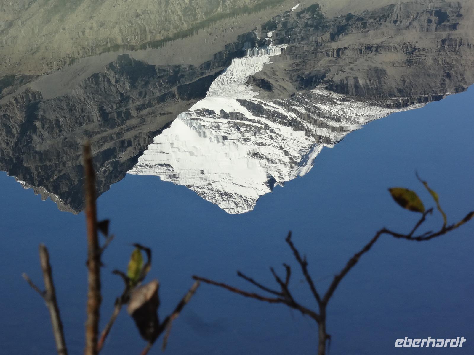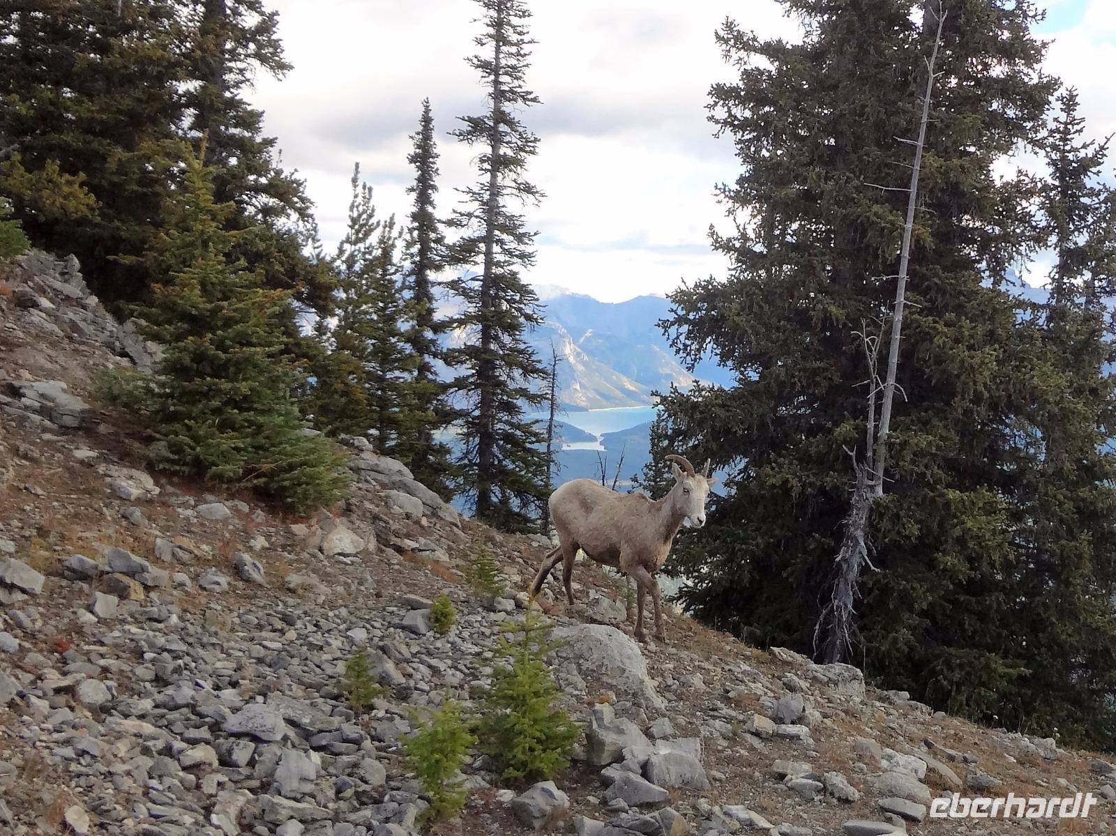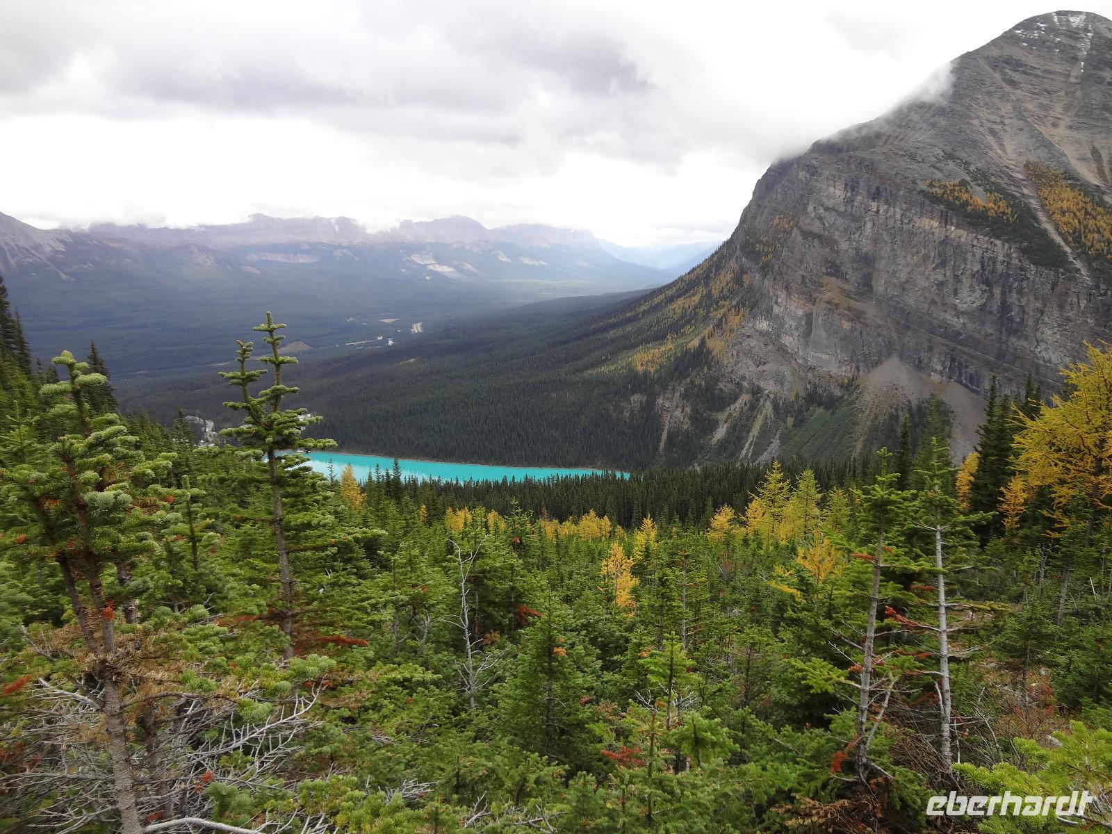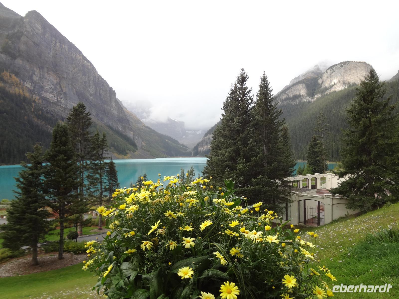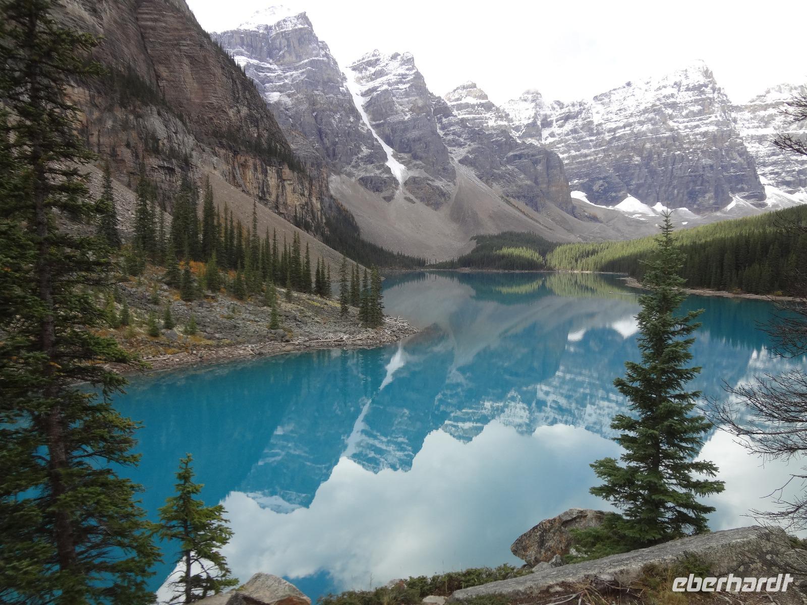 So viel schlafen wie wir wollten, koennen wir nicht, da der Jetlag uns immer wieder wachruettelt aber ploetzlich ist es nicht mehr die Zeitverschiebung sondern das Telefon. Es ist 6:30 Zeit zum aufstehen. Das Fruehstuecksbuffet ist im Nebengebaeude und so stellen wir auch fest, dass es draussen kuehl ist und die Wolken mit der Sonne verstecken spielen. Die Wolken gewinnen fast immer. Dies haelt uns aber keines Wegs ab, vorerst ein Picknick im Supermarkt einzukaufen und daraufhin gleich nach Lake Louise zu fahren. Auf der Fahrt erfahren wir die Geschichte ueber dieses Land und weshalb sich der Westen Kanadas nicht den USA angeschlossen hatte sondern es bevorzugte sich dem neuen Staate Kanada anzugliedern. In Lake Louise angekommen, packen wir unsere Rucksaecke und wandern los. Vorerst natuerlich durchs 5 Sterne Hotel auch weil es da sehr schoene Toiletten gibt ? Unsere heutige Wanderung biegt gleich mal von der Seepromenade rechts ab und ein Weg fuehrt uns stetig bergan bis wir bei Mirror Lake ankommen. Unterdessen haben wir schon eine Schicht Kleider weniger an, die Wolken verlieren immer wieder im Spiel und eine erste Pause ist angesagt. So, so, die Tiere schauen sich hier im See an, deshalb der Name ! Oberhalb dieses kleinen Sees sehen wir „the big beehive" ein Berg wie eine Cremeschnitte aus feinstem Blaetterteig geschichtet und rundfoermig wie eben eine Bienenwabe. Toll, das ermuntert uns auch gleich weiter zu steigen zu dem „little beehive". Nun sind wir in 1 ½ Stunden ganze 600 Meter gestiegen und geniessen auf dem Felsen oben sitzend die wunderbare Aussicht auf den hellblauen Lake Louise, seine Berge und Gletscher. Wir schauen auch ins Bowtal hinunter und sehen das Chateau Lake Louise. Es ist das einstmalige Eisenbahnhotel, heute von Fairmont gemanaged. Nach der Pause geht es wieder berghinunter bis zu unserem naechsten Ziel. Das Teehaus von Lake Agnes. Gemuetlich essen wir unser Picknick am Seesufer und schauen auf die traumhafte Bergwelt und die perfekte Spiegelung im See.