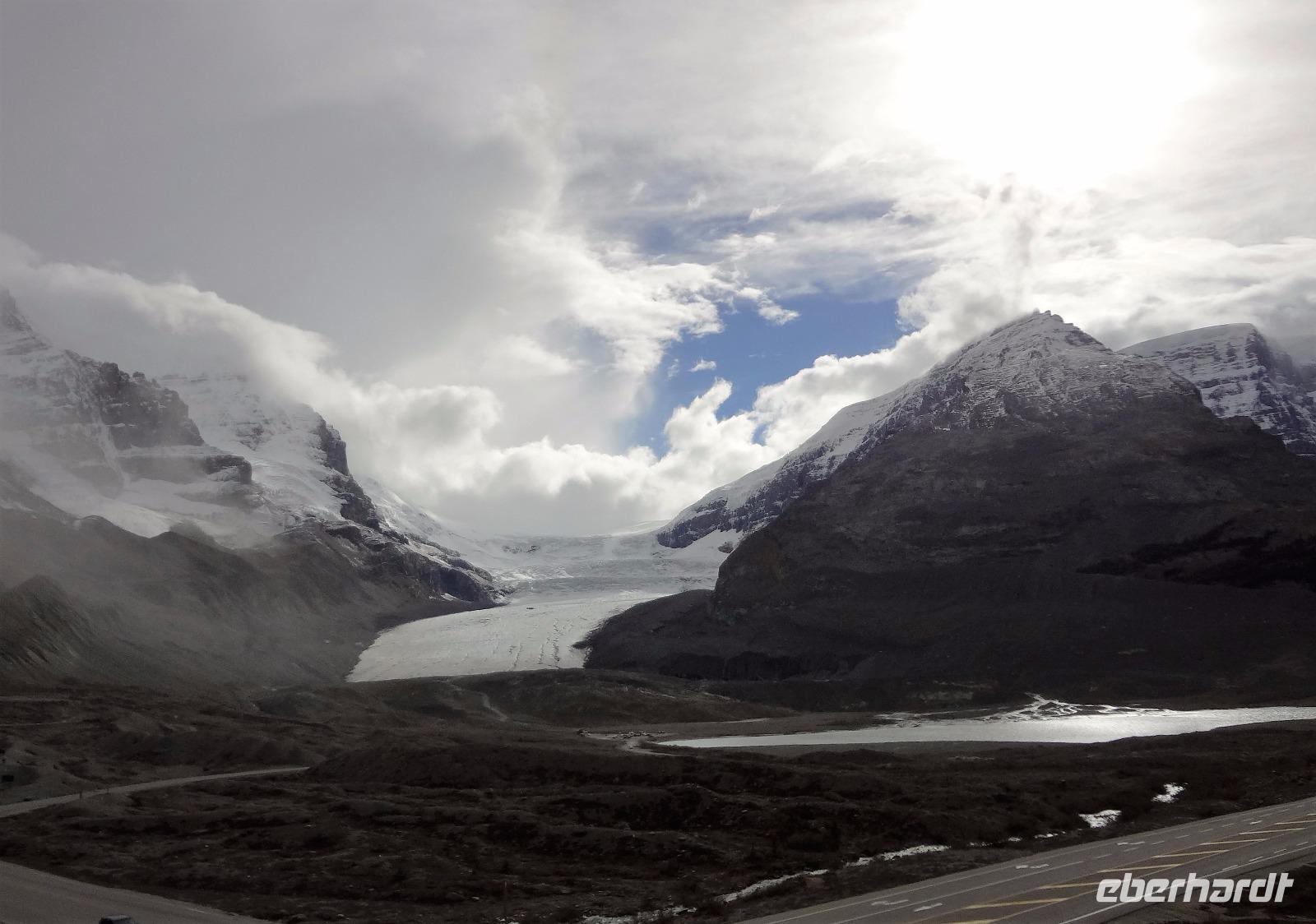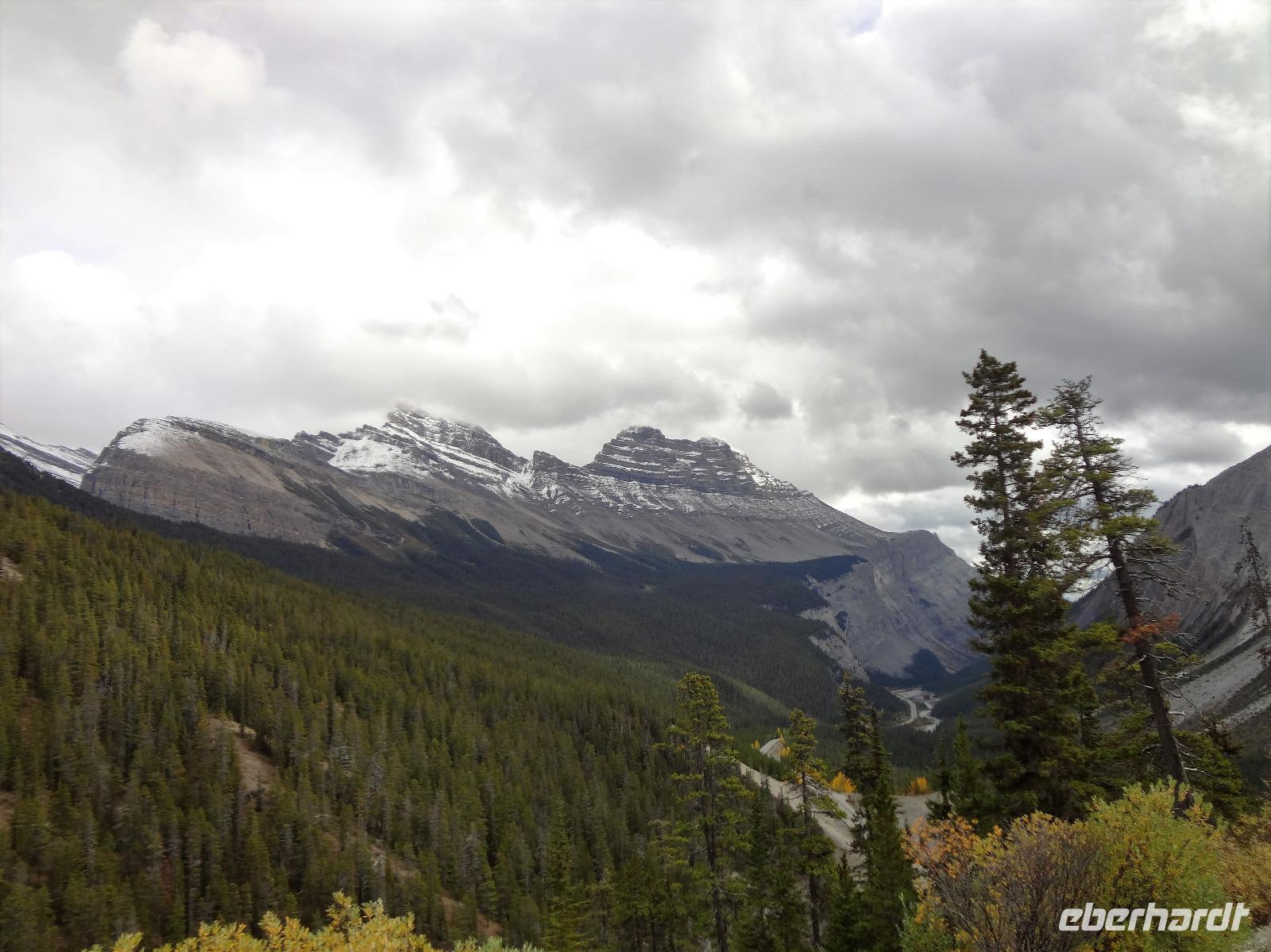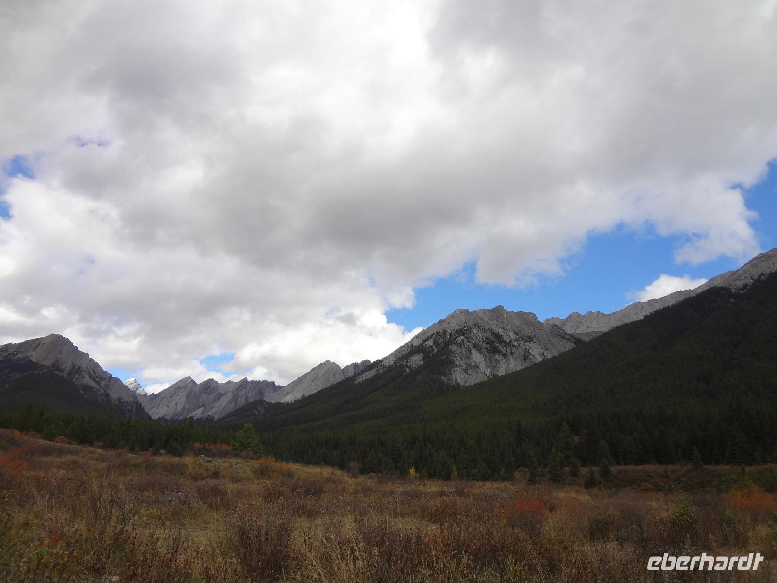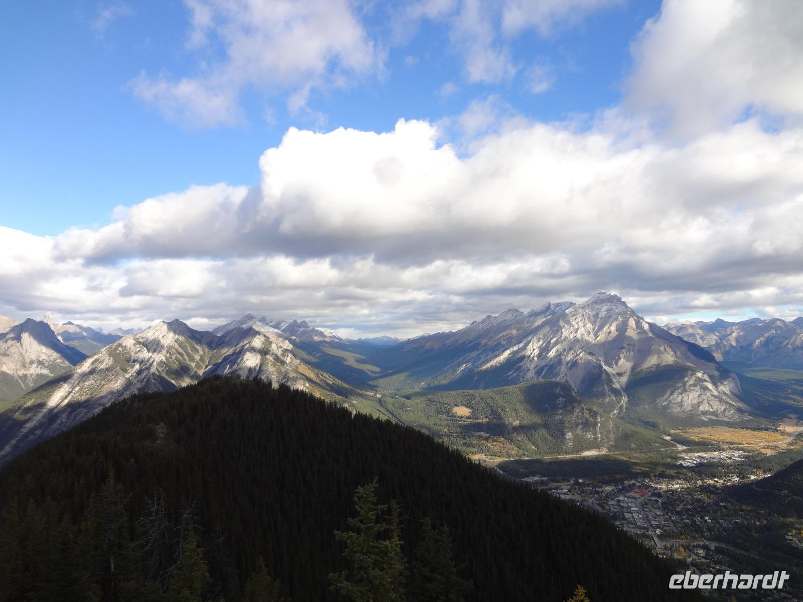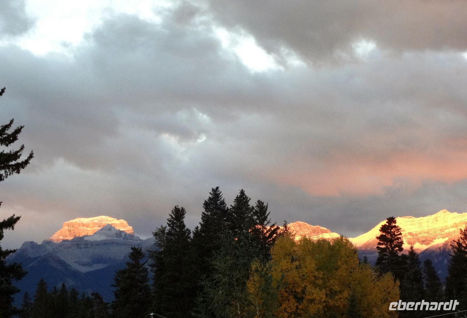 Der Abstieg faellt uns leicht und der Schlaf im Bus danach, noch leichter. Aber der Tag ist noch nicht aus, nun holen wir in den Zimmern unser Badezeug, denn wir wollen in die Thermalquellen von Banff. Gesagt, getan. Die Haut ist nun sehr geschmeidig und samtenweich von dem minerahaltigen Schwefelwasser......aber das bleibt unser Geheimnis. Nun haben wir eine Pause verdient, das Versteckenspiel nimmt heute kein Ende und die Wolken kaempfen hart um den Siegertitel. Bis es zum Abendessen ins nahegelegene El Toro geht, ist der Wettkampf abgeschlossen und alle Teilnehmer haben sich verzogen. Der Lachs mit der frischen Fruechtesalsa war sehr gut und mal ganz anders zubereitet.