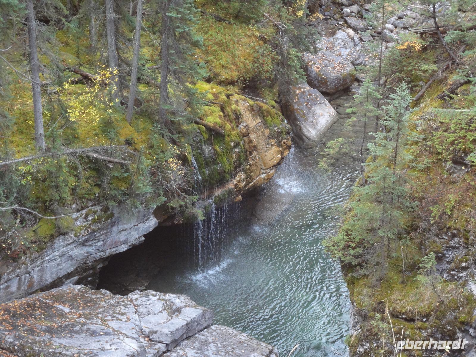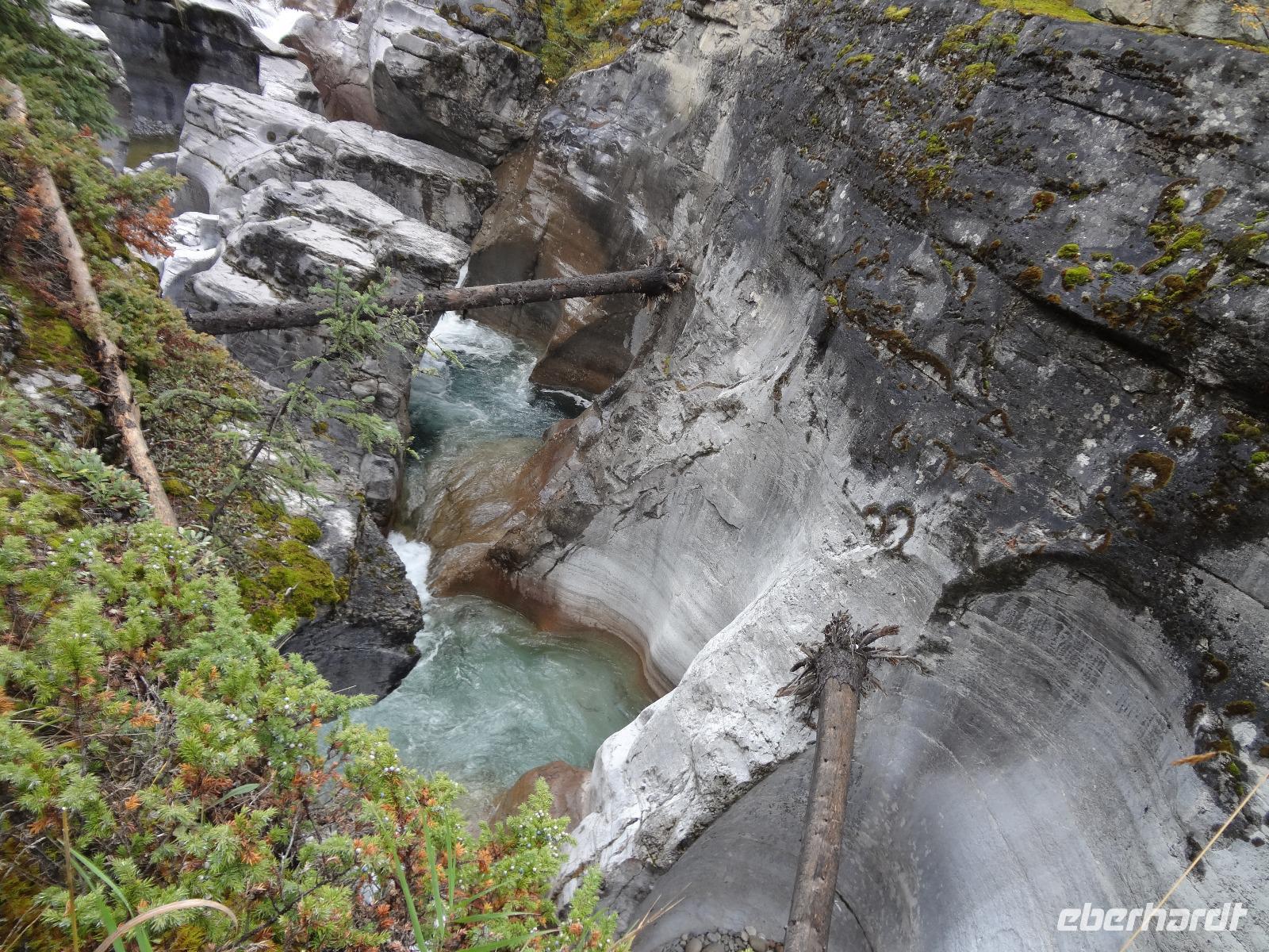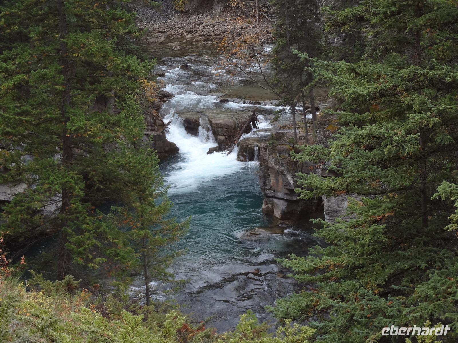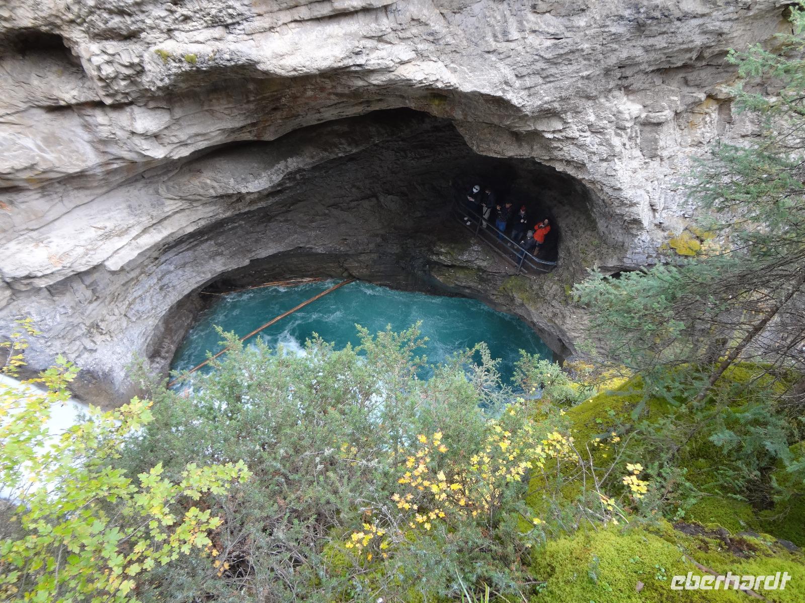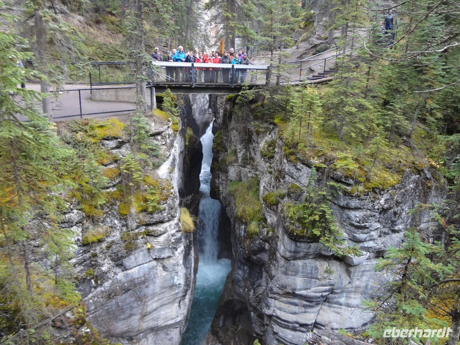 Ahhh 7 Uhr und wir liegen noch immer in den strammgezogenen Betten wie eingebundene Mumien. Man kann gar nicht rausfallen oder aufstehen, man kann bloss rauskriechen. Item. Heute ist Sonntag, trotzdem ist alles offen, ausser der Post ! Auch heute haben wir grossartiges vor. Wir fahren gleich zur Gondel die uns auf den Sulphure Mountain bringt. Oben ist es kalt dafuer lacht die Sonne. Also marsch auf Sanson's Peak. Bloss 10 Minuten fuer uns Sportler, bei der Kaelte ! Auf diesem Aussichtspunkt schaut man aufs Bow Tal hinunter, sieht Banff, das Banff Springs Hotel, sein Golfplatz, lake Miniwanka sowie Mt. Rundel, Peak Louis, Mt. Cascade und viele, viele andere Berge. Neugierig schauen wir uns das Haeuschen von Mr. Sanson an und fragen uns, weshalb da 2 Betten drinnen sind und wie kann man bloss 40 Jahre alleine da oben wohnen ? Wir gondeln wieder talwaerts wo Alex mit dem Museumsbus auf uns wartet. Damit fahren wir zum Johnston Canyon. So viele Leute wollen sich diese Schlucht anschauen, der erste Kilometer ist wunderschoen aber sehr dicht besucht. Auf den naechsten 4 Km kommen wir an wunderschoenen Wasserfaellen vorbei und der Weg steigt stetig an aber ist aber nie steil. Um 13:00 Uhr sind wir an unserem Ziel angekommen. Es sind die Ink Pots, wie die kleinen Seen hier liebevoll genannt werden. Sie werden von unterirdischem Gletscherwasser gespiesen und man sieht wie das Wasser durch den Sand gedrueckt wird. Nichts zum baden, denn die Seelein sind bloss 4 Grad kalt und wir haben sowieso hunger. Unser Picknick nehmen wir am Flussufer ein und ziehen dann auch bald wieder ab, da sich duestere Wolken bilden. Wir haben viel Glueck, denn wir wandern anscheinend schneller, als die Wolken wachsen und kommen heil und trocken wieder beim Bus an. Das Abendessen ist heute abend mitten im Staedtchen Banff. Jeder kann sich heute was von der Karte aussuchen und bestellen was auch mal schoen ist. Nach diesem Wandertag sind wir muede und die strammen Bettlaken warten schon auf ihre „Reinkriecher".