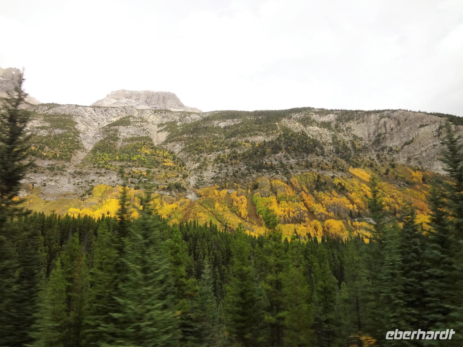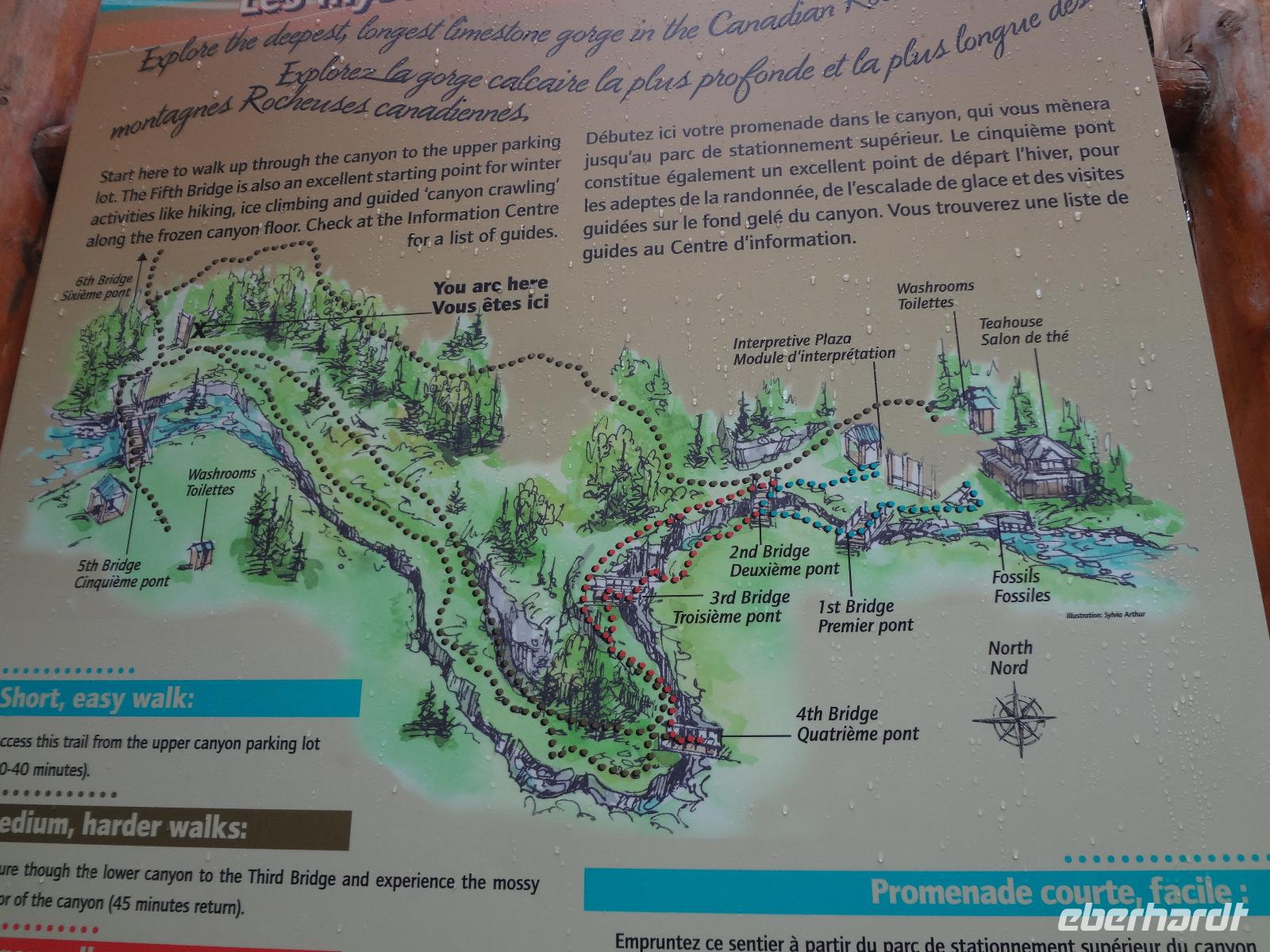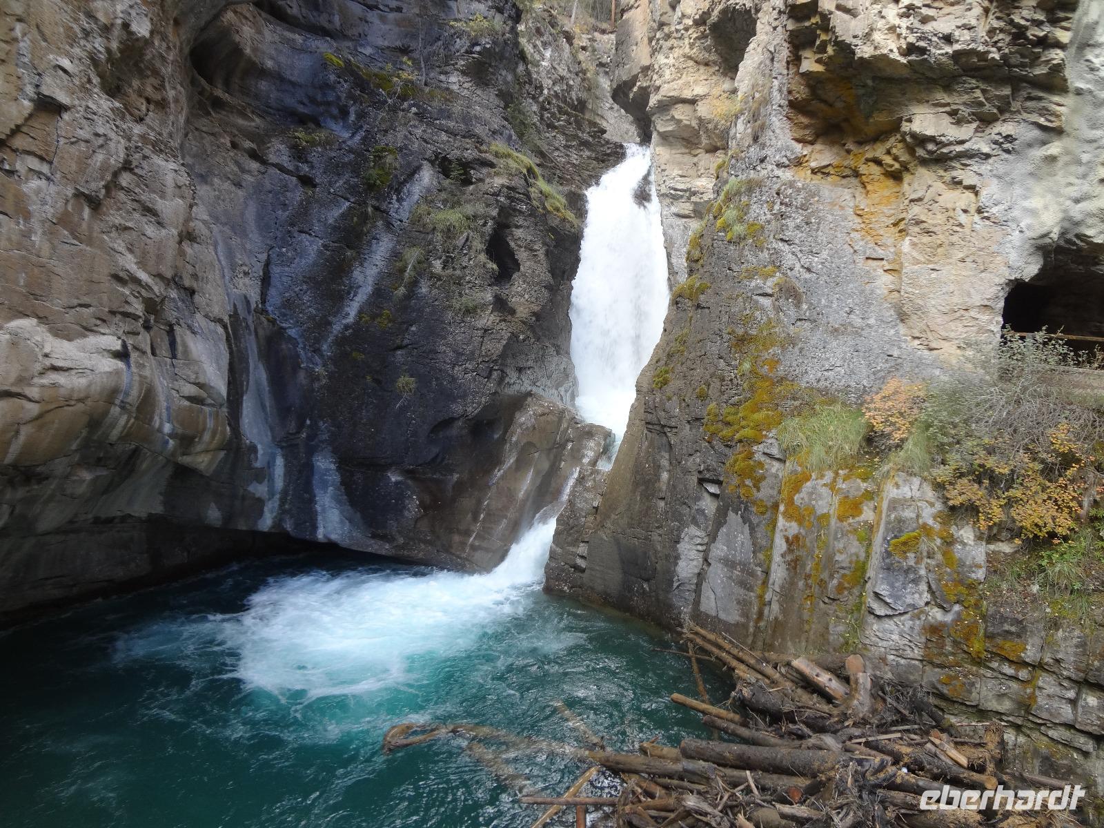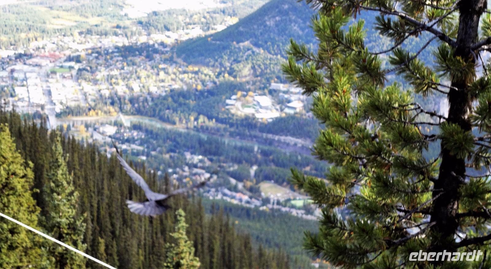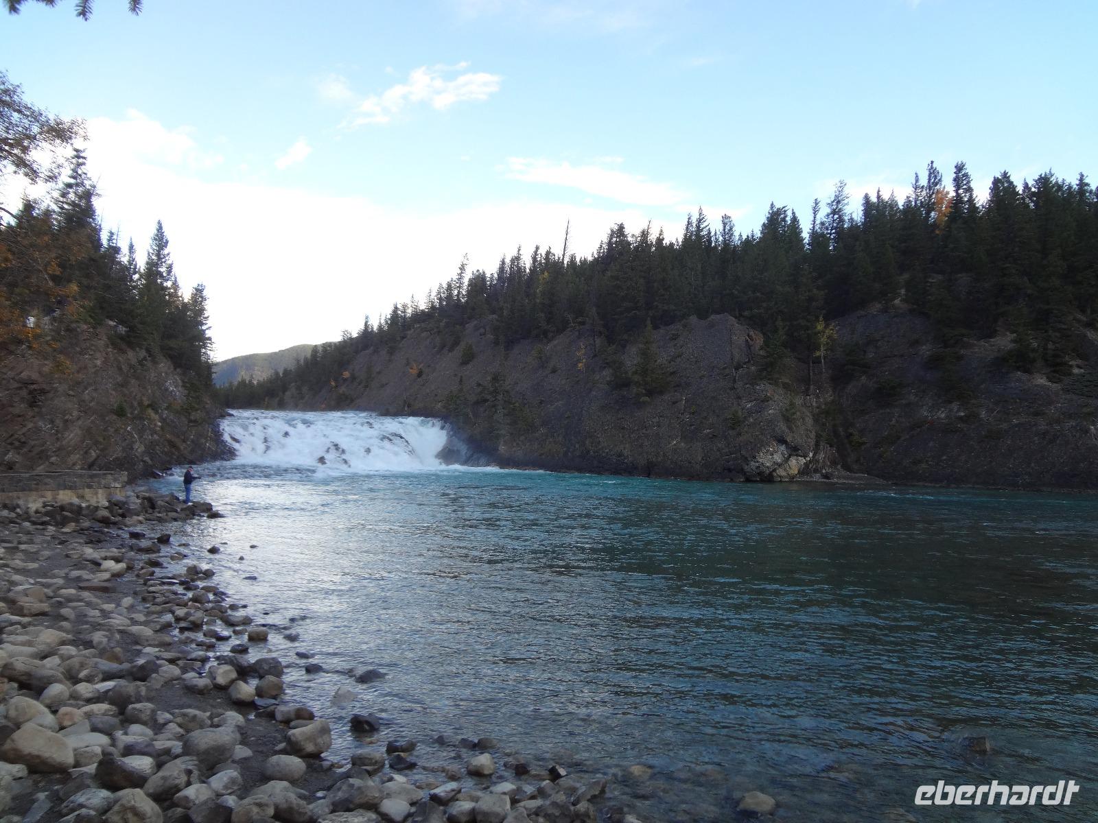 Ahhh 7 Uhr und wir liegen noch immer in den strammgezogenen Betten wie eingebundene Mumien. Man kann gar nicht rausfallen oder aufstehen, man kann bloss rauskriechen. Item. Heute ist Sonntag, trotzdem ist alles offen, ausser der Post ! Auch heute haben wir grossartiges vor. Wir fahren gleich zur Gondel die uns auf den Sulphure Mountain bringt. Oben ist es kalt dafuer lacht die Sonne. Also marsch auf Sanson's Peak. Bloss 10 Minuten fuer uns Sportler, bei der Kaelte ! Auf diesem Aussichtspunkt schaut man aufs Bow Tal hinunter, sieht Banff, das Banff Springs Hotel, sein Golfplatz, lake Miniwanka sowie Mt. Rundel, Peak Louis, Mt. Cascade und viele, viele andere Berge. Neugierig schauen wir uns das Haeuschen von Mr. Sanson an und fragen uns, weshalb da 2 Betten drinnen sind und wie kann man bloss 40 Jahre alleine da oben wohnen ? Wir gondeln wieder talwaerts wo Alex mit dem Museumsbus auf uns wartet. Damit fahren wir zum Johnston Canyon. So viele Leute wollen sich diese Schlucht anschauen, der erste Kilometer ist wunderschoen aber sehr dicht besucht. Auf den naechsten 4 Km kommen wir an wunderschoenen Wasserfaellen vorbei und der Weg steigt stetig an aber ist aber nie steil. Um 13:00 Uhr sind wir an unserem Ziel angekommen. Es sind die Ink Pots, wie die kleinen Seen hier liebevoll genannt werden. Sie werden von unterirdischem Gletscherwasser gespiesen und man sieht wie das Wasser durch den Sand gedrueckt wird. Nichts zum baden, denn die Seelein sind bloss 4 Grad kalt und wir haben sowieso hunger. Unser Picknick nehmen wir am Flussufer ein und ziehen dann auch bald wieder ab, da sich duestere Wolken bilden. Wir haben viel Glueck, denn wir wandern anscheinend schneller, als die Wolken wachsen und kommen heil und trocken wieder beim Bus an. Das Abendessen ist heute abend mitten im Staedtchen Banff. Jeder kann sich heute was von der Karte aussuchen und bestellen was auch mal schoen ist. Nach diesem Wandertag sind wir muede und die strammen Bettlaken warten schon auf ihre „Reinkriecher".